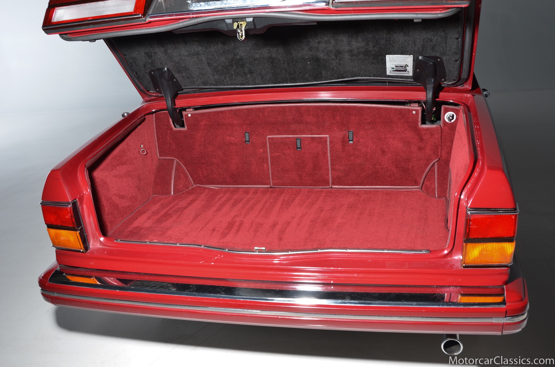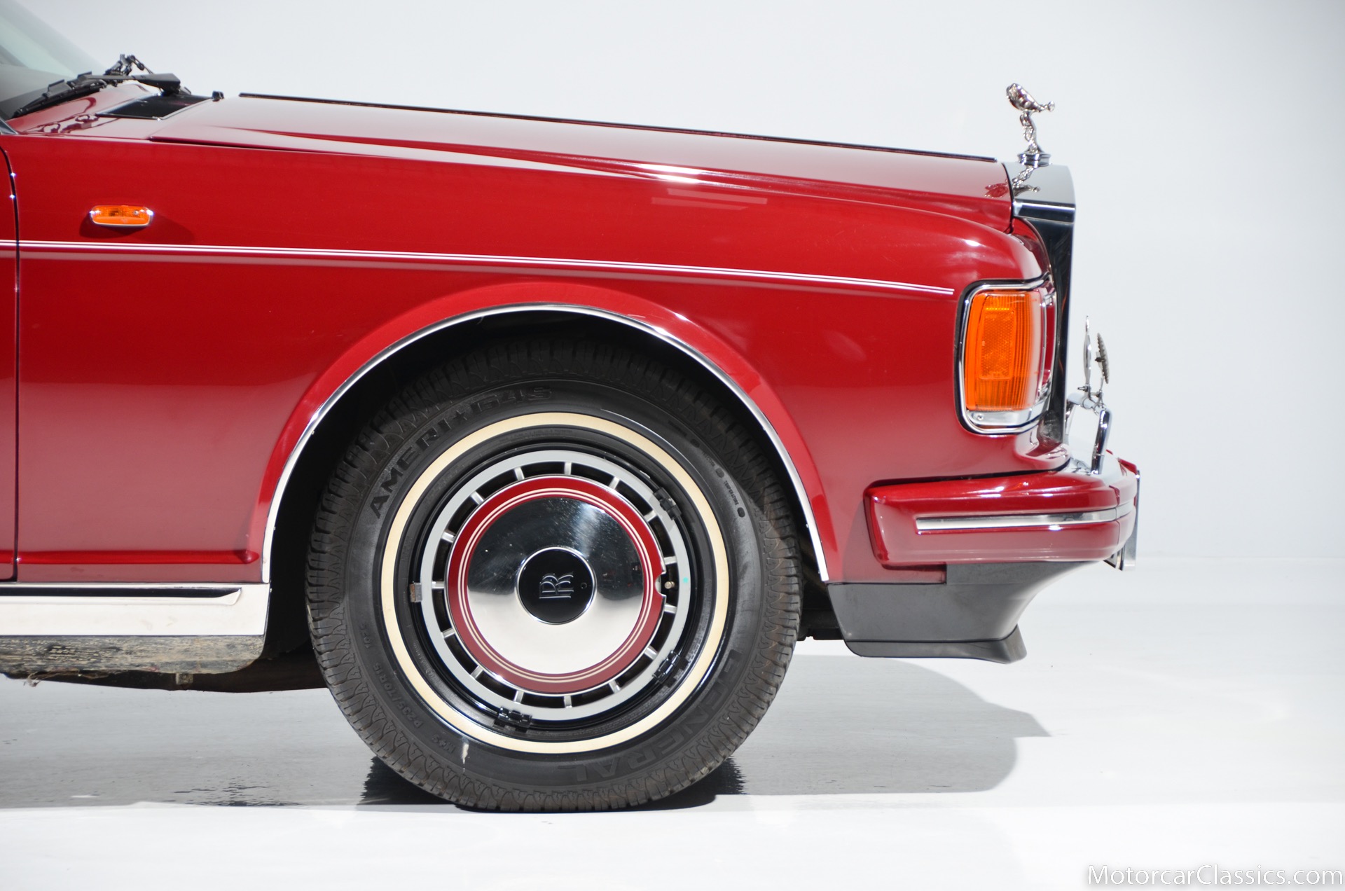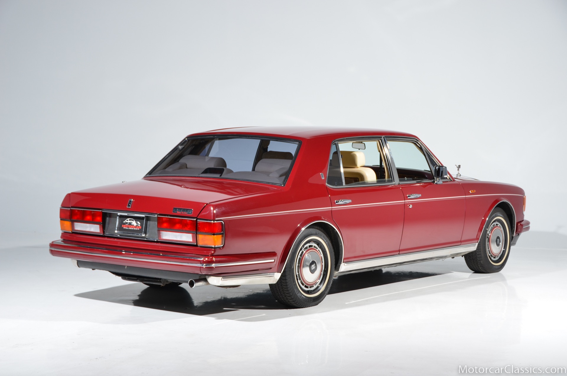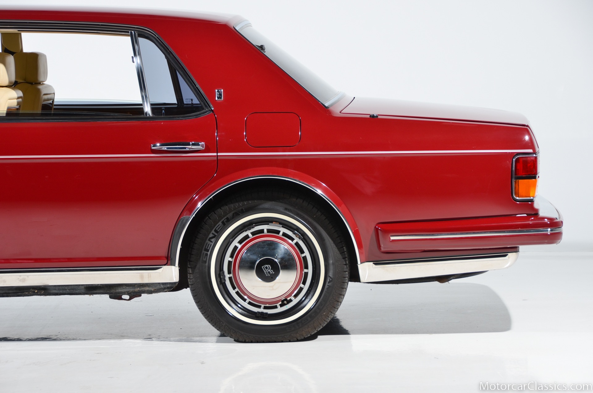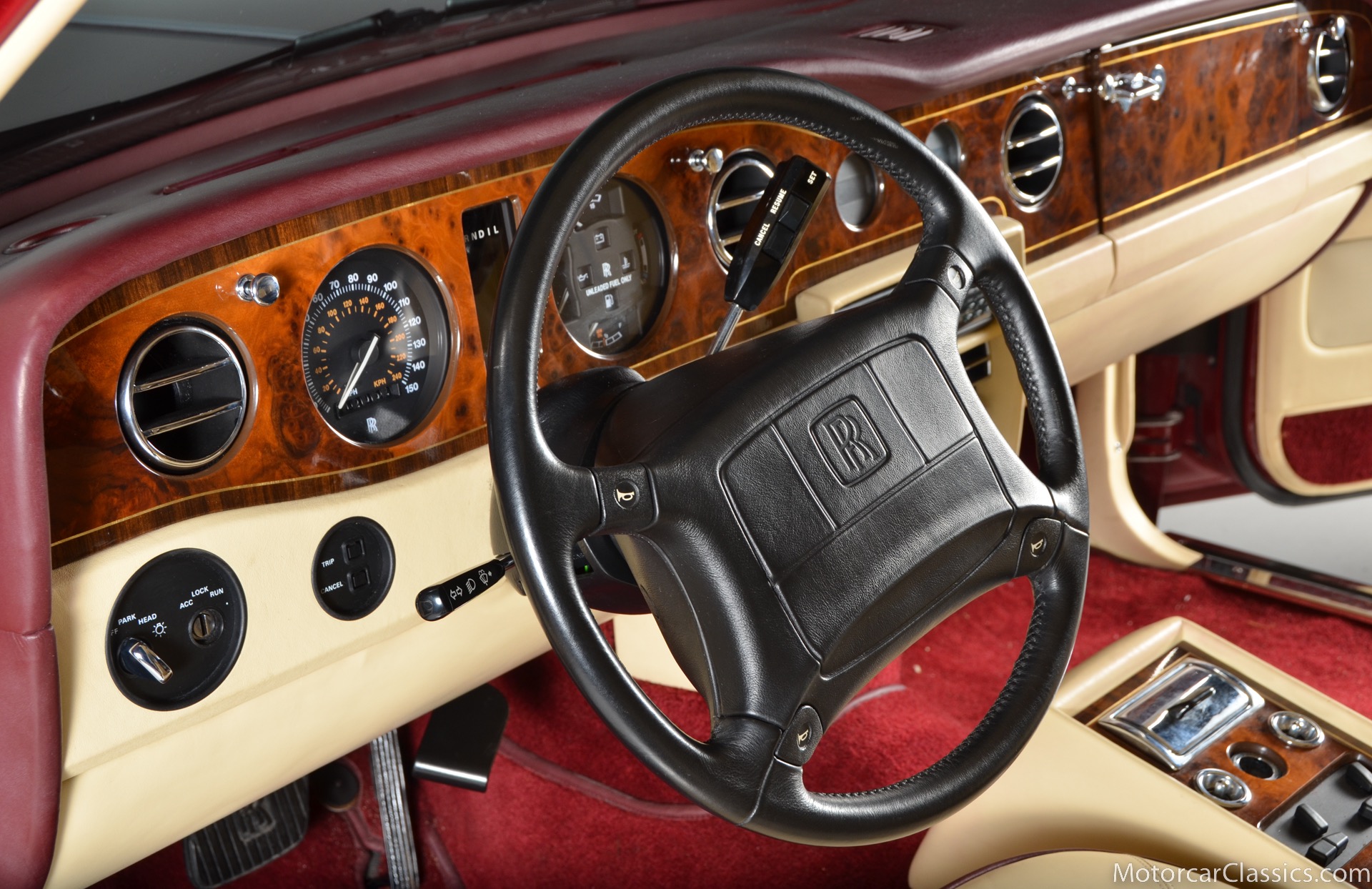 All of these MPW edition cars are finished in Bordeaux red without the Everflex roof. The bumpers and headlight surrounds are color-coded, polished stainless steel bumper inserts, stainless steel body trim running the entire length of the body sills and continuing around both wheel arches and along the lower portions of the rear wings, twin magnolia coachlines, chrome badge bar mounted on the front bumper, unique badge on the boot lid proclaiming the car's coachbuilding lineage, specially selected American burr walnut veneers, and complemented by silver inlays and Rolls-Royce monograms.