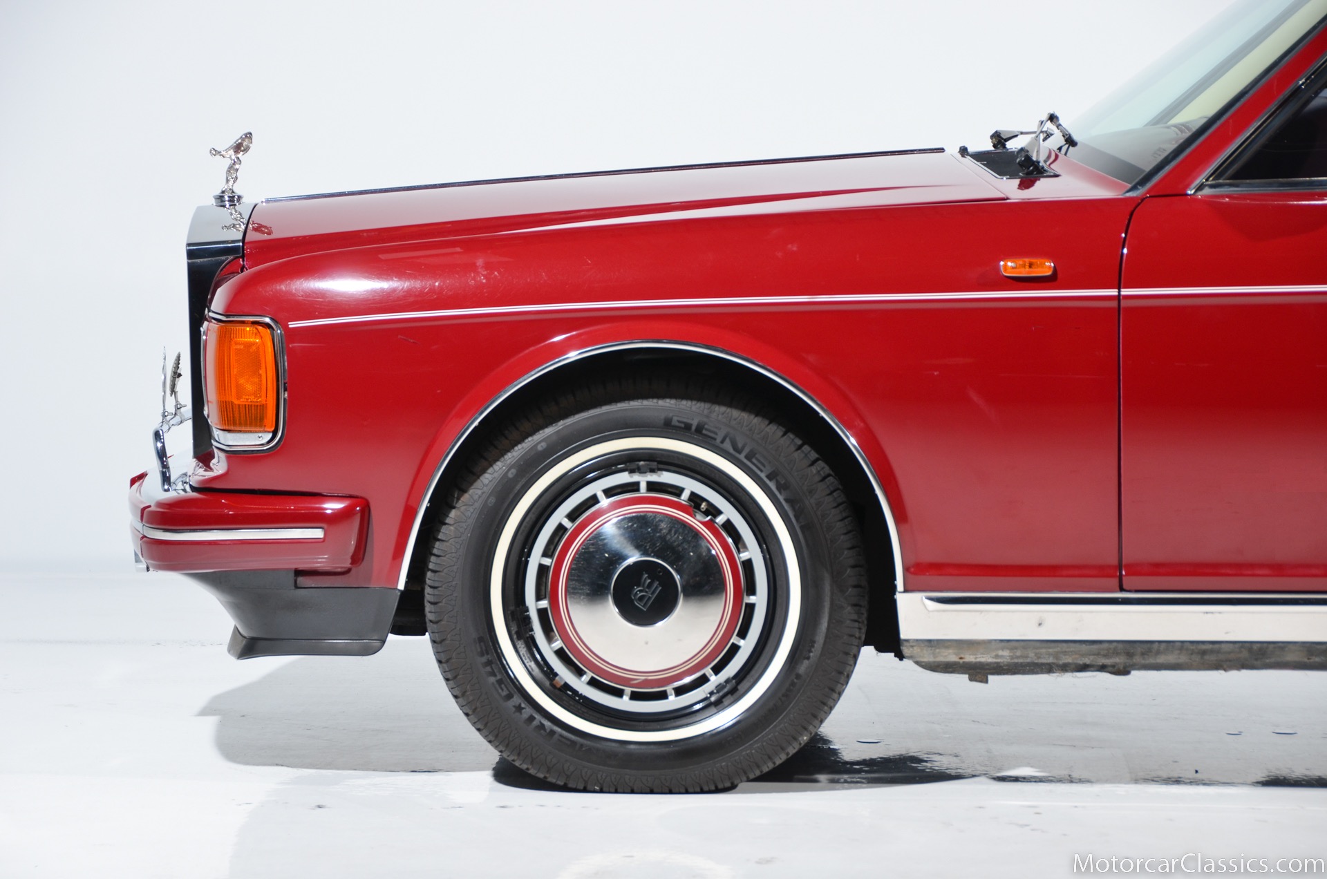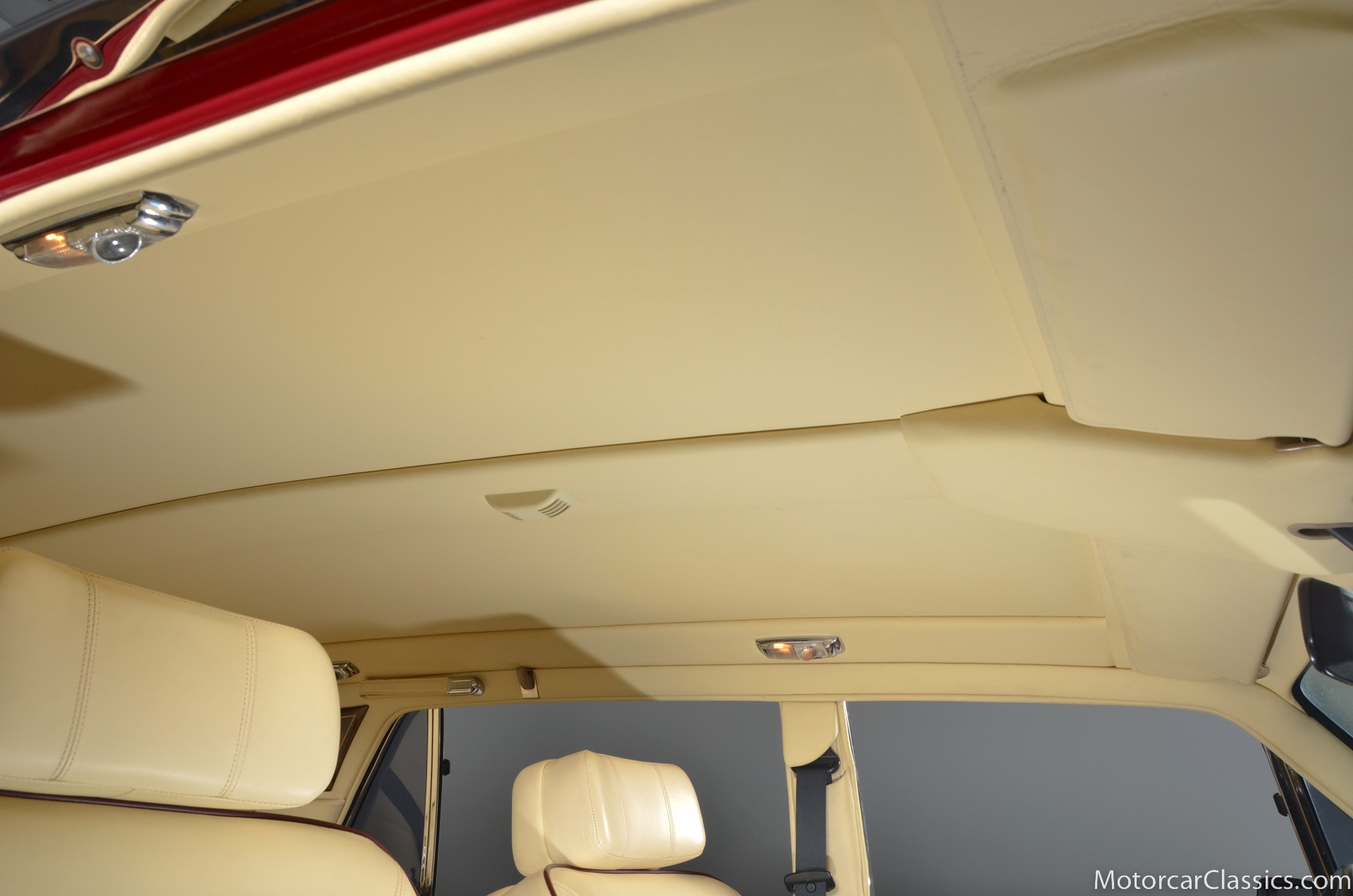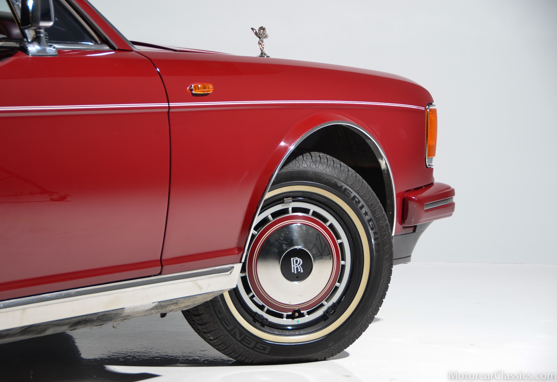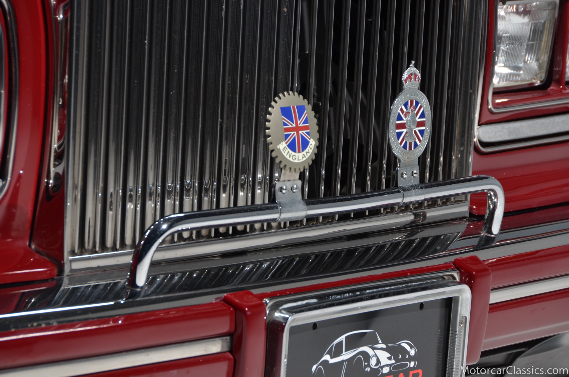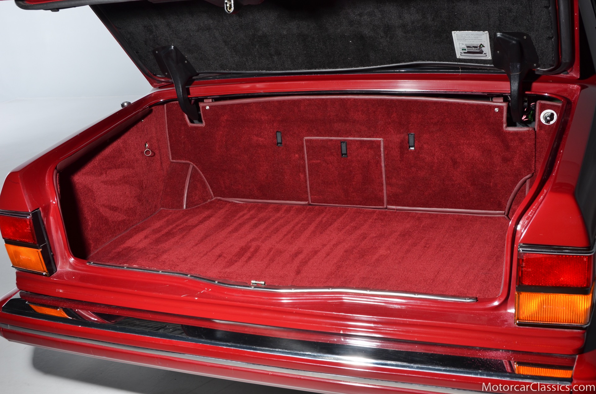 All of these MPW edition cars are finished in Bordeaux red without the Everflex roof. The bumpers and headlight surrounds are color-coded, polished stainless steel bumper inserts, stainless steel body trim running the entire length of the body sills and continuing around both wheel arches and along the lower portions of the rear wings, twin magnolia coachlines, chrome badge bar mounted on the front bumper, unique badge on the boot lid proclaiming the car's coachbuilding lineage, specially selected American burr walnut veneers, and complemented by silver inlays and Rolls-Royce monograms.