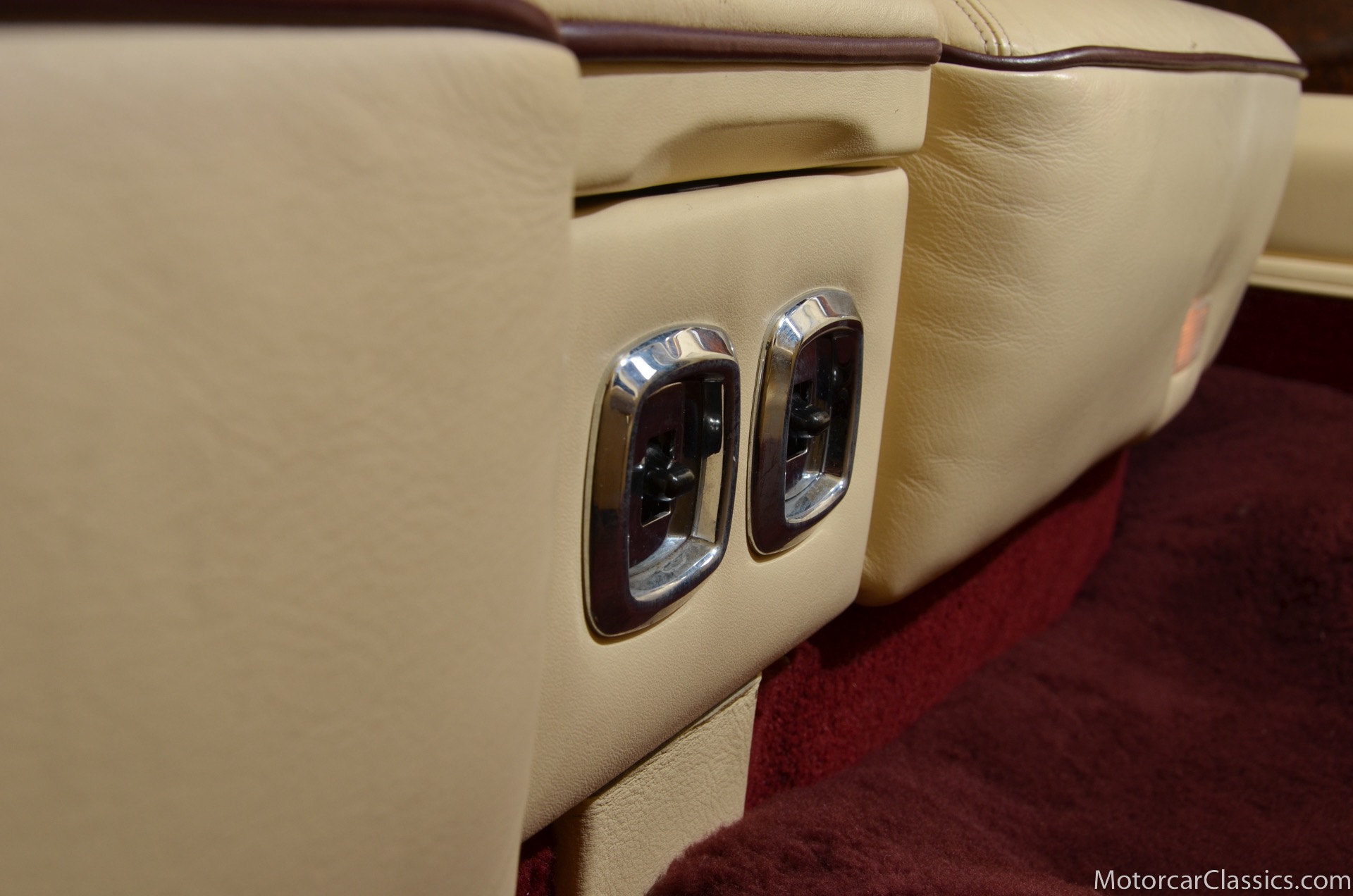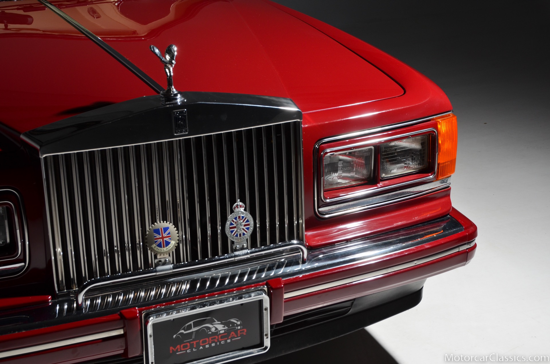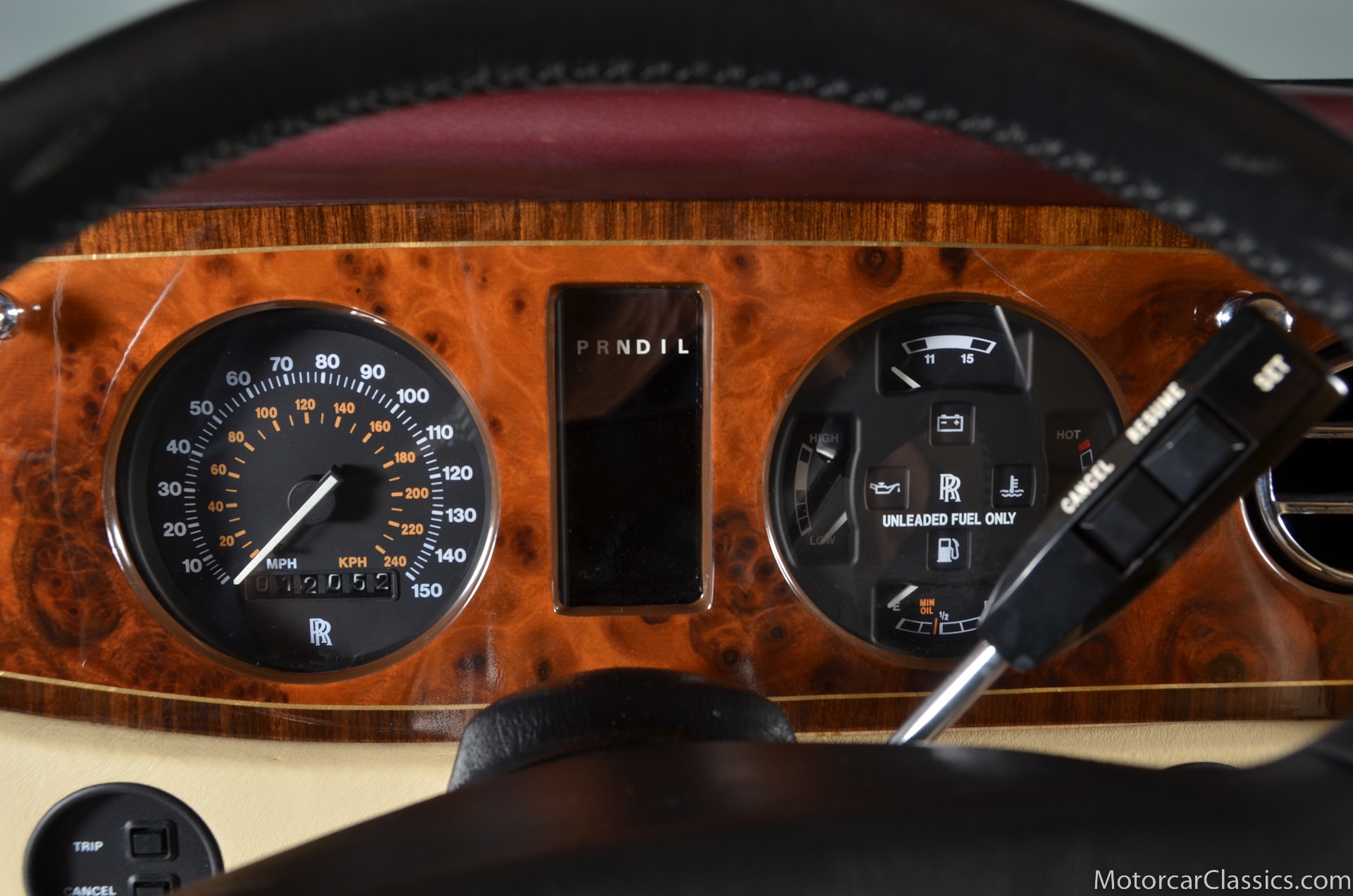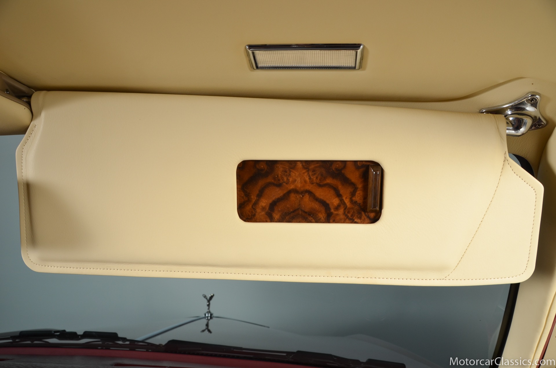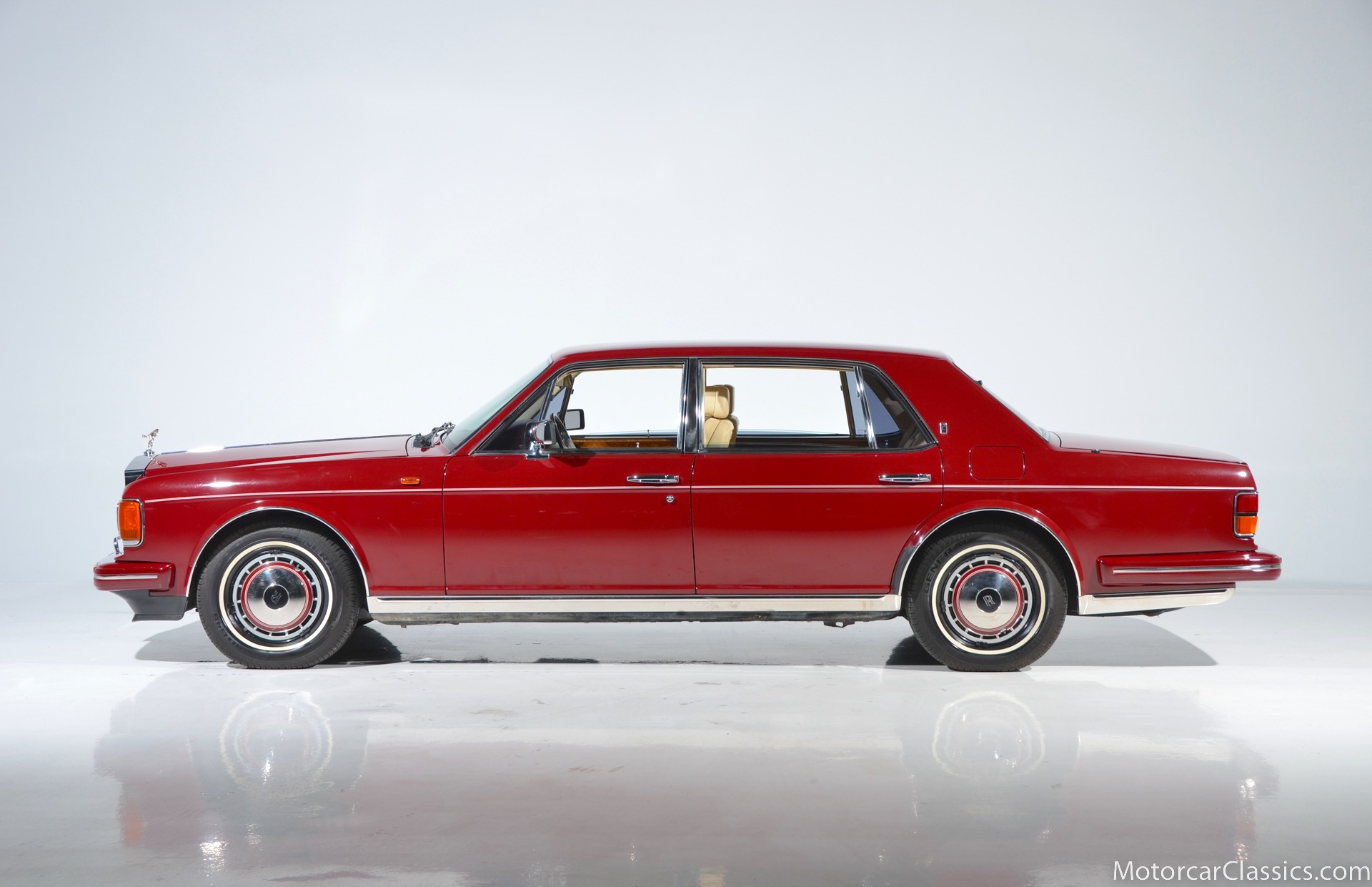 All of these MPW edition cars are finished in Bordeaux red without the Everflex roof. The bumpers and headlight surrounds are color-coded, polished stainless steel bumper inserts, stainless steel body trim running the entire length of the body sills and continuing around both wheel arches and along the lower portions of the rear wings, twin magnolia coachlines, chrome badge bar mounted on the front bumper, unique badge on the boot lid proclaiming the car's coachbuilding lineage, specially selected American burr walnut veneers, and complemented by silver inlays and Rolls-Royce monograms.