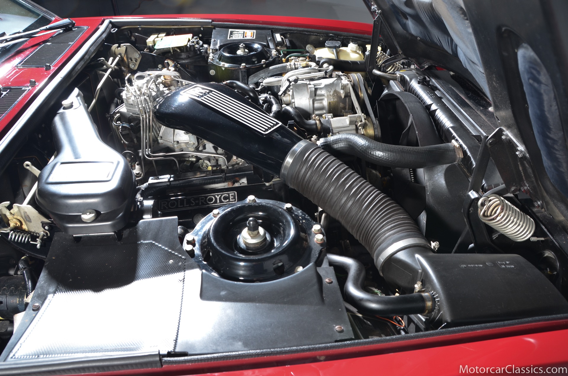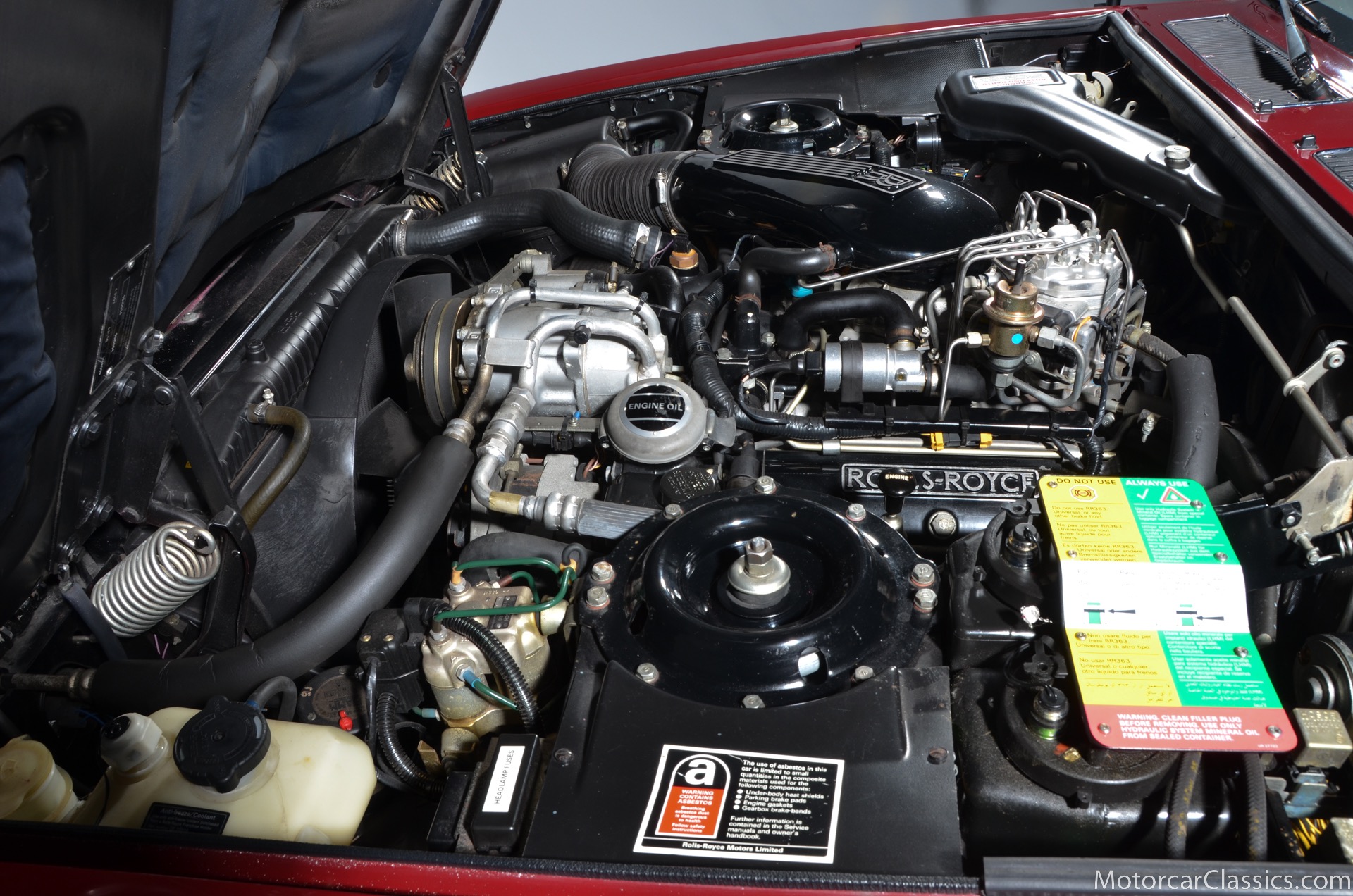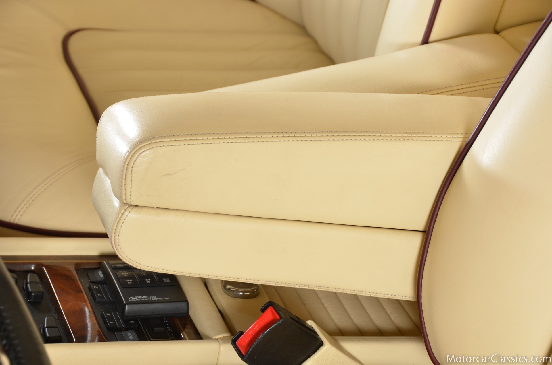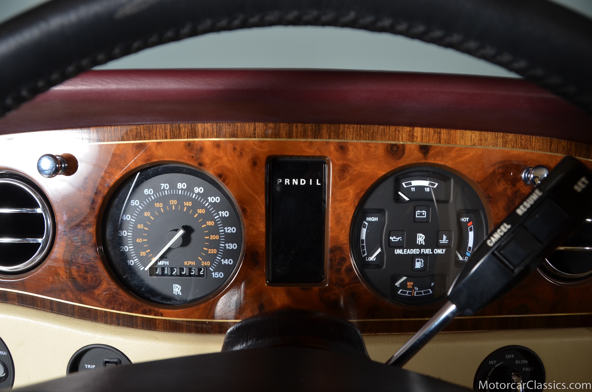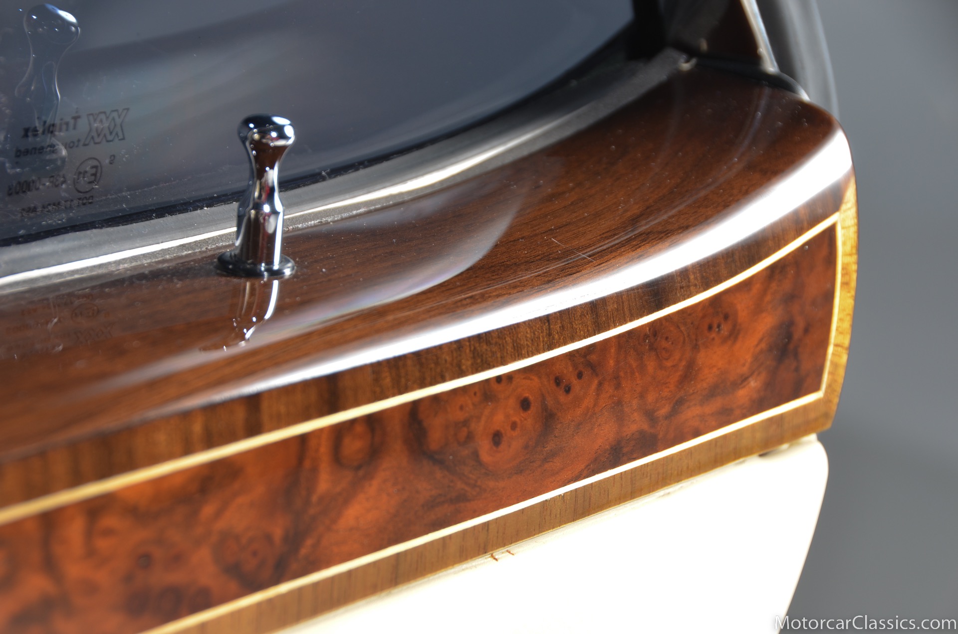 All of these MPW edition cars are finished in Bordeaux red without the Everflex roof. The bumpers and headlight surrounds are color-coded, polished stainless steel bumper inserts, stainless steel body trim running the entire length of the body sills and continuing around both wheel arches and along the lower portions of the rear wings, twin magnolia coachlines, chrome badge bar mounted on the front bumper, unique badge on the boot lid proclaiming the car's coachbuilding lineage, specially selected American burr walnut veneers, and complemented by silver inlays and Rolls-Royce monograms.