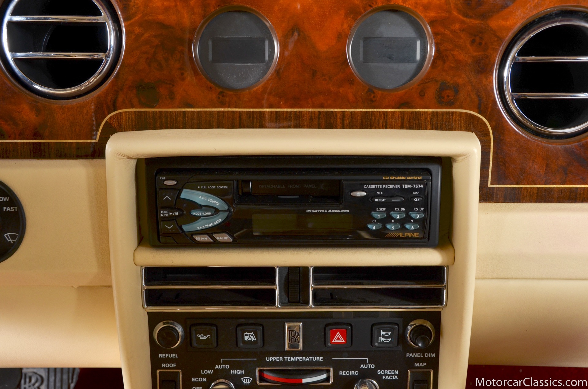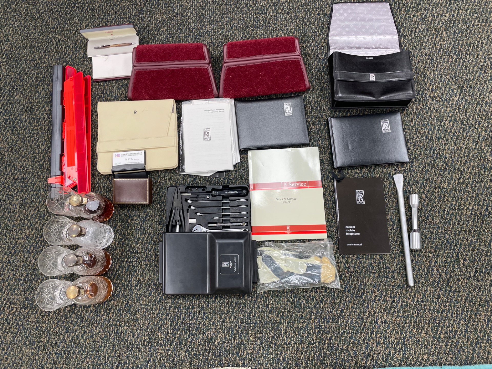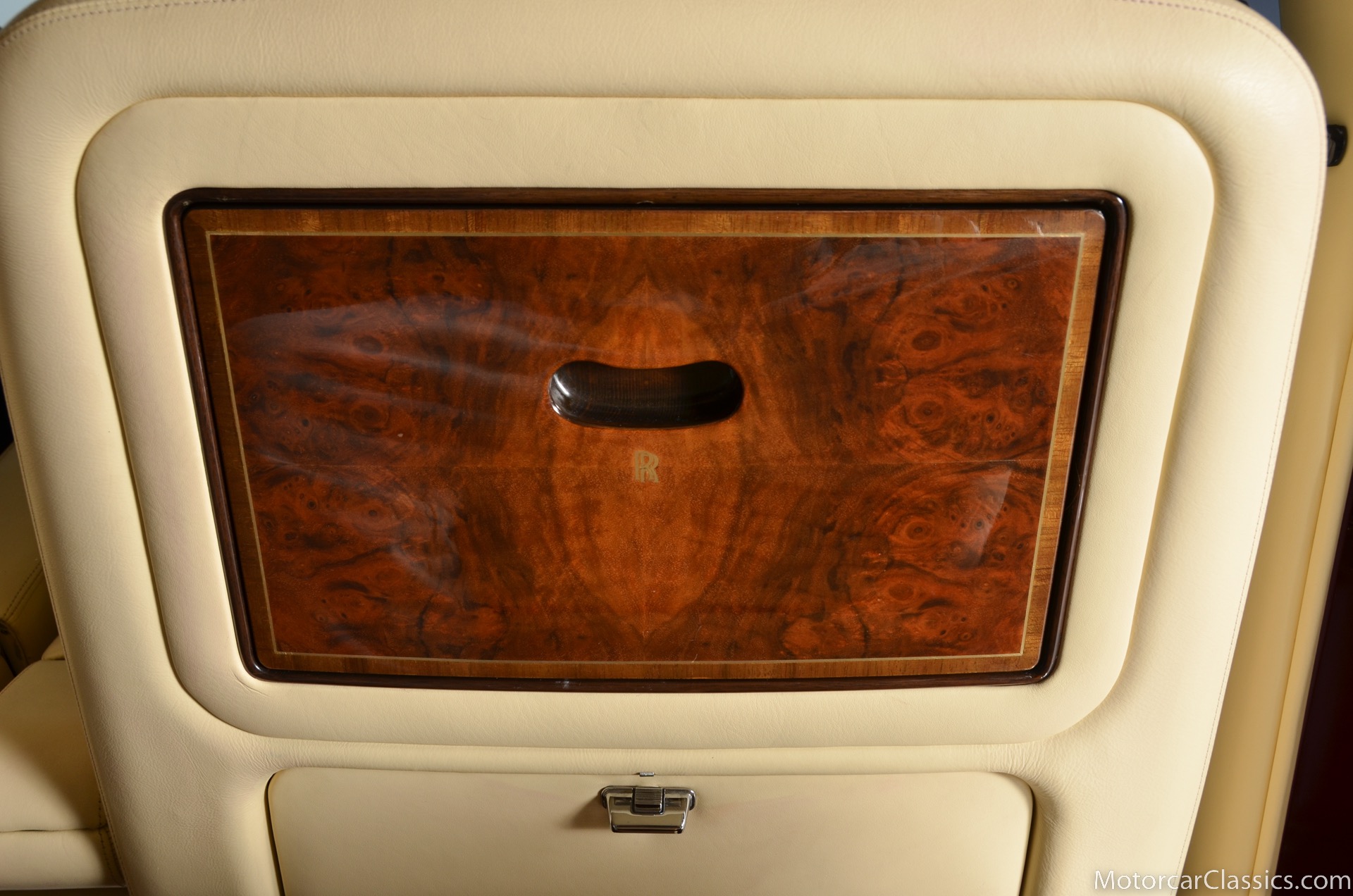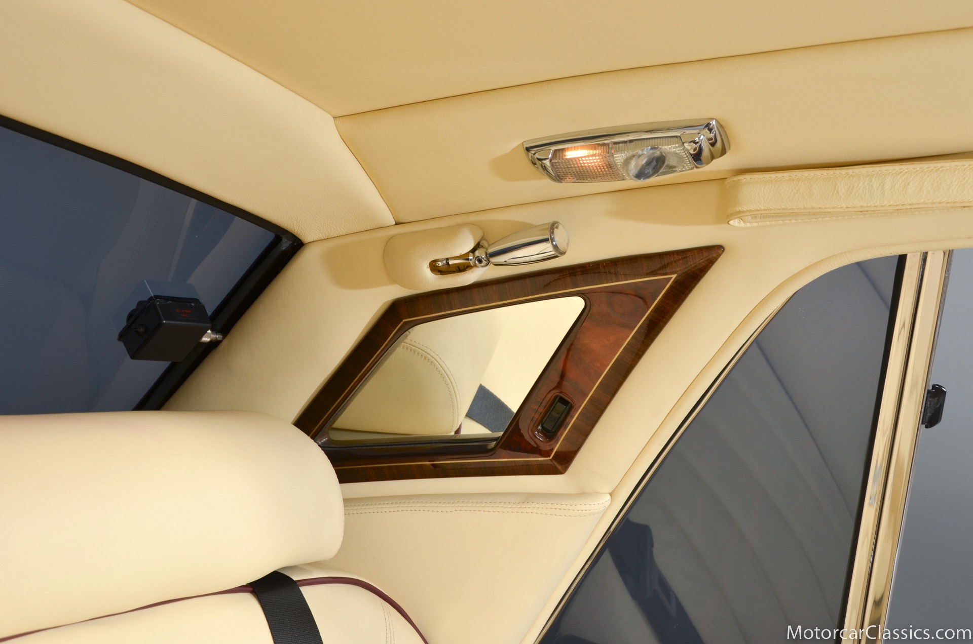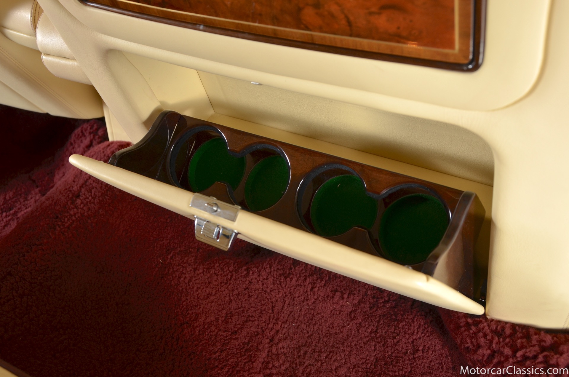 Additional amenities include a built-in and illuminated refrigerator housed between the rear seat backs that is suitable to hold two one-liter bottles, two cocktail cabinets below the two picnic tables, made from American black walnut. The cabinets contain two Royal Dalton crystal tumblers and a pair of Royal Daulton crystal decanters, each with distinctive silver screw tops and MPW monogram. The rear lower armrest contains a silver pencil and a R-R monogrammed leather-covered notebook, and space for a separate telephone and its connection, the left-hand picnic table houses writing materials that includes a monogrammed silver Cross pencil, while that on the right-hand contains a smoker's companion comprising humidor, cedar-lined cigar compartment and Dunhill silver-plated cigar cutter. In addition to the roof-mounted lamps, chrome-plated swiveling reading lamps are mounted, within the glovebox lies a driver's handbook contained in a magnolia hide wallet, and on the inside of the glove box lid a silver commemorative plaque records the car's serial number, the car's sound entertainment system is powered by two 100-watt amplifiers located in the boot, a ten-speaker system featuring a compact disc player with a six-disc stacking facility, as well as stereo cassette unit and radio. The headliner is also full leather with the finest hides of Connolly used throughout.