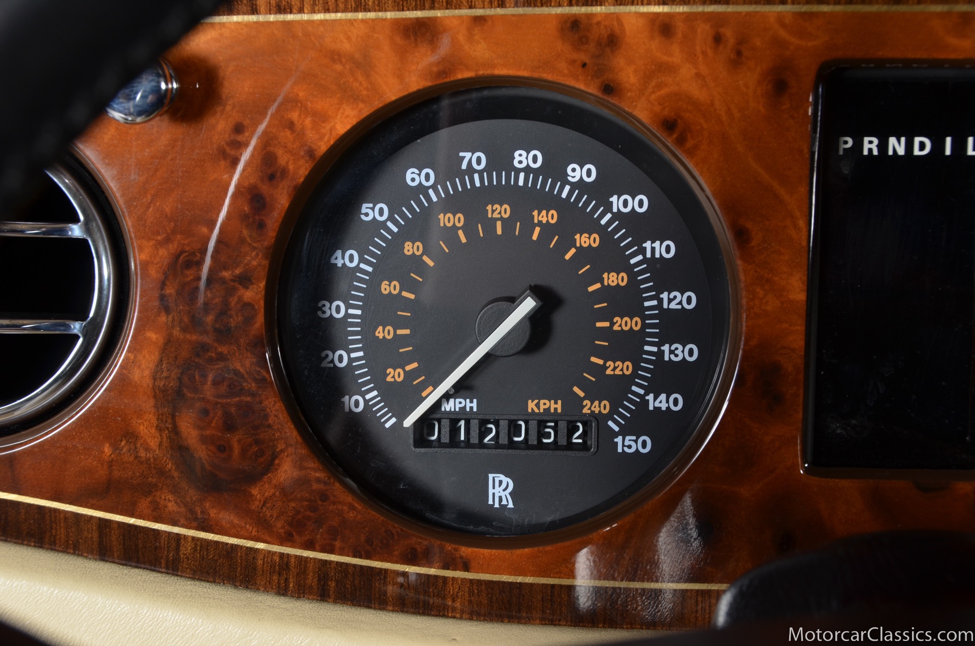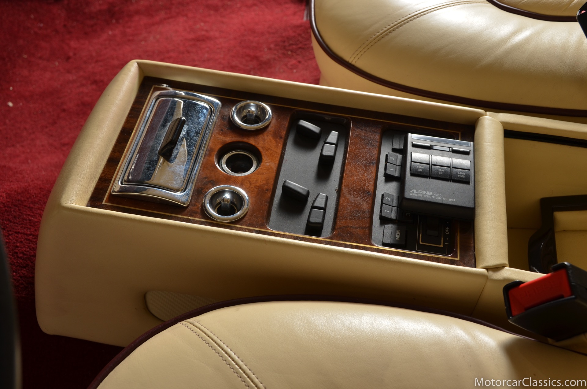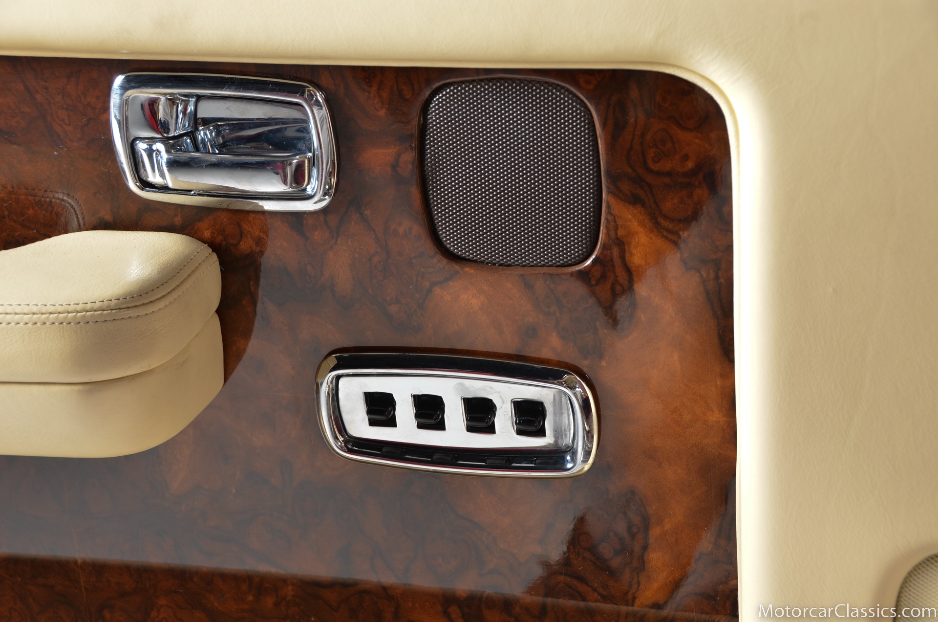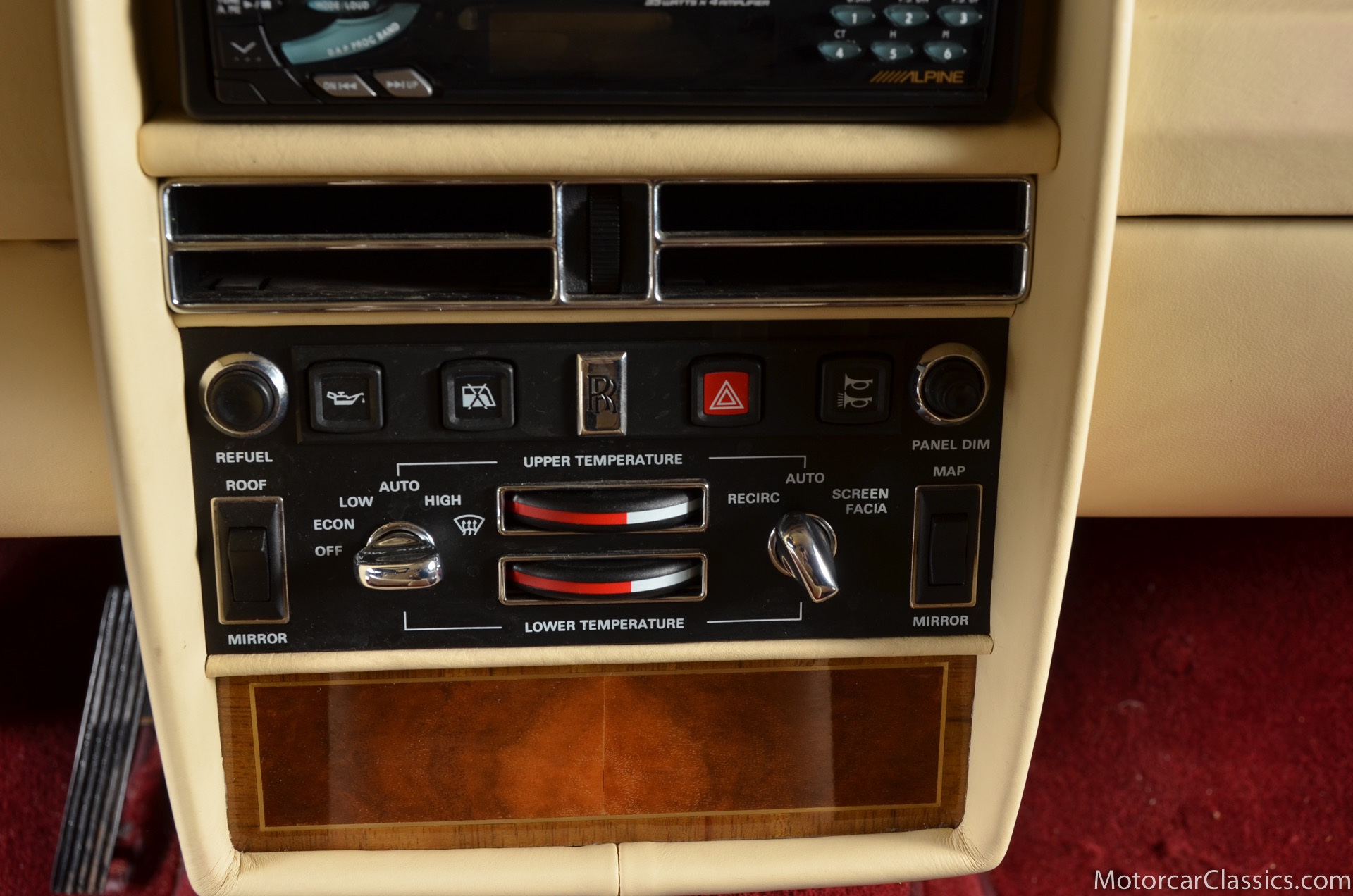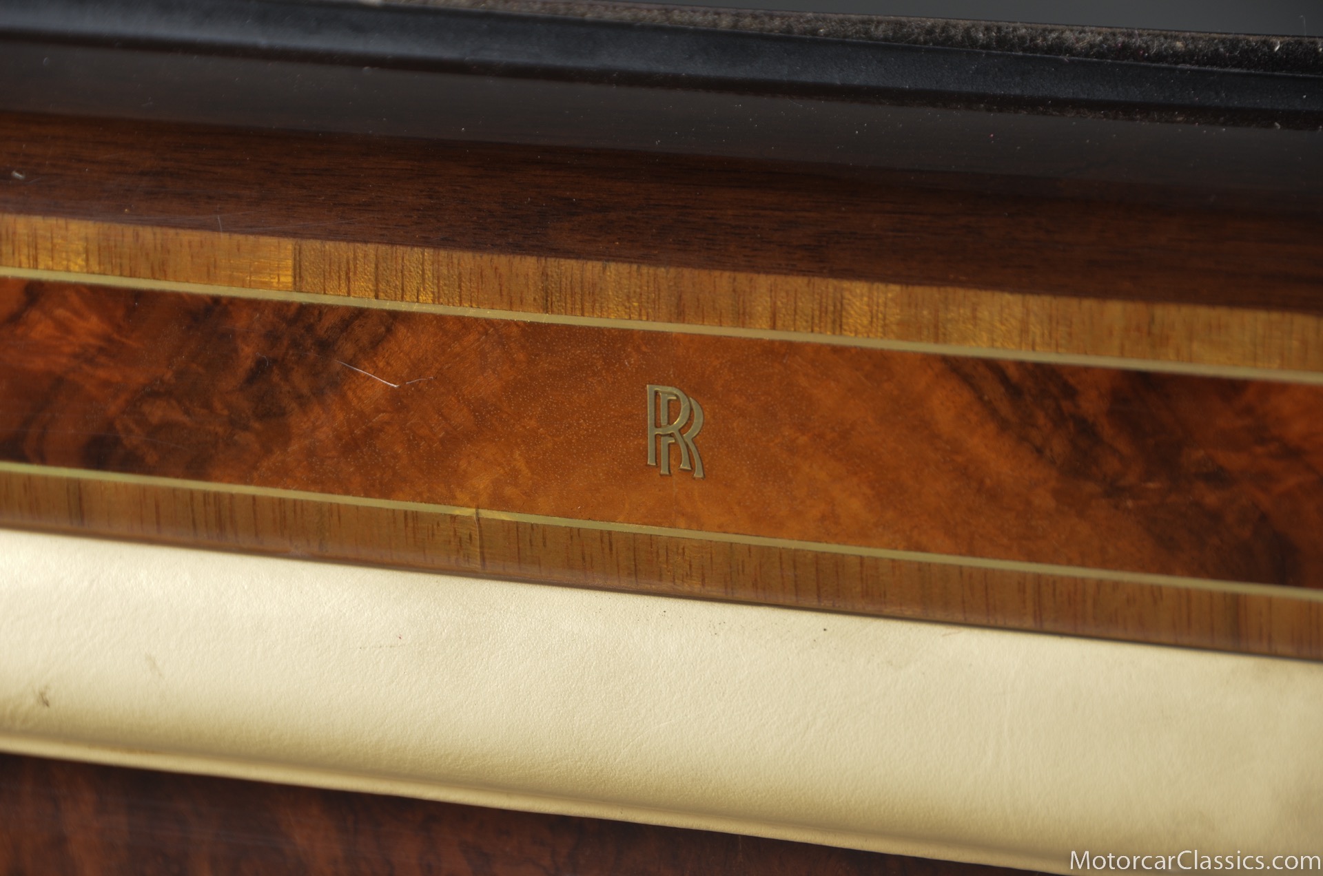 Additional amenities include a built-in and illuminated refrigerator housed between the rear seat backs that is suitable to hold two one-liter bottles, two cocktail cabinets below the two picnic tables, made from American black walnut. The cabinets contain two Royal Dalton crystal tumblers and a pair of Royal Daulton crystal decanters, each with distinctive silver screw tops and MPW monogram. The rear lower armrest contains a silver pencil and a R-R monogrammed leather-covered notebook, and space for a separate telephone and its connection, the left-hand picnic table houses writing materials that includes a monogrammed silver Cross pencil, while that on the right-hand contains a smoker's companion comprising humidor, cedar-lined cigar compartment and Dunhill silver-plated cigar cutter. In addition to the roof-mounted lamps, chrome-plated swiveling reading lamps are mounted, within the glovebox lies a driver's handbook contained in a magnolia hide wallet, and on the inside of the glove box lid a silver commemorative plaque records the car's serial number, the car's sound entertainment system is powered by two 100-watt amplifiers located in the boot, a ten-speaker system featuring a compact disc player with a six-disc stacking facility, as well as stereo cassette unit and radio. The headliner is also full leather with the finest hides of Connolly used throughout.