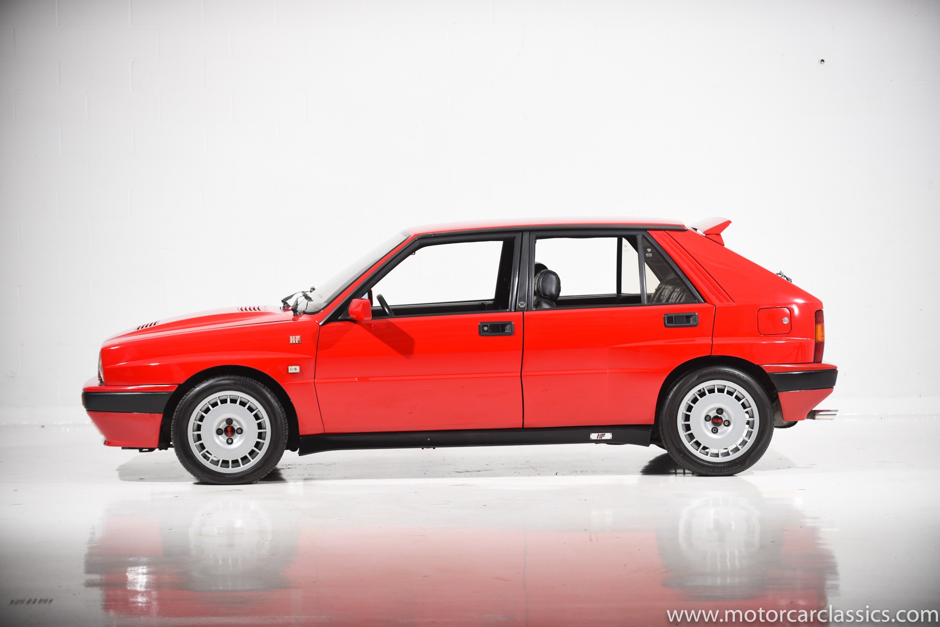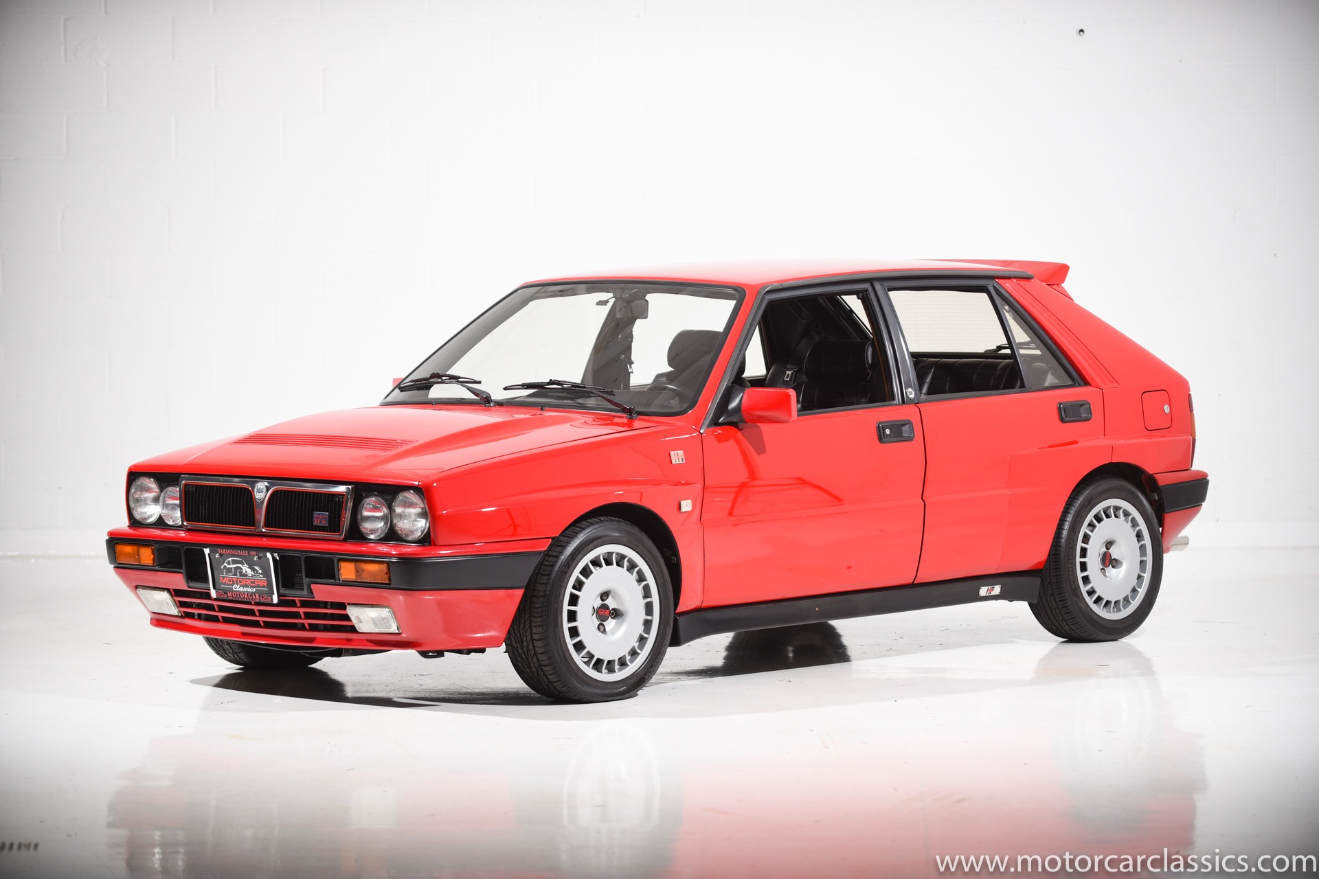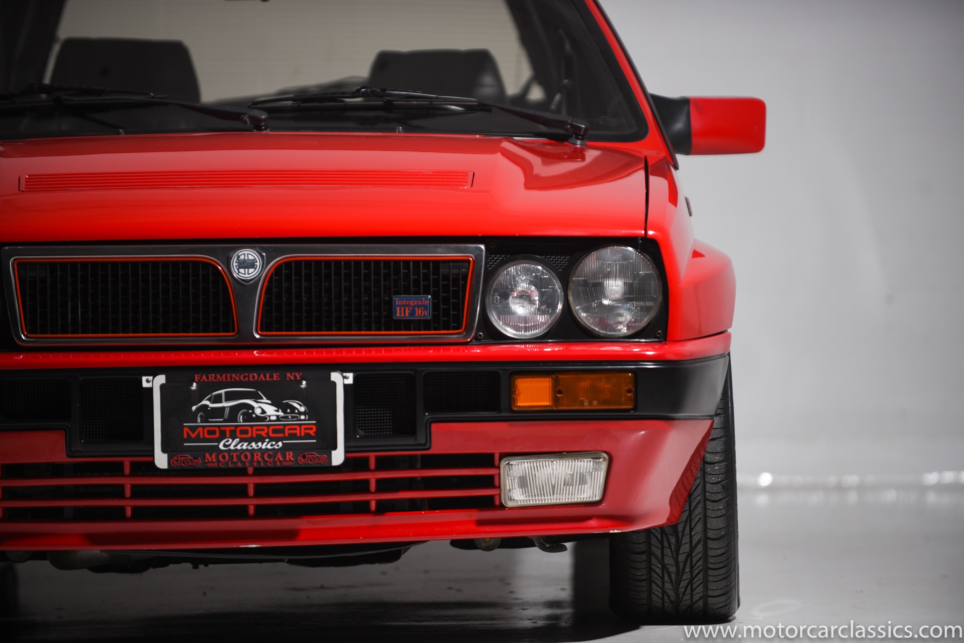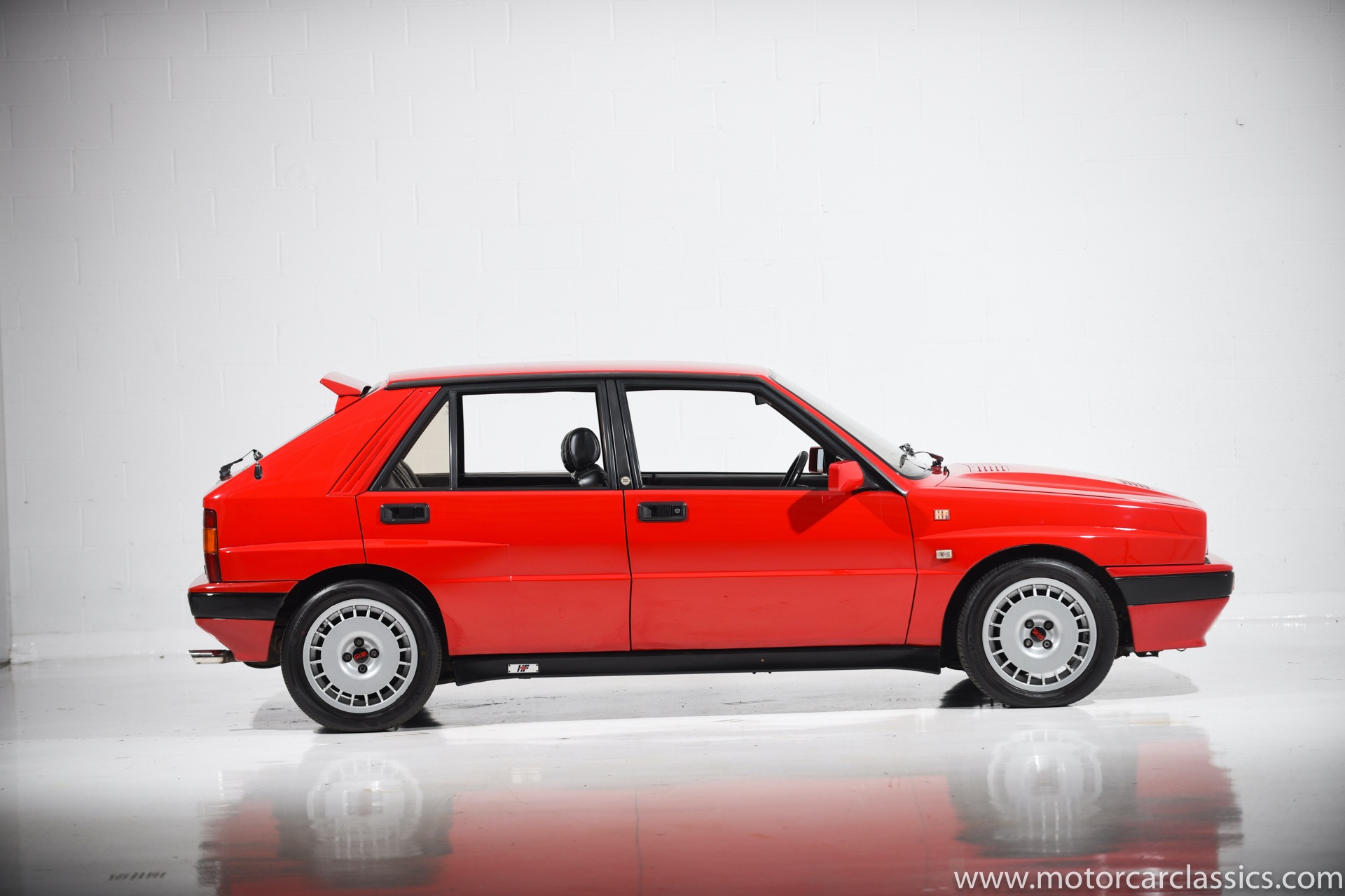 1991 Lancia Delta HF Integrale 16V for sale! Motorcar Classics is proud to present this very rare 1991 Lancia Delta HF Integrale 16V featured in red with black leather interior. A road-going descendant of Lancias world rally championship dominating cars, the Delta HF Integrale 16v features all-wheel drive, a front mounted engine and a Giugiaro-styled 5 door hatchback body style. The 2 litre engine is a turbocharged, double overhead camshaft, 4 cylinder unit that has an output of 207 bhp at 5750 rpm, and maximum torque of 220 lbft at 3500 rpm. The engine powers the wheels via a 5- speed manual transmission. Our superb example was originally delivered in Canada and imported to the US in 2010. It remains all original and has never been modified, rallied or raced. The car has only 35,523 miles. The Carfax reports a mileage inconsistency the result of the original odometer reading in kilometers. A documented change of the instrument shows the odometer being set to the correct reading, in miles, and the original instrument is included. This is surely one of the finest surviving original examples.