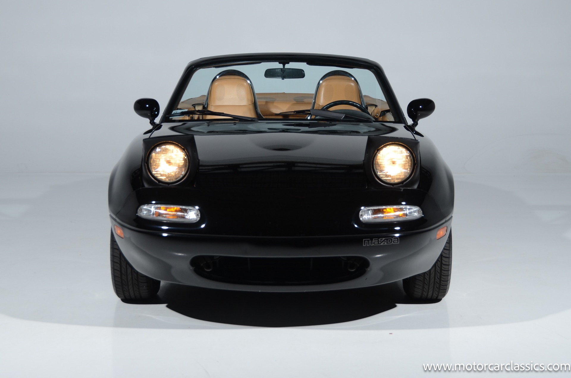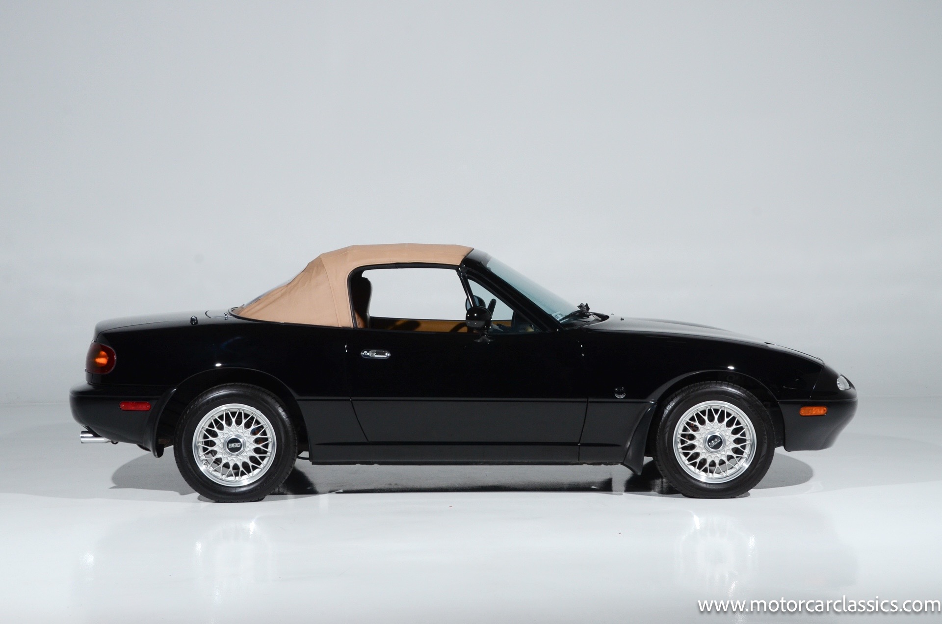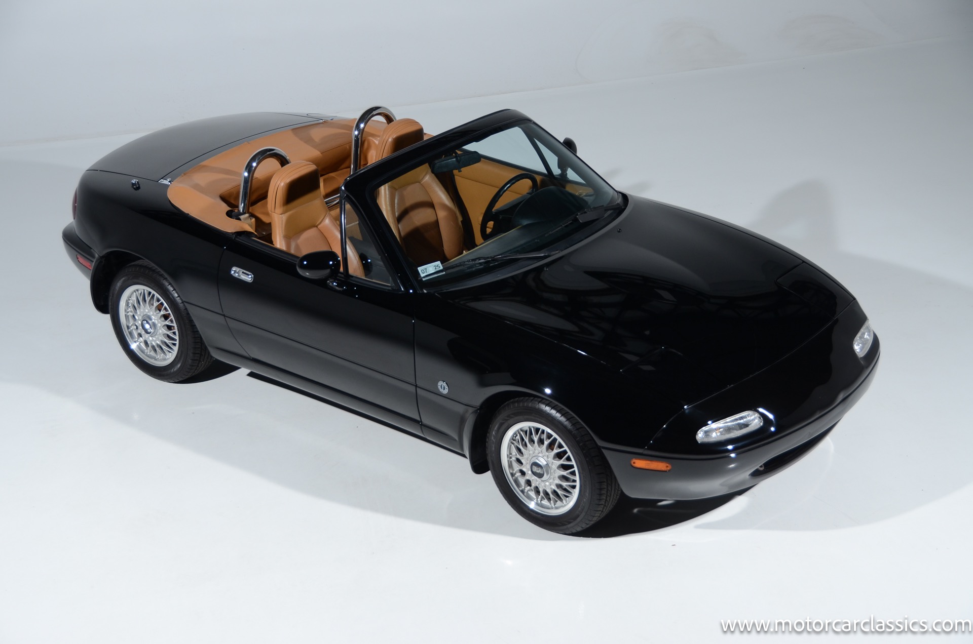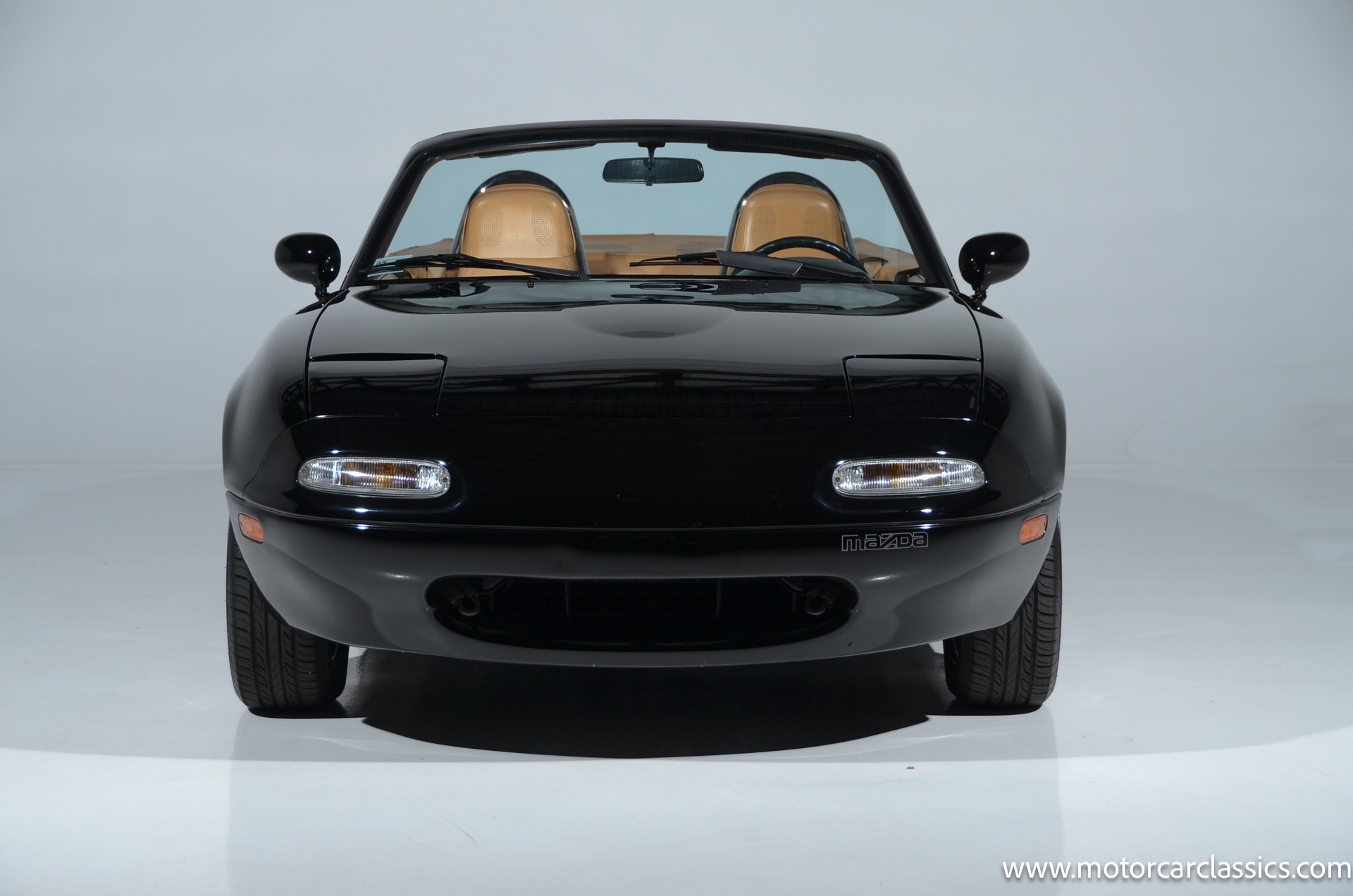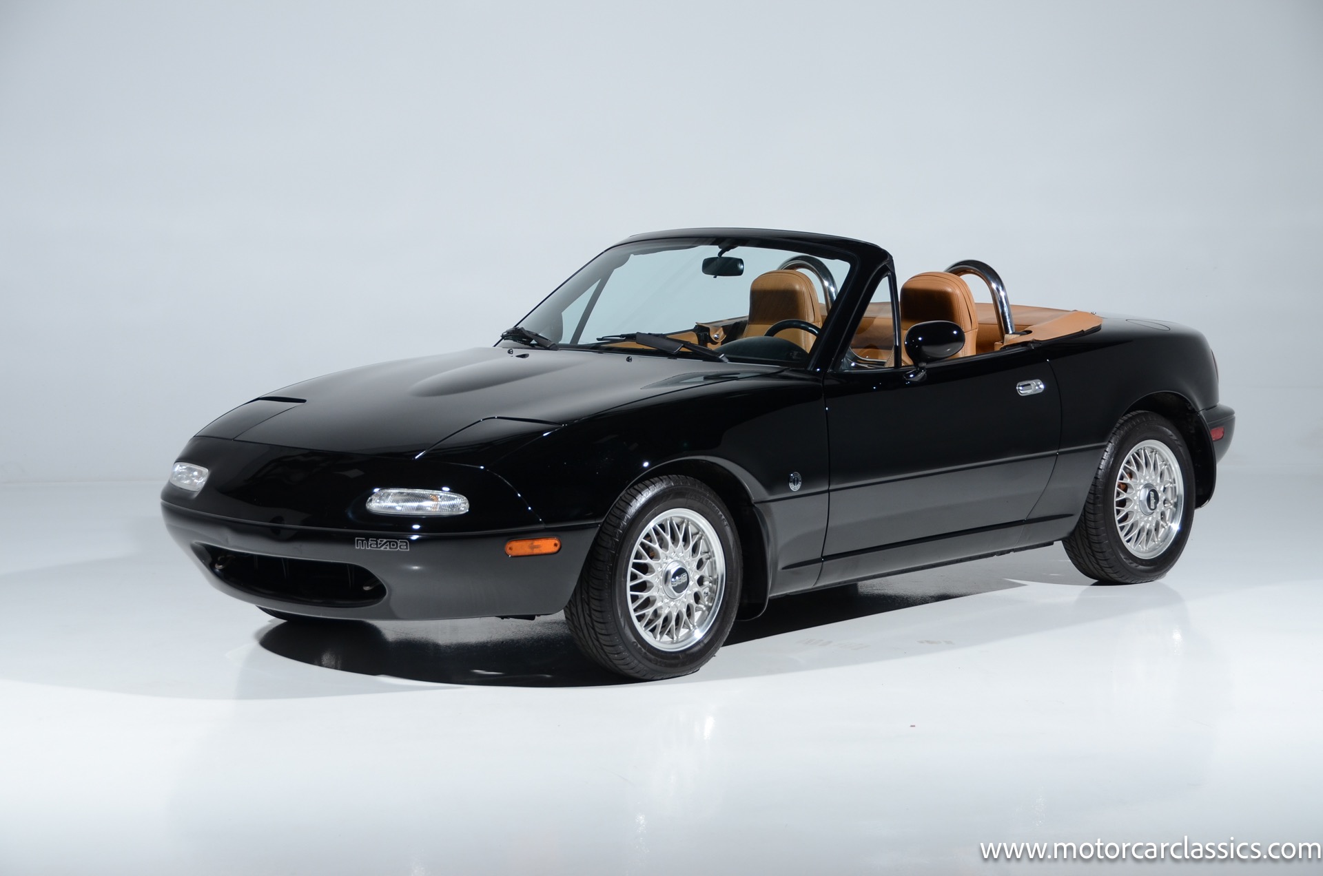 1992 Mazda Miata MX-5 for sale! Motorcar Classics is pleased to offer this Miata MX-5 convertible presented in black with tan leather interior and top. 88,681 original miles, manual transmission. Options include: power windows, power steering, leather wrapped steering wheel, alloy wheels, AM/FM/Cassette stereo, Black Miata C Package with Nardi wood shift knob and handbrake, stainless sill plates, BBS 14 alloy wheels, cruise control, headrest speakers, automatic antenna. Base MSRP $17,000 and $1,400 for C Package.