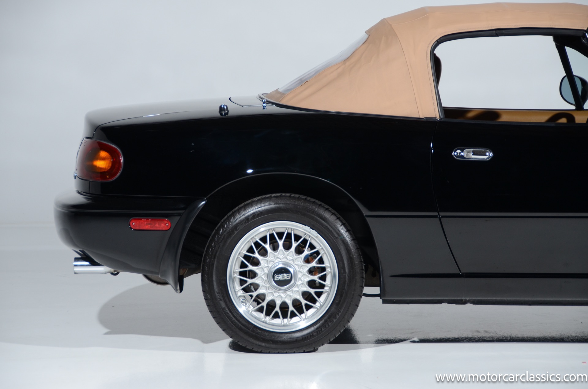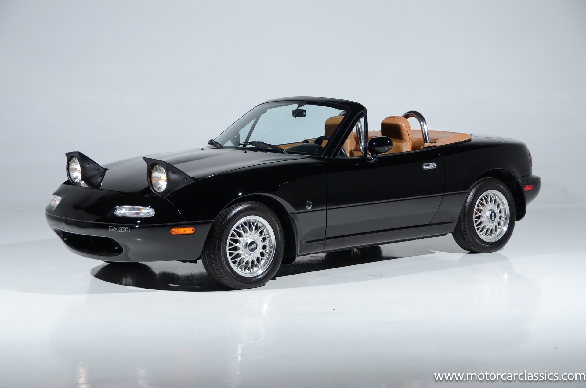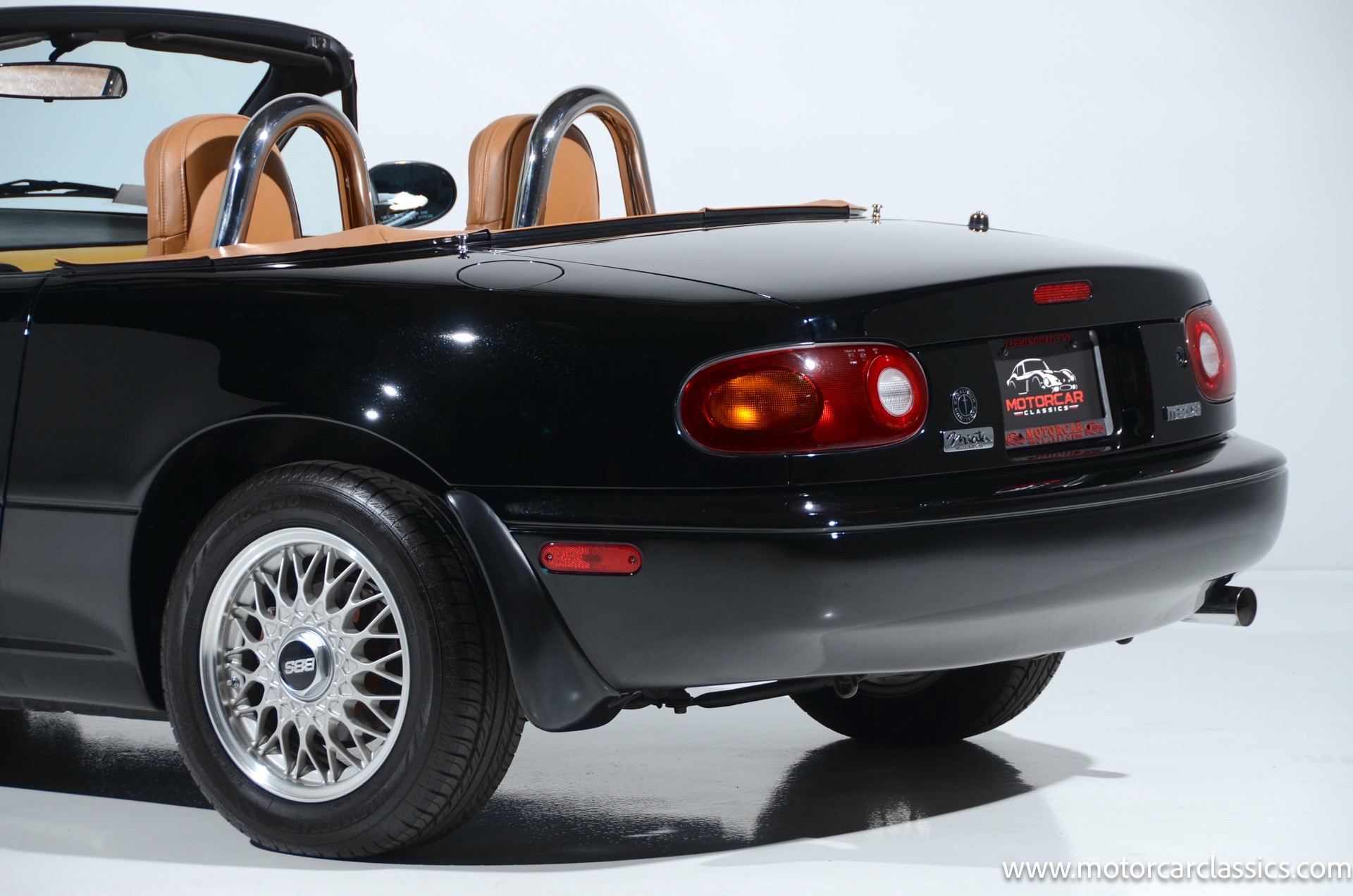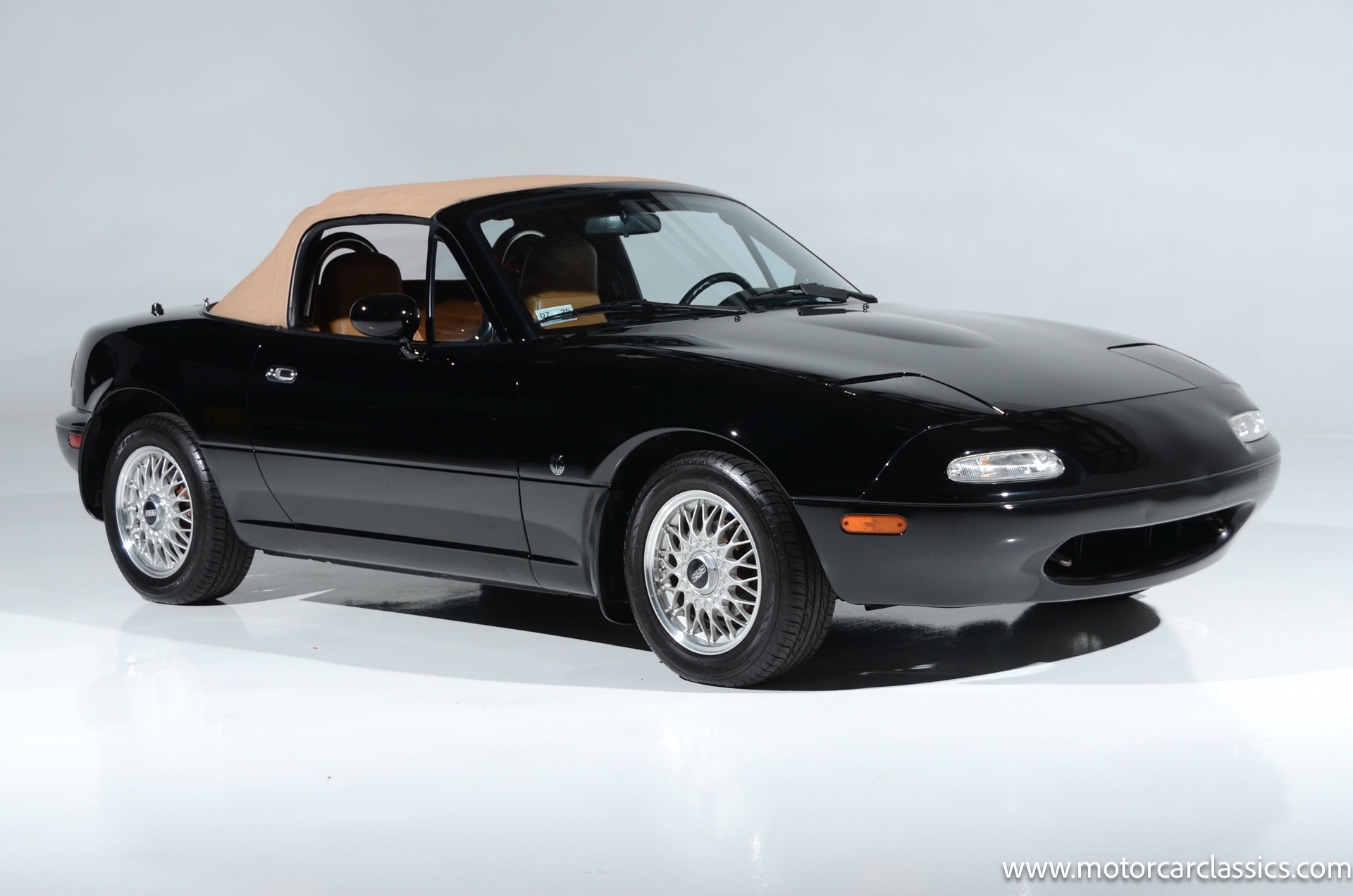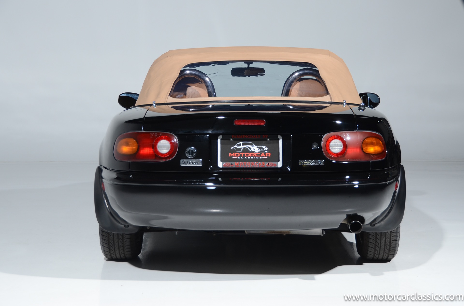 1992 Mazda Miata MX-5 for sale! Motorcar Classics is pleased to offer this Miata MX-5 convertible presented in black with tan leather interior and top. 88,681 original miles, manual transmission. Options include: power windows, power steering, leather wrapped steering wheel, alloy wheels, AM/FM/Cassette stereo, Black Miata C Package with Nardi wood shift knob and handbrake, stainless sill plates, BBS 14 alloy wheels, cruise control, headrest speakers, automatic antenna. Base MSRP $17,000 and $1,400 for C Package.