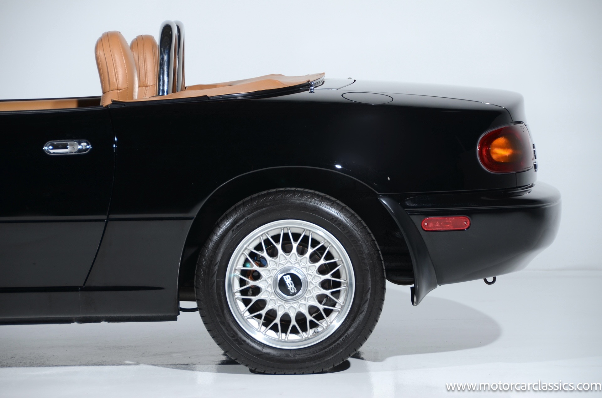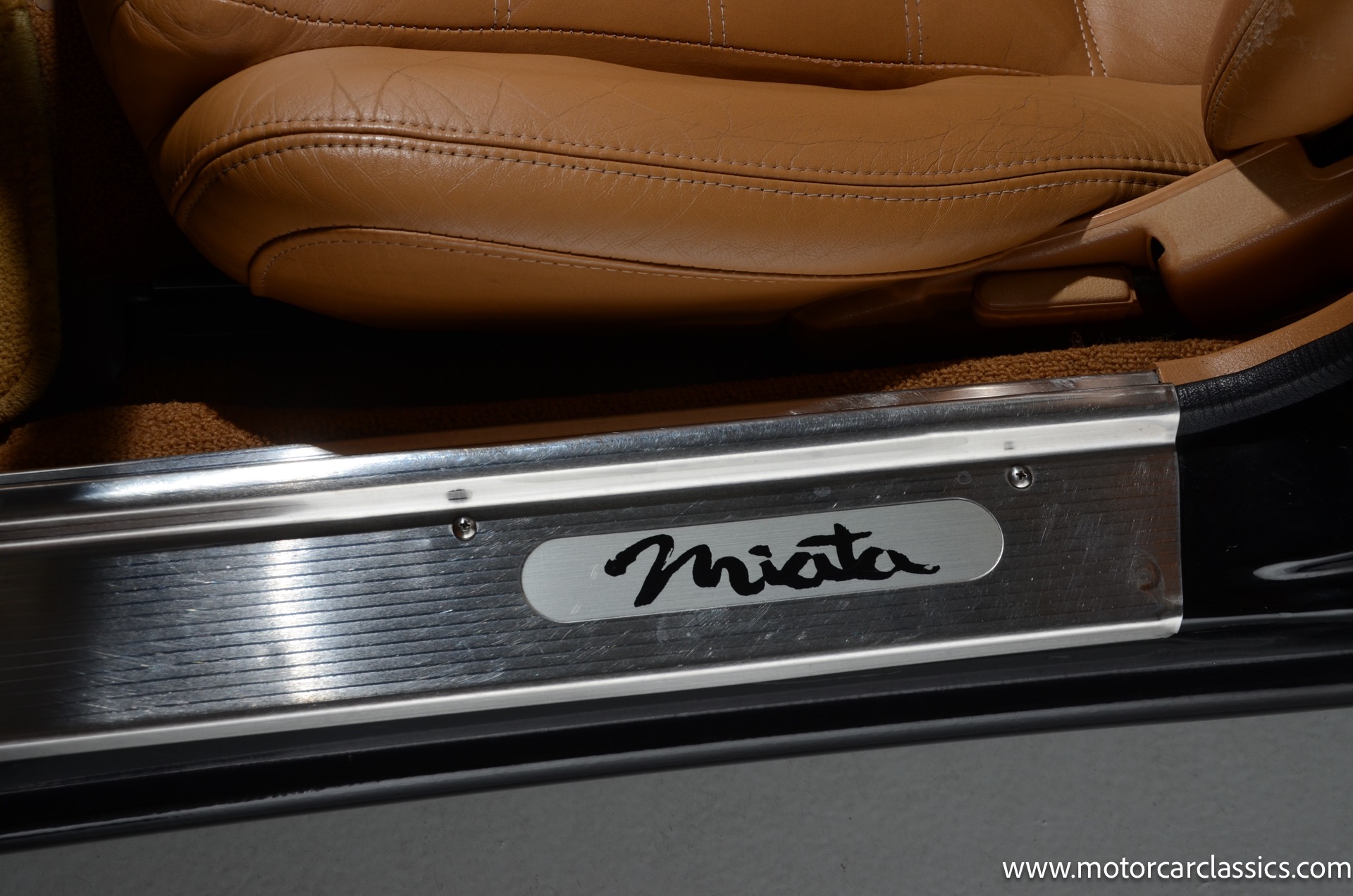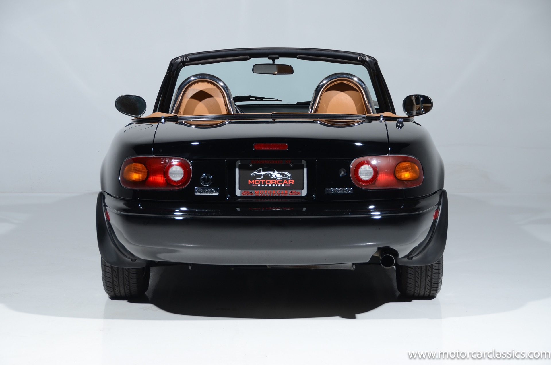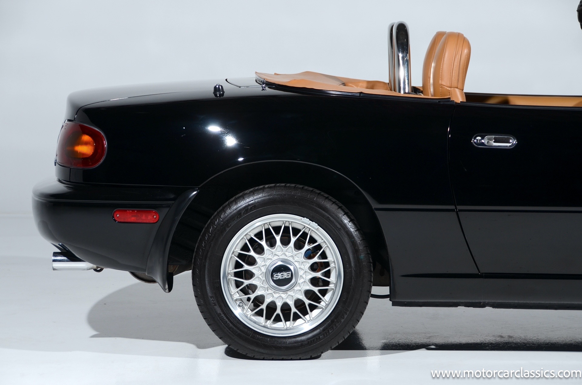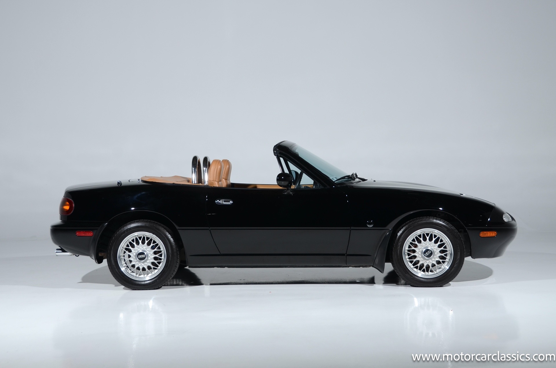 1992 Mazda Miata MX-5 for sale! Motorcar Classics is pleased to offer this Miata MX-5 convertible presented in black with tan leather interior and top. 88,681 original miles, manual transmission. Options include: power windows, power steering, leather wrapped steering wheel, alloy wheels, AM/FM/Cassette stereo, Black Miata C Package with Nardi wood shift knob and handbrake, stainless sill plates, BBS 14 alloy wheels, cruise control, headrest speakers, automatic antenna. Base MSRP $17,000 and $1,400 for C Package.