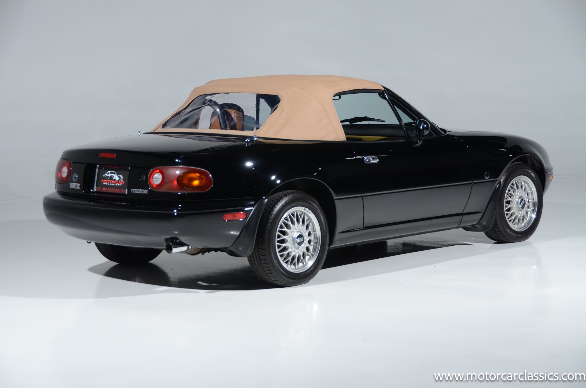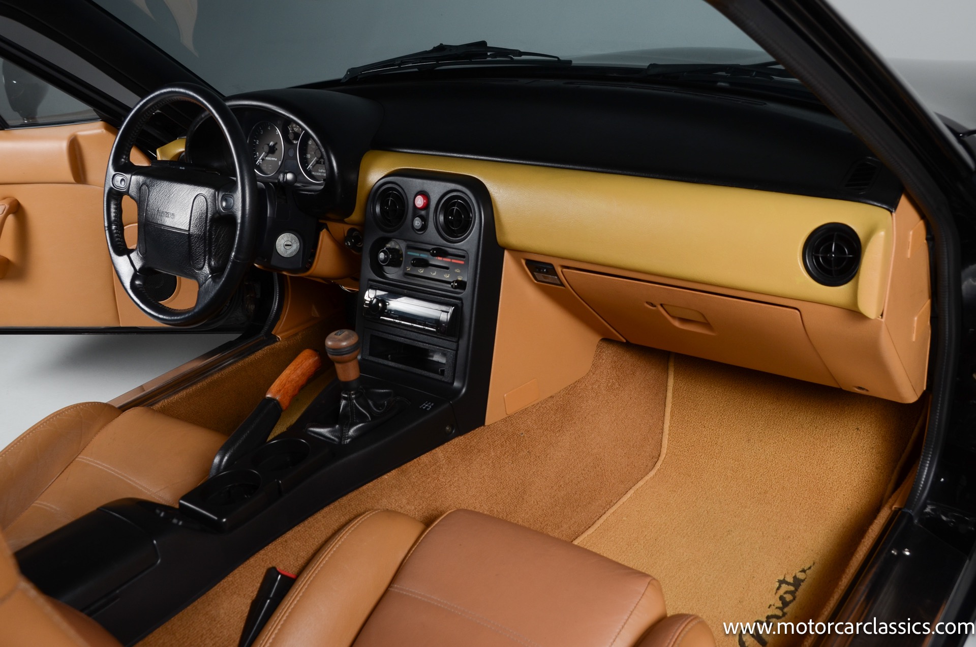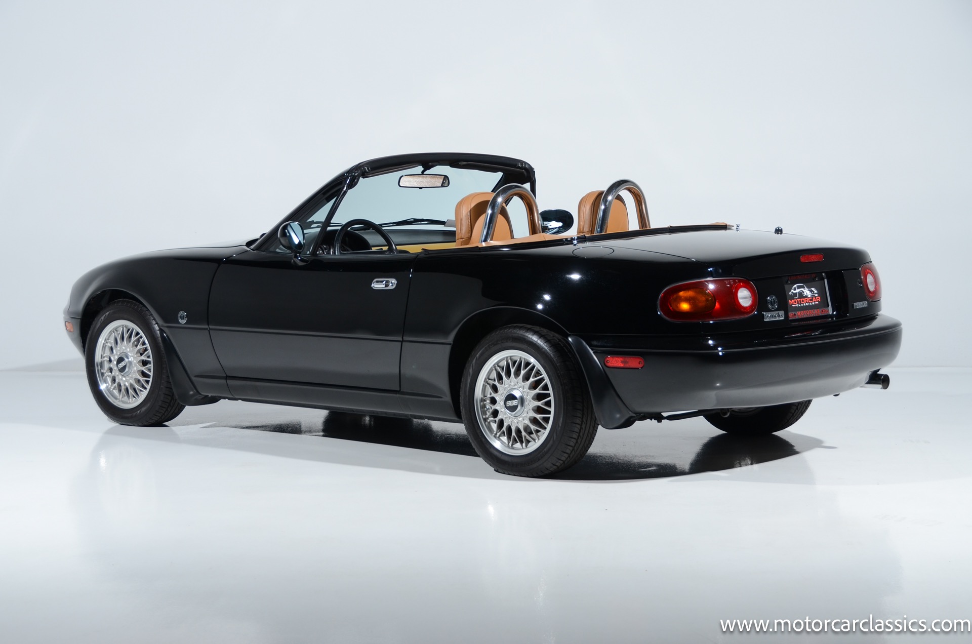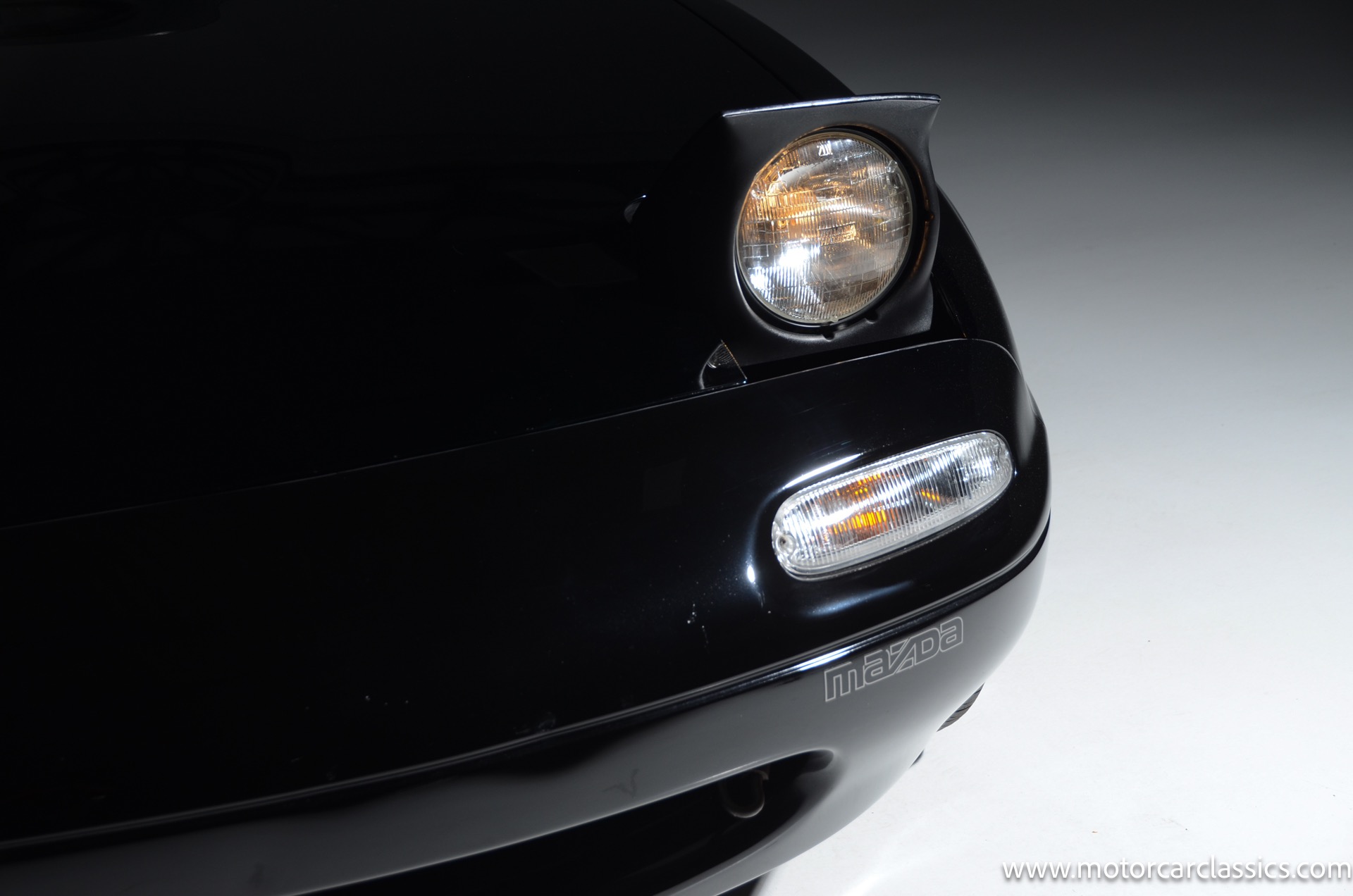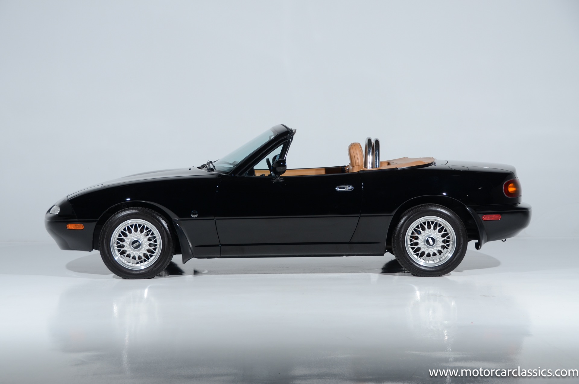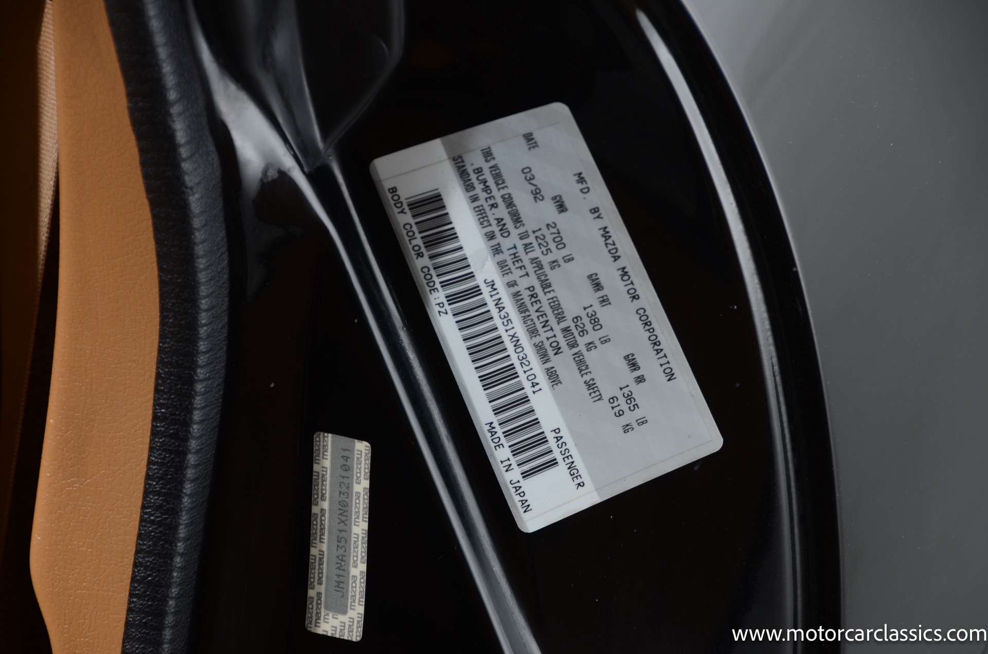 1992 Mazda Miata MX-5 for sale! Motorcar Classics is pleased to offer this Miata MX-5 convertible presented in black with tan leather interior and top. 88,681 original miles, manual transmission. Options include: power windows, power steering, leather wrapped steering wheel, alloy wheels, AM/FM/Cassette stereo, Black Miata C Package with Nardi wood shift knob and handbrake, stainless sill plates, BBS 14 alloy wheels, cruise control, headrest speakers, automatic antenna. Base MSRP $17,000 and $1,400 for C Package.