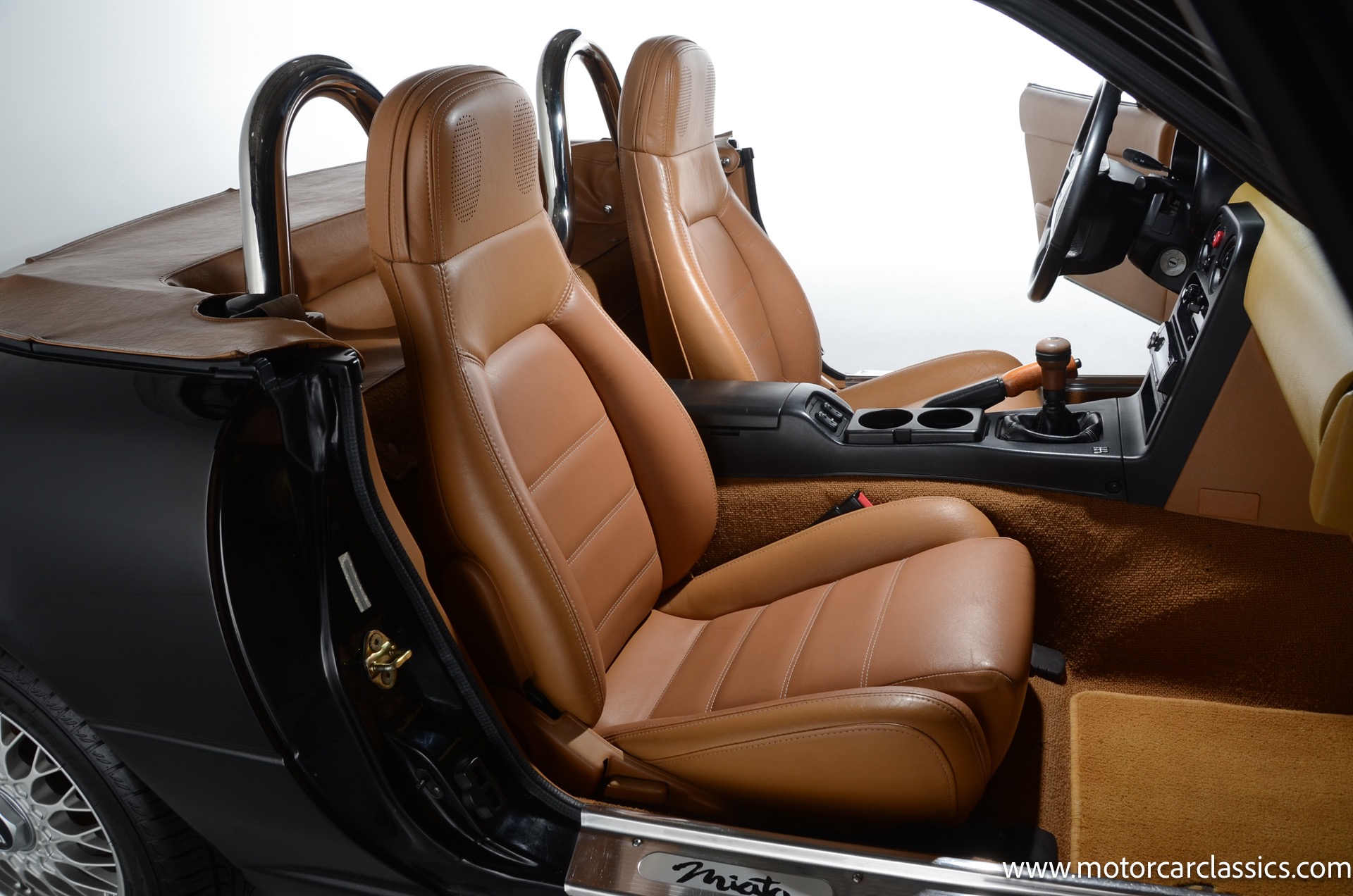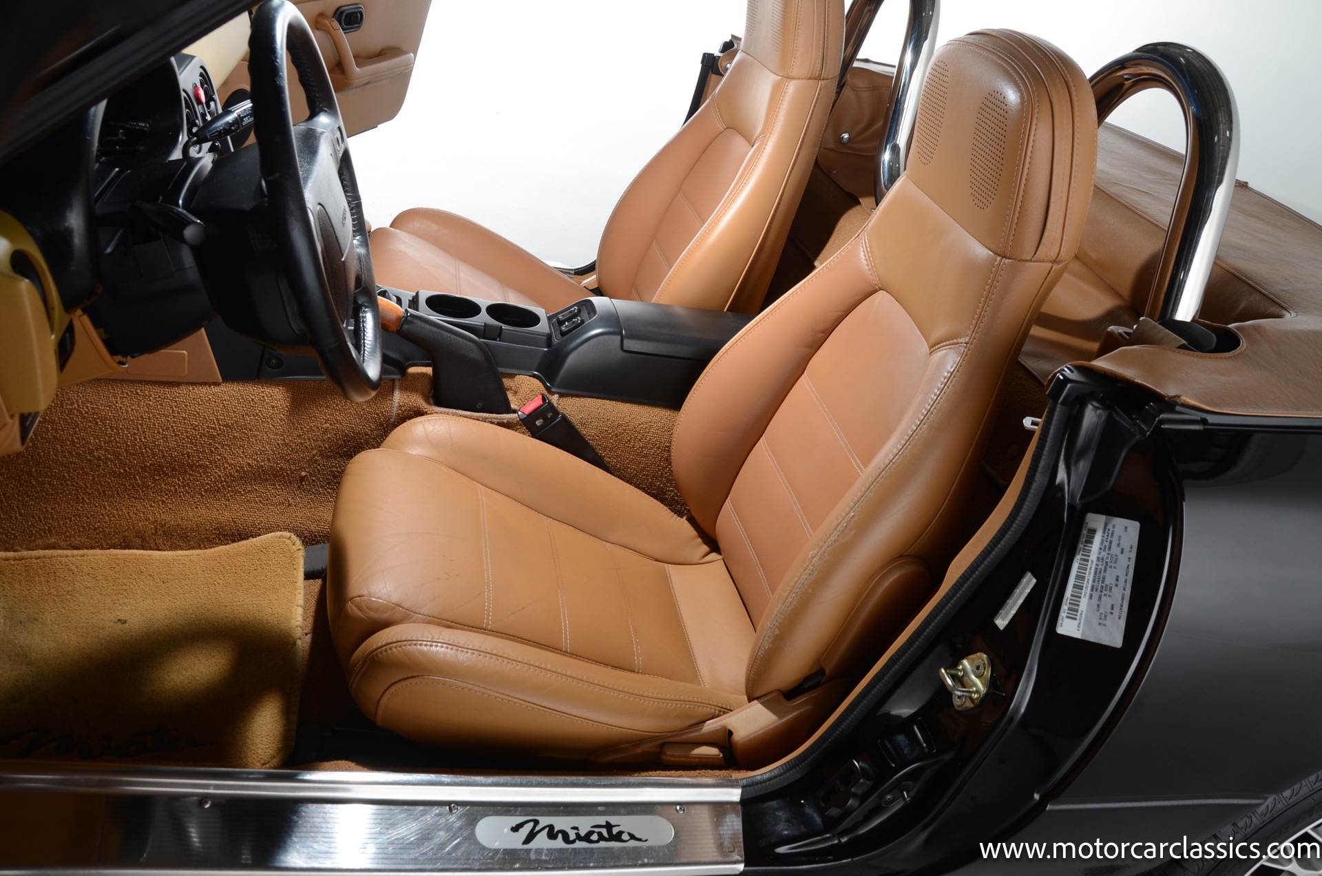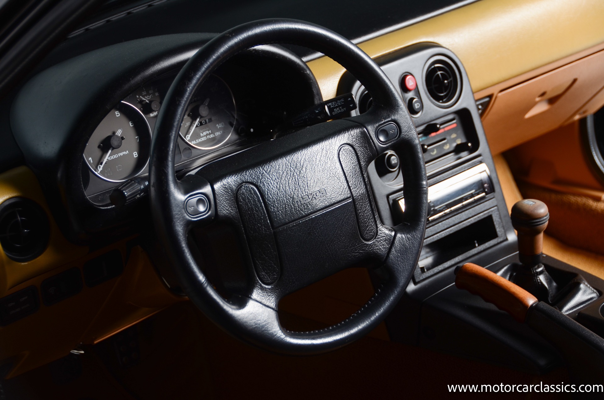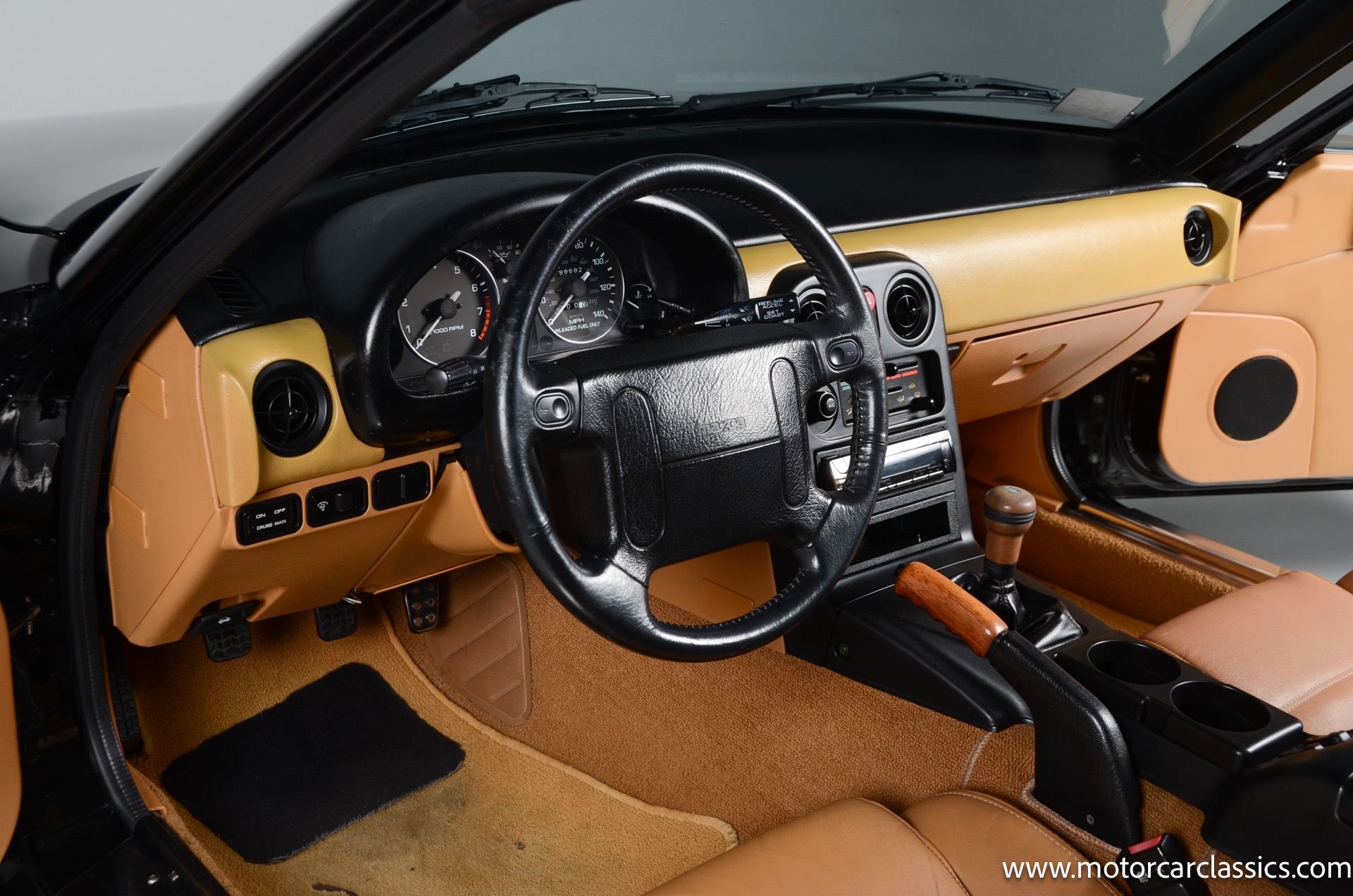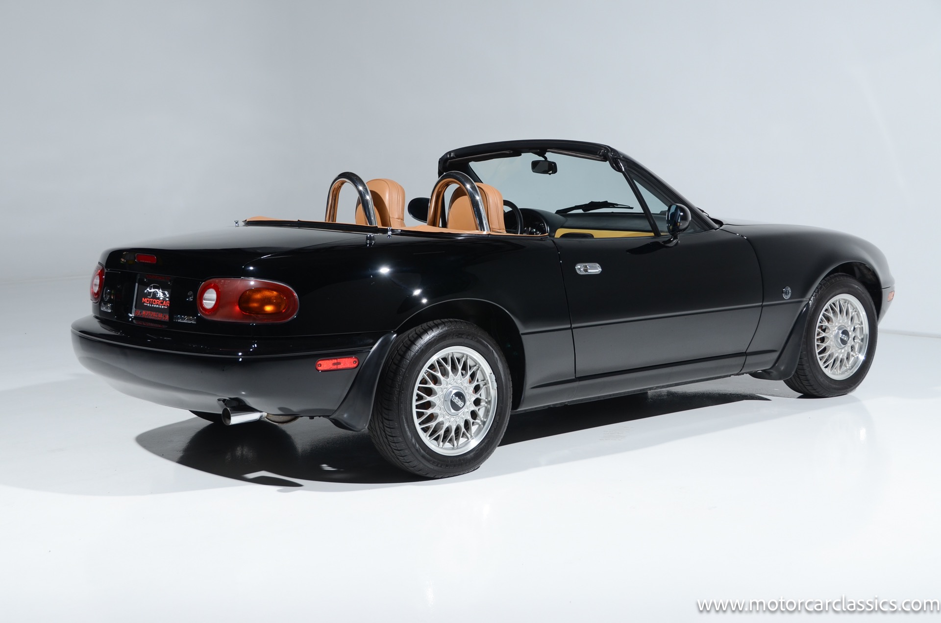 1992 Mazda Miata MX-5 for sale! Motorcar Classics is pleased to offer this Miata MX-5 convertible presented in black with tan leather interior and top. 88,681 original miles, manual transmission. Options include: power windows, power steering, leather wrapped steering wheel, alloy wheels, AM/FM/Cassette stereo, Black Miata C Package with Nardi wood shift knob and handbrake, stainless sill plates, BBS 14 alloy wheels, cruise control, headrest speakers, automatic antenna. Base MSRP $17,000 and $1,400 for C Package.