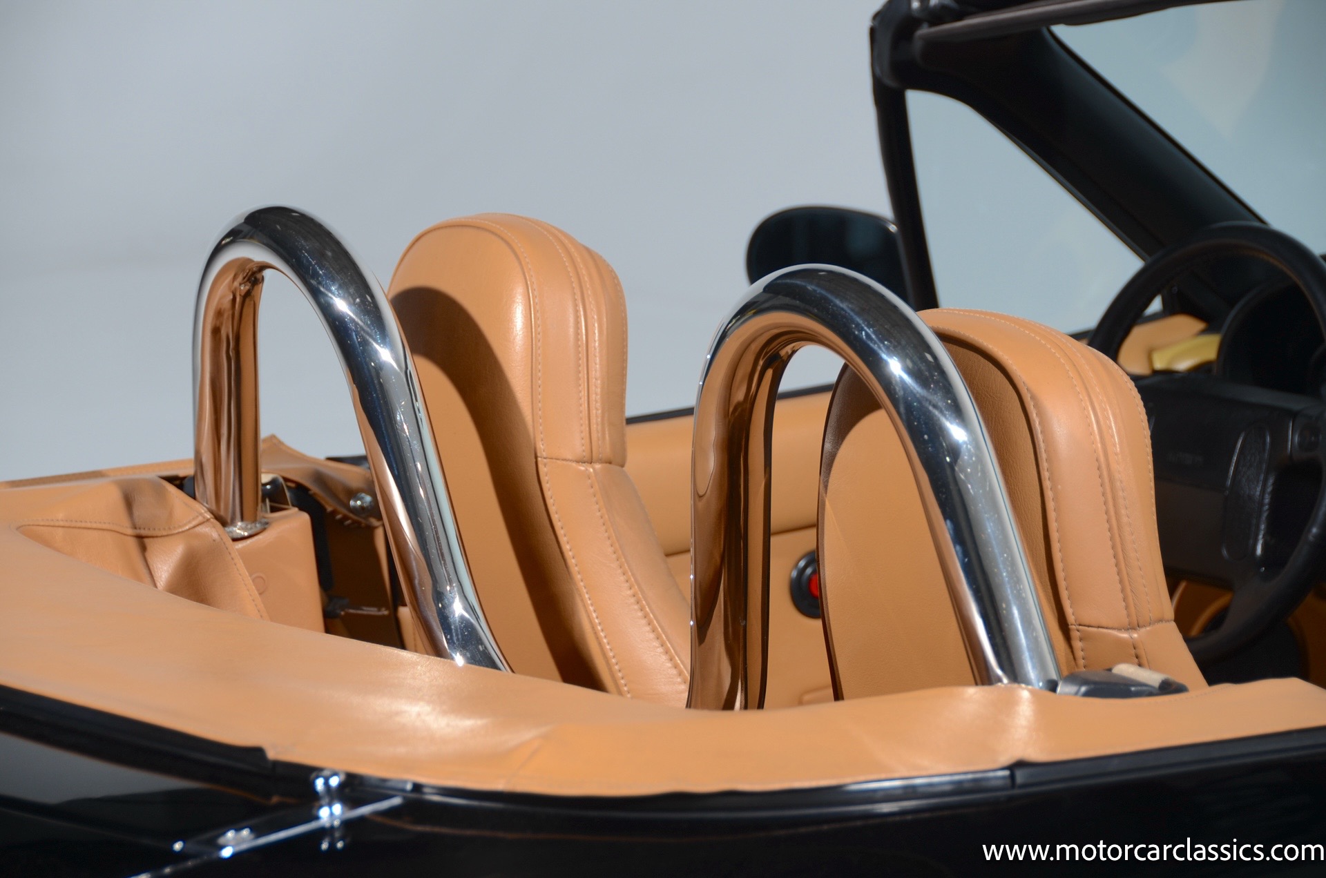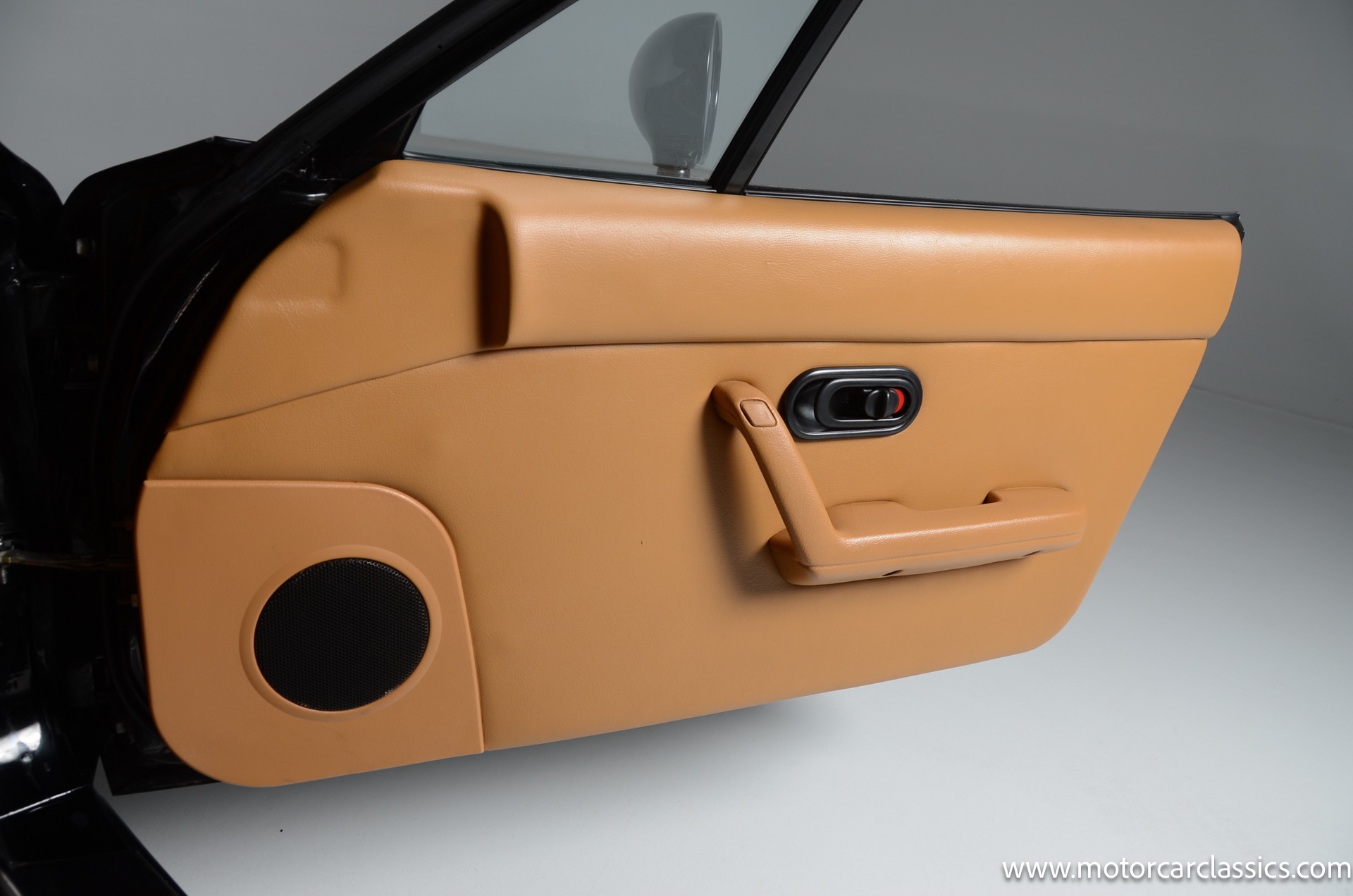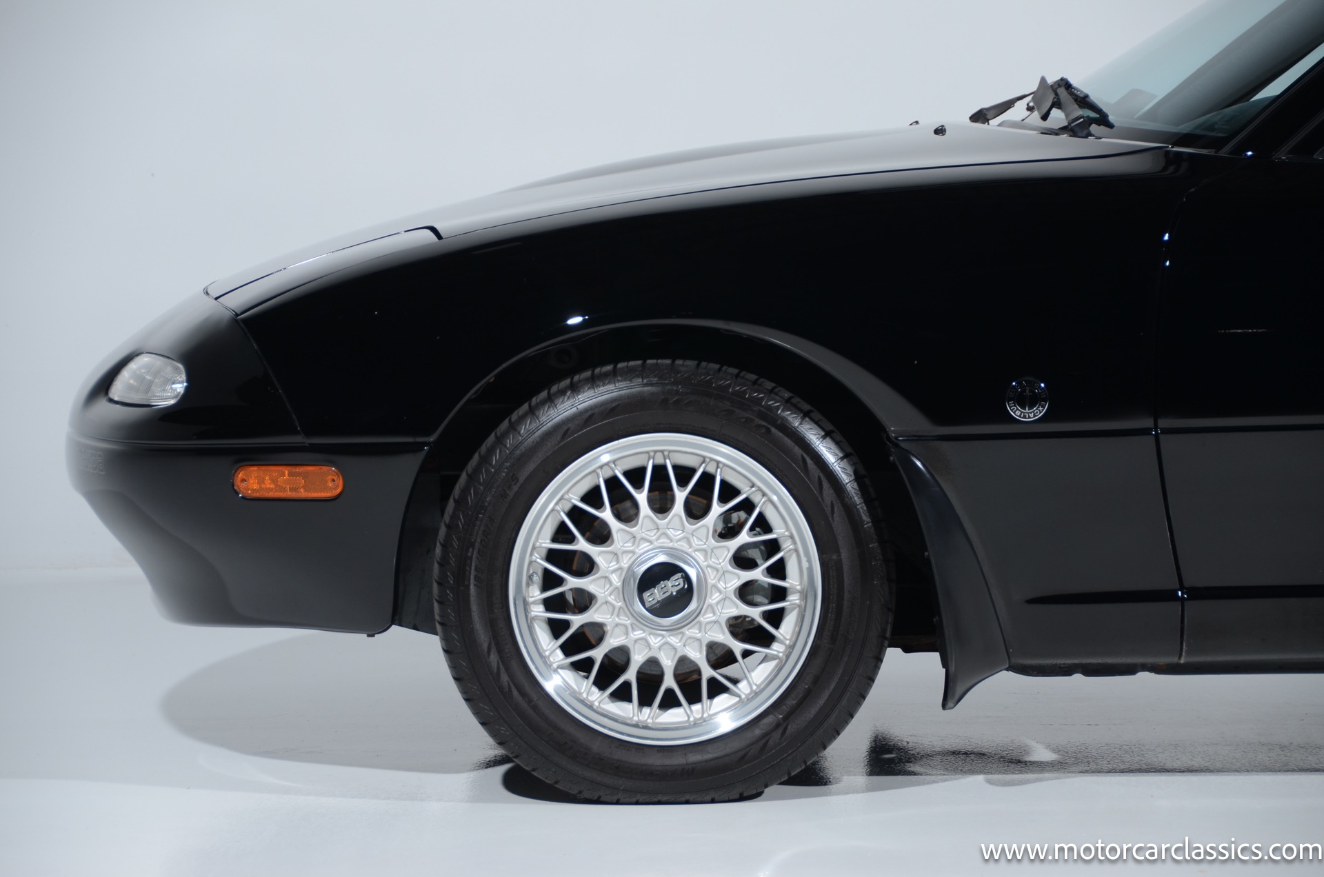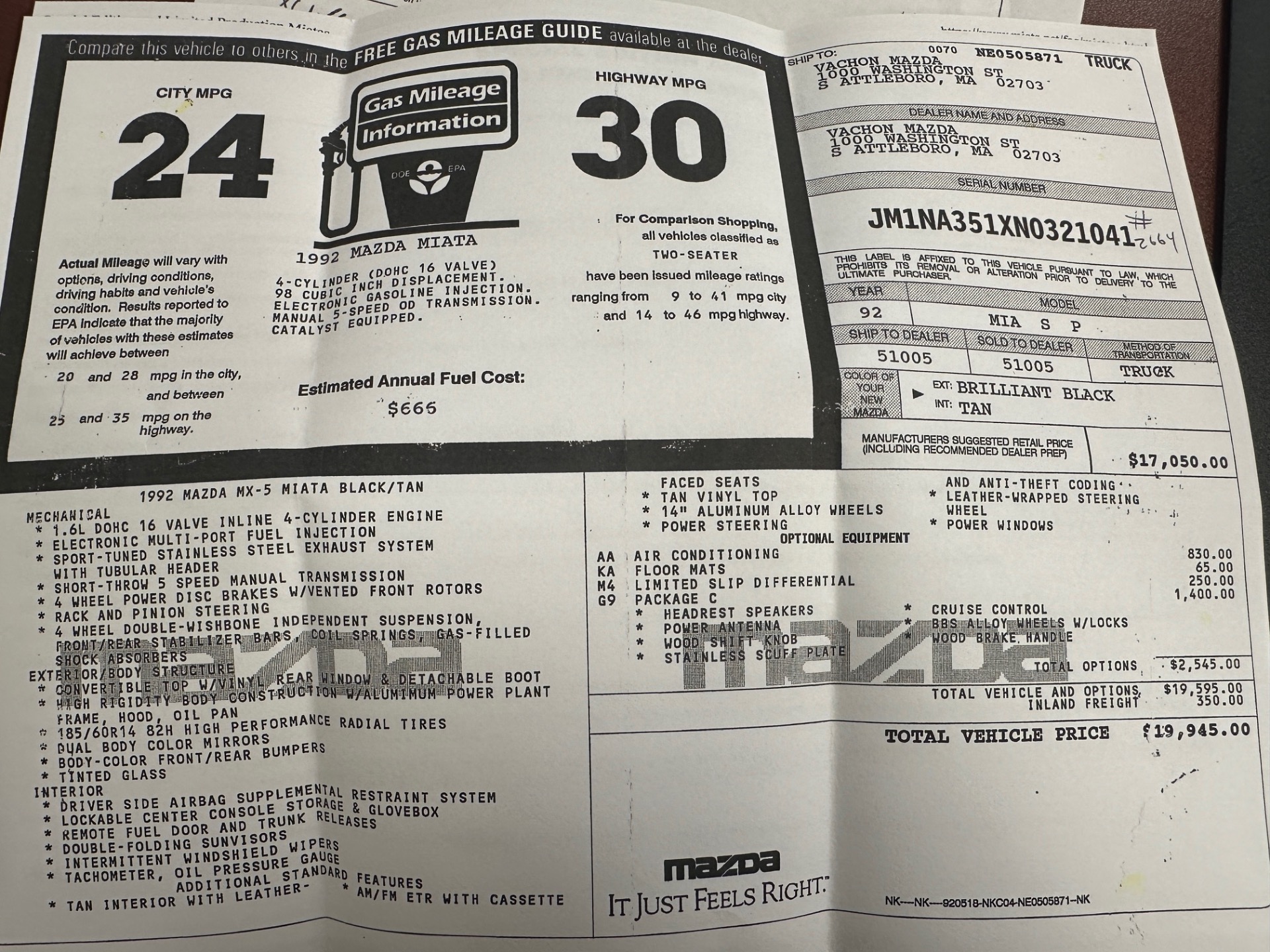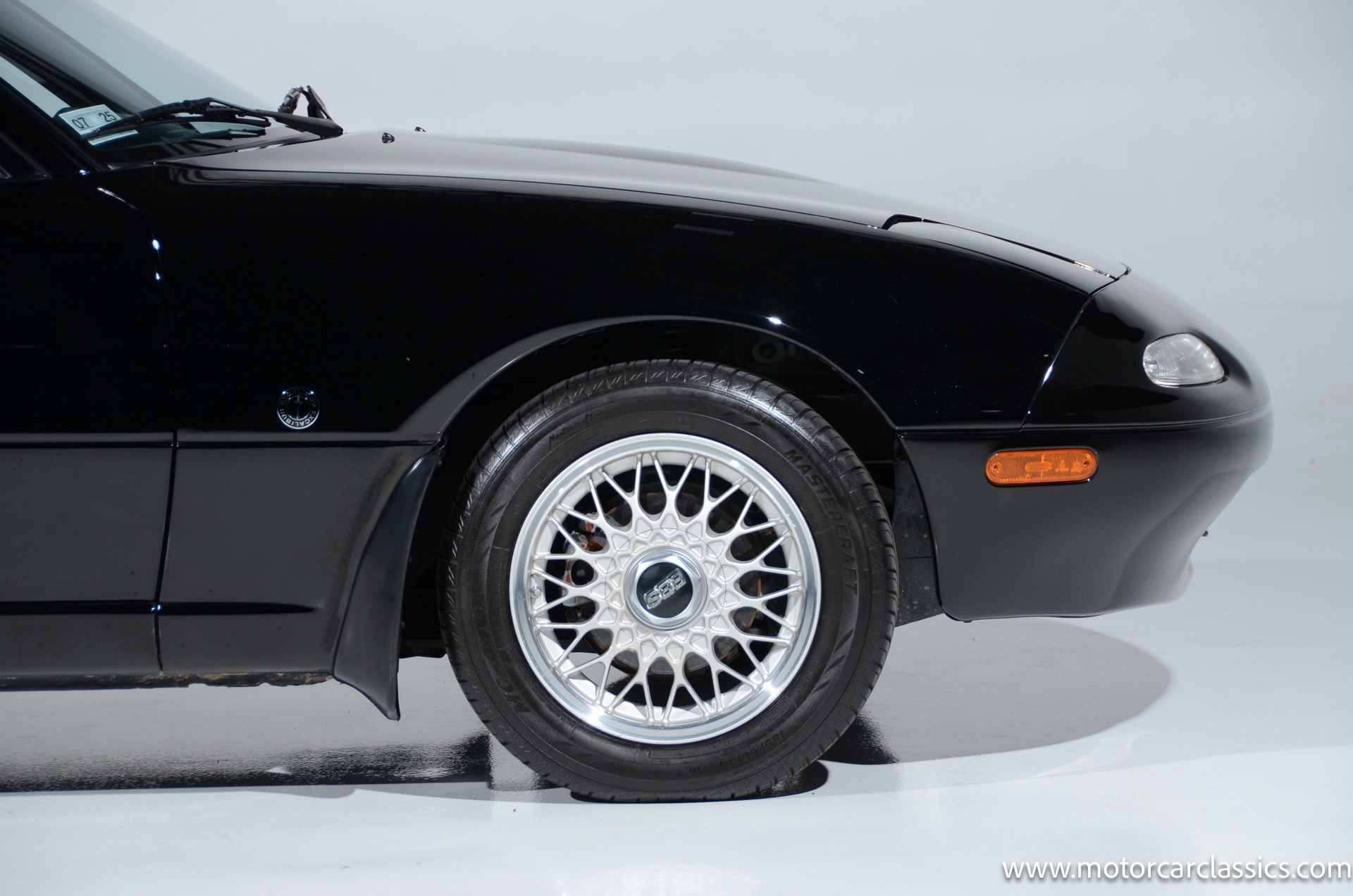 1992 Mazda Miata MX-5 for sale! Motorcar Classics is pleased to offer this Miata MX-5 convertible presented in black with tan leather interior and top. 88,681 original miles, manual transmission. Options include: power windows, power steering, leather wrapped steering wheel, alloy wheels, AM/FM/Cassette stereo, Black Miata C Package with Nardi wood shift knob and handbrake, stainless sill plates, BBS 14 alloy wheels, cruise control, headrest speakers, automatic antenna. Base MSRP $17,000 and $1,400 for C Package.