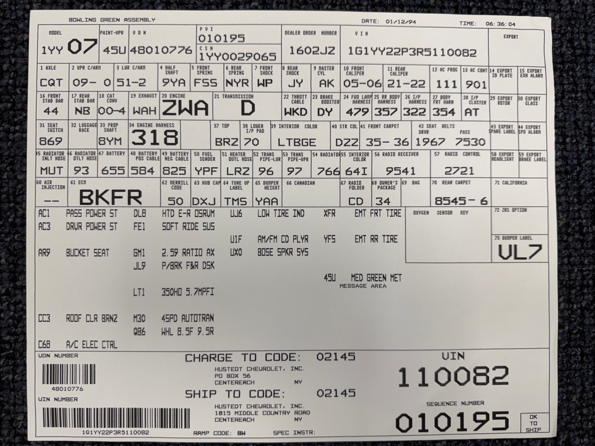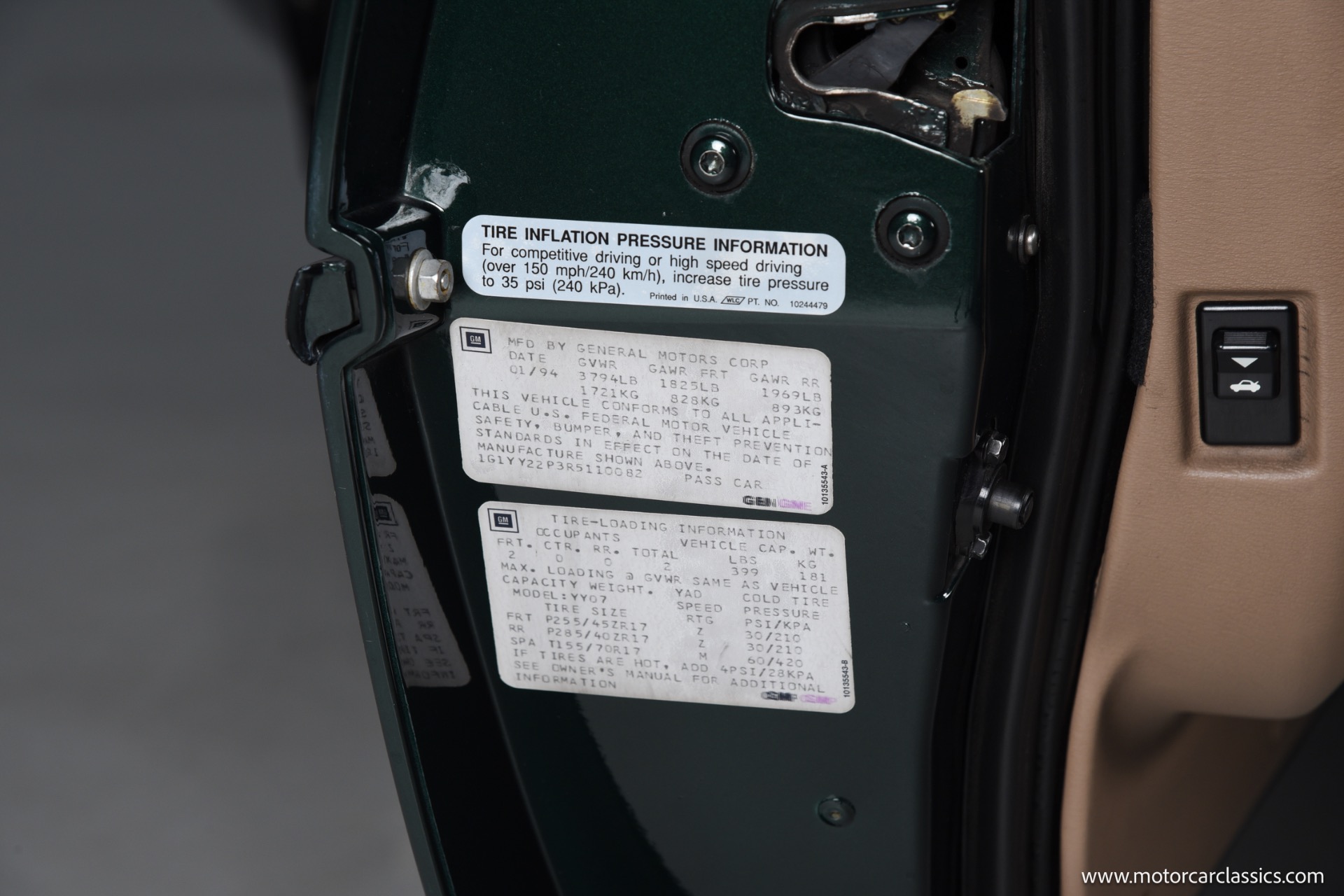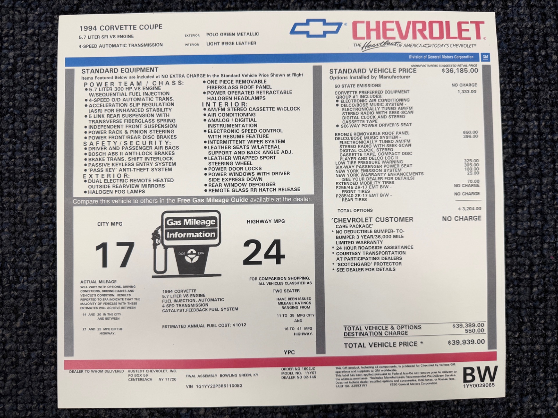 1994 Chevrolet Corvette for sale! Motorcar Classics is pleased to present this 1994 Chevrolet Corvette coupe in Polo Green Metallic with Tan leather interior and just 65,517 miles, showing collector ownership and top-tier care. Factory options include the Corvette Preferred Equipment Group 1, bronze removable roof panel, Bose music system, low tire pressure warning, and six-way power seats for added comfort. Genuine documentation accompanies the car, with the original window sticker and build sheet included alongside the owner's manual, providing valuable provenance and authenticity for collectors. Sporting the LT1 5.7-liter V8, the Corvette delivers 300 horsepower and 340 lb-ft of torque, achieving 0-60 mph in 5.1 seconds and a top speed of 158 mph for spirited performance. Your inspection is invited!
