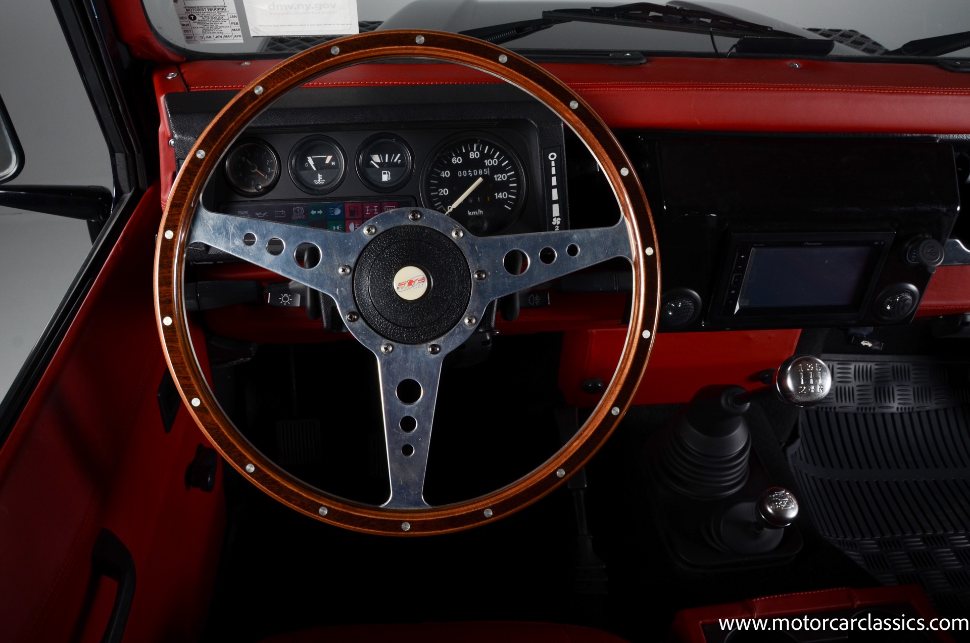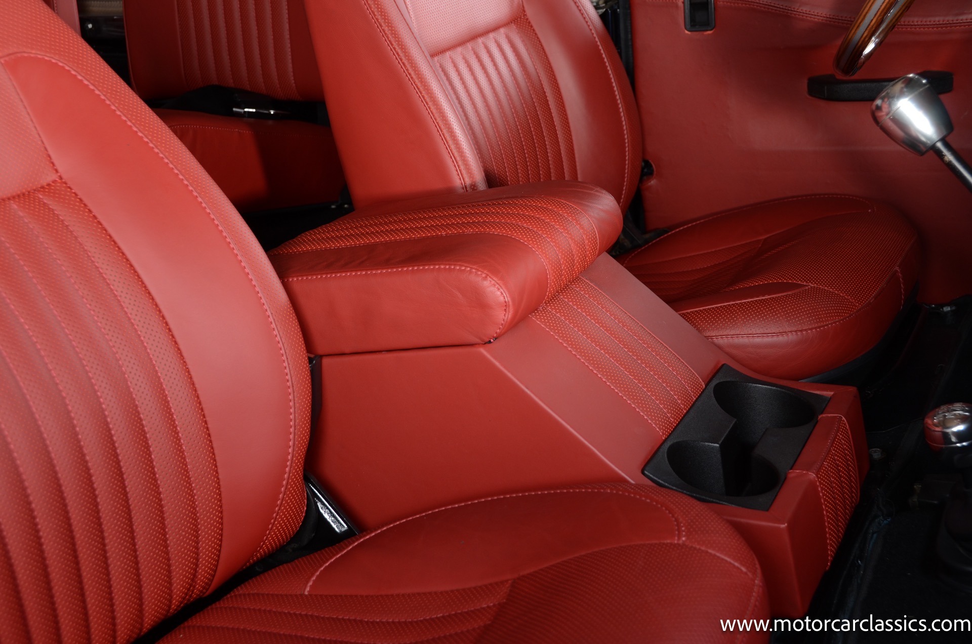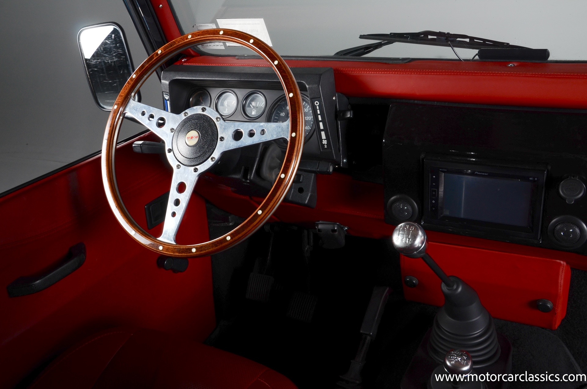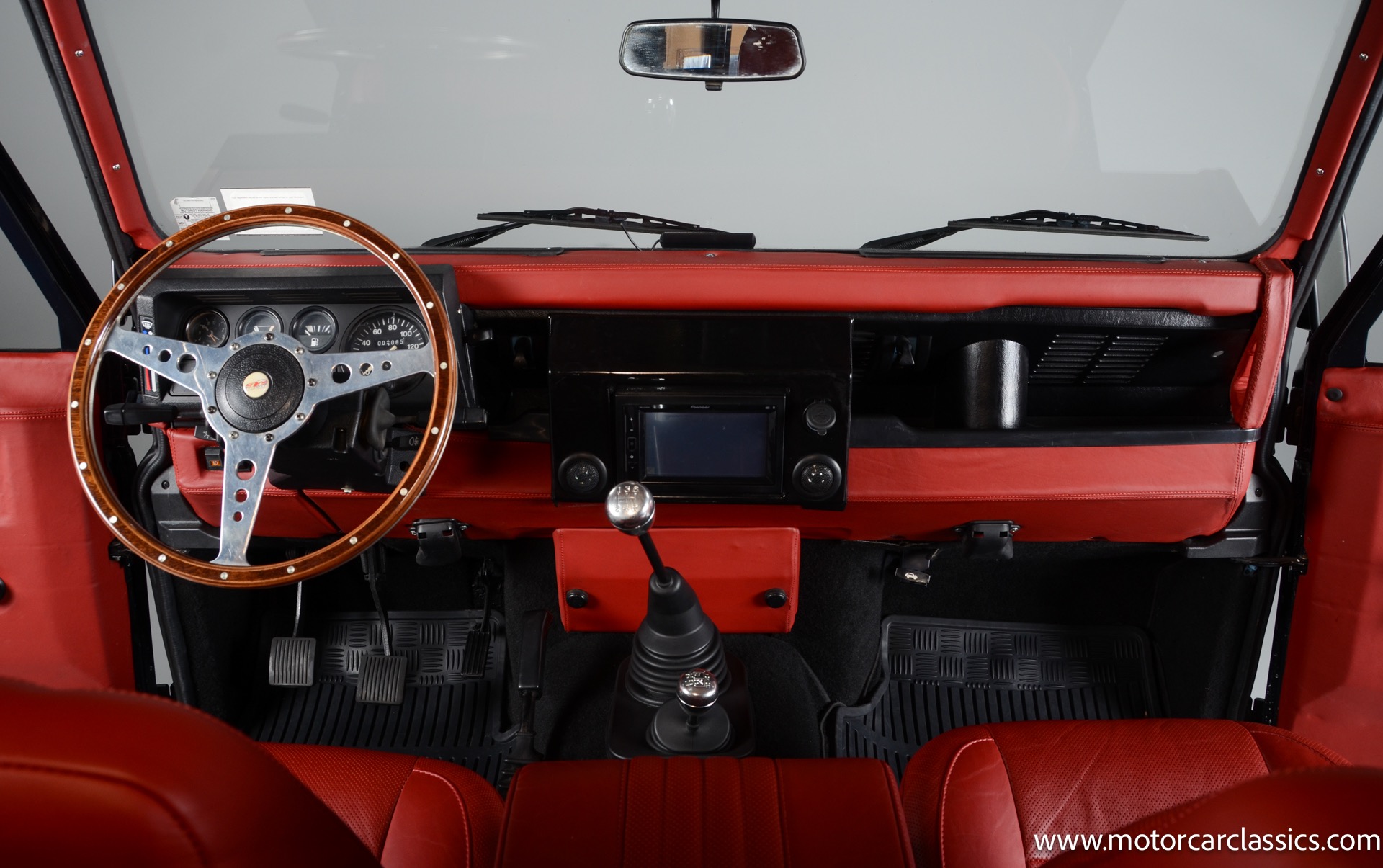 The vehicle's exterior showcases a stunning Buckingham Blue paint job, complemented by black accents on the steps, grille, and metal plates. Inside, luxurious Hermes red genuine leather upholstery adorns the cabin, while modern amenities such as a Pioneer GPS-connected station bring contemporary convenience to this classic icon.