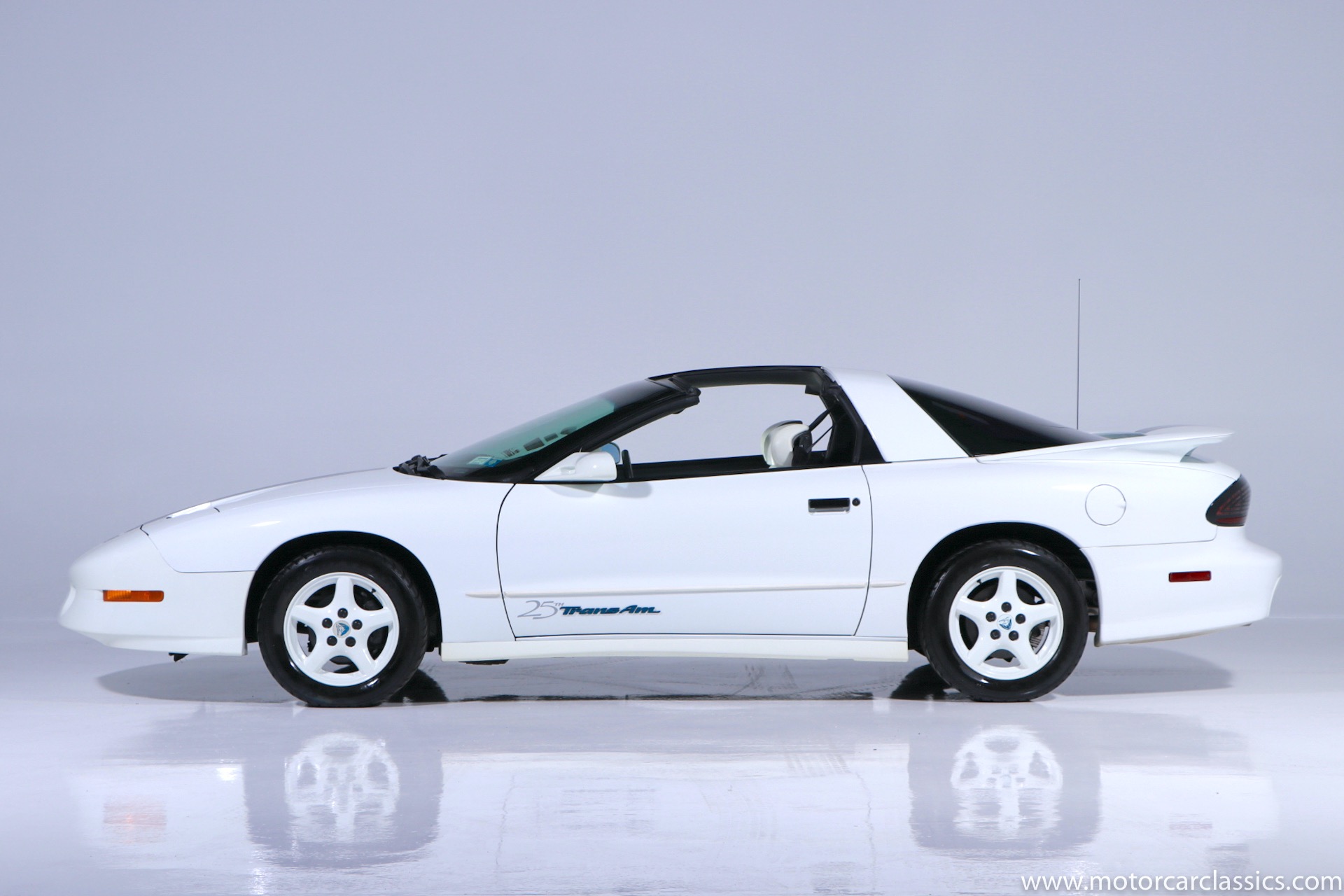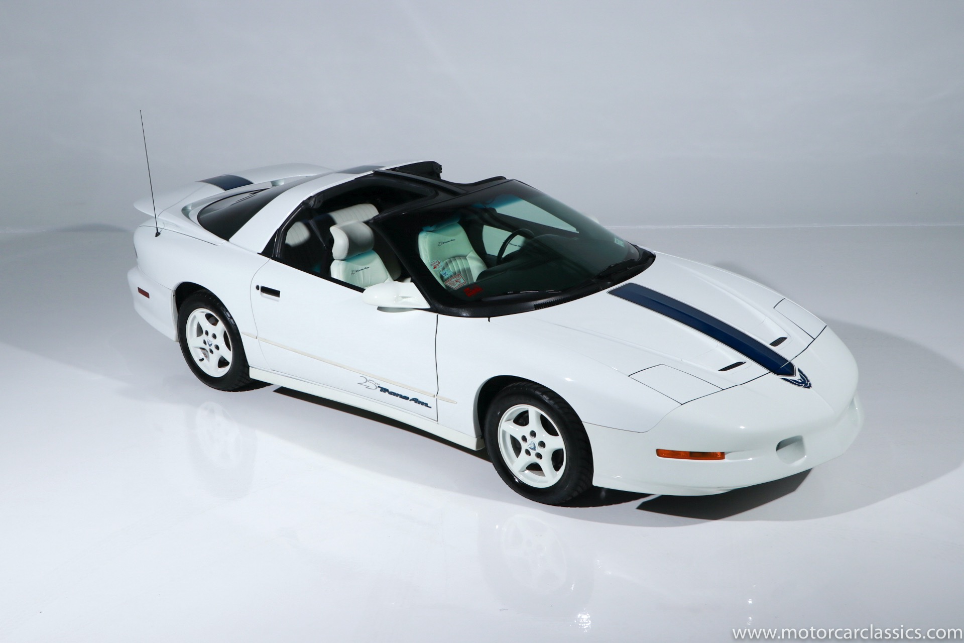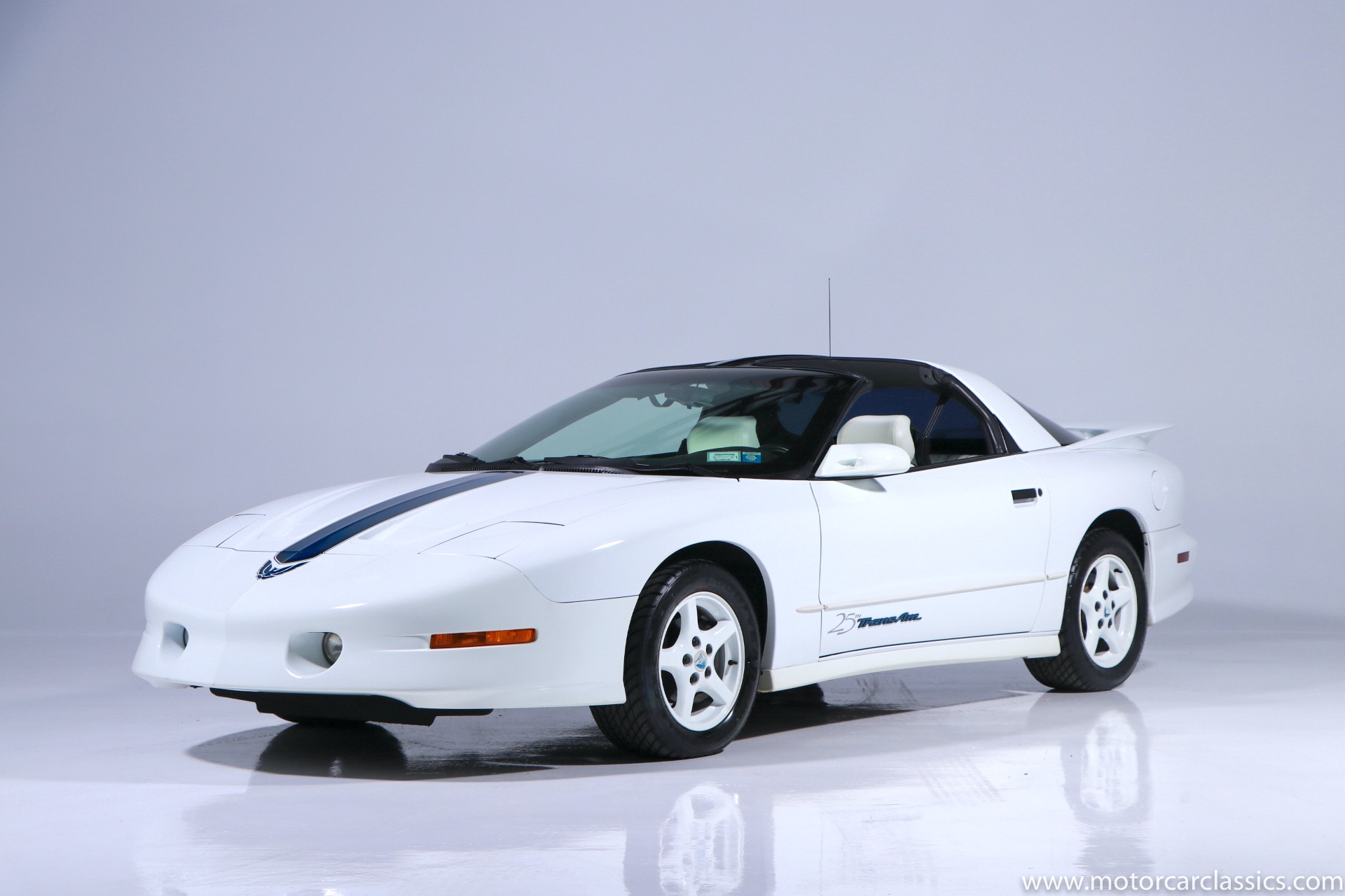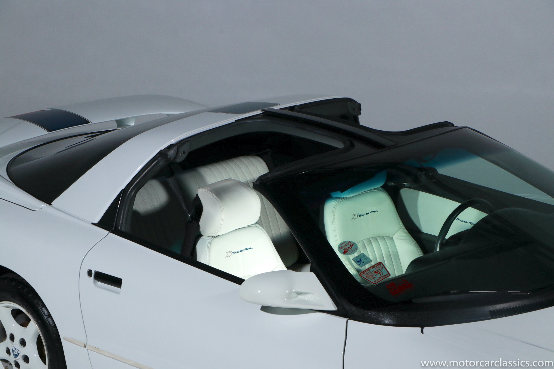 1994 Pontiac Firebird 25th Anniversary Edition for sale! Motorcar Classics is pleased to present this stunning white 1994 Pontiac Firebird Trans Am 25th Anniversary Edition with 6-speed manual transmission, T-Tops, and all of the features that are unique to last generation Firebird. It has had two enthusiast owners and covered only 43,553 miles. This car is all original with an unblemished history and is ready for its next owner to drive and show with pride.