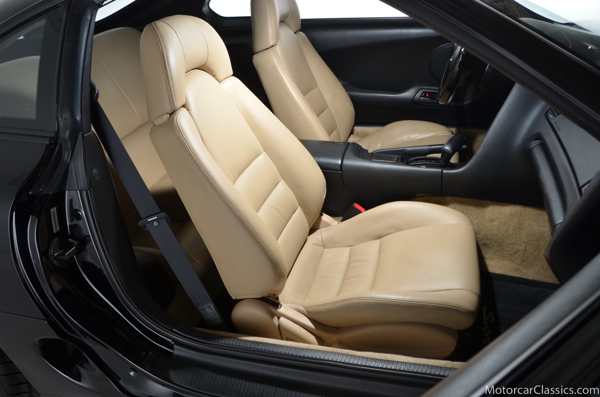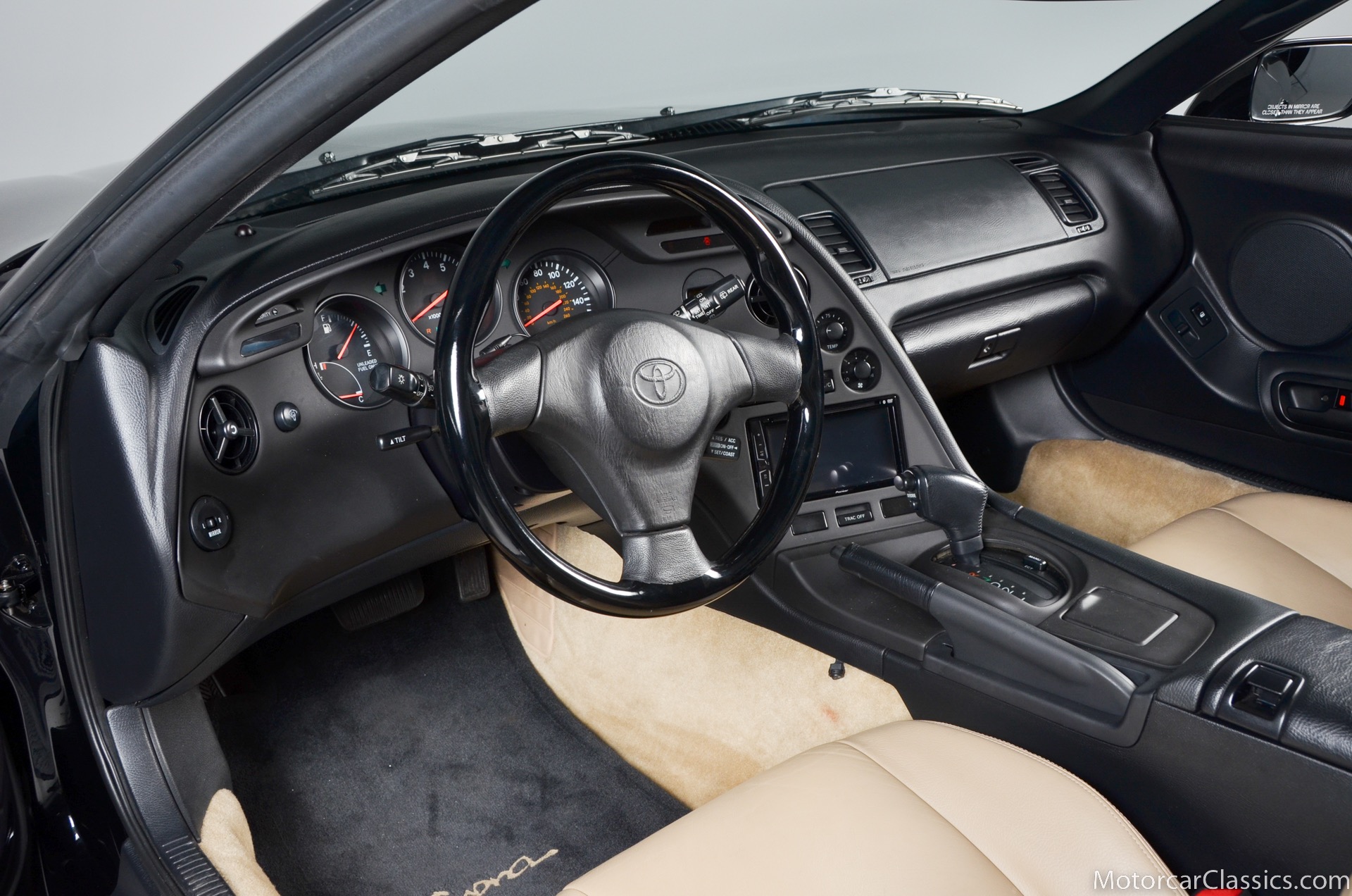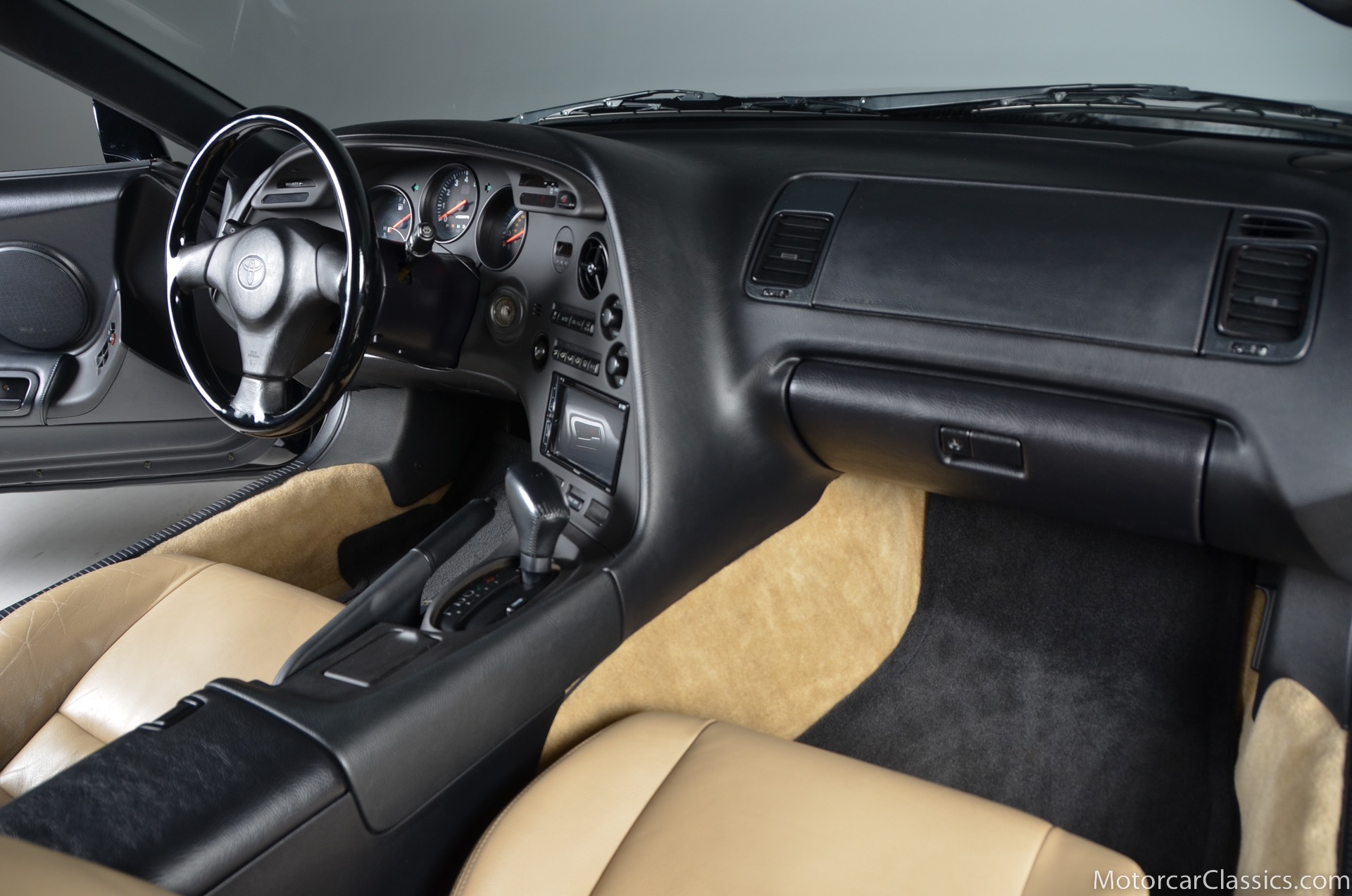 Panel gaps are, in typical Toyota fashion, incredibly precise. Its paint is excellent. Overall, the car appears to have been cherished from new. As a classic example of the proven Japanese tradition of packing universal good looks with tons of functionality, this Supras exterior masks its first rate sophistication with elegant simplicity. At the front of the car, large flush-fitting chrome headlight buckets mount halogen headlights and HID fog lights between a contoured bumper that incorporates front and side mounted amber turn signals. Deep and lustrous black window frames which display no UV damage. The snug fitting roof panel is easily removed and replaced. The taillights, with four individual round lenses, are perfectly clear. The real reason Supras are so insanely popular, rare, and expensive lies under the hood. The twin-turbocharged 3.0-liter inline-six cylinder makes the Supra truly special. The Inline six motor is silky smooth and presents easy routing for turbochargers. The engine is rated at 320 horsepower thanks to dual sequential turbochargers. The benefit is plenty of flexible power with little turbo lag; the first turbo spools up at low engine speeds for quick throttle response, while the second comes in at higher speeds and and delivers a huge rush. There is a slight hesitation in acceleration, and then the car explodes with an adrenaline-rush of power that can make the tires struggle to hold on. Although they were available with 6-speed manuals, Supras equipped with this cars smooth shifting 4-speed automatic are delightful due to the huge reserve of torque. This cars ride height is completely stock, and nothing else has been modified or replaced during the past 17 years. 17 inch alloy wheels are shod with fresh and correct 235/45 front and 255/40 rear Yokahama radials. Wonderfully preserved, the tan leather seats show almost no signs of use and despite their light coloring, no dirt or wear. The dash and console are black, of course, and provide a striking contrast to the light upholstery. Naturally, everything is angled towards the driver, and controls are straightforward and well laid out in typical Toyota fashion. Tan carpets are in excellent condition thanks to a set of black white Supra branded floor mats. And the door panels, which feature controls for the cars power windows and power door locks, are intentionally simple to match the exterior of the car. Behind the cockpit, an immaculate hatch maintains enough room to stow the targa roof, and at the same time, carry a small amount of groceries home from the store.Documentation for this pristine Supra includes the cars original window sticker and the original books and manuals.