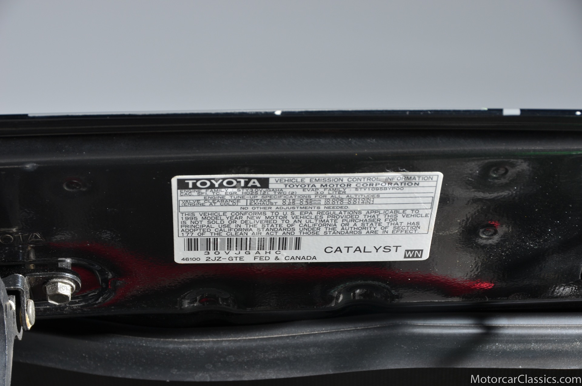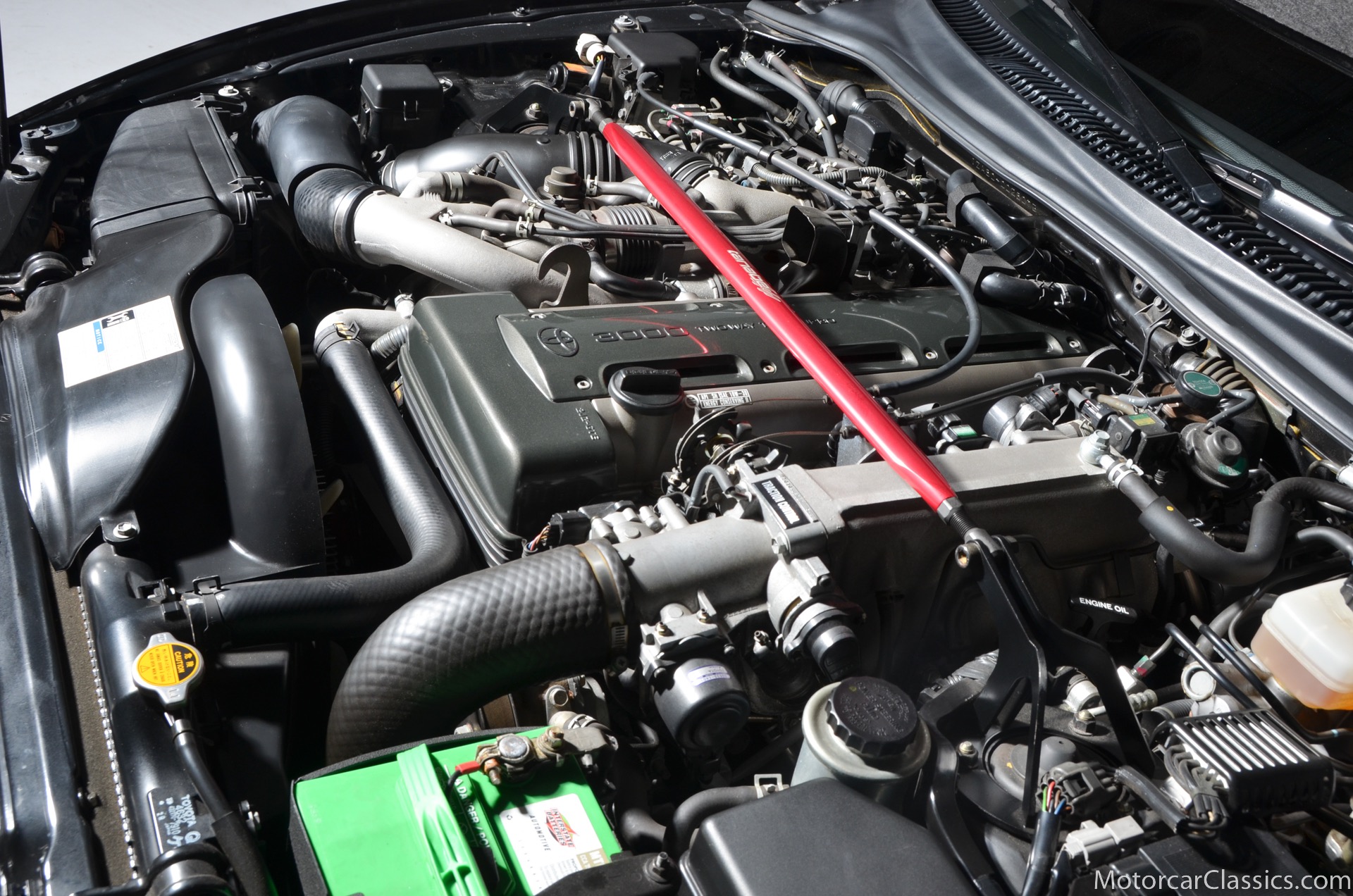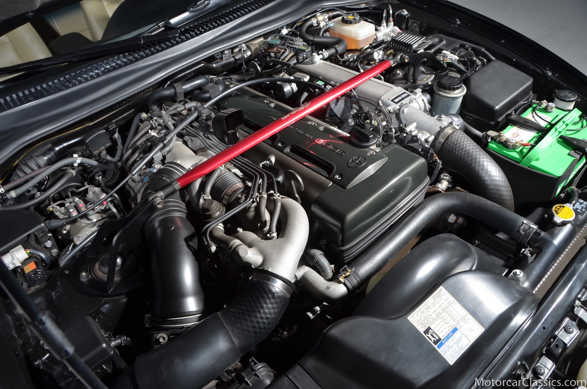 Panel gaps are, in typical Toyota fashion, incredibly precise. Its paint is excellent. Overall, the car appears to have been cherished from new. As a classic example of the proven Japanese tradition of packing universal good looks with tons of functionality, this Supras exterior masks its first rate sophistication with elegant simplicity. At the front of the car, large flush-fitting chrome headlight buckets mount halogen headlights and HID fog lights between a contoured bumper that incorporates front and side mounted amber turn signals. Deep and lustrous black window frames which display no UV damage. The snug fitting roof panel is easily removed and replaced. The taillights, with four individual round lenses, are perfectly clear. The real reason Supras are so insanely popular, rare, and expensive lies under the hood. The twin-turbocharged 3.0-liter inline-six cylinder makes the Supra truly special. The Inline six motor is silky smooth and presents easy routing for turbochargers. The engine is rated at 320 horsepower thanks to dual sequential turbochargers. The benefit is plenty of flexible power with little turbo lag; the first turbo spools up at low engine speeds for quick throttle response, while the second comes in at higher speeds and and delivers a huge rush. There is a slight hesitation in acceleration, and then the car explodes with an adrenaline-rush of power that can make the tires struggle to hold on. Although they were available with 6-speed manuals, Supras equipped with this cars smooth shifting 4-speed automatic are delightful due to the huge reserve of torque. This cars ride height is completely stock, and nothing else has been modified or replaced during the past 17 years. 17 inch alloy wheels are shod with fresh and correct 235/45 front and 255/40 rear Yokahama radials. Wonderfully preserved, the tan leather seats show almost no signs of use and despite their light coloring, no dirt or wear. The dash and console are black, of course, and provide a striking contrast to the light upholstery. Naturally, everything is angled towards the driver, and controls are straightforward and well laid out in typical Toyota fashion. Tan carpets are in excellent condition thanks to a set of black white Supra branded floor mats. And the door panels, which feature controls for the cars power windows and power door locks, are intentionally simple to match the exterior of the car. Behind the cockpit, an immaculate hatch maintains enough room to stow the targa roof, and at the same time, carry a small amount of groceries home from the store.Documentation for this pristine Supra includes the cars original window sticker and the original books and manuals.