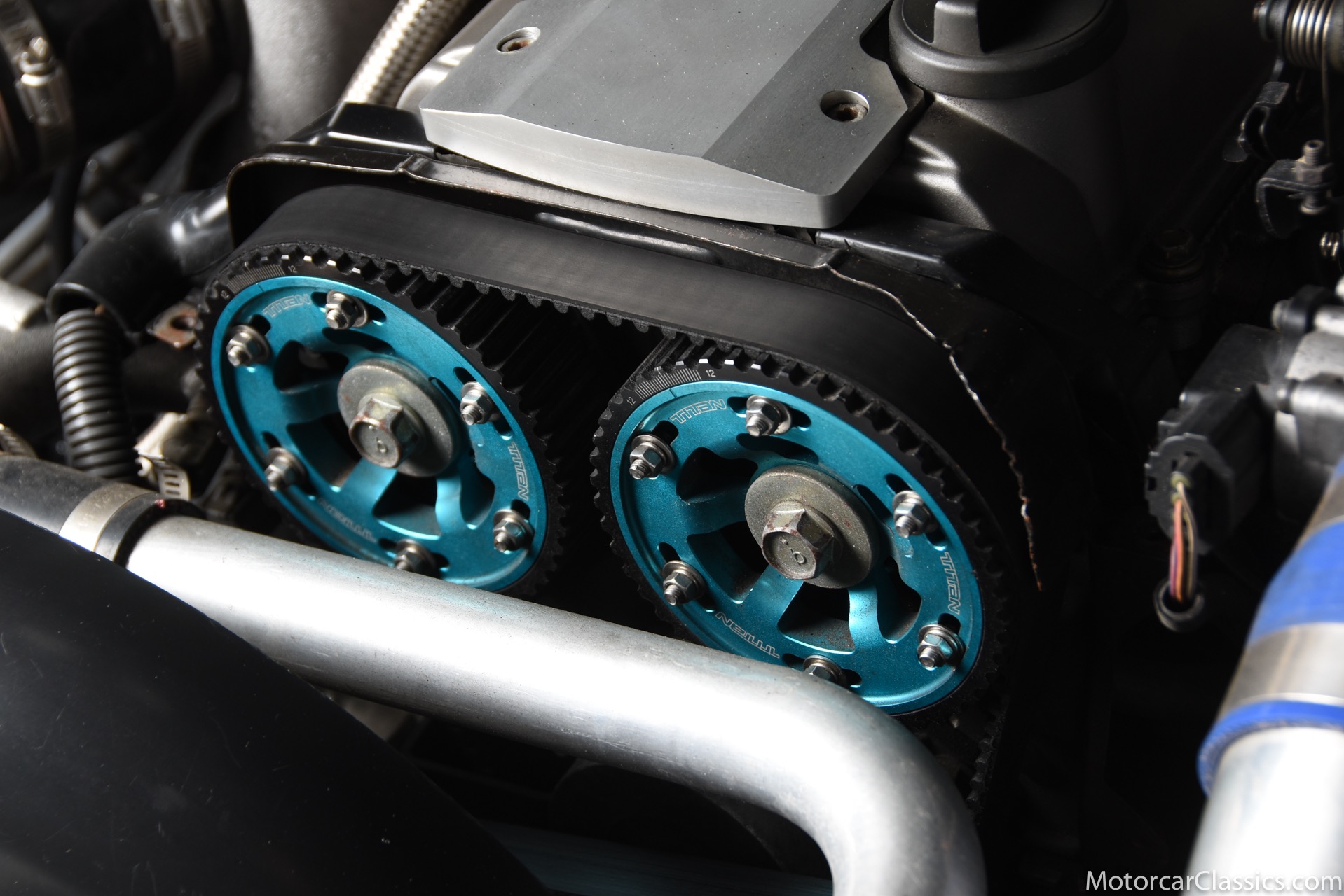 The twin-turbocharged 3.0-liter 2JZ GTE inline-six has been modified under previous ownership by FSR Motorsports in Montclair Dyno results: ProEFI Pro128 ECU system, Cold-air intake, Three-inch front-mount intercooler, GSC S1 camshafts w/ Titan Motorsports gears, Dual Walbro 400 LPH fuel pumps, Flex Fuel Tune allowing 91 octane gasoline or E85, FSR Motorsports tubular manifold, Precision Turbo 6766 turbocharger with custom compressor cover, Custom aluminum catch can, Koyo quad-core aluminum radiator, Dual wastegates, TiAL 50mm blow-off valve, 4 downpipe and exhaust, HKS Carbon-Ti muffler. Your inspection is invited!