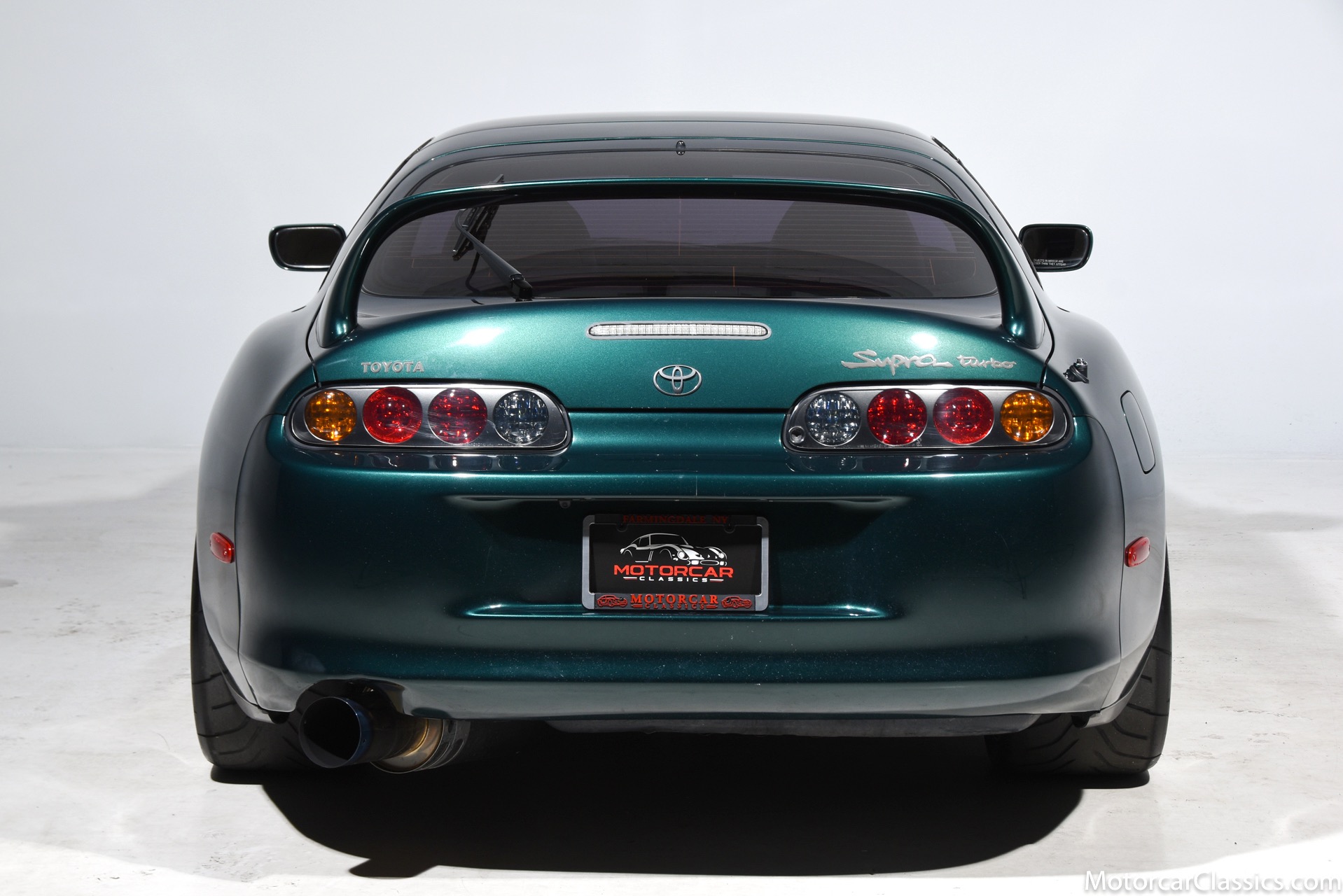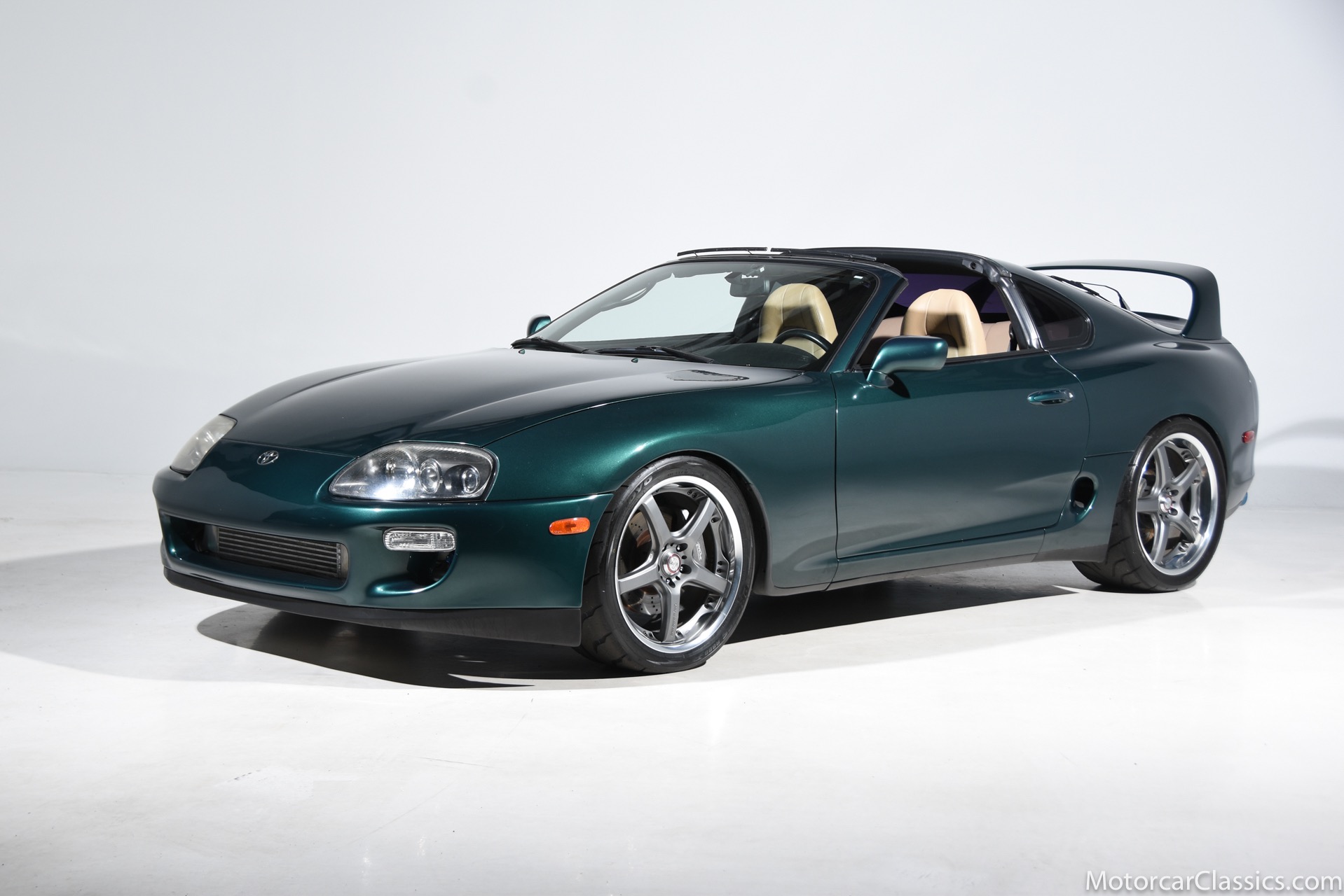 1997 Toyota Supra Turbo for sale! Motorcar Classics is pleased to offer this impressively modified Supra Turbo finished in Deep Jewel Green over beige and powered by a twin-turbocharged 3.0-liter 2JZ inline-six mated to a six-speed manual transmission. Modifications installed under prior ownership include 19 VolkRacing wheels, Stillen drilled rotors and aftermarket brake pads, Megan Racing coilovers, GSC Power-Division camshafts, an RPS Performance clutch, a ProEFI Pro128 ECU, dual Walbro fuel pumps, dual wastegates, an HKS Carbon Ti exhaust, and a cold-air intake. This JZA80 Supra has 52243 miles.