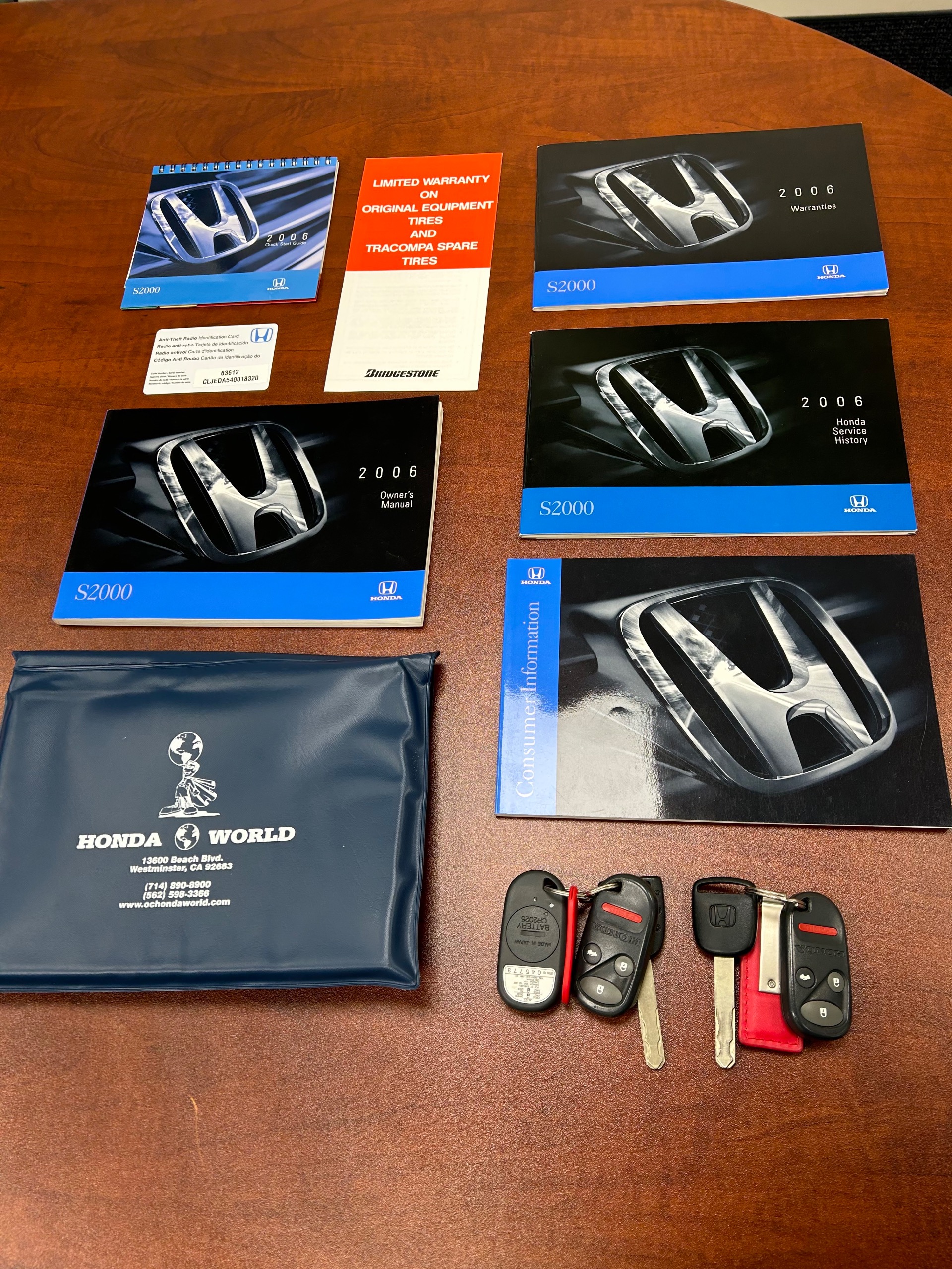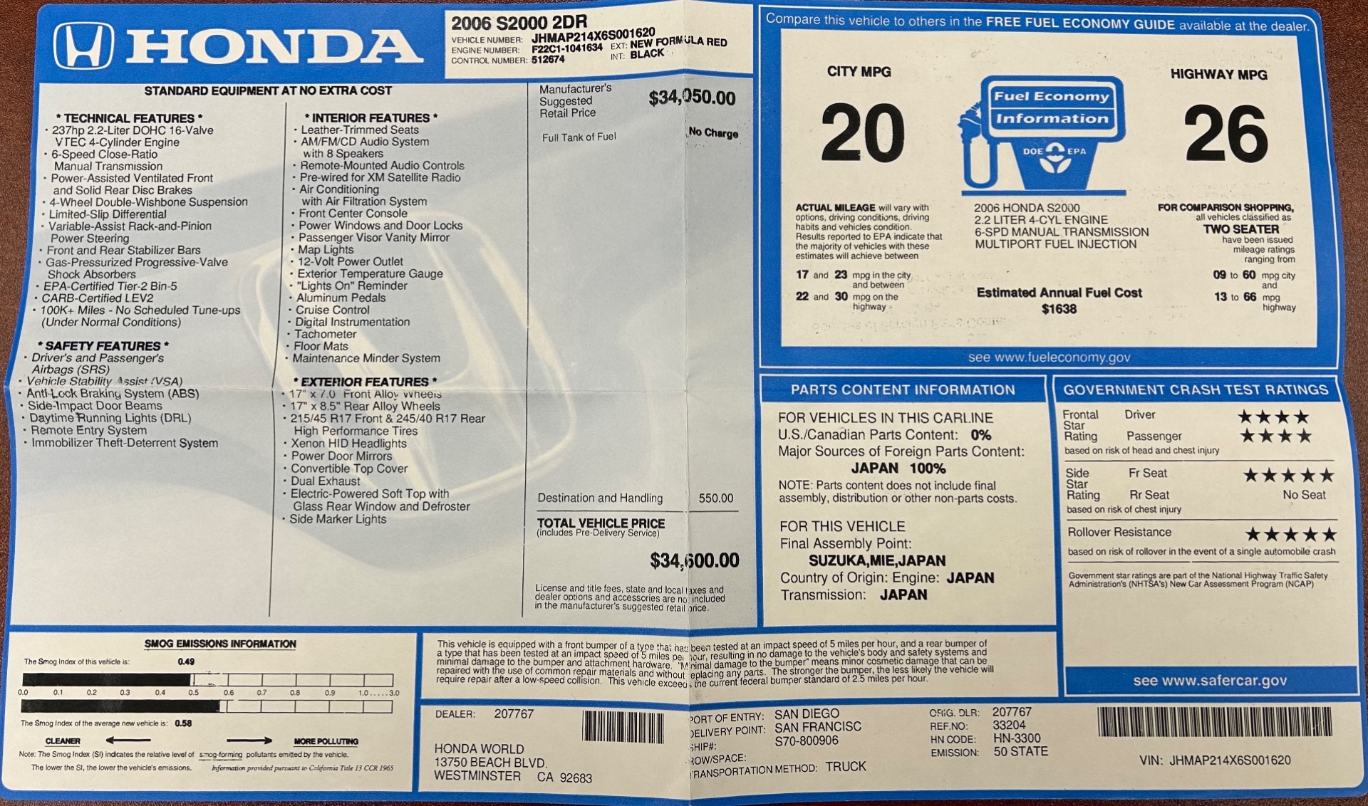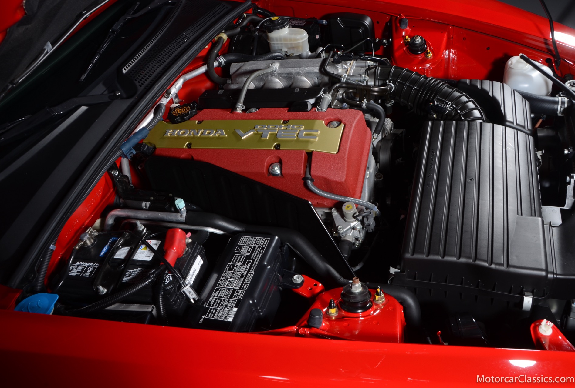 2006 Honda S2000 for sale! Motorcar Classics is proud to present this stunning 2006 Honda S2000 featured in New Formula Red over black leather interior with black convertible top. This car is the advanced second-generation AP2-spec S2000. It is a California car that remained in California with its original owner until 2022. With only 12,829 miles, and an unblemished history, this is truly an investment-grade example. All ten original body tags remain in place. Manuals and window sticker are included. The S2000 is powered by a 2.2-liter VTEC inline-four linked with a six-speed manual transmission and a limited-slip differential. Features include 17 10-spoke wheels, a black convertible soft top, xenon headlights, a wind deflector, air conditioning, a CD stereo, and cruise control. The Honda S2000 is a thrill to drive with its high-revving VTEC engine. It benefits from Hondas legendary build quality and it has a well-sealed power top and a full range of amenities. In recent years the market has recognized the value of these unique Honda sports cars, and they have joined their contemporary models like the Supra Turbos, RX-7 Turbos, and others as trendsetters in the collector-car market.