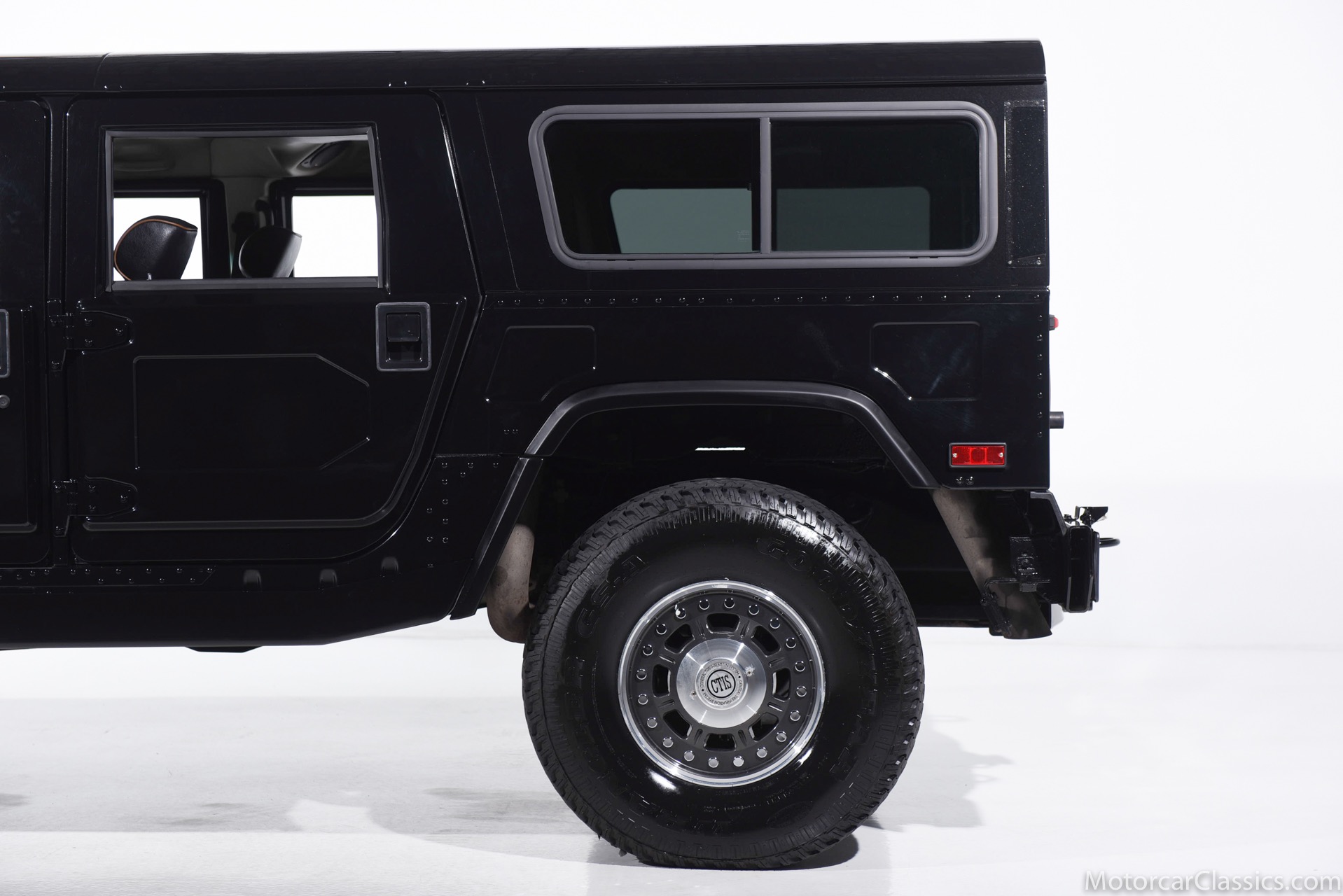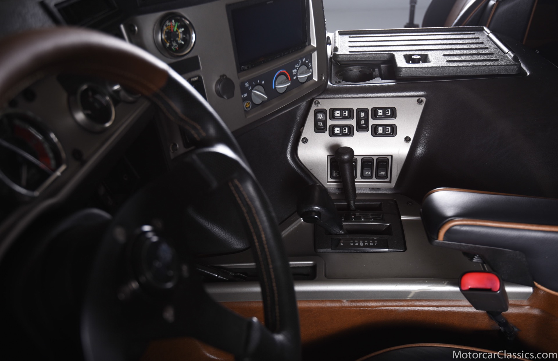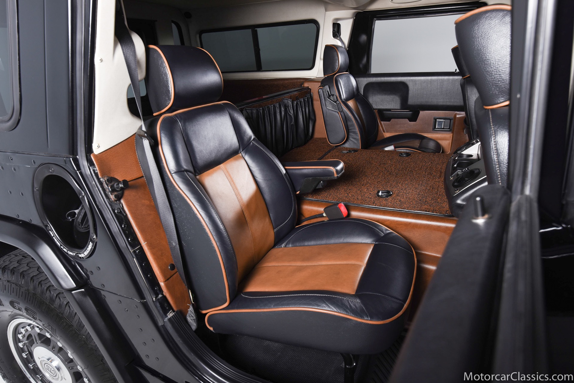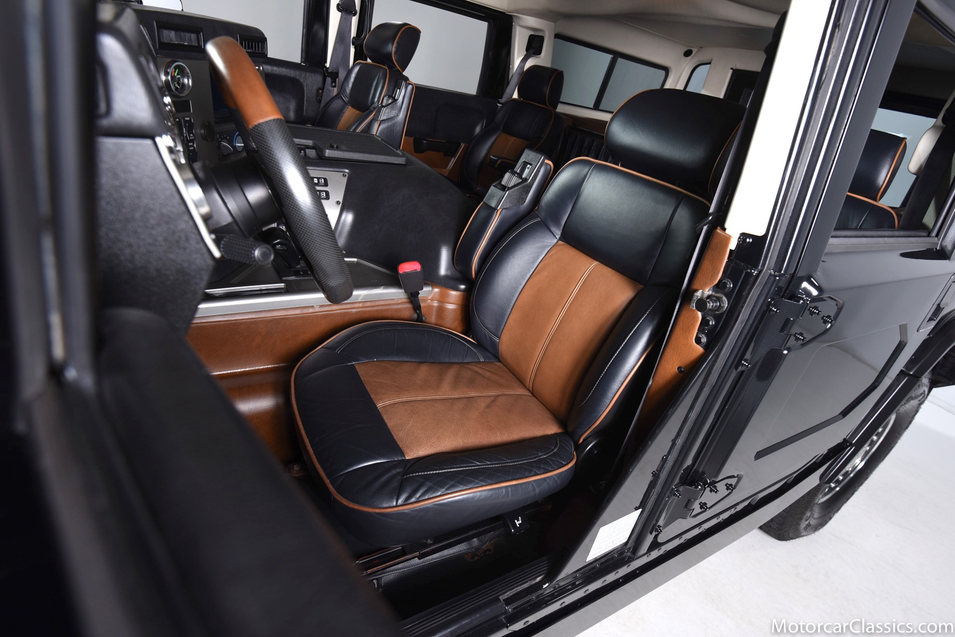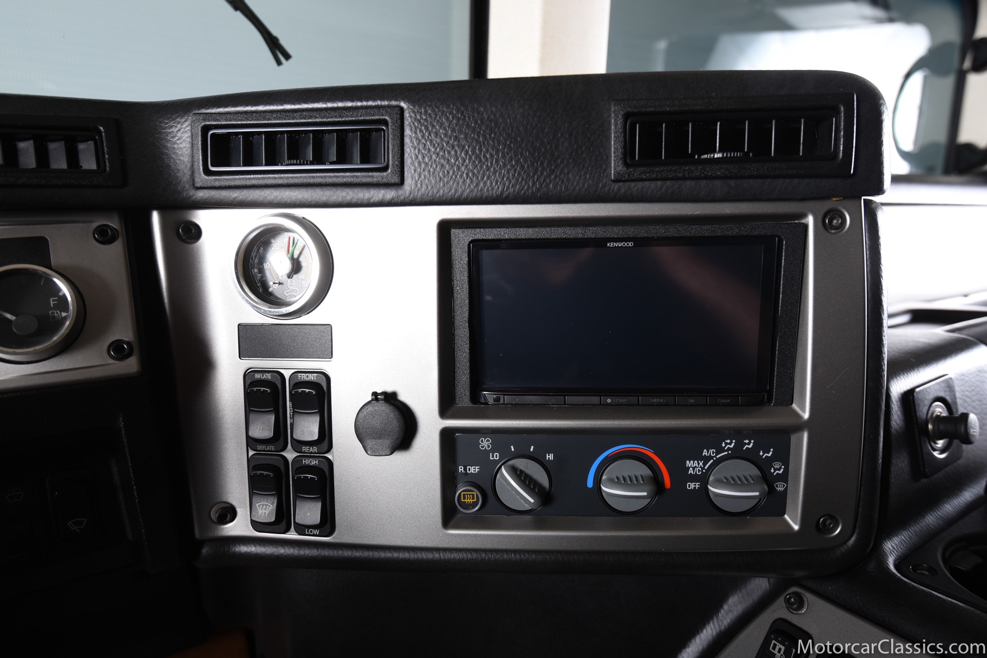 Power-assisted steering makes driving easy. Power-assisted HMMWV discs are mounted inboard for the sake of durability. And at the corners, two-piece alloys are wrapped with 37x12.50R17 OEM Goodyear Wrangler GS-A's around connected to a standard Central Tire Inflation System. In the cabin, Saddle-trimmed leather buckets feature heat for the front passengers and audio for the rear passengers. A chunky, two-tone dash mounts intricate telemetry next to factory climate control and modern Kenwood audio.