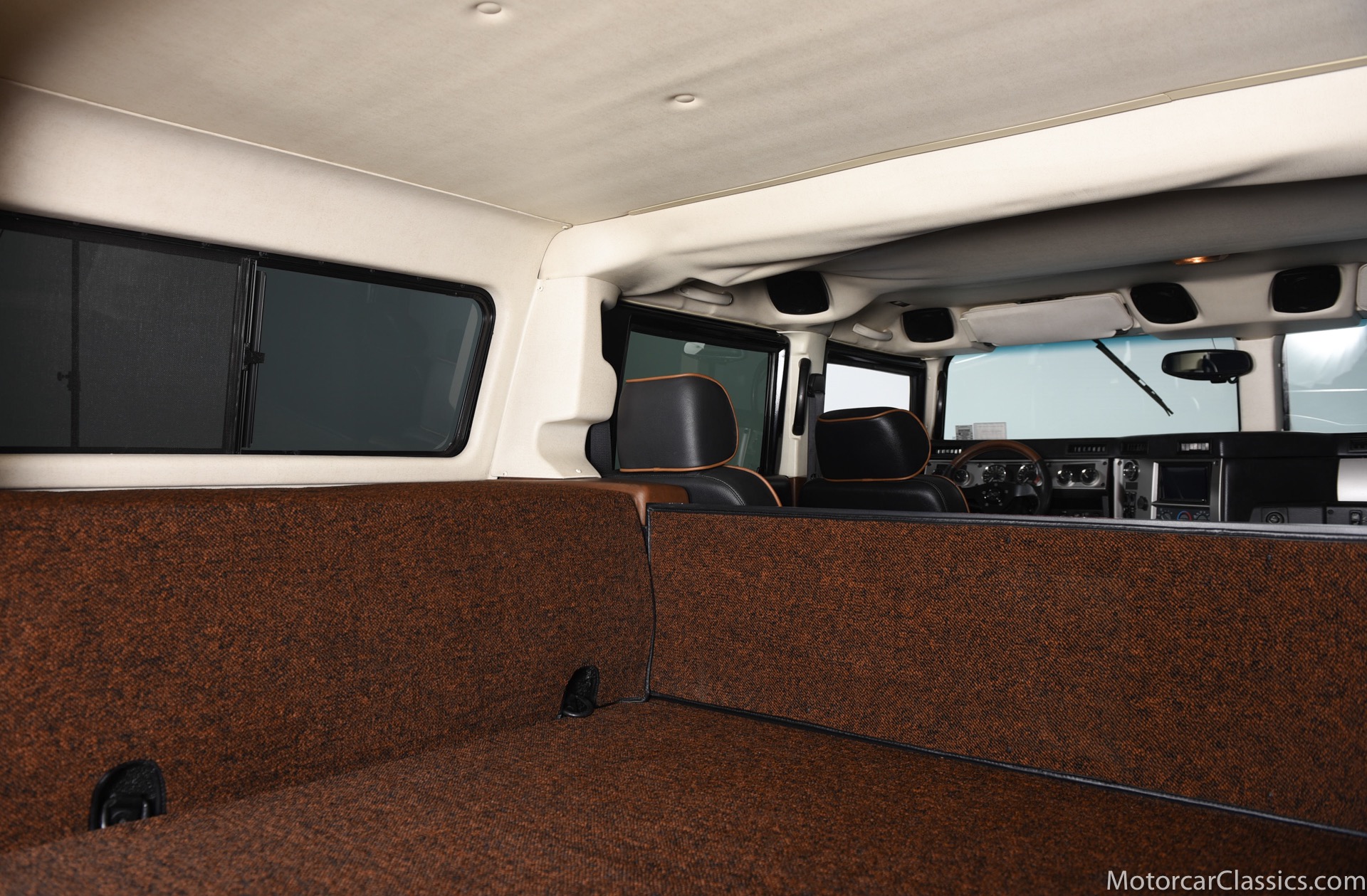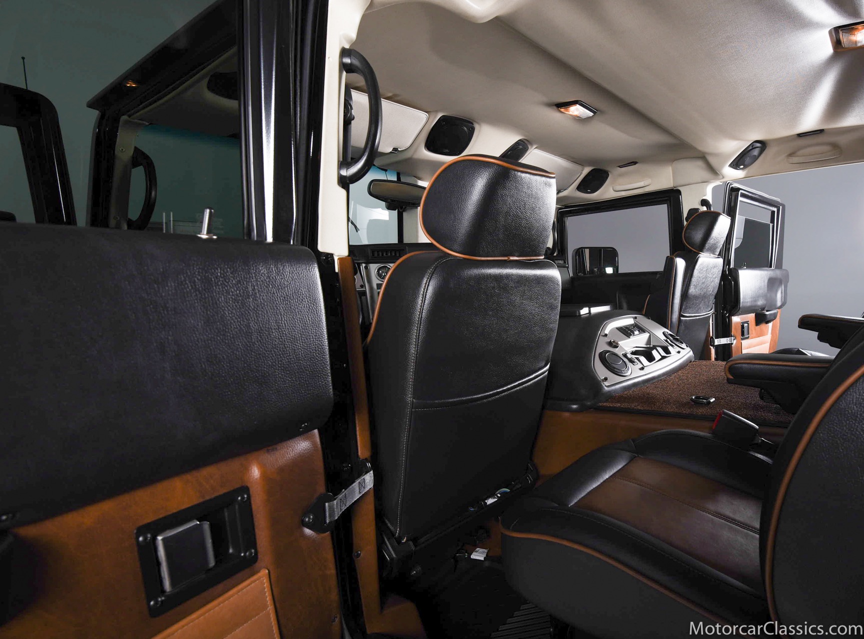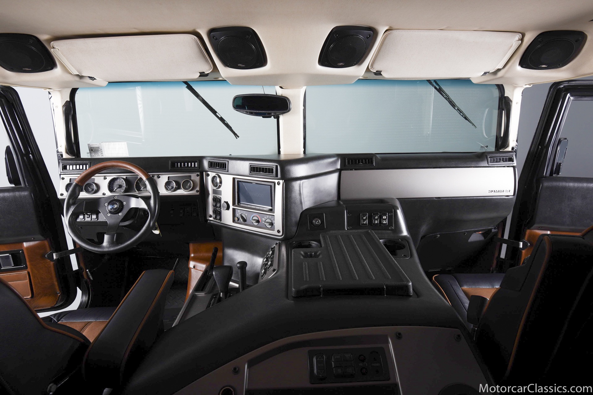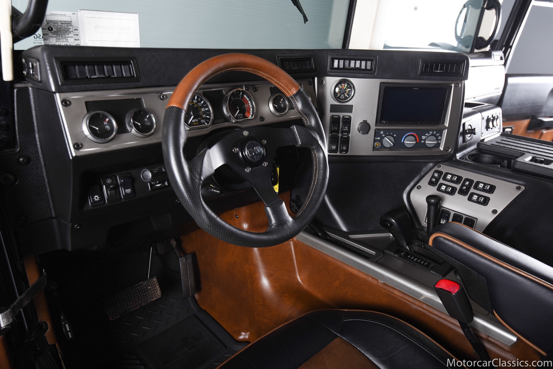 Power-assisted steering makes driving easy. Power-assisted HMMWV discs are mounted inboard for the sake of durability. And at the corners, two-piece alloys are wrapped with 37x12.50R17 OEM Goodyear Wrangler GS-A's around connected to a standard Central Tire Inflation System. In the cabin, Saddle-trimmed leather buckets feature heat for the front passengers and audio for the rear passengers. A chunky, two-tone dash mounts intricate telemetry next to factory climate control and modern Kenwood audio.