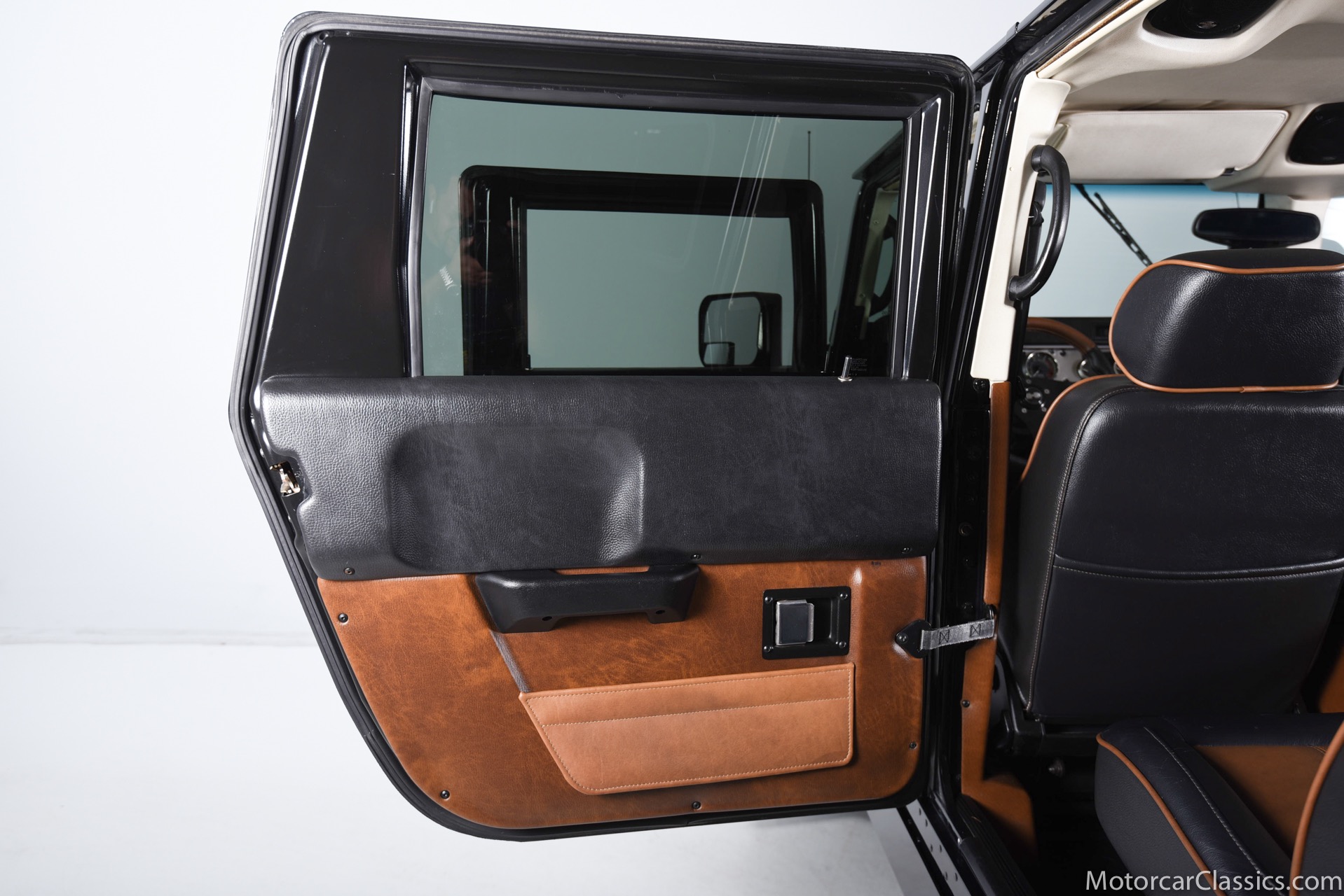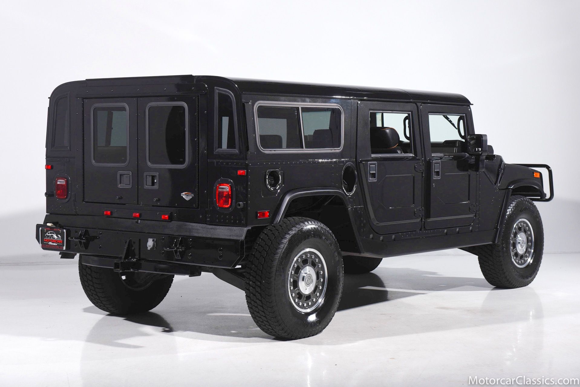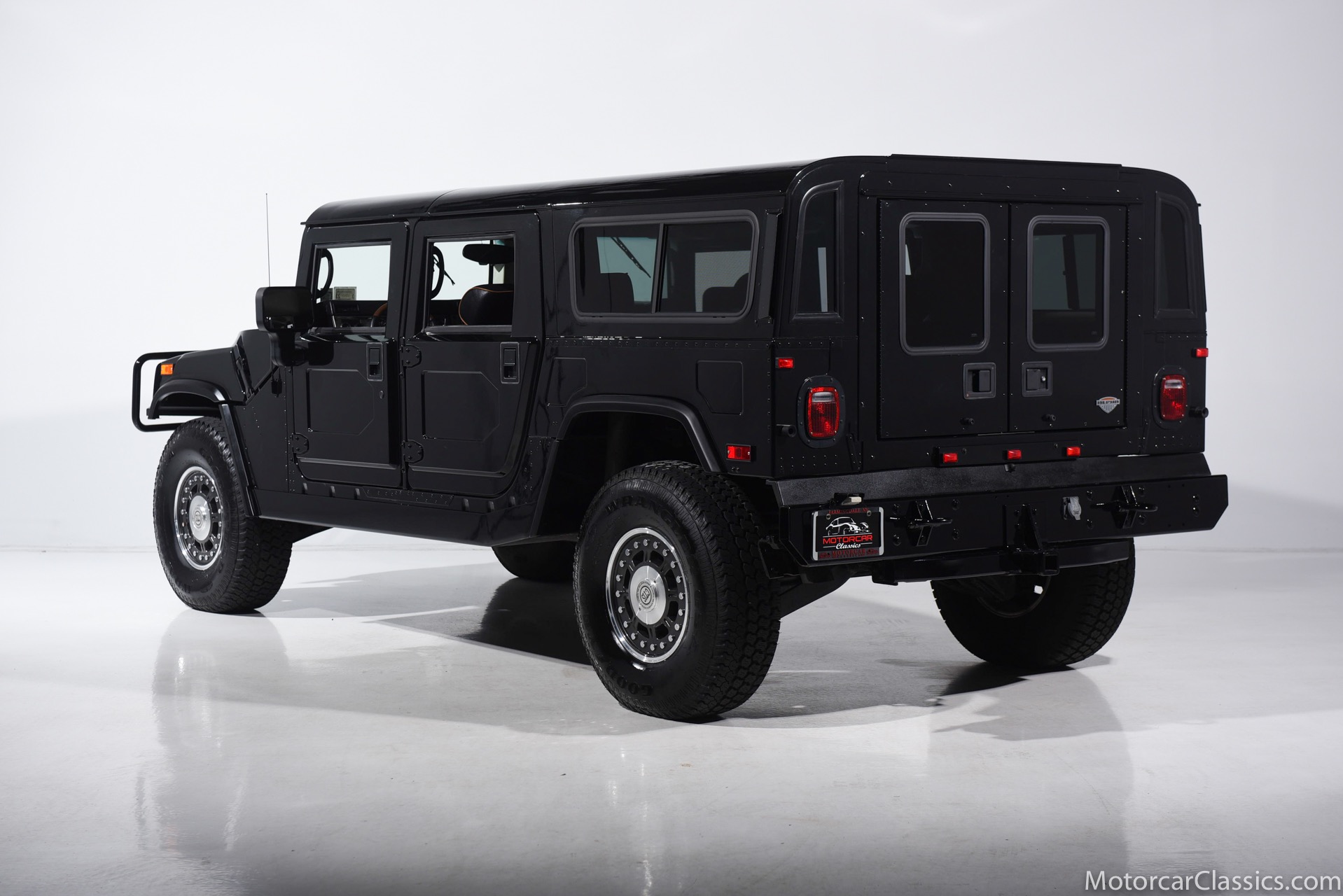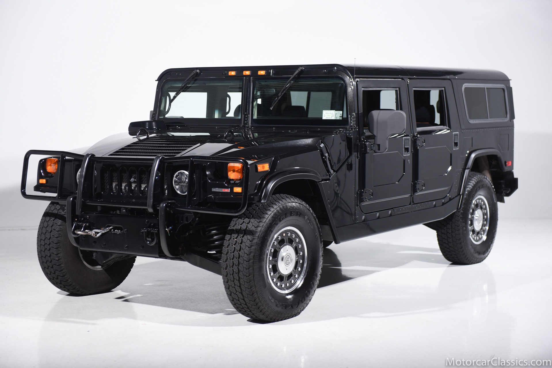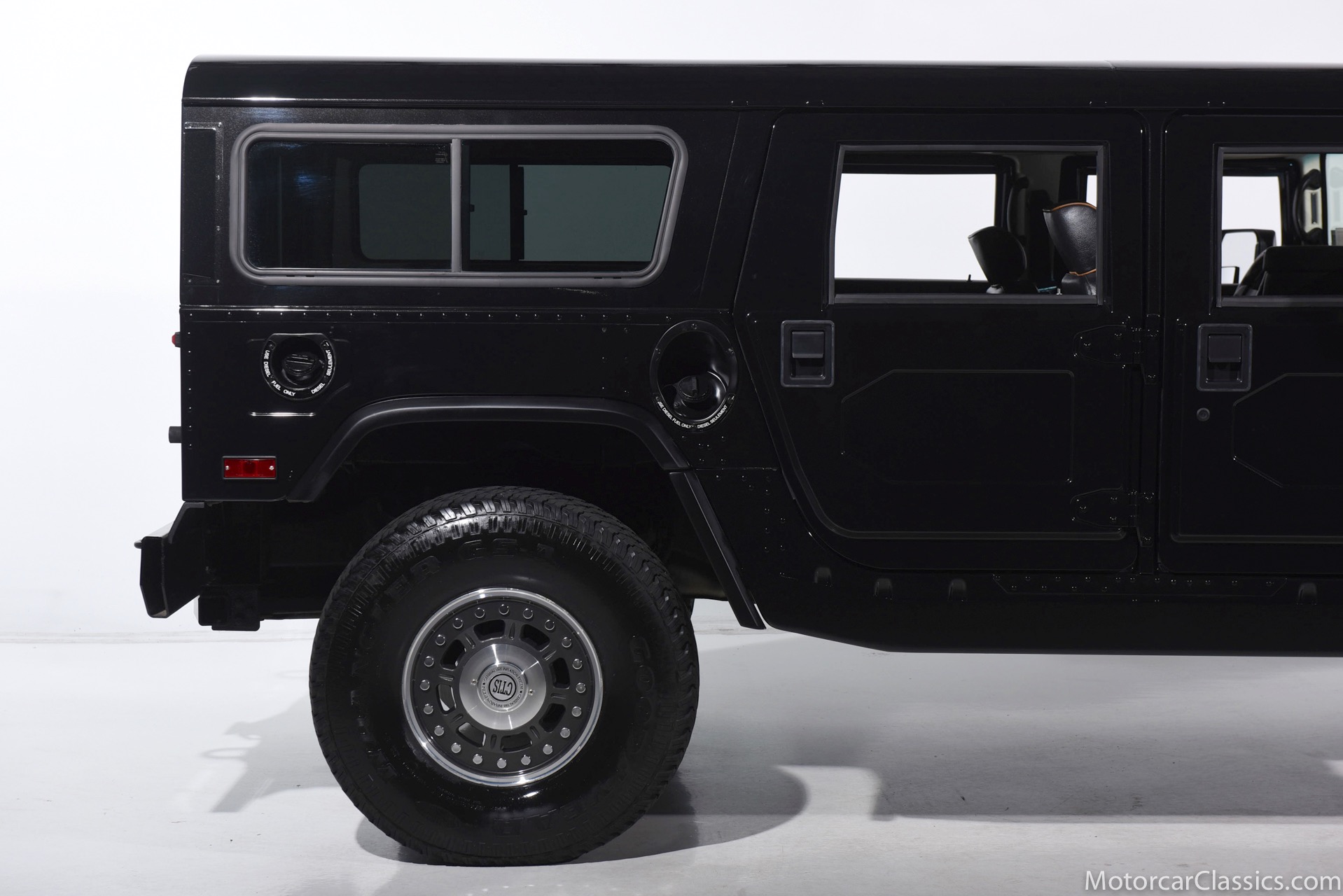 Power-assisted steering makes driving easy. Power-assisted HMMWV discs are mounted inboard for the sake of durability. And at the corners, two-piece alloys are wrapped with 37x12.50R17 OEM Goodyear Wrangler GS-A's around connected to a standard Central Tire Inflation System. In the cabin, Saddle-trimmed leather buckets feature heat for the front passengers and audio for the rear passengers. A chunky, two-tone dash mounts intricate telemetry next to factory climate control and modern Kenwood audio.
