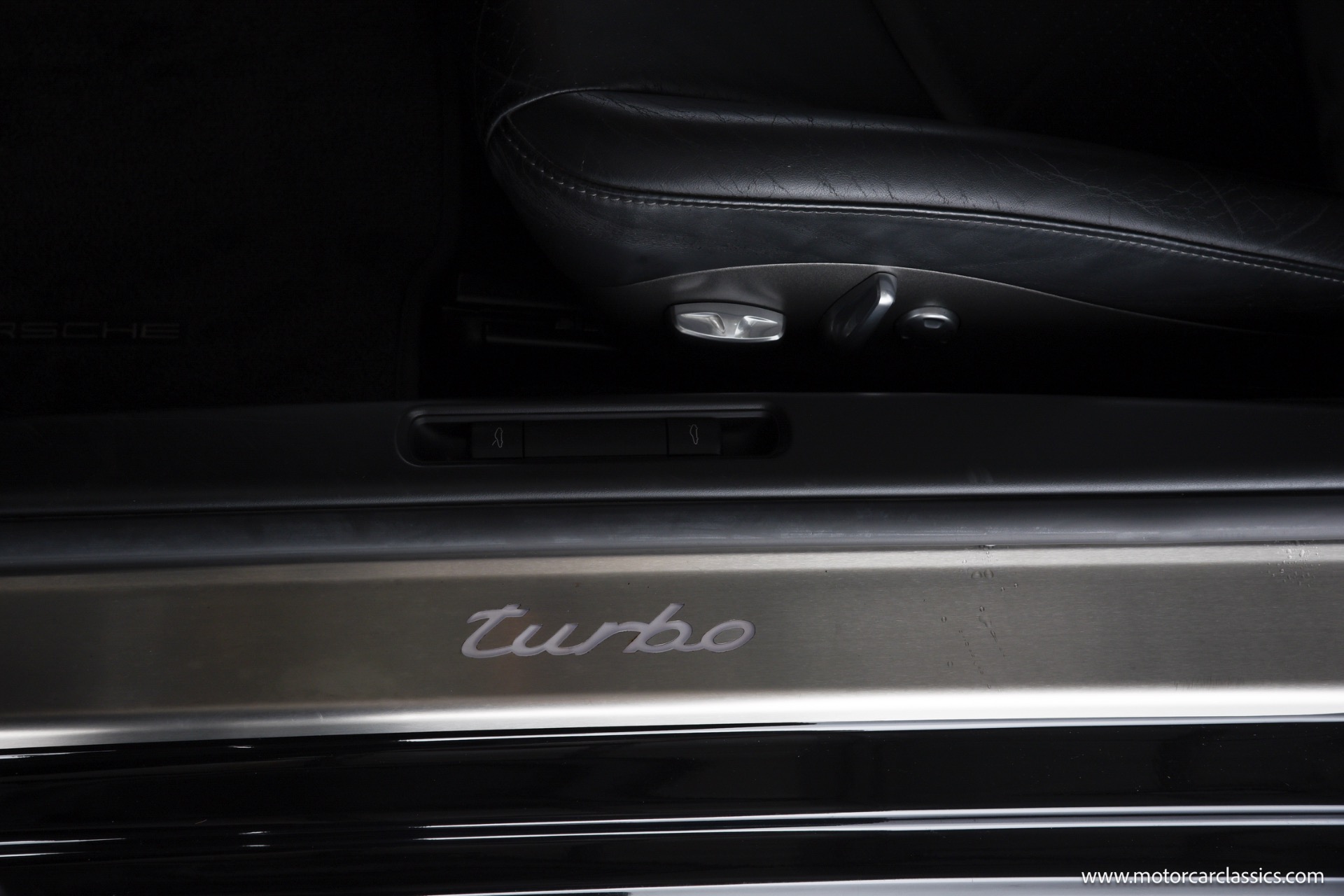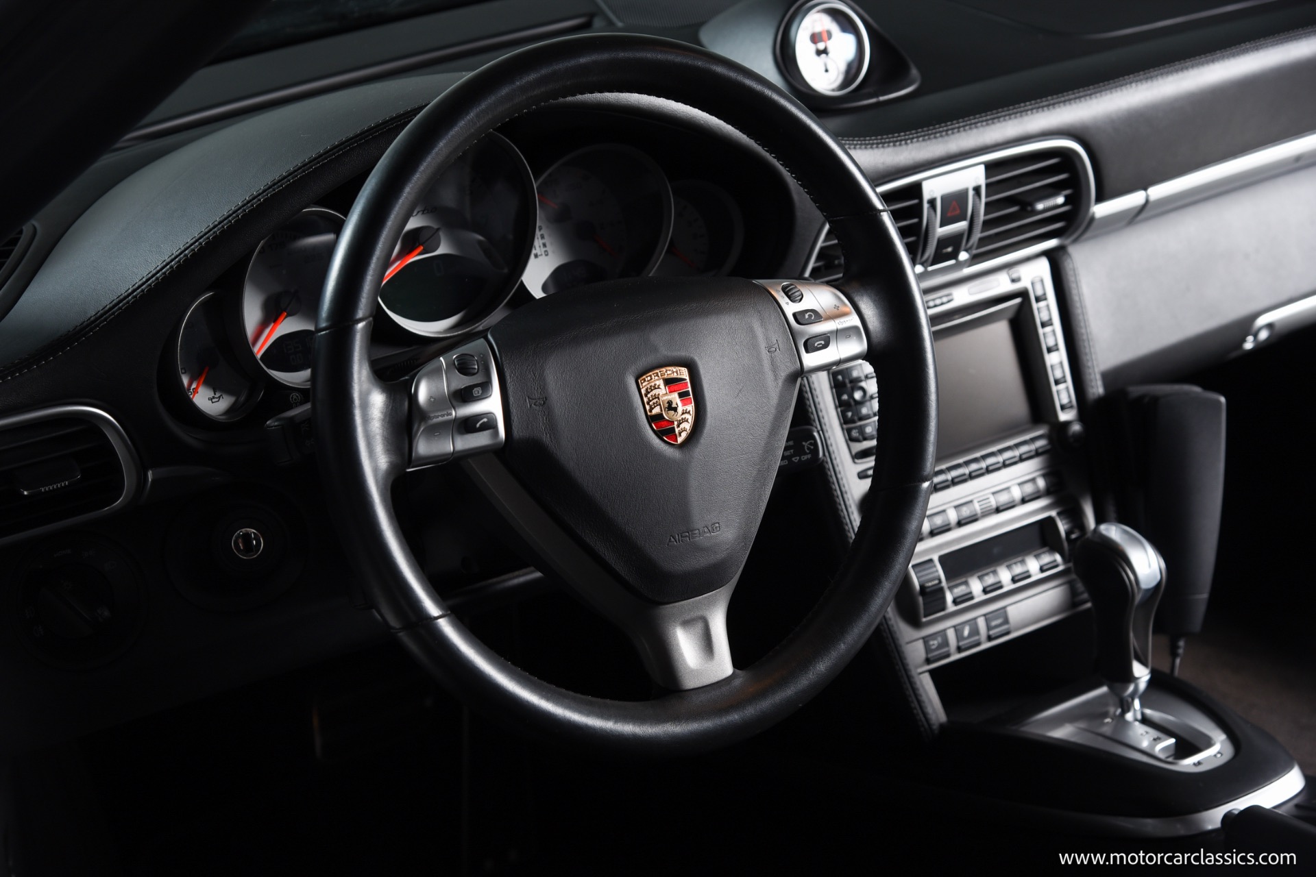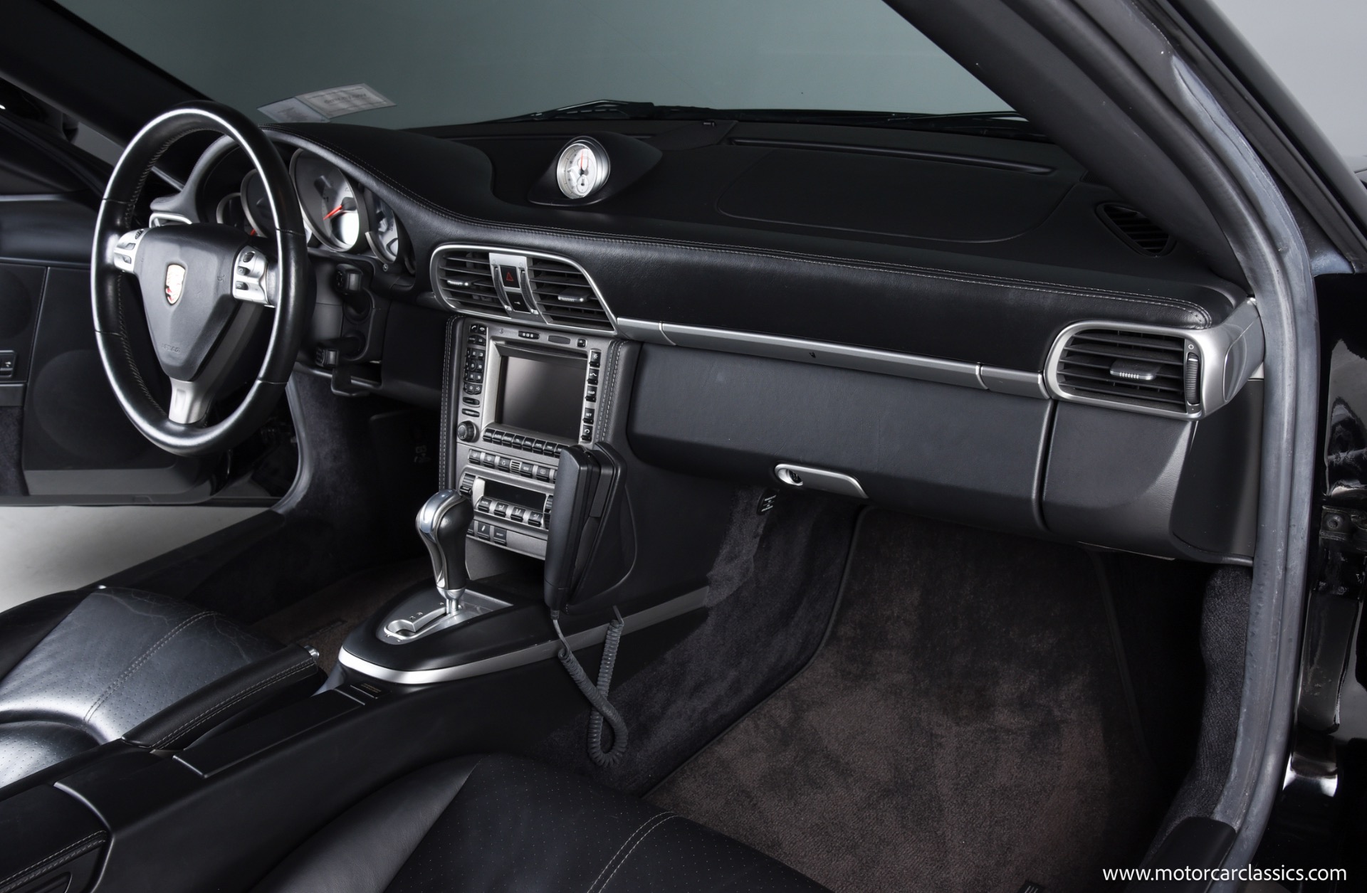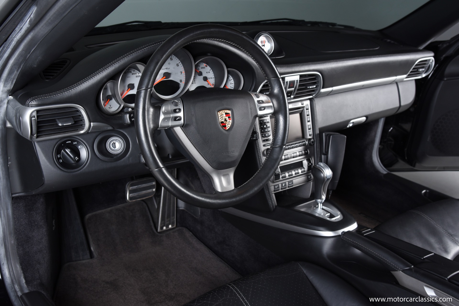 This Turbo is finished in Black (code A1) with a matching full black leather interior, both ordered from the factory. Noteworthy features and significant factory options include the Tiptronic S transmission, which makes this one of the most approachable and user-friendly Turbos for everyday driving or spirited runs. Major options include the Sport Chrono Package Plus, Porsche Active Suspension Management (PASM), heated seats, Park Assist, navigation, BOSE High-End Sound Package, xenon headlights, sunroof, three-spoke multifunction steering wheel, rear window wiper, and illuminated stainless door entry guards. The car also features comfort seats with memory, 19" Turbo wheels, and several luxury touches such as floor mats in interior color, Porsche crests in the headrests, and an Alcantara roofliner. All original electronics and entertainment features, including a remote 6-disc CD changer and telephone module, remain installed.