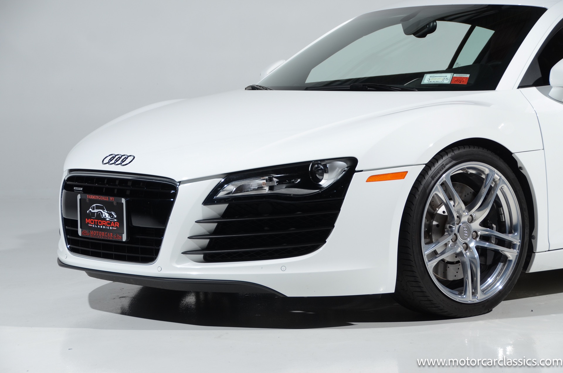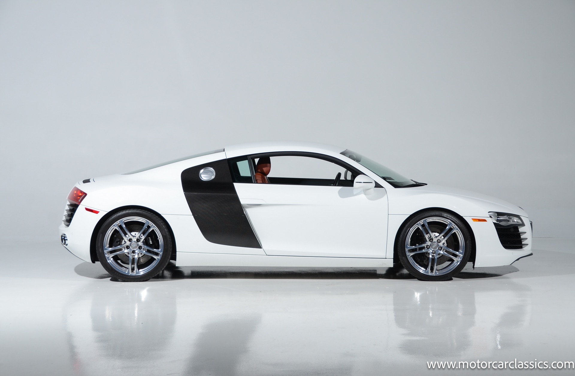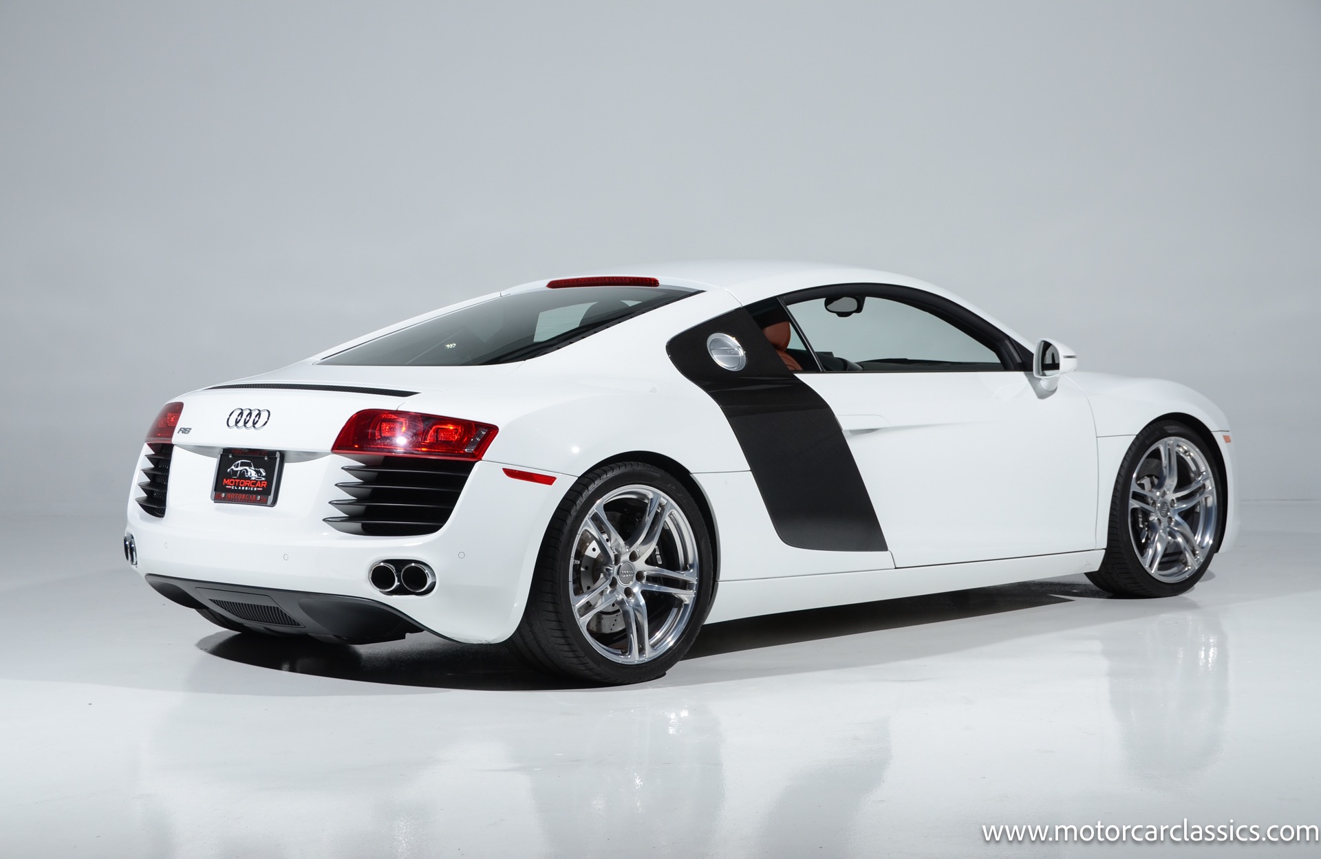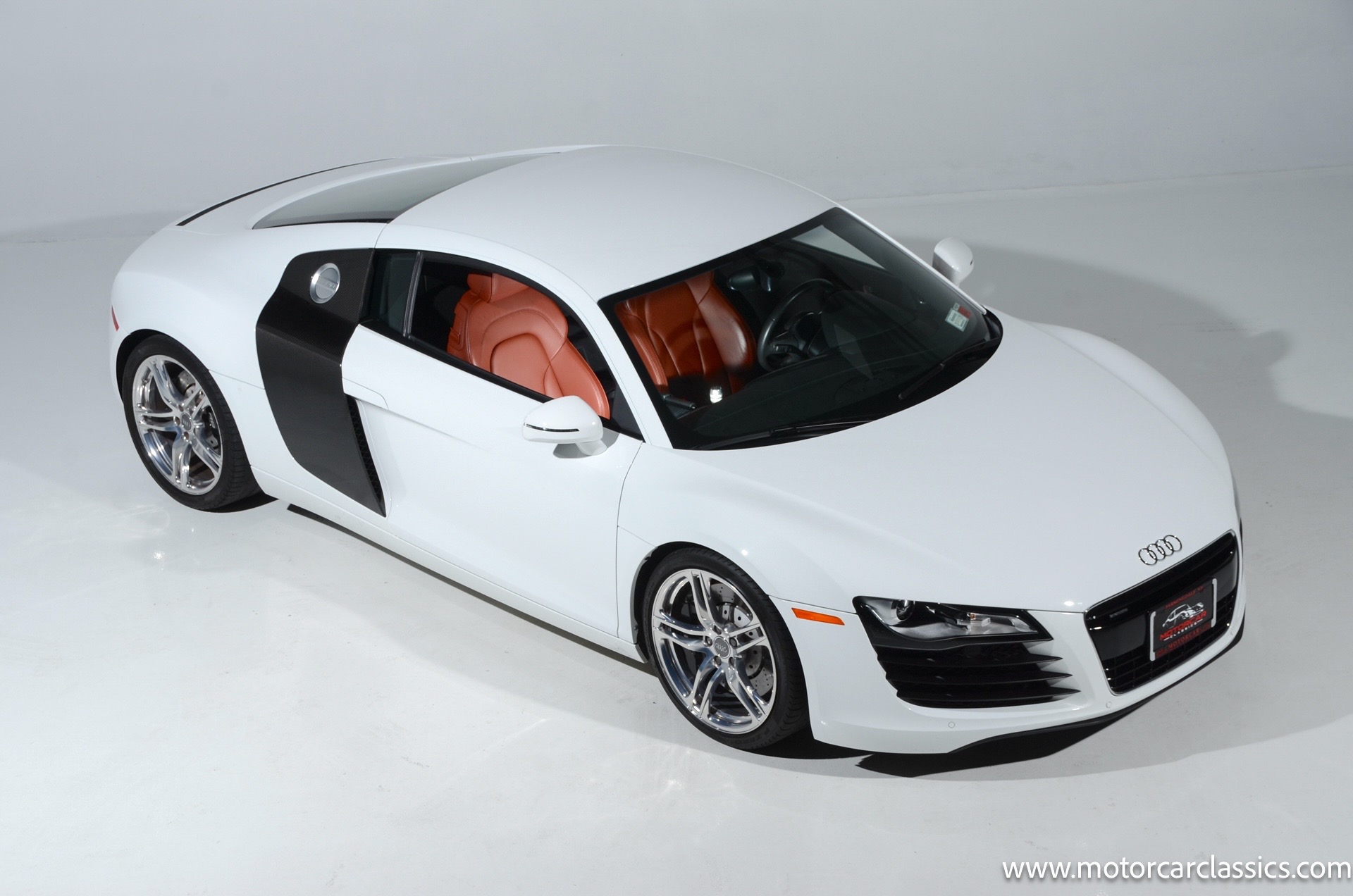 2009 Audi R8 Quattro for sale! Motorcar Classics invites you to experience the thrill of driving this stunning 2009 Audi R8, a renowned supercar that combines luxury with performance.Our R8 boasts a powerful 4.2L V8 engine, delivering an impressive 420 horsepower, backed by the very rare and desirable six-speed manual gearbox, ensuring exhilarating acceleration and a top-notch driving experience. With only 9,851 miles on the odometer, and an unblemished history, this R8 is in exceptional condition, showcasing its meticulous care and low usage. Dressed in an eye-catching Ibis White exterior, with luxurious Tuscan Brown Nappa leather interior, the car features a sleek and aerodynamic design that turns heads wherever it goes. The manual transmission enhances the driving experience, allowing enthusiasts to fully engage with the vehicle's capabilities. This 2009 Audi R8 is a user-friendly supercar combining Audi's incredible engineering and reliability, all-wheel Quattro drive, and sparkling performance. Don?t miss your chance to drive away in this iconic supercar that embodies the spirit of Audi's engineering prowess.