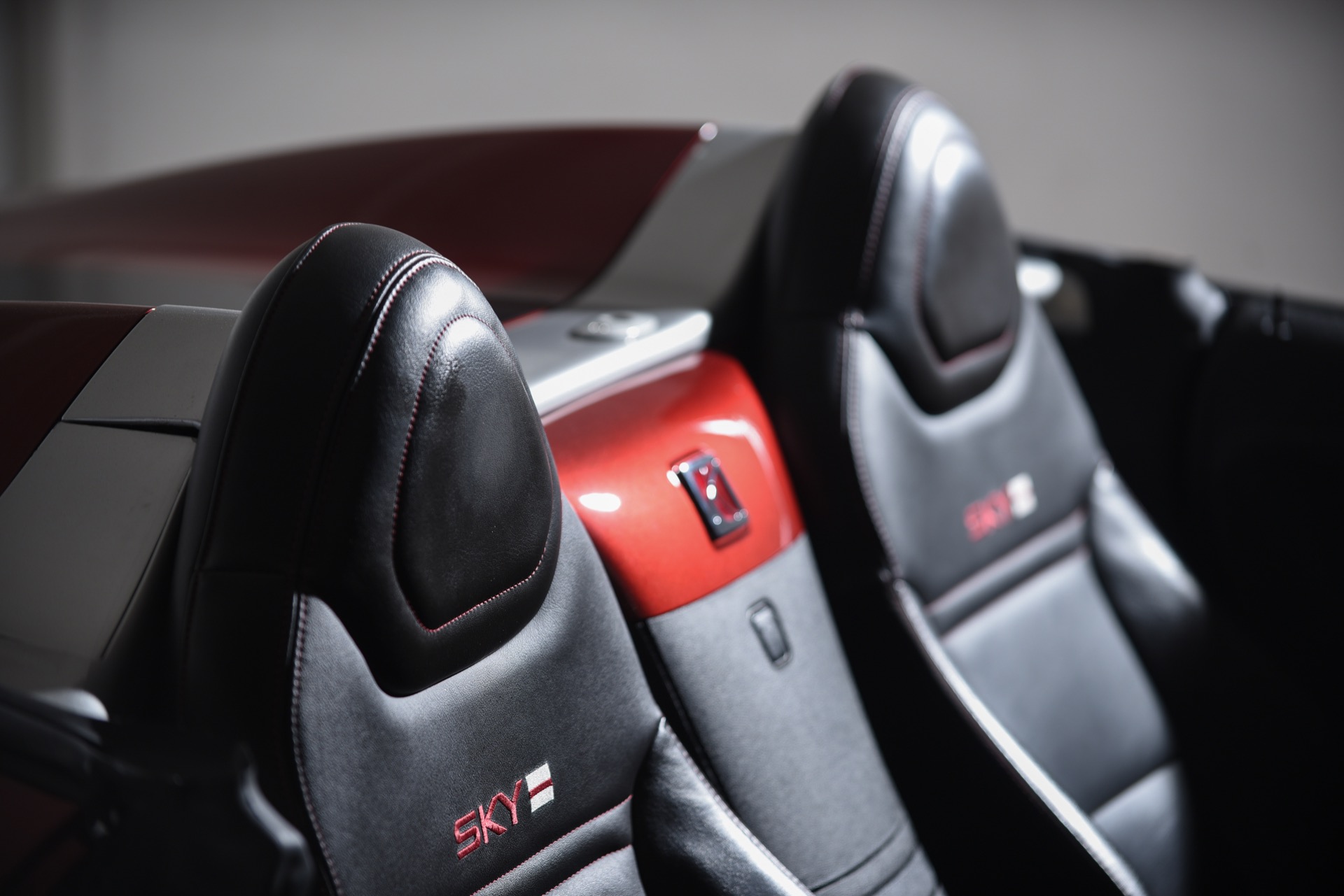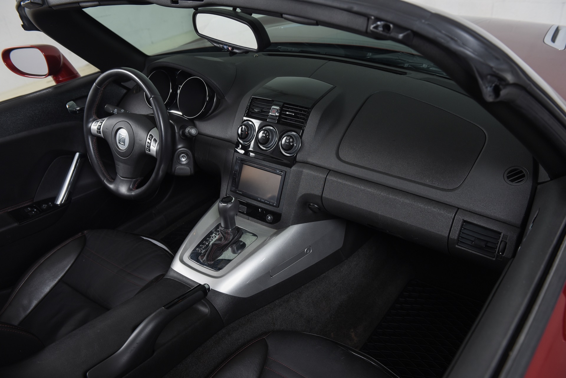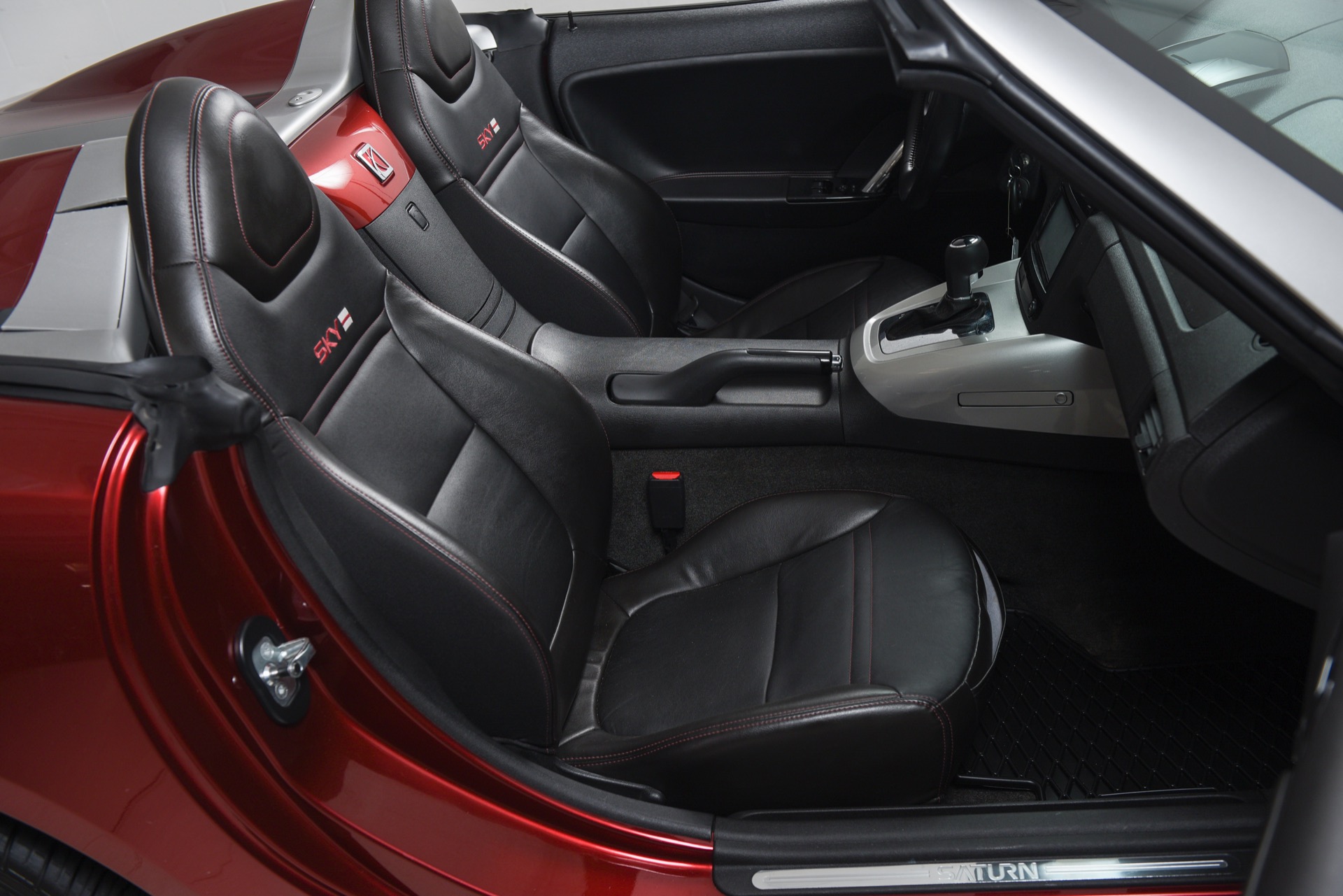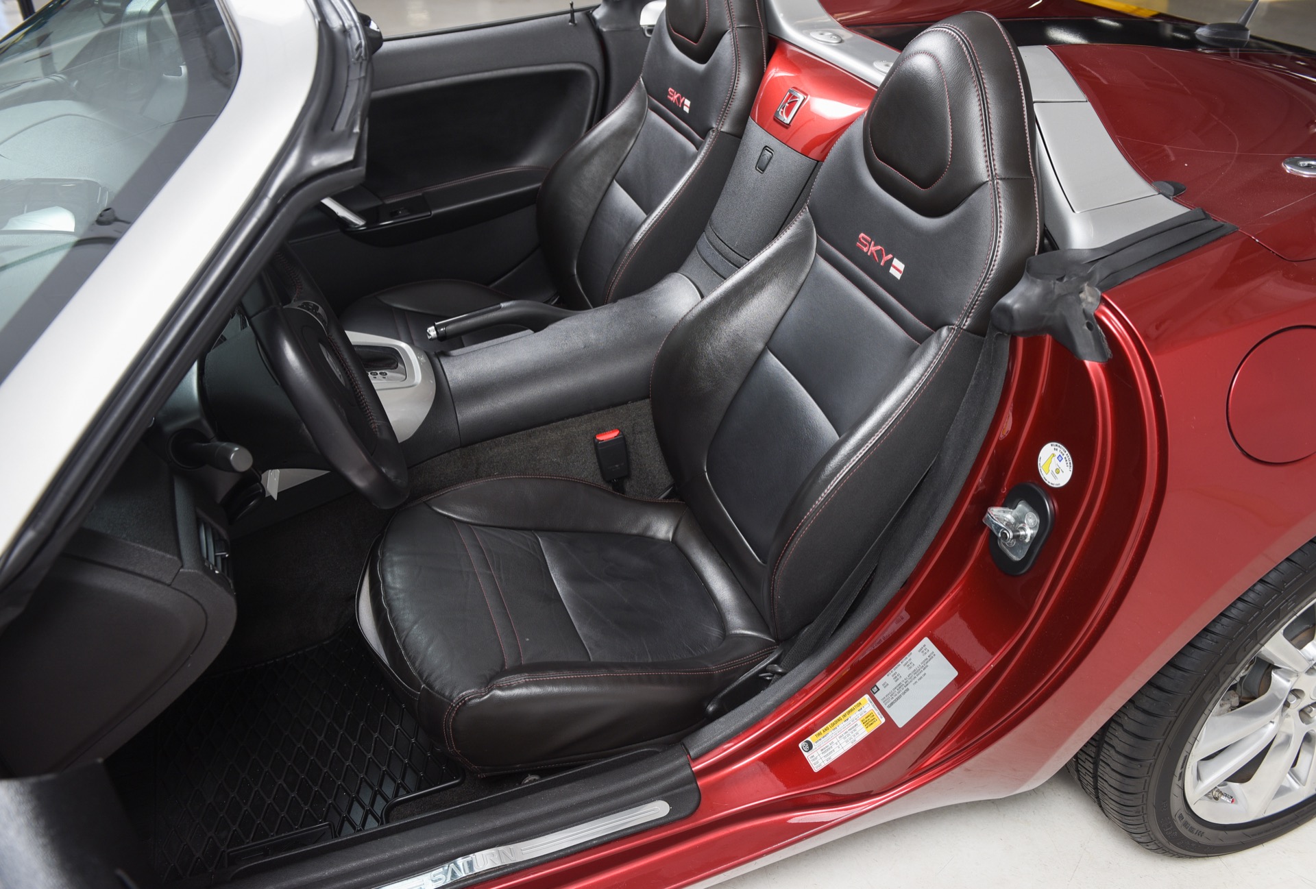 While the standard Sky makes do with a 2.4-liter four-cylinder delivering 177 horsepower, the Red Line is powered by the optional 2.0-liter turbocharged four cylinder that pumps out a screaming 260 horsepower with very little turbo lag. Our car features the user-friendly 5-speed automatic gearbox which is well-suited to the added Turbo power. The Red Line model also features a firmer suspension setting, dual chrome-tipped exhaust, as well as its own interior enhancements, such as Red Line-specific instruments (including a digital boost gauge), metallic sill plates, and stainless steel trim. Our car, however, is the range-topping Ruby Red Limited Edition car which perfectly describes the distinctive interior color and adds new split-spoke sport wheels and a sport stripe. Contemporary road tests show 0-60 times in the 5.5 to 5.8 second range, and the Red Line is rated at 19 mpg city and 26 mpg highway with the automatic transmission.