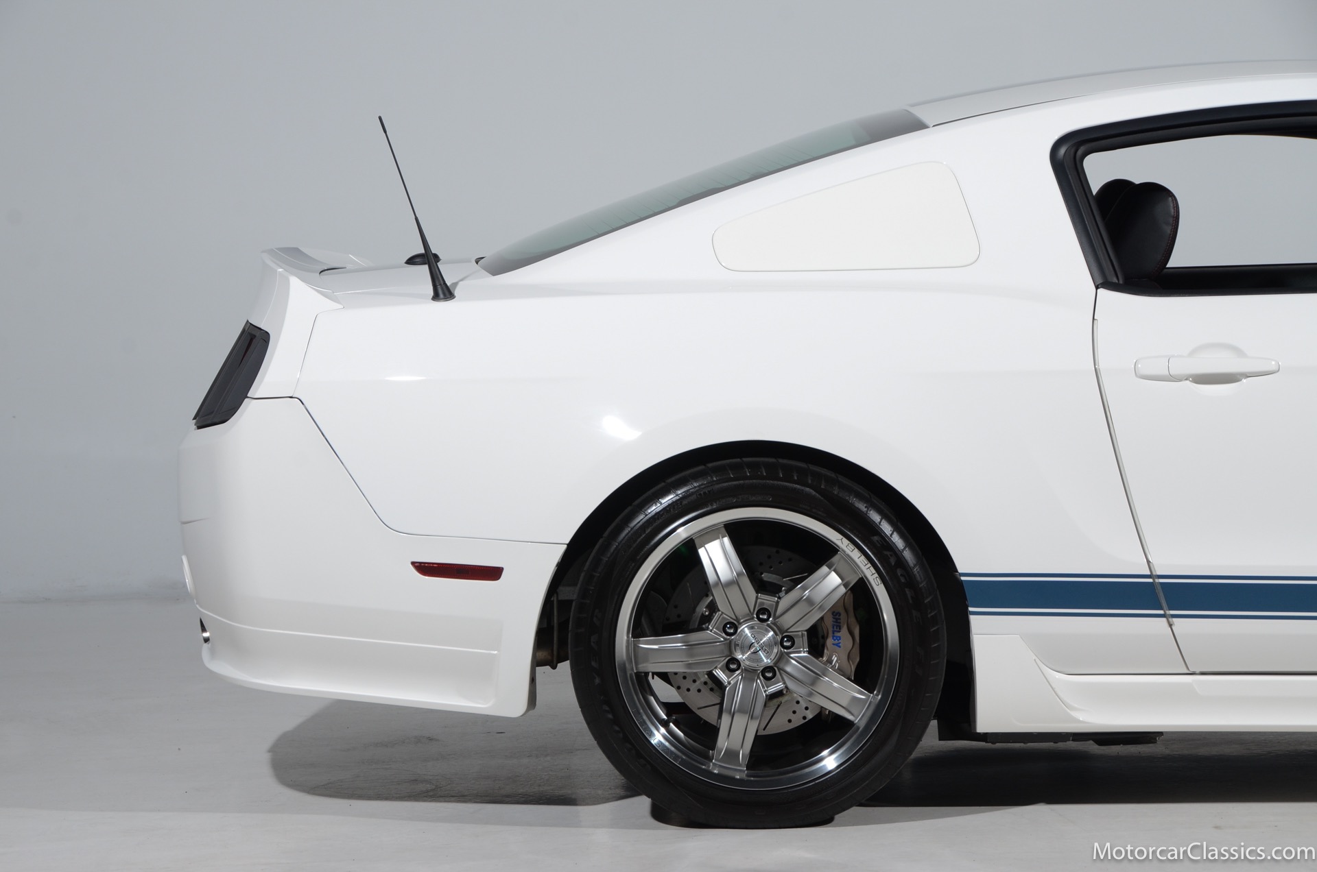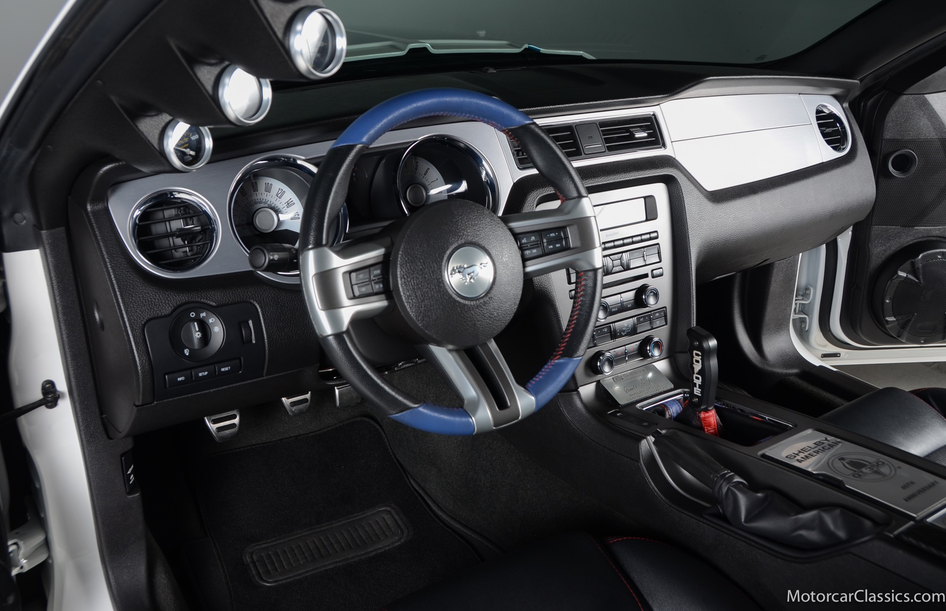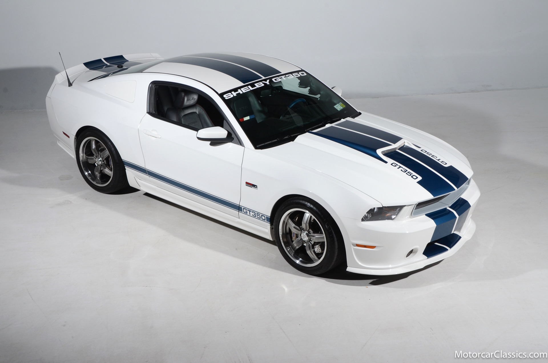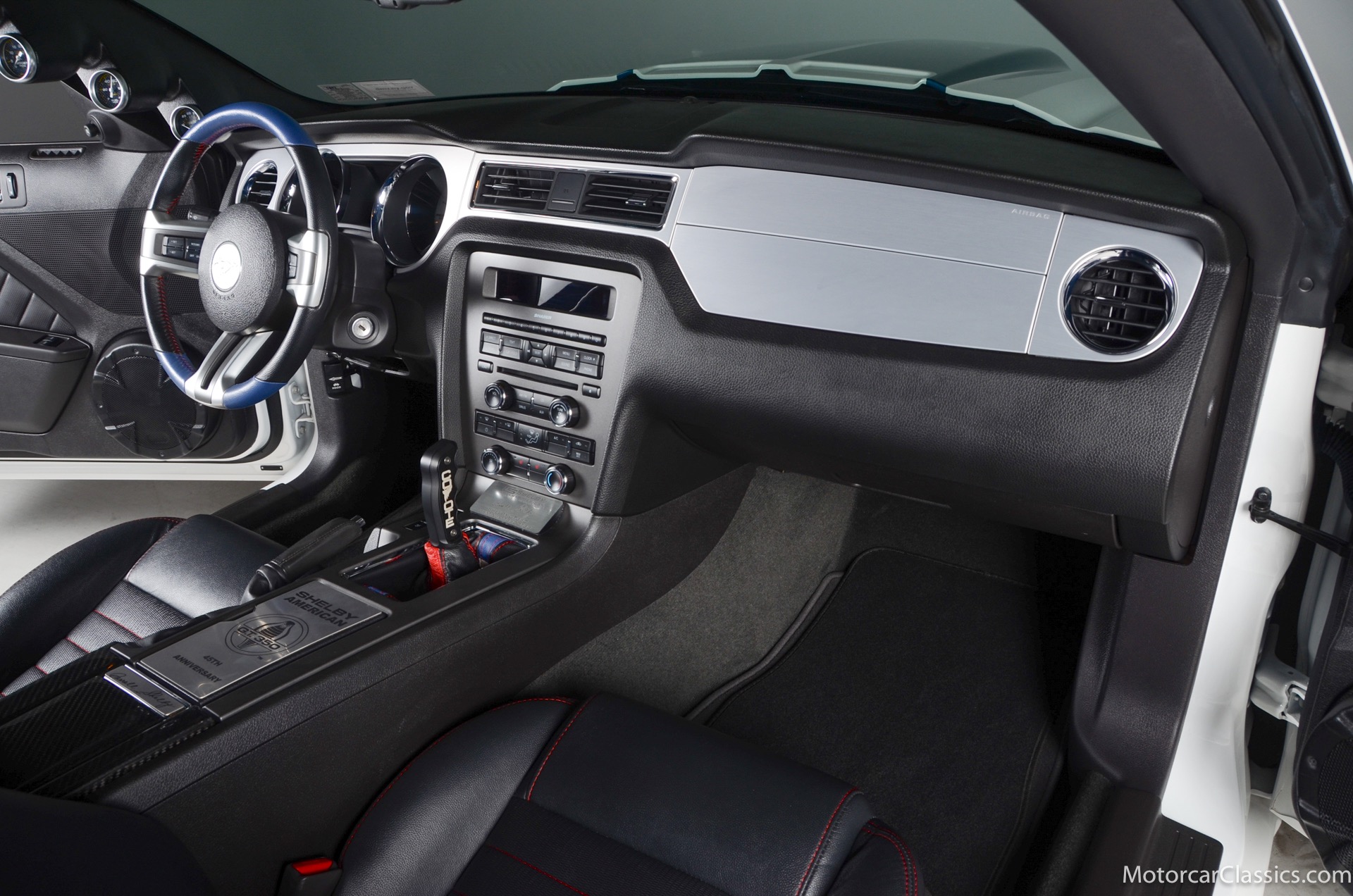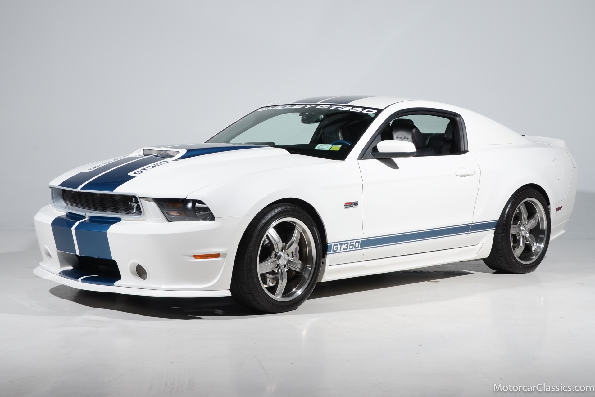 2011 45th Anniversary Shelby GT350 for sale! Finished in beautiful Performance white with painted Guardsman Blue over-the-top and side stripes and custom interior upgrades from Shelby. The upgrades are more than skin deep, power comes from a Whipple supercharged 5.0 liter V-8 with 3 power levels available, 420HP, 525HP and 545HP. Driven just 6,092 miles from new, this beautifully preserved example is now available for sale at Motorcar Classics. Additional upgrades from Shelby over the standard 45th Anniversary GT350's are as follows: Shelby/Ford Racing Polished Whipple supercharger, Shelby/Baer 6 piston rear brake kit, Watts link rear suspension, Shelby/Kicker premium sound system, Painted racing stripes(Full), Customer interior Upgrade.