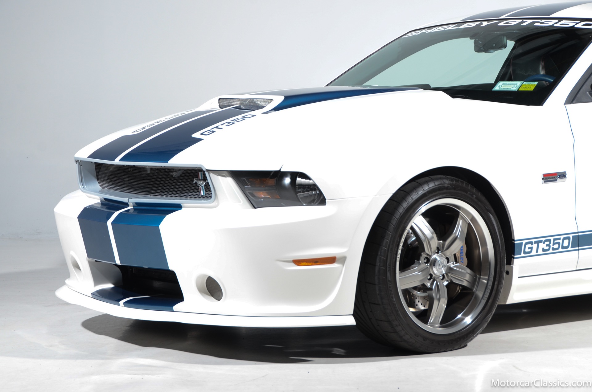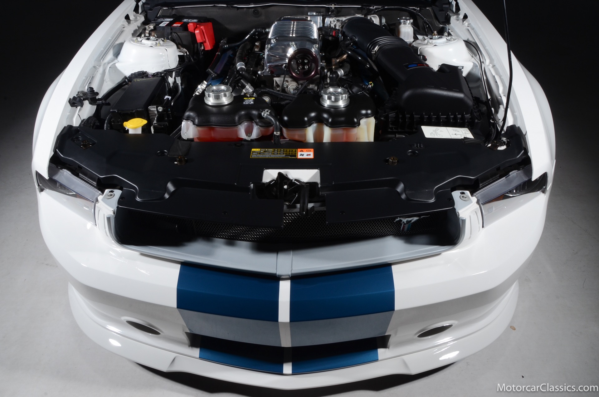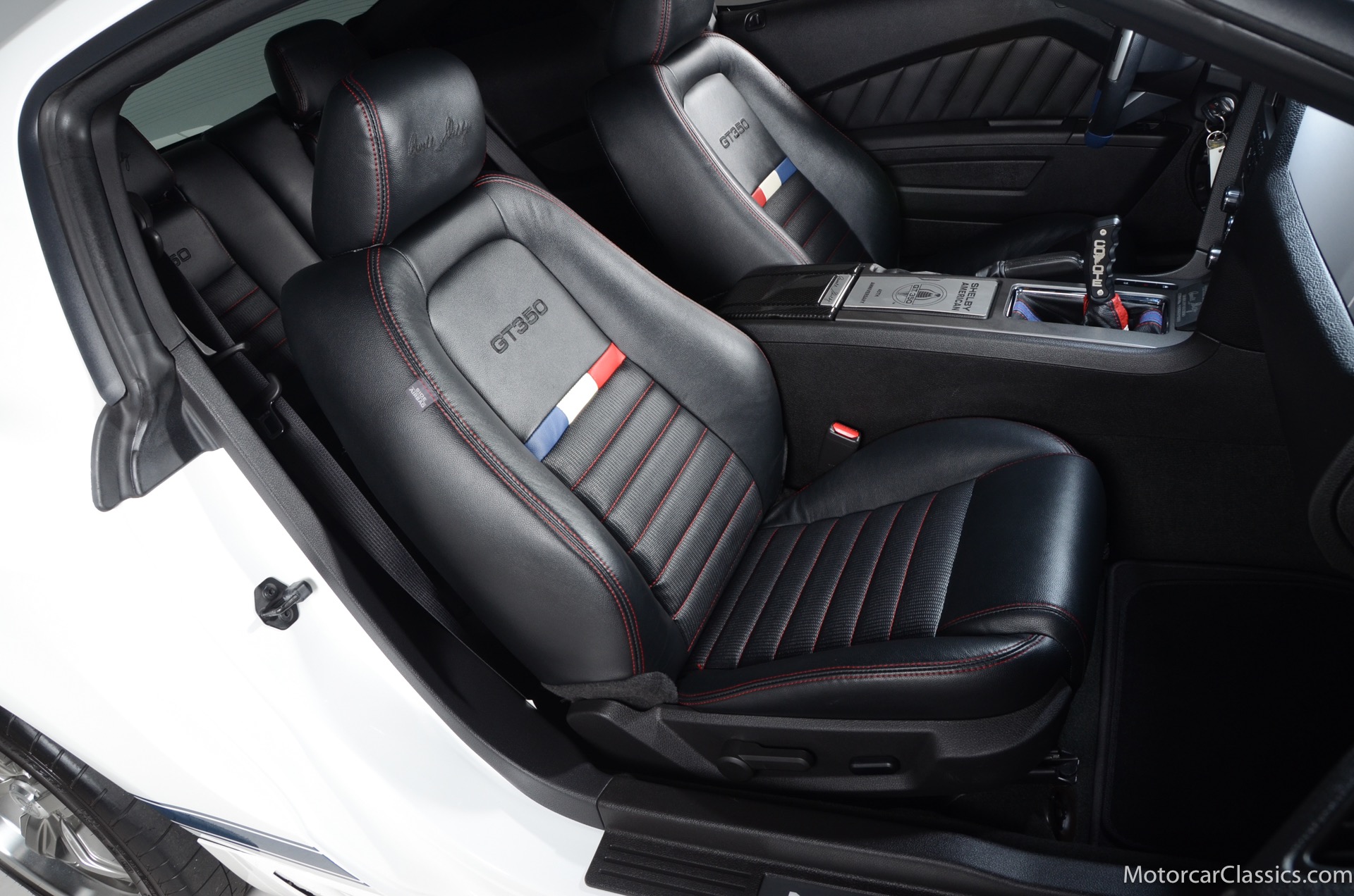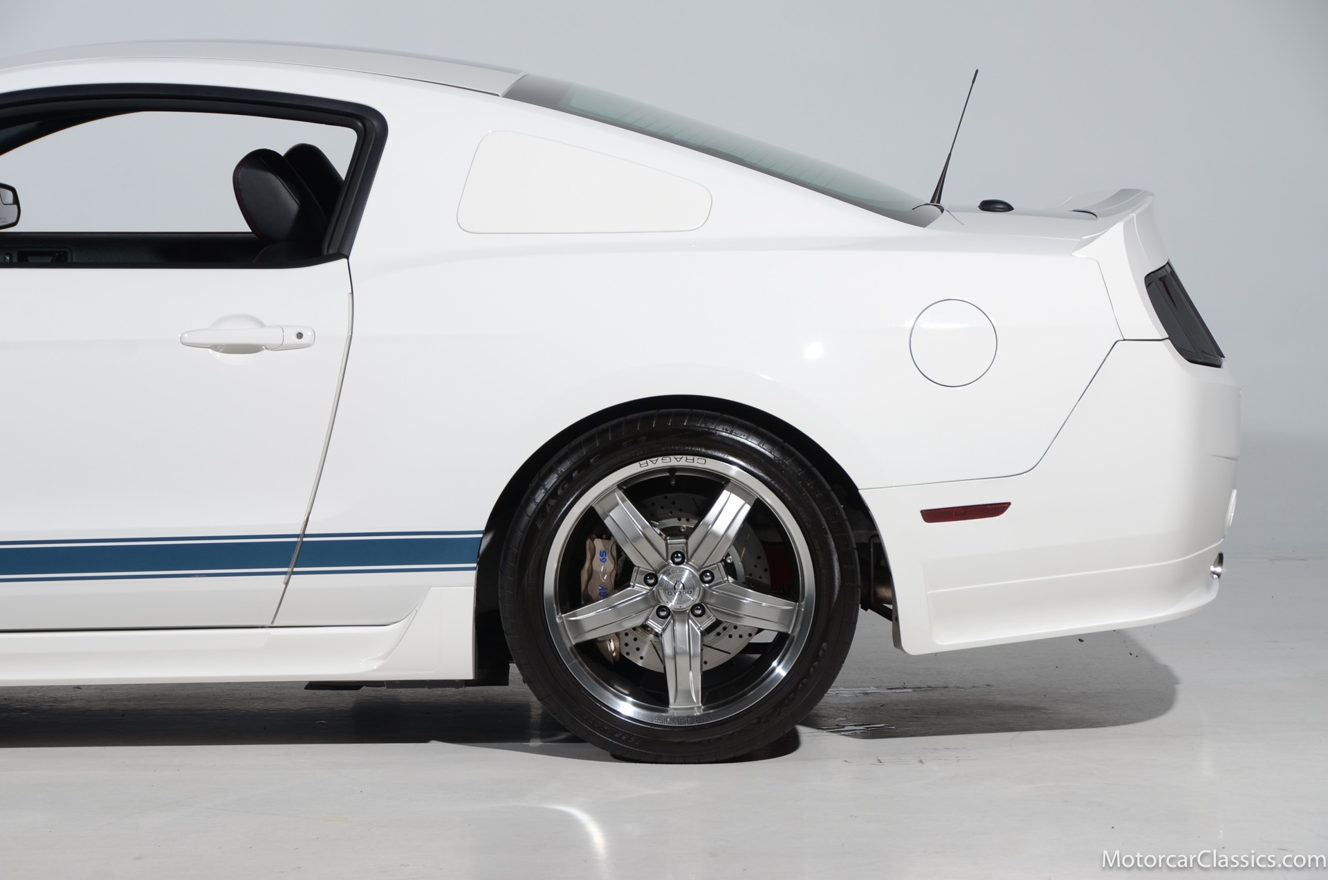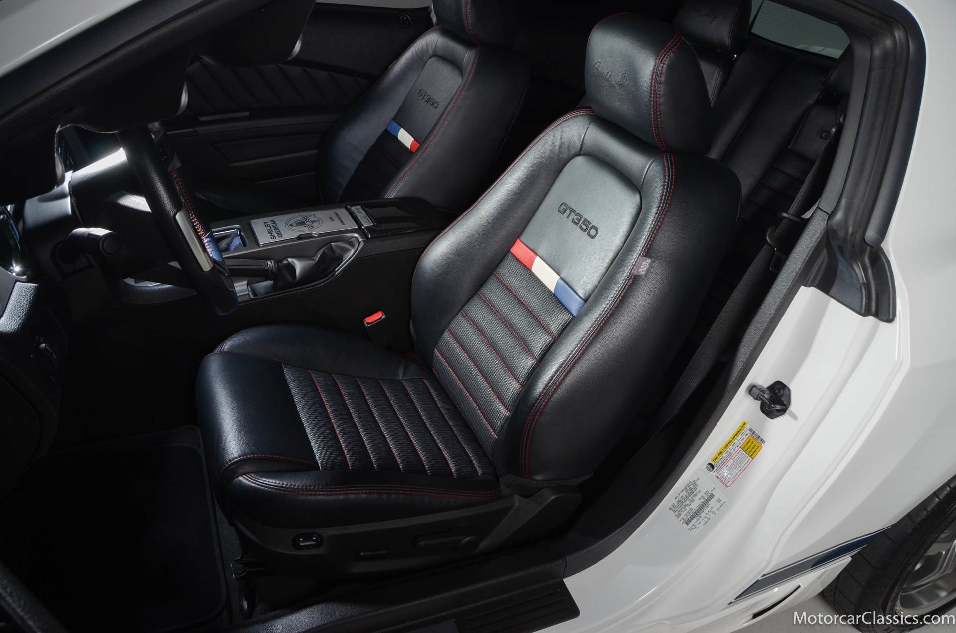 2011 45th Anniversary Shelby GT350 for sale! Finished in beautiful Performance white with painted Guardsman Blue over-the-top and side stripes and custom interior upgrades from Shelby. The upgrades are more than skin deep, power comes from a Whipple supercharged 5.0 liter V-8 with 3 power levels available, 420HP, 525HP and 545HP. Driven just 6,092 miles from new, this beautifully preserved example is now available for sale at Motorcar Classics. Additional upgrades from Shelby over the standard 45th Anniversary GT350's are as follows: Shelby/Ford Racing Polished Whipple supercharger, Shelby/Baer 6 piston rear brake kit, Watts link rear suspension, Shelby/Kicker premium sound system, Painted racing stripes(Full), Customer interior Upgrade.
