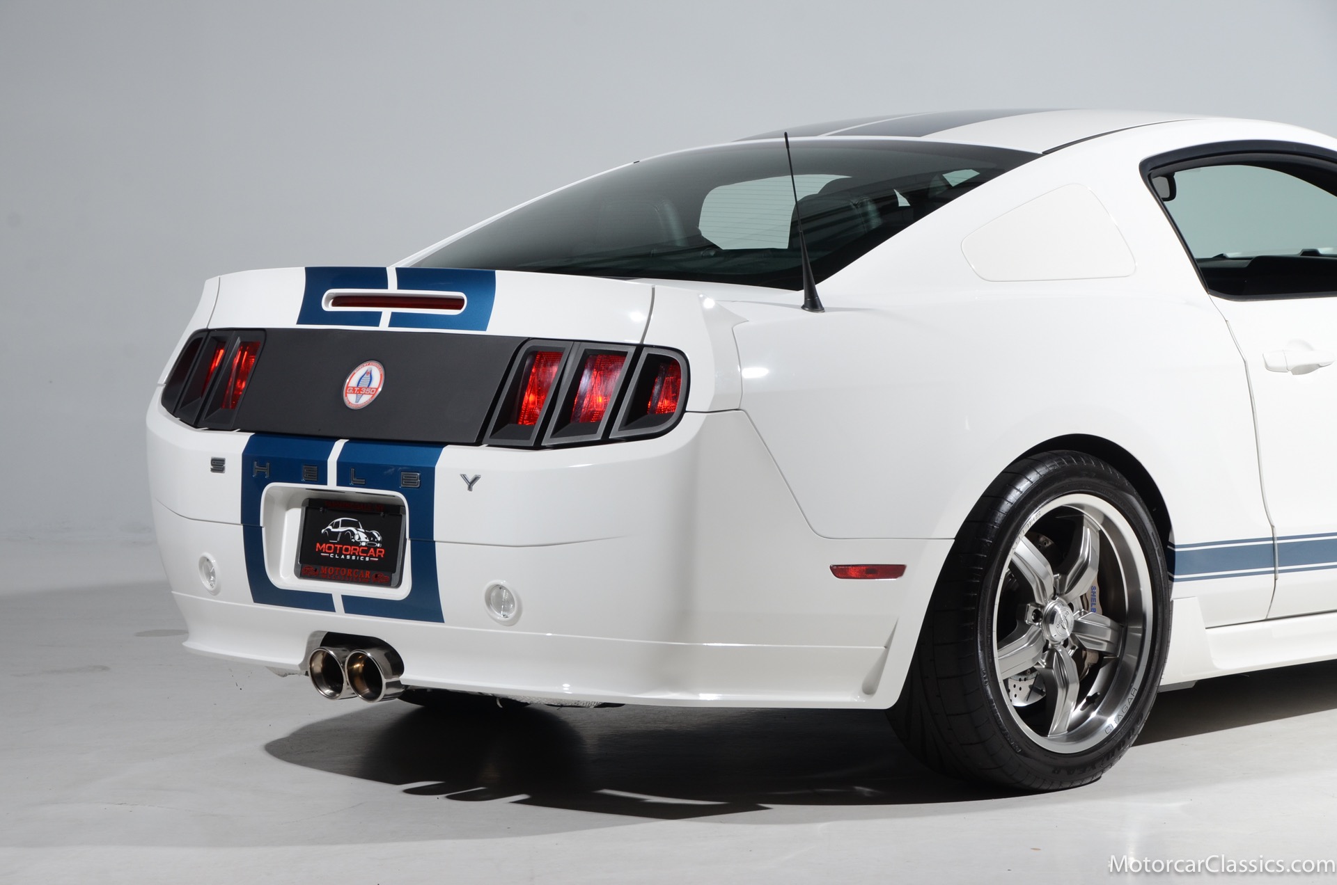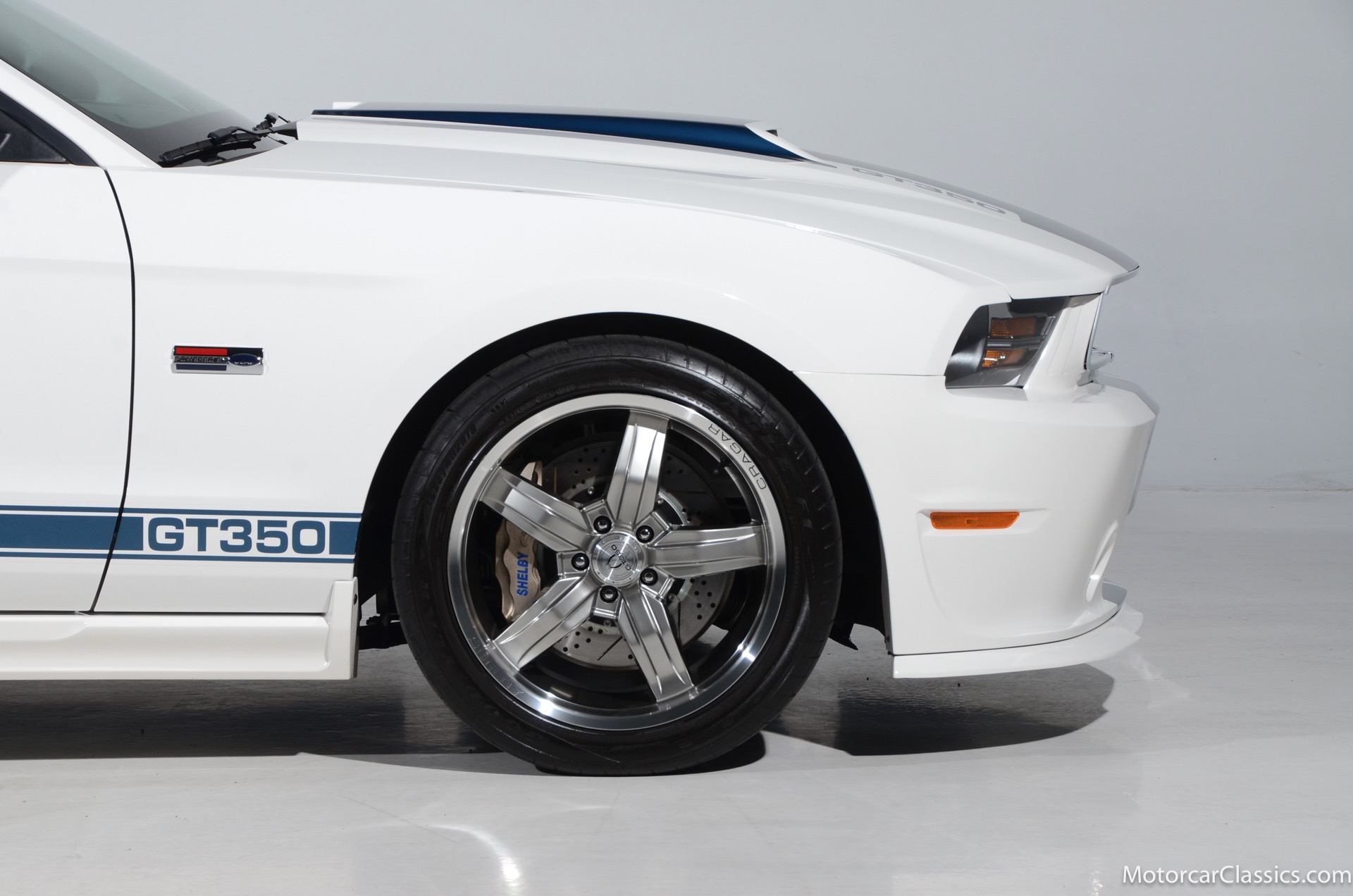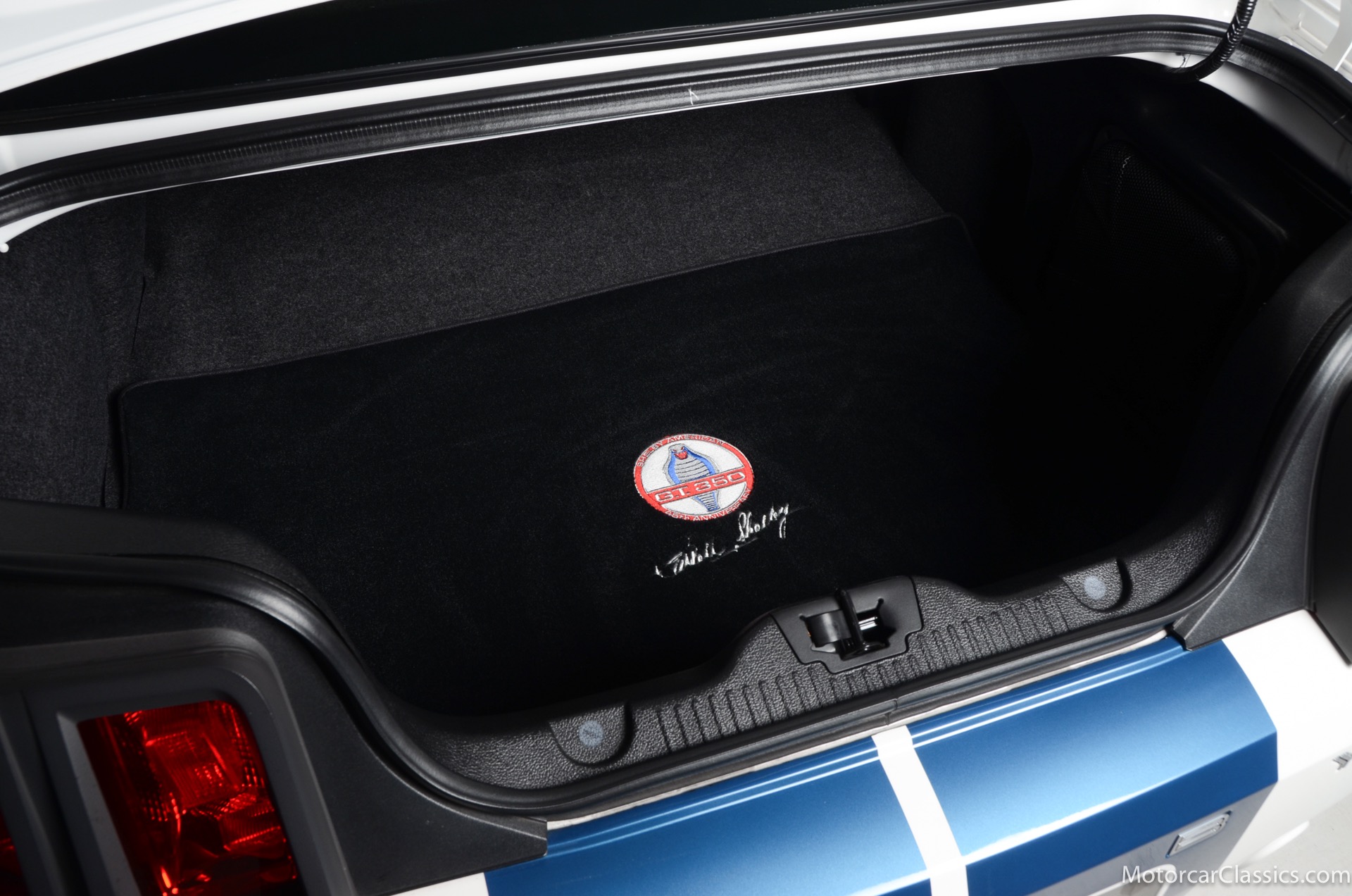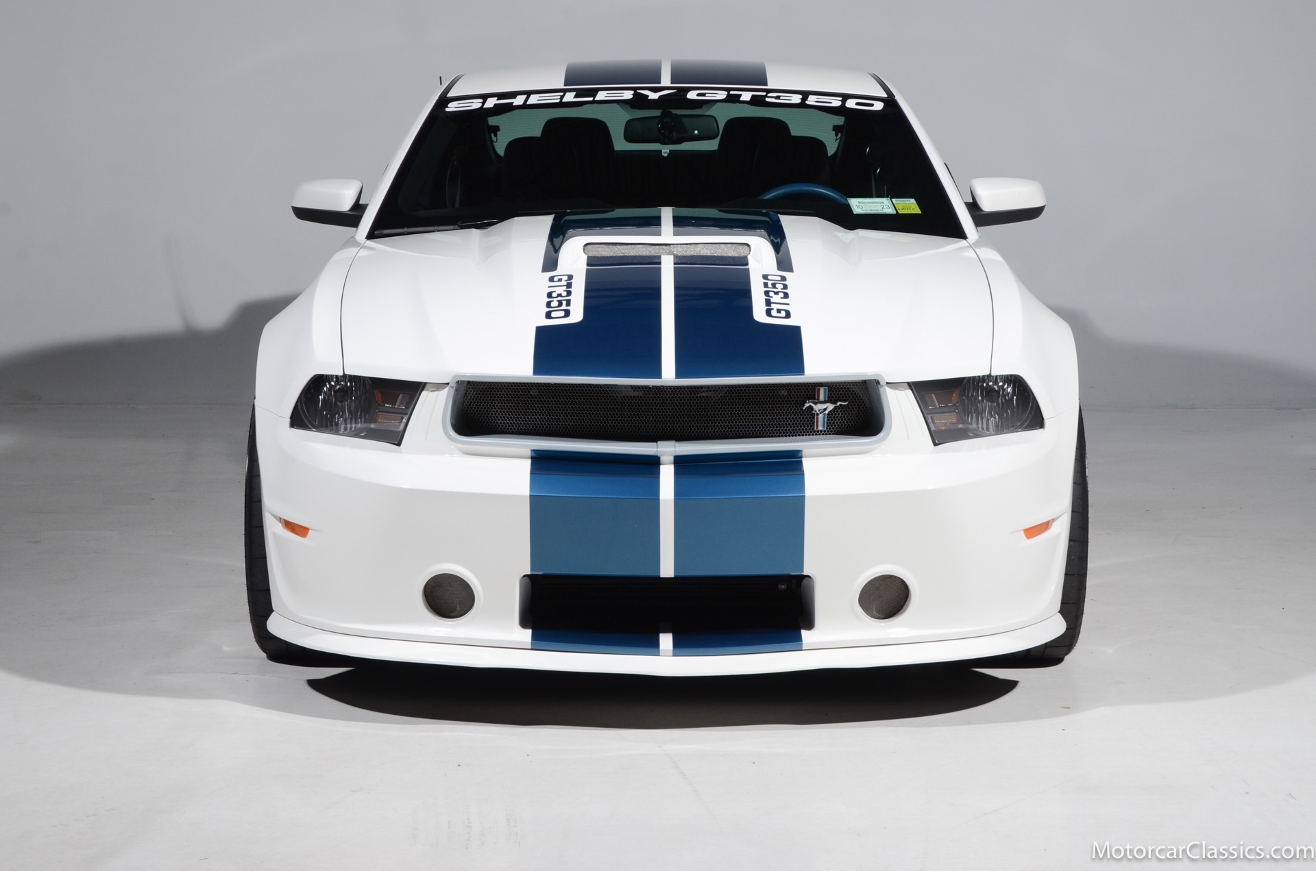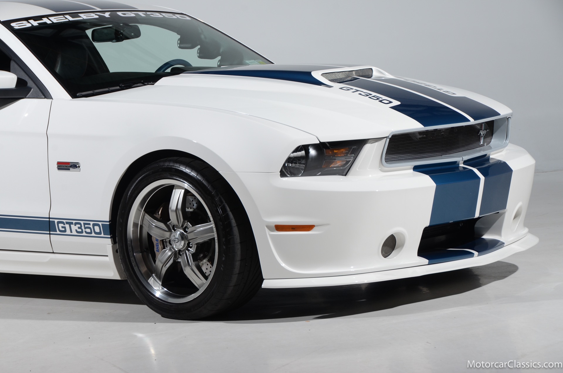 2011 45th Anniversary Shelby GT350 for sale! Finished in beautiful Performance white with painted Guardsman Blue over-the-top and side stripes and custom interior upgrades from Shelby. The upgrades are more than skin deep, power comes from a Whipple supercharged 5.0 liter V-8 with 3 power levels available, 420HP, 525HP and 545HP. Driven just 6,092 miles from new, this beautifully preserved example is now available for sale at Motorcar Classics. Additional upgrades from Shelby over the standard 45th Anniversary GT350's are as follows: Shelby/Ford Racing Polished Whipple supercharger, Shelby/Baer 6 piston rear brake kit, Watts link rear suspension, Shelby/Kicker premium sound system, Painted racing stripes(Full), Customer interior Upgrade.