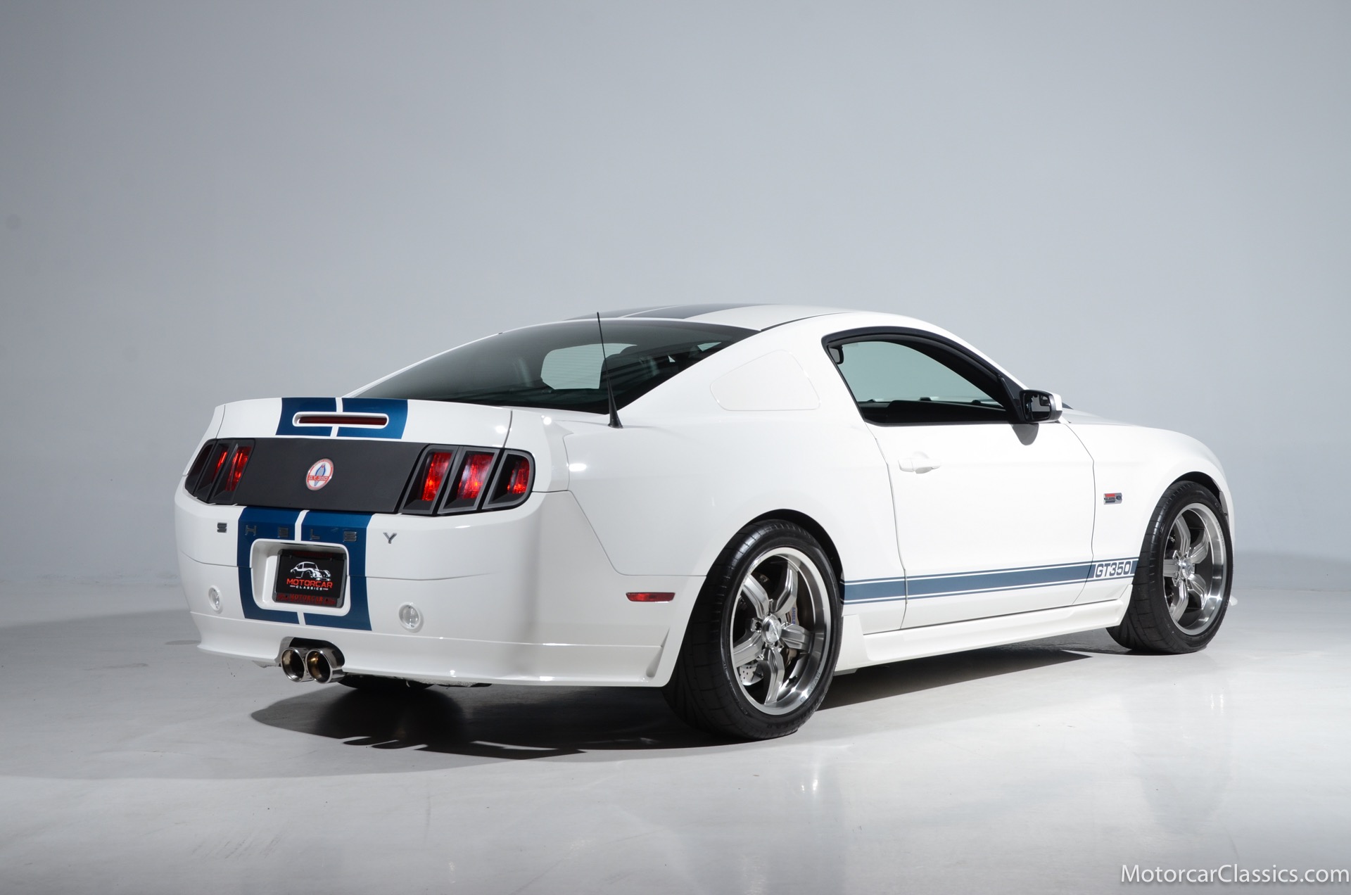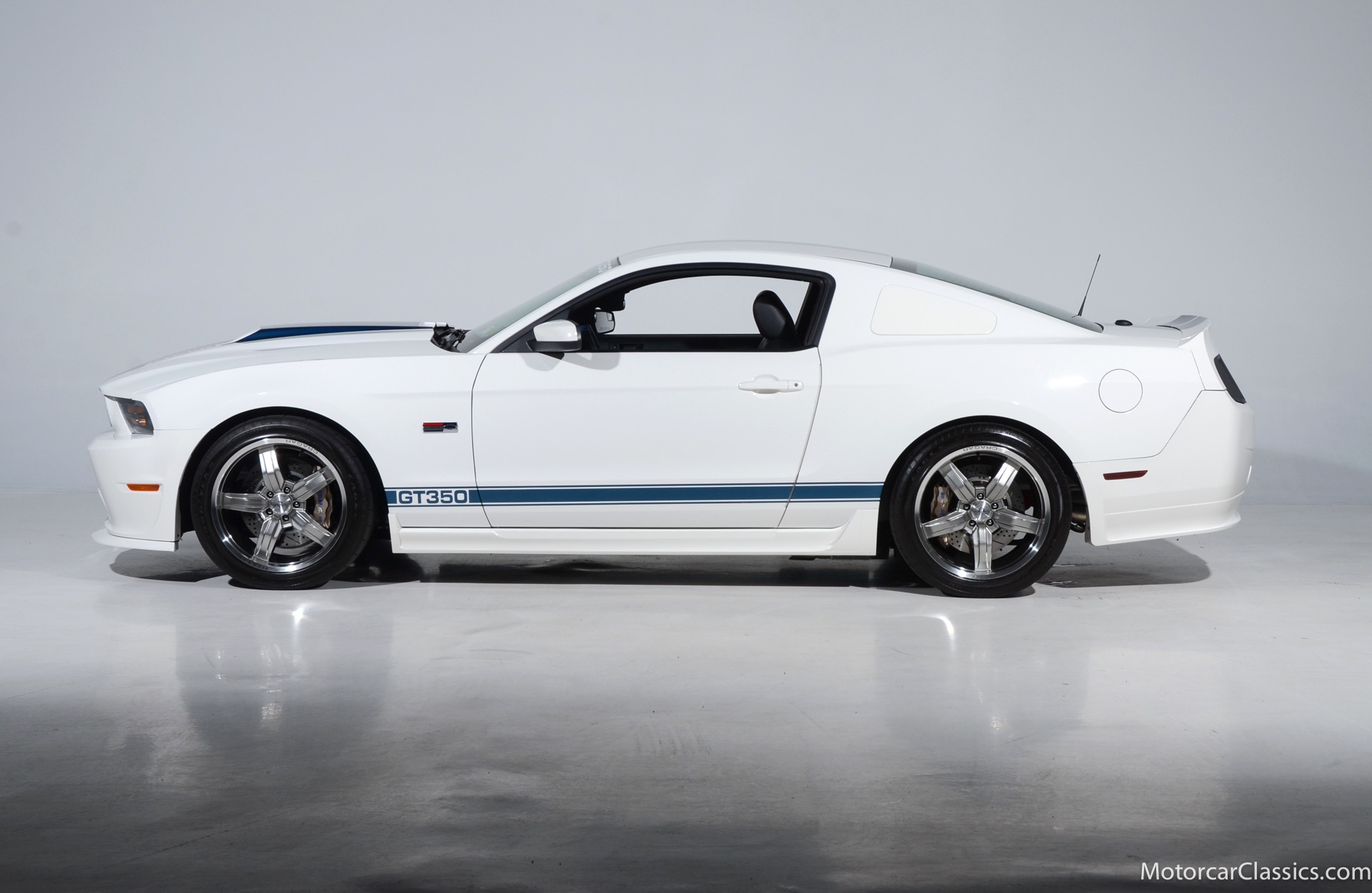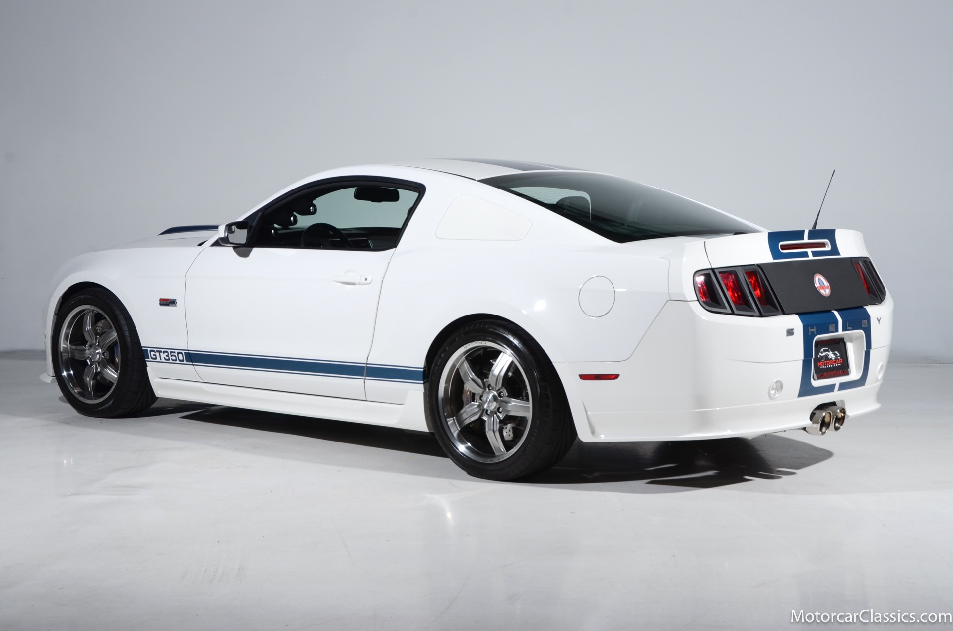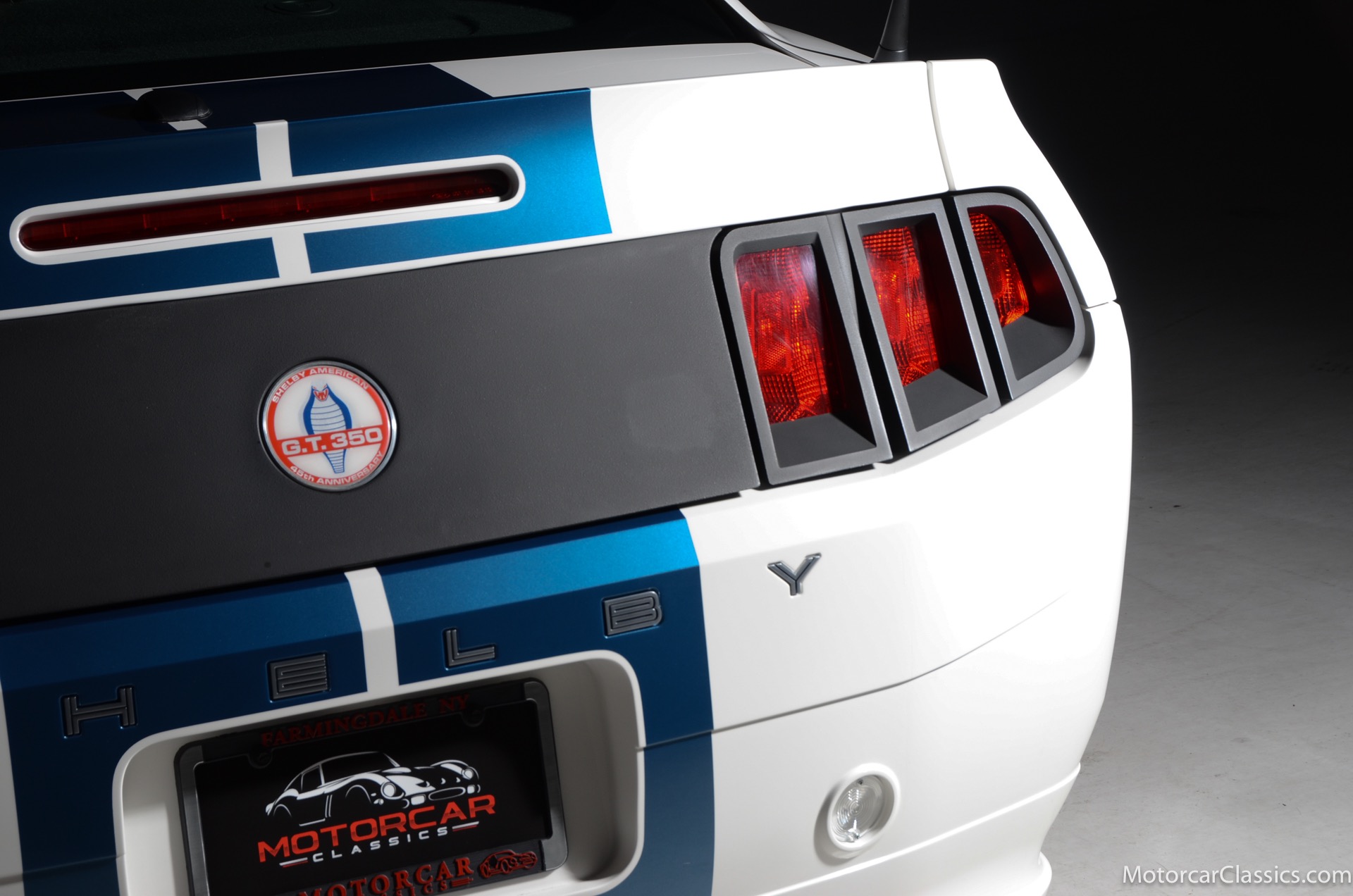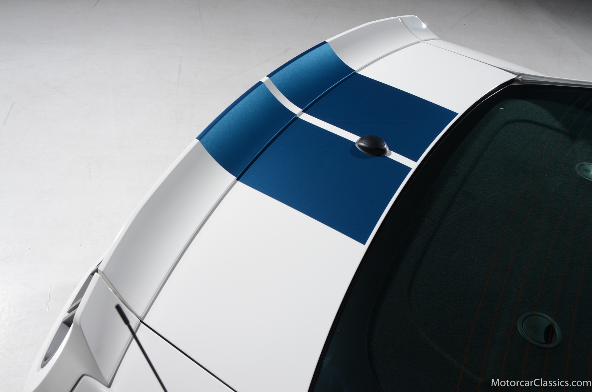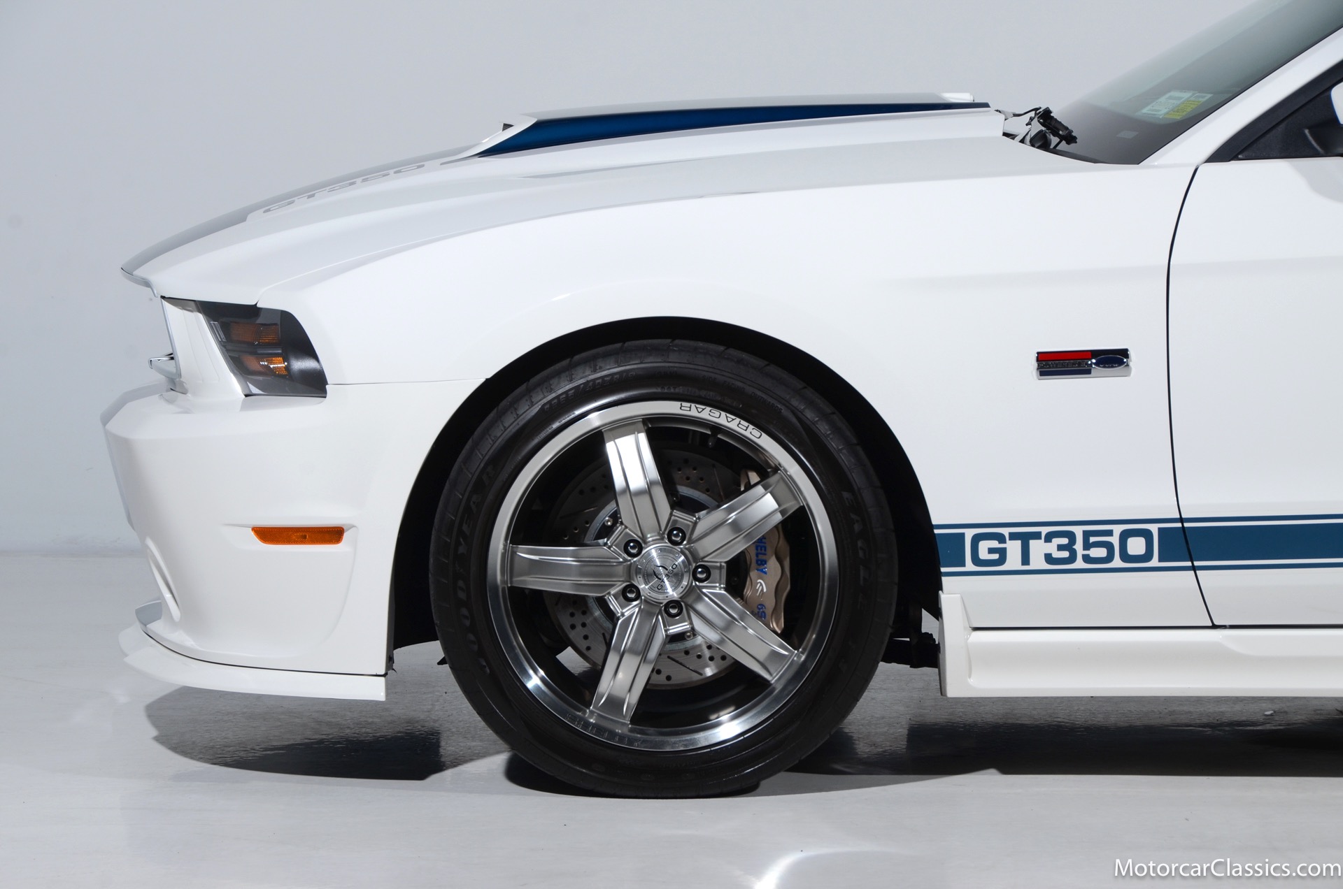 2011 45th Anniversary Shelby GT350 for sale! Finished in beautiful Performance white with painted Guardsman Blue over-the-top and side stripes and custom interior upgrades from Shelby. The upgrades are more than skin deep, power comes from a Whipple supercharged 5.0 liter V-8 with 3 power levels available, 420HP, 525HP and 545HP. Driven just 6,092 miles from new, this beautifully preserved example is now available for sale at Motorcar Classics. Additional upgrades from Shelby over the standard 45th Anniversary GT350's are as follows: Shelby/Ford Racing Polished Whipple supercharger, Shelby/Baer 6 piston rear brake kit, Watts link rear suspension, Shelby/Kicker premium sound system, Painted racing stripes(Full), Customer interior Upgrade.
