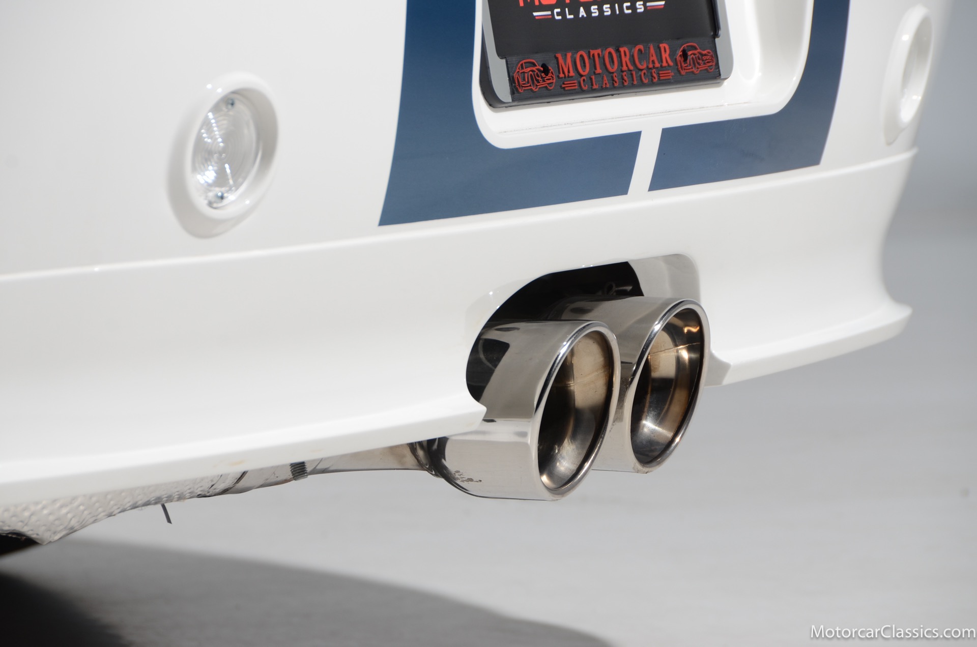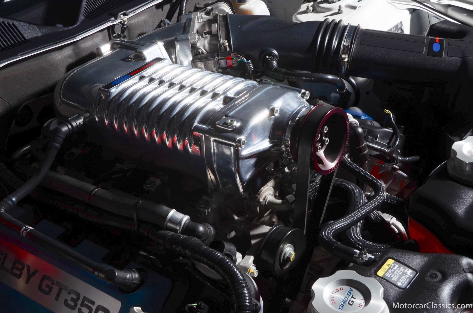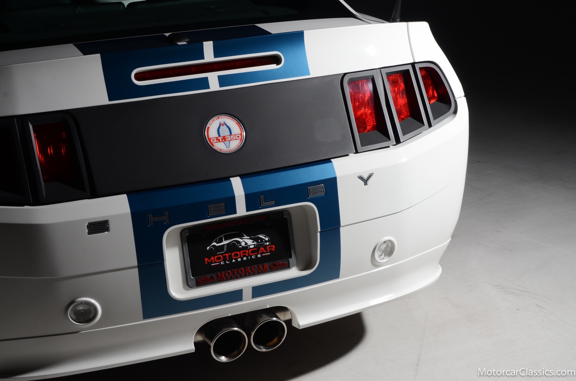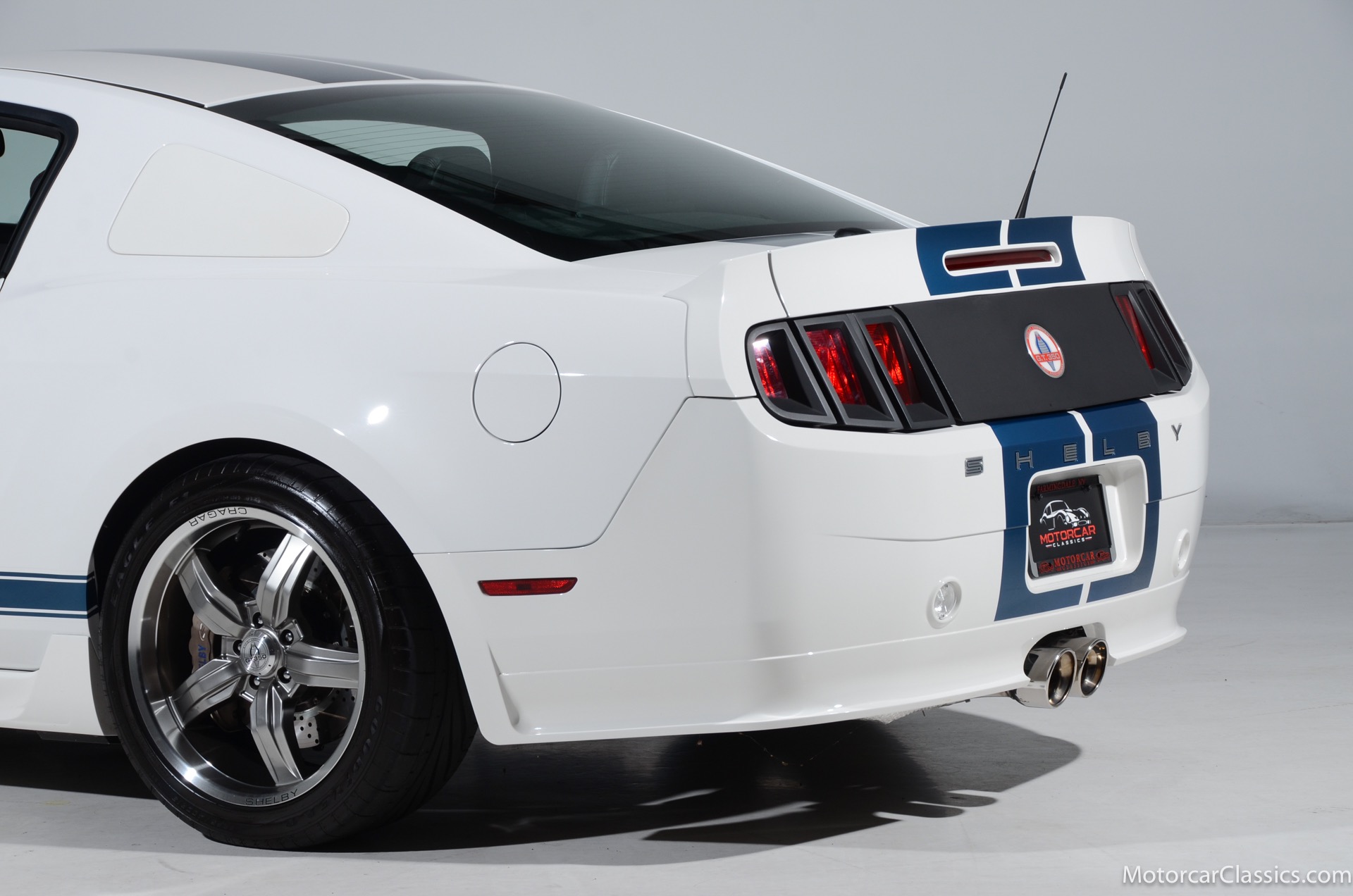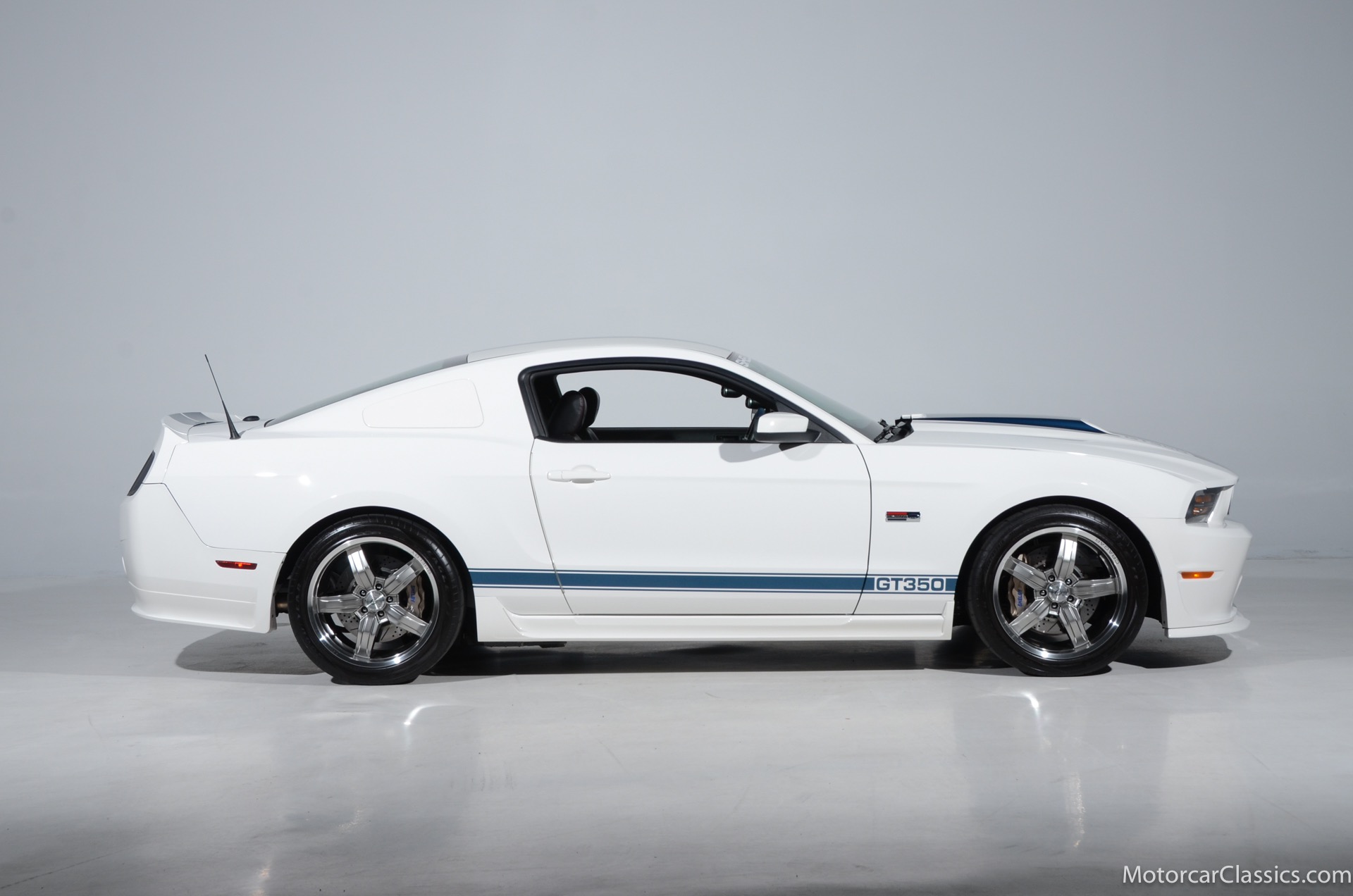 2011 45th Anniversary Shelby GT350 for sale! Finished in beautiful Performance white with painted Guardsman Blue over-the-top and side stripes and custom interior upgrades from Shelby. The upgrades are more than skin deep, power comes from a Whipple supercharged 5.0 liter V-8 with 3 power levels available, 420HP, 525HP and 545HP. Driven just 6,092 miles from new, this beautifully preserved example is now available for sale at Motorcar Classics. Additional upgrades from Shelby over the standard 45th Anniversary GT350's are as follows: Shelby/Ford Racing Polished Whipple supercharger, Shelby/Baer 6 piston rear brake kit, Watts link rear suspension, Shelby/Kicker premium sound system, Painted racing stripes(Full), Customer interior Upgrade.