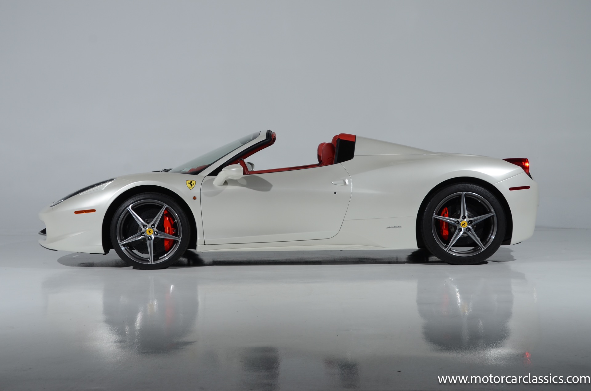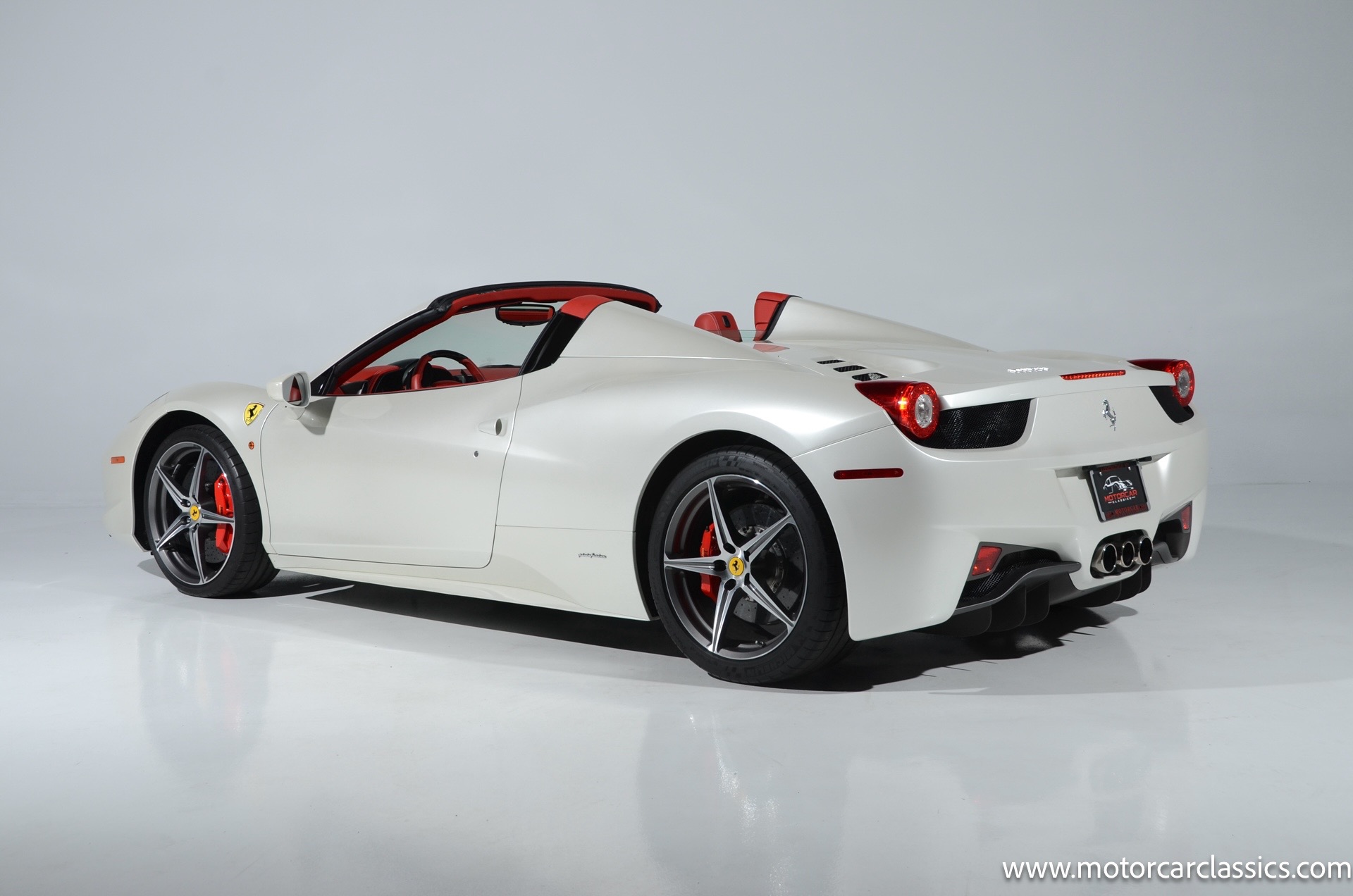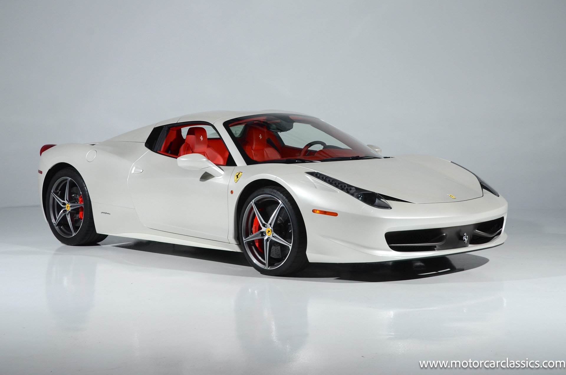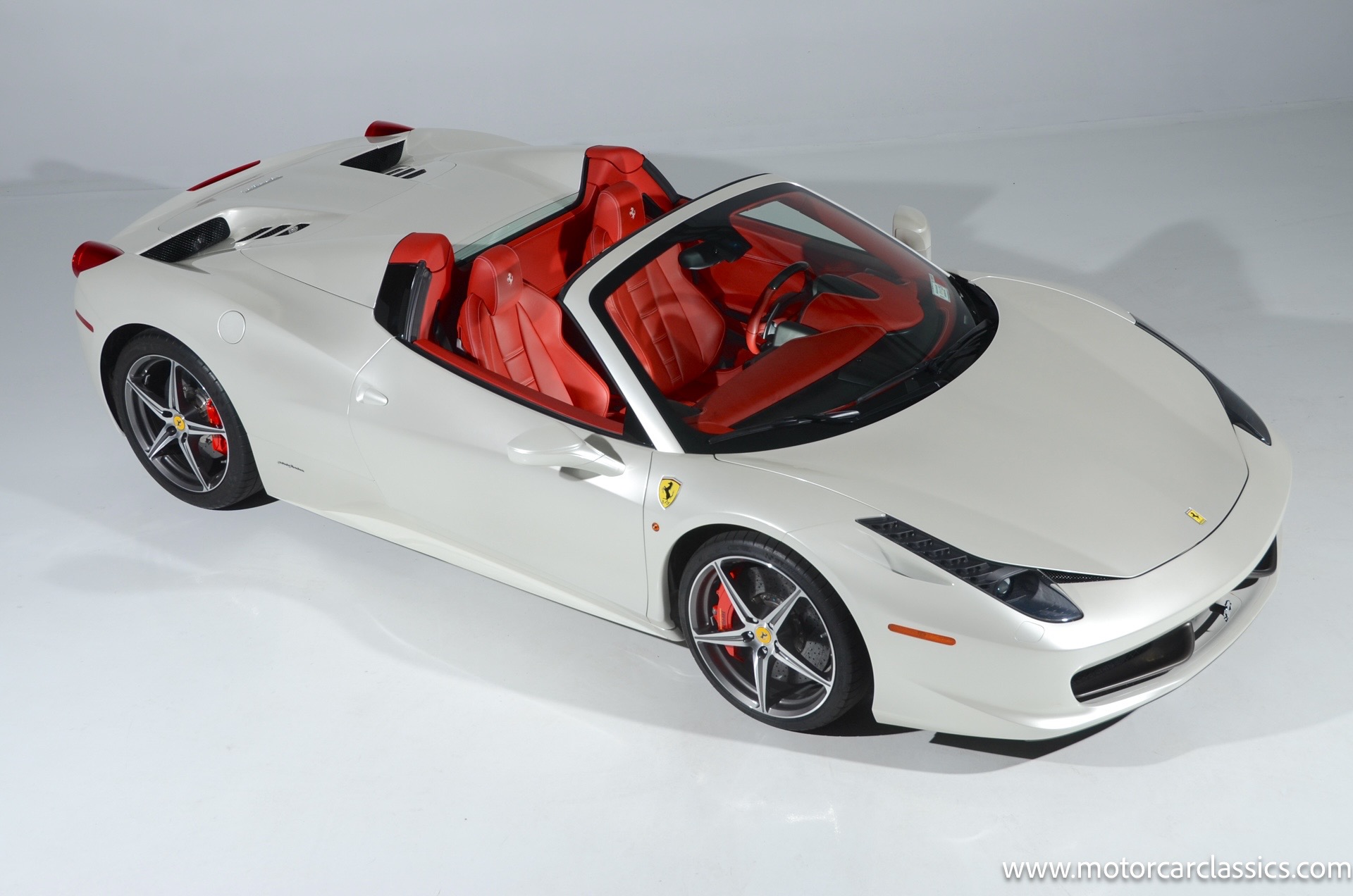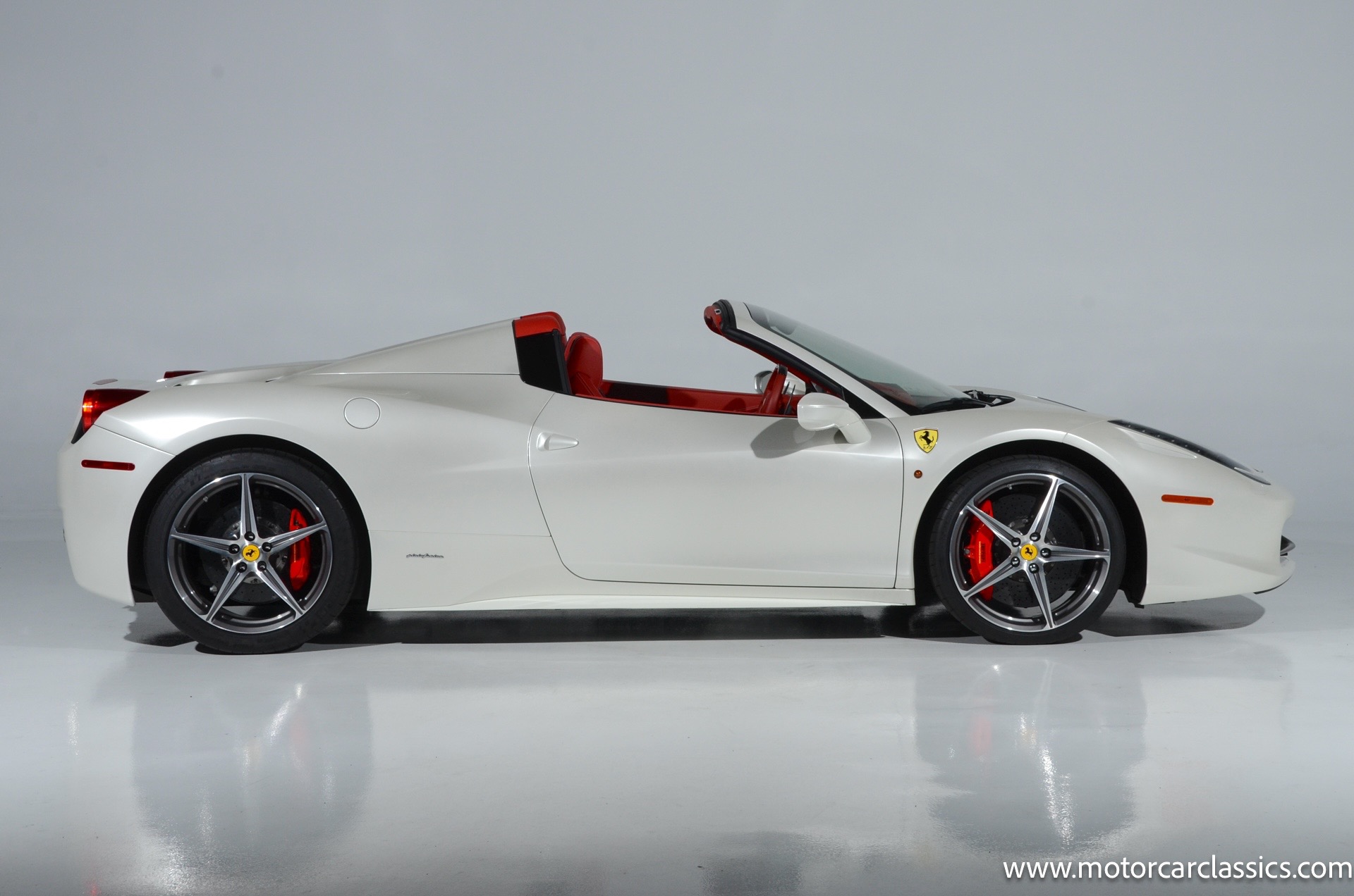 The 2013 Ferrari 458 Spider for sale! Motorcar Classics is pleased to offer this 458 Spider, a stunning example of Ferrari's engineering and design prowess. This particular model is finished in a rare and expensive Bianco Fuji (Pearl White) exterior, complemented by a luxurious Rosso (Red) interior. The car is powered by a 4.5-liter V8 engine that produces an impressive 570 horsepower at 9,000 rpm, allowing it to accelerate from 0 to 62 mph in just 3.4 seconds and reach a top speed of 202 mph