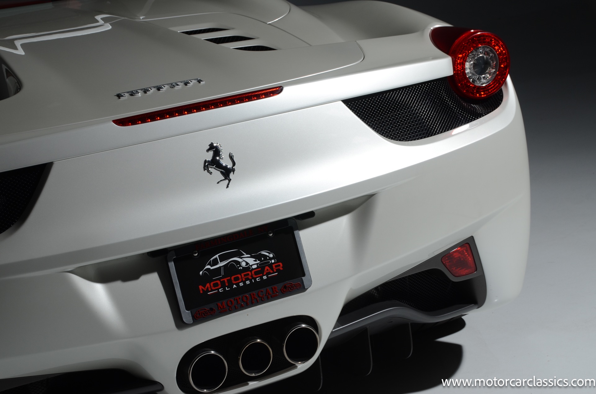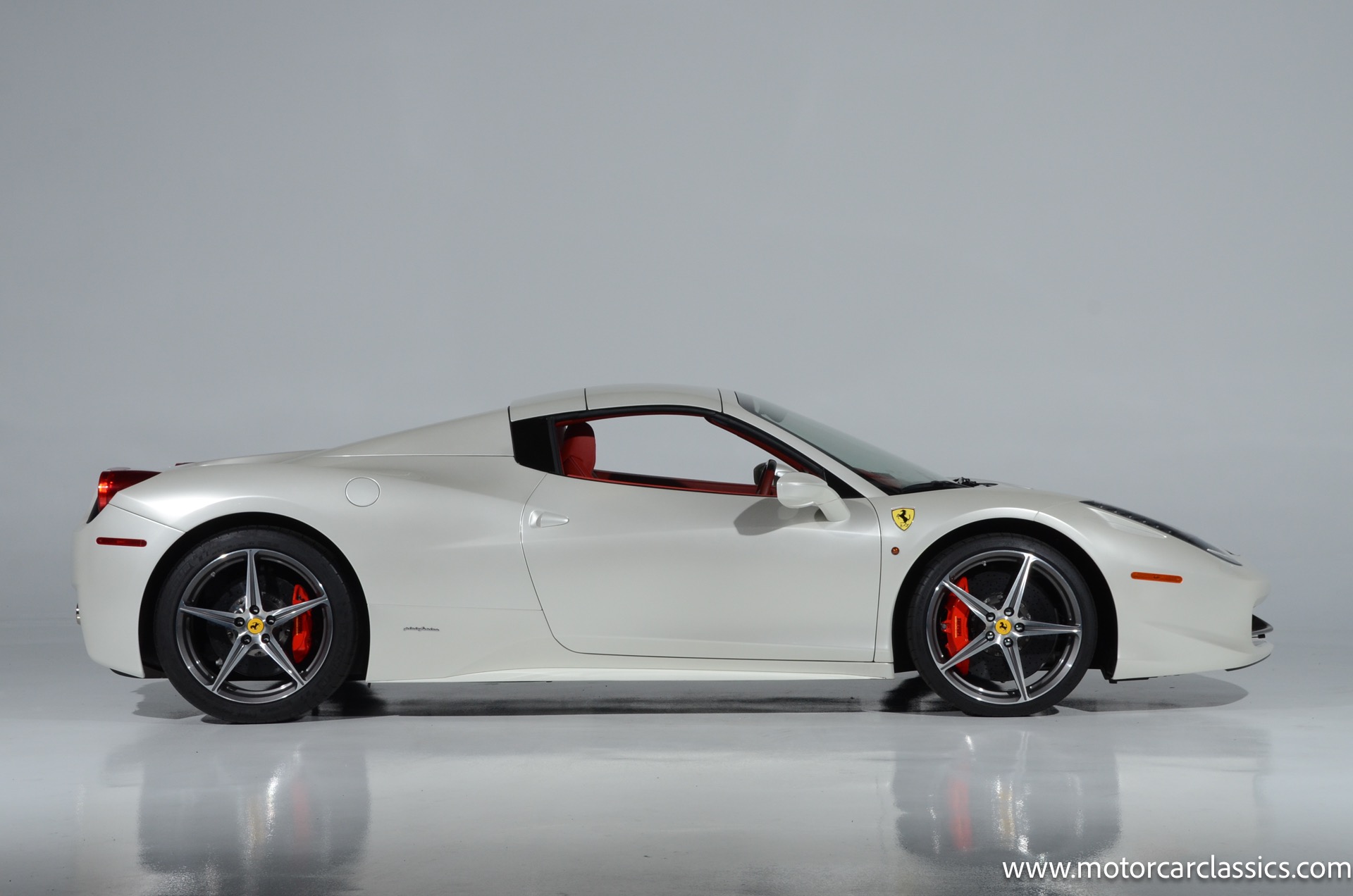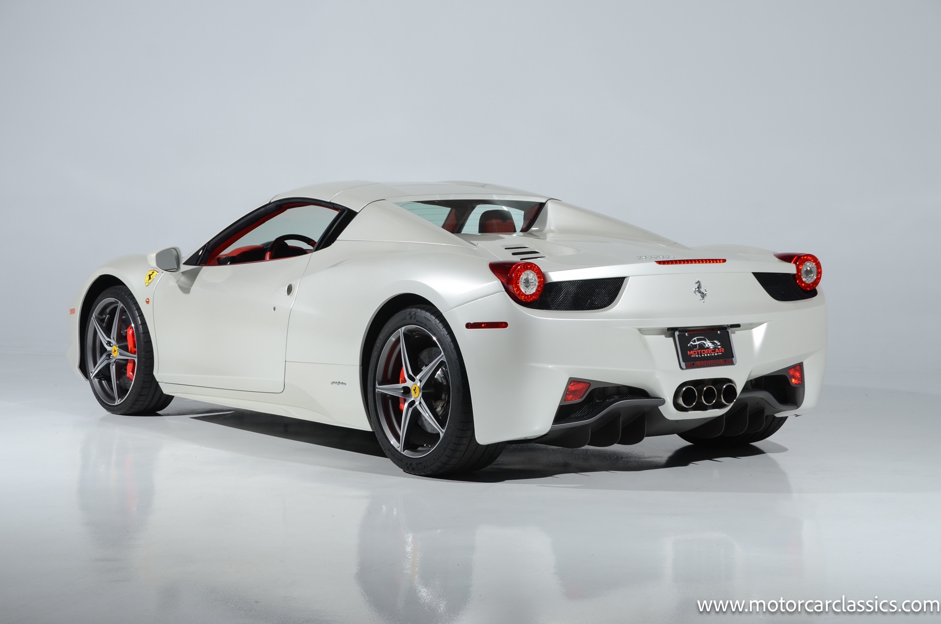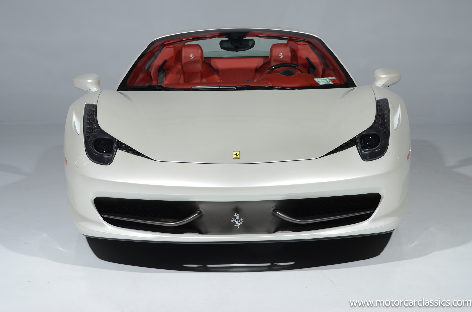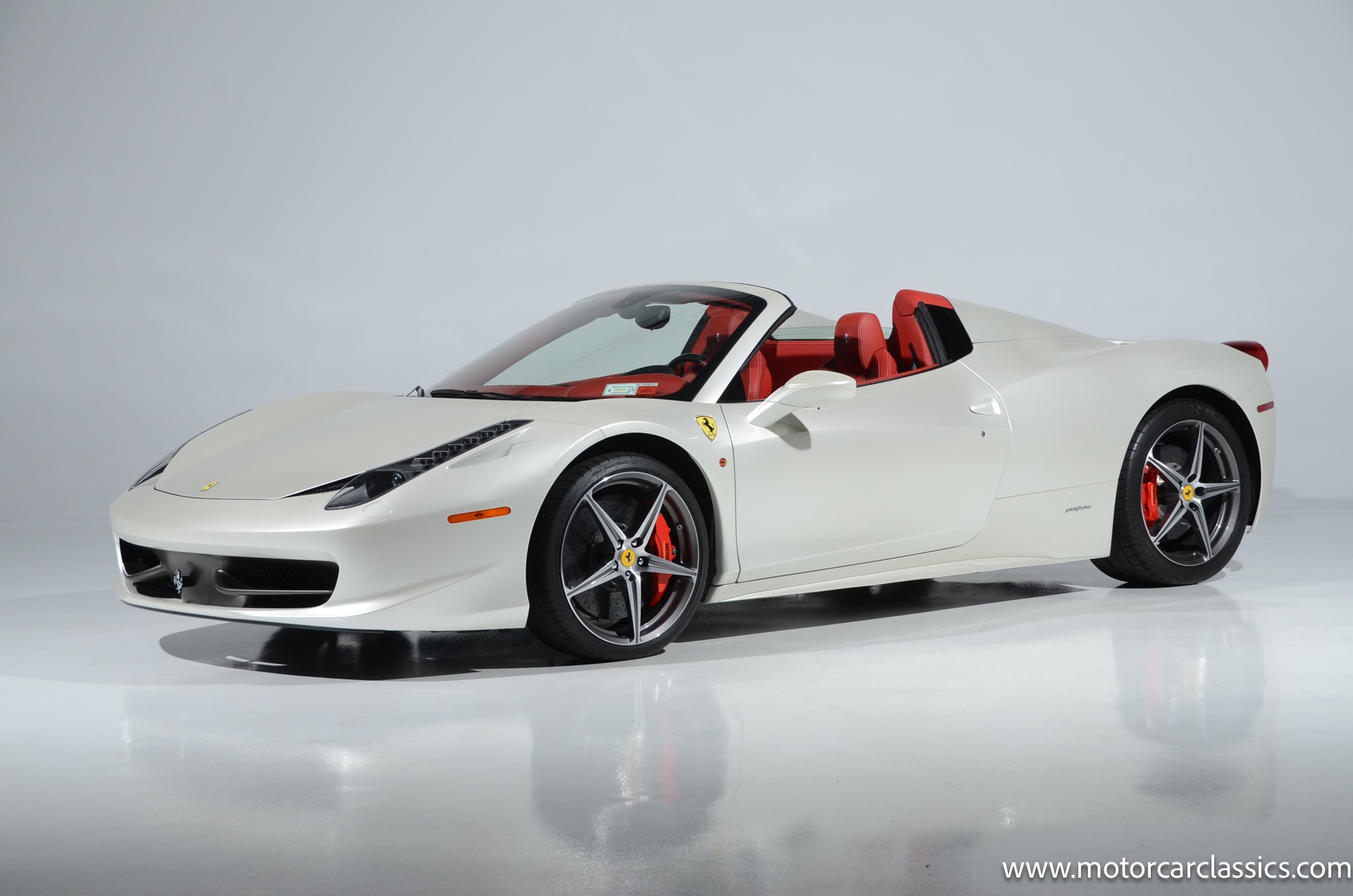 The 2013 Ferrari 458 Spider for sale! Motorcar Classics is pleased to offer this 458 Spider, a stunning example of Ferrari's engineering and design prowess. This particular model is finished in a rare and expensive Bianco Fuji (Pearl White) exterior, complemented by a luxurious Rosso (Red) interior. The car is powered by a 4.5-liter V8 engine that produces an impressive 570 horsepower at 9,000 rpm, allowing it to accelerate from 0 to 62 mph in just 3.4 seconds and reach a top speed of 202 mph