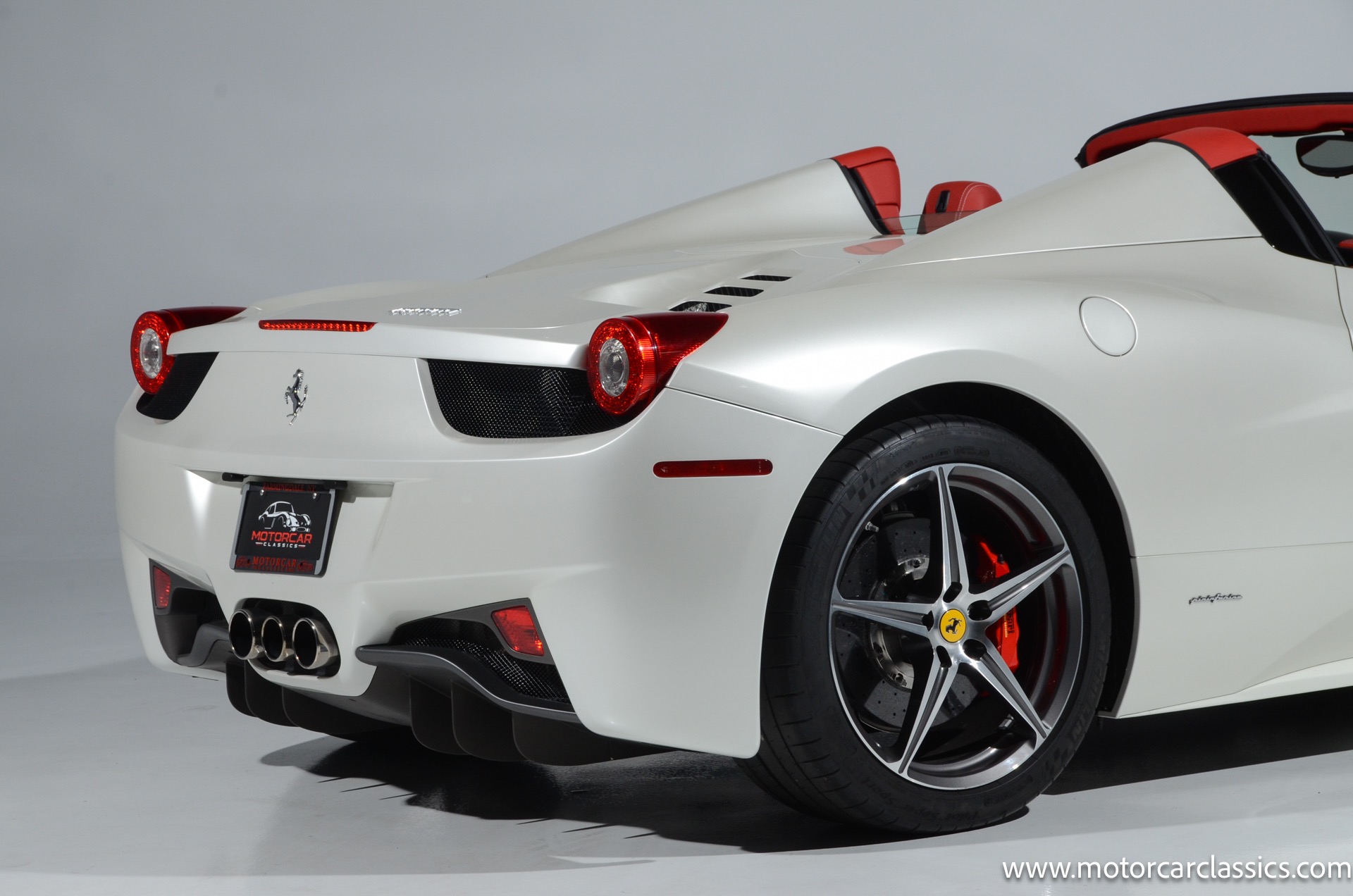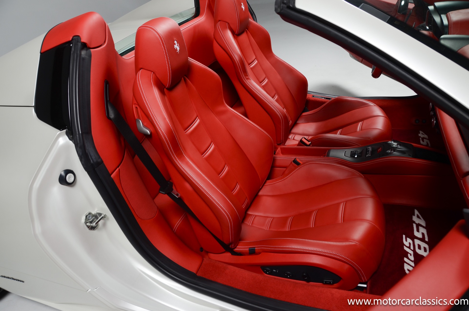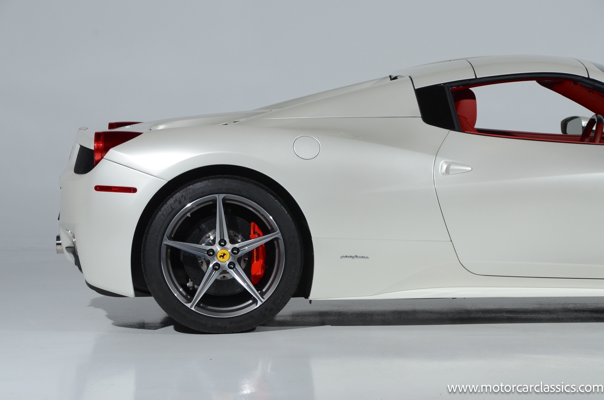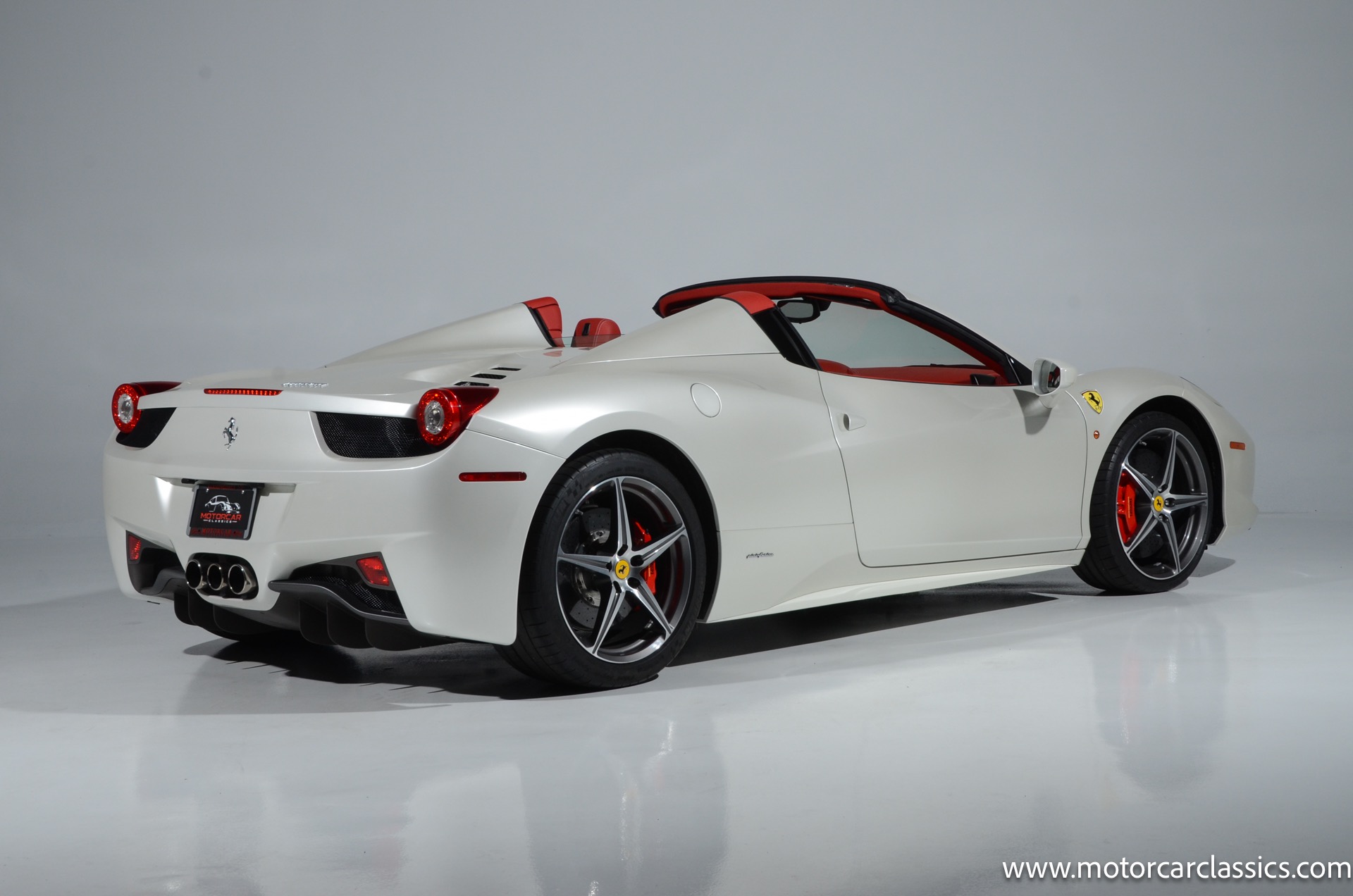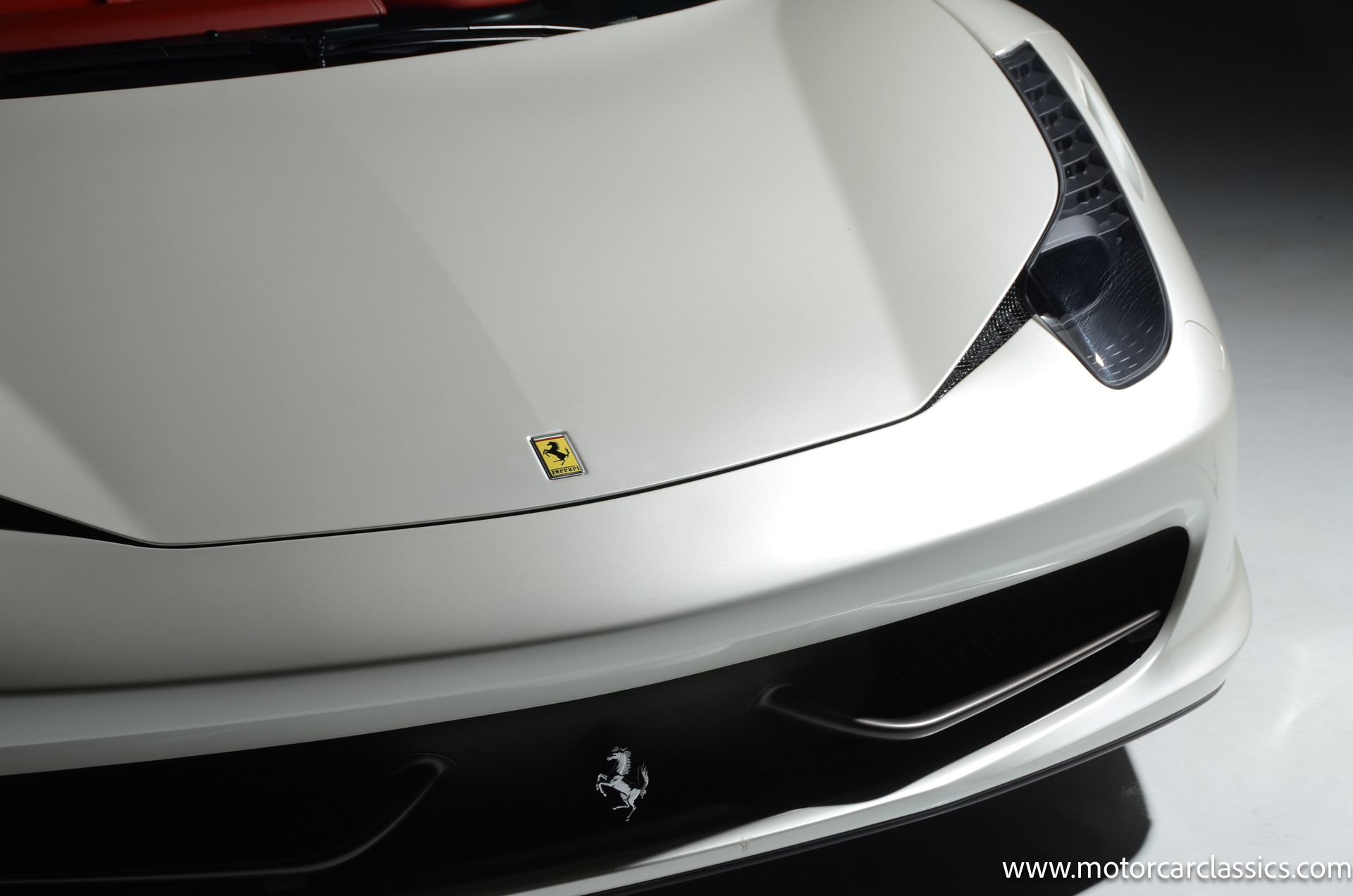 The 2013 Ferrari 458 Spider for sale! Motorcar Classics is pleased to offer this 458 Spider, a stunning example of Ferrari's engineering and design prowess. This particular model is finished in a rare and expensive Bianco Fuji (Pearl White) exterior, complemented by a luxurious Rosso (Red) interior. The car is powered by a 4.5-liter V8 engine that produces an impressive 570 horsepower at 9,000 rpm, allowing it to accelerate from 0 to 62 mph in just 3.4 seconds and reach a top speed of 202 mph