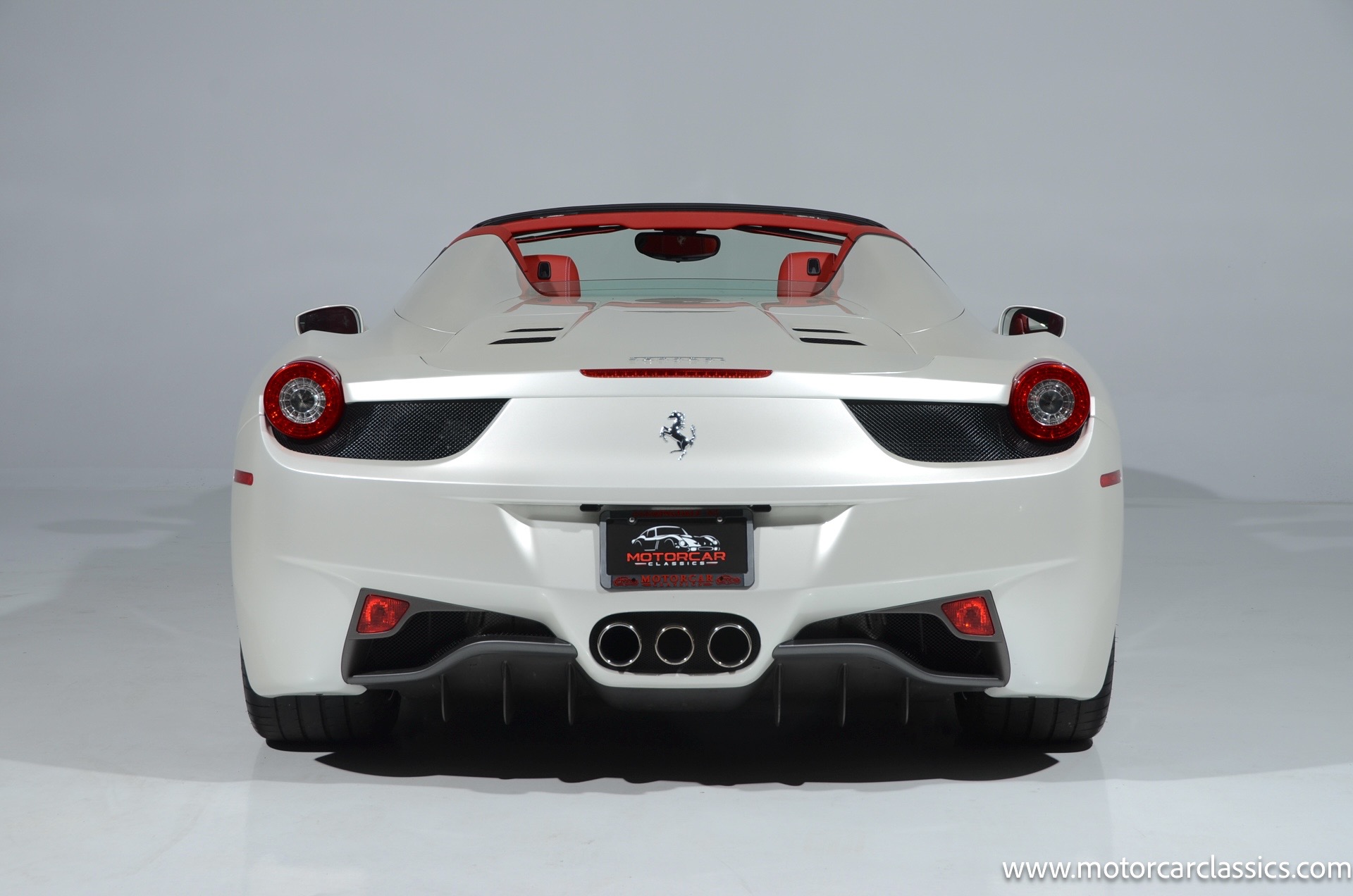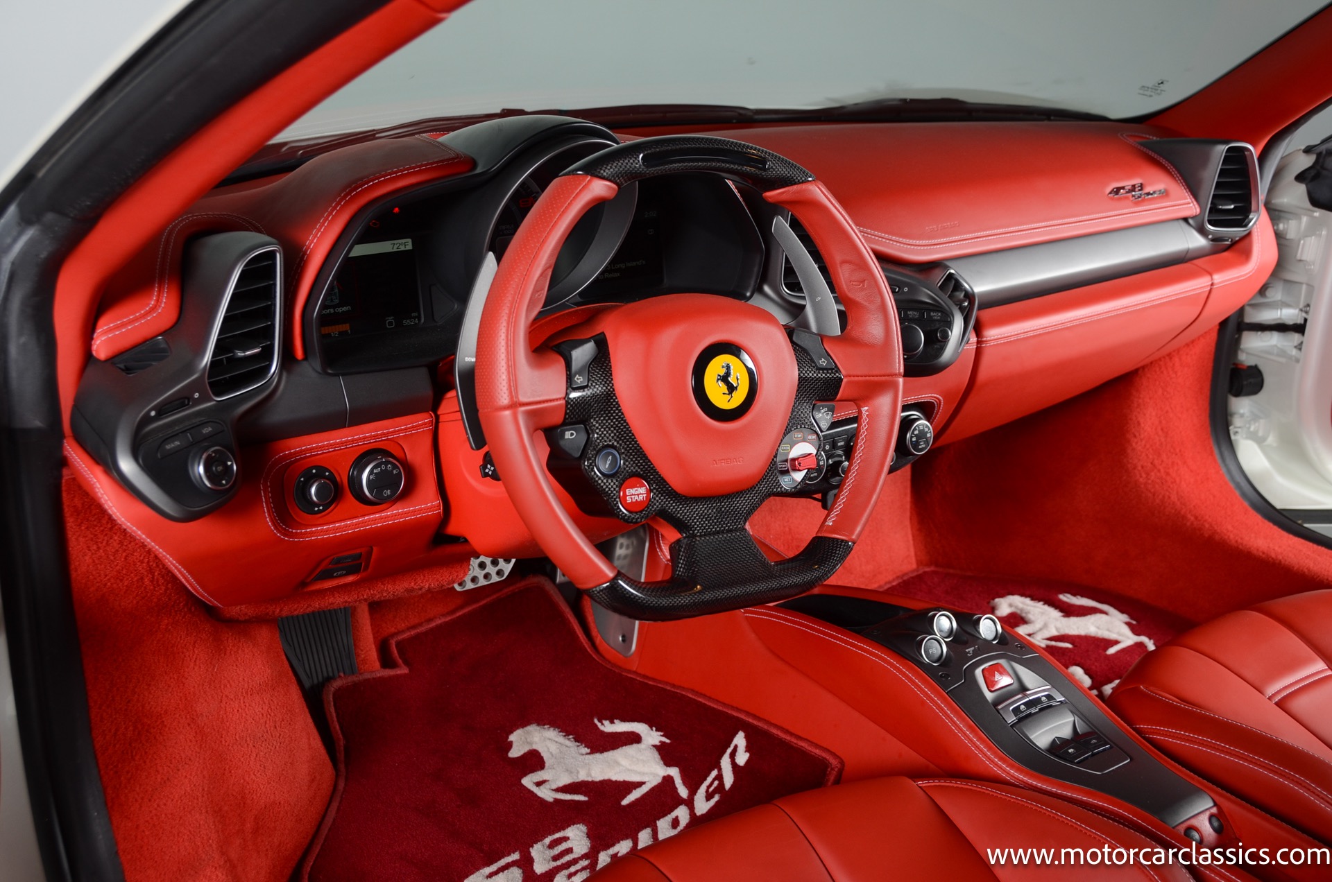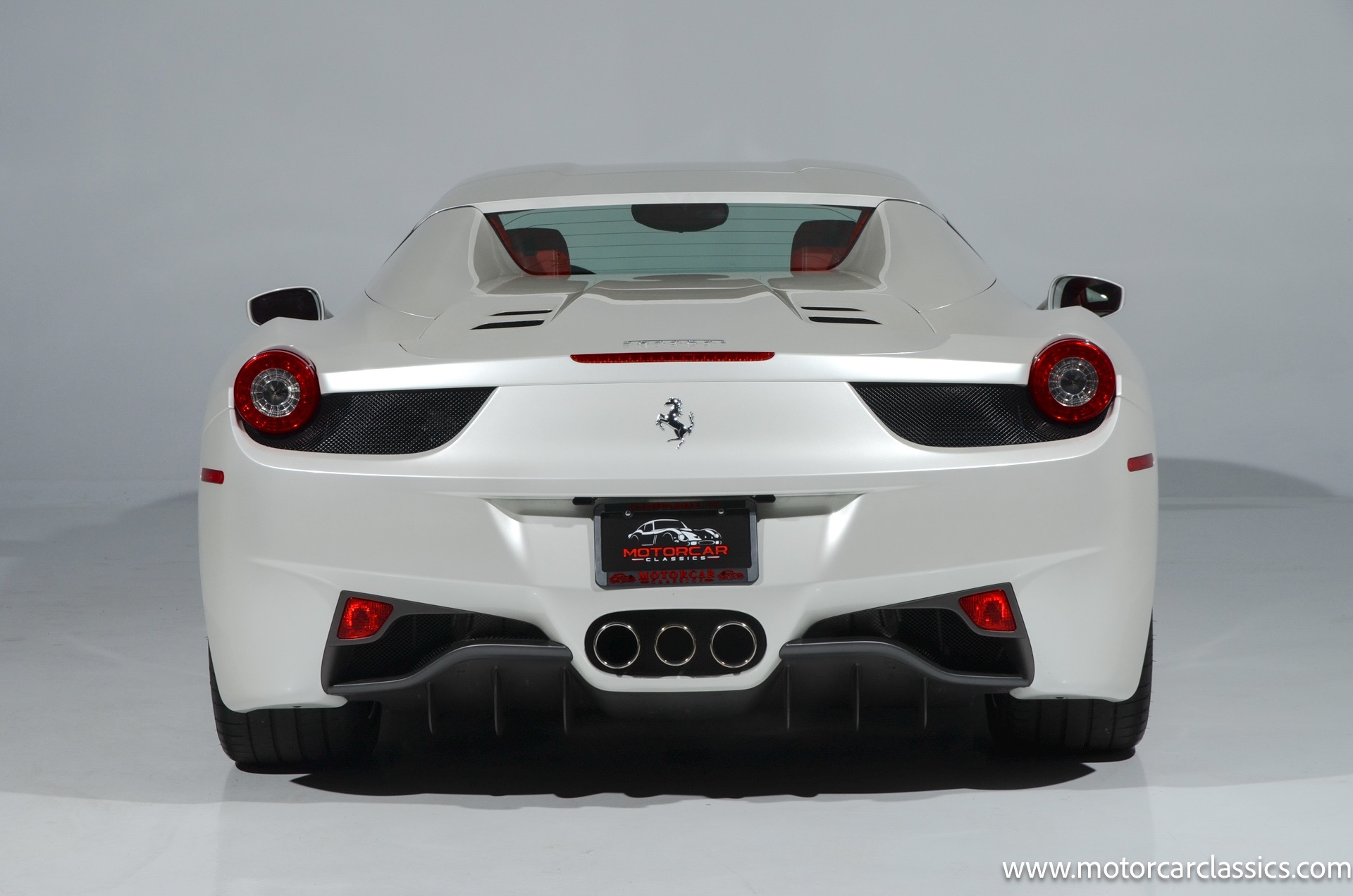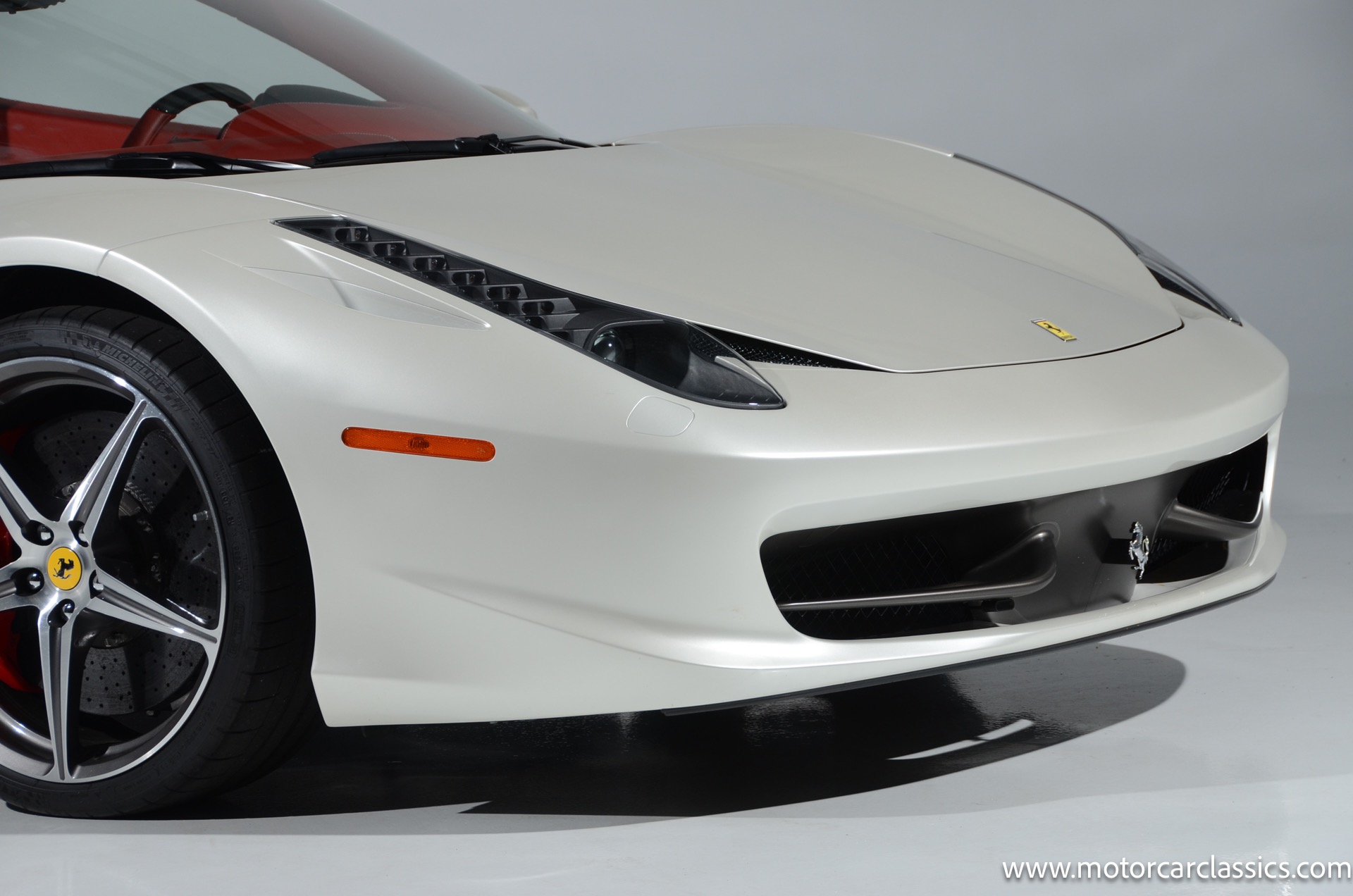 The 2013 Ferrari 458 Spider for sale! Motorcar Classics is pleased to offer this 458 Spider, a stunning example of Ferrari's engineering and design prowess. This particular model is finished in a rare and expensive Bianco Fuji (Pearl White) exterior, complemented by a luxurious Rosso (Red) interior. The car is powered by a 4.5-liter V8 engine that produces an impressive 570 horsepower at 9,000 rpm, allowing it to accelerate from 0 to 62 mph in just 3.4 seconds and reach a top speed of 202 mph