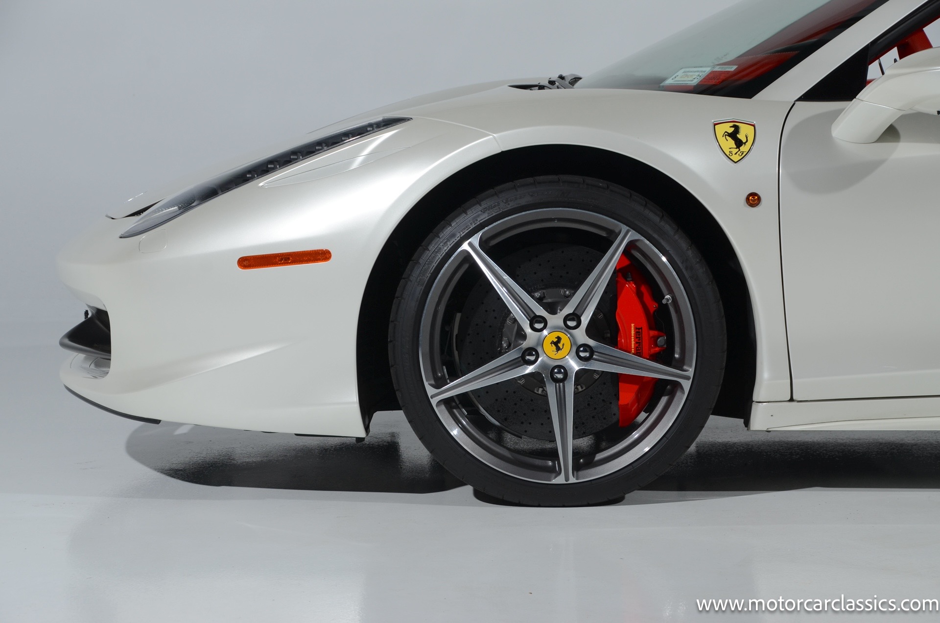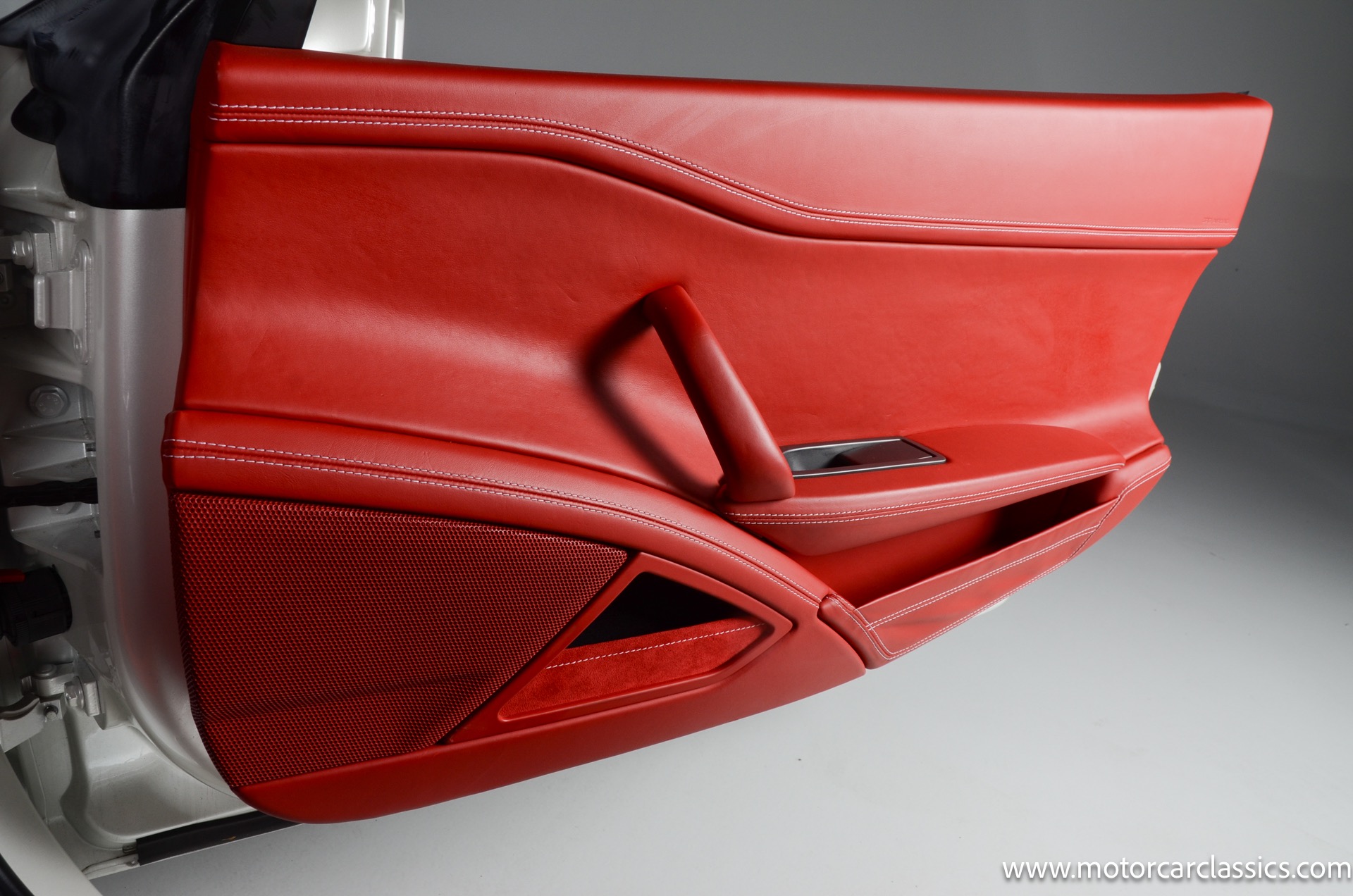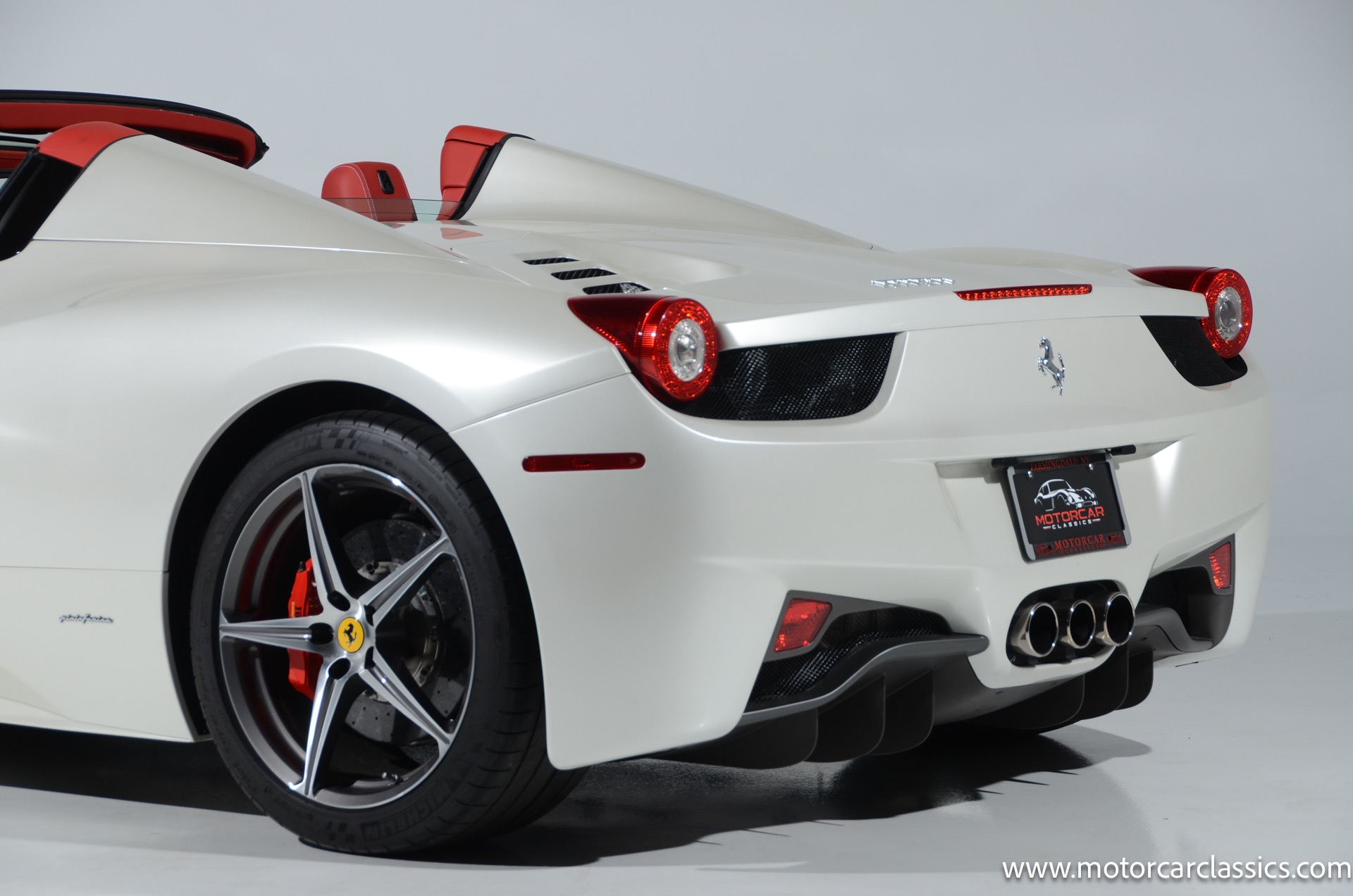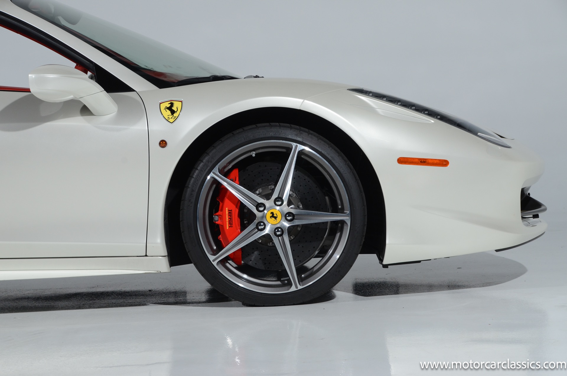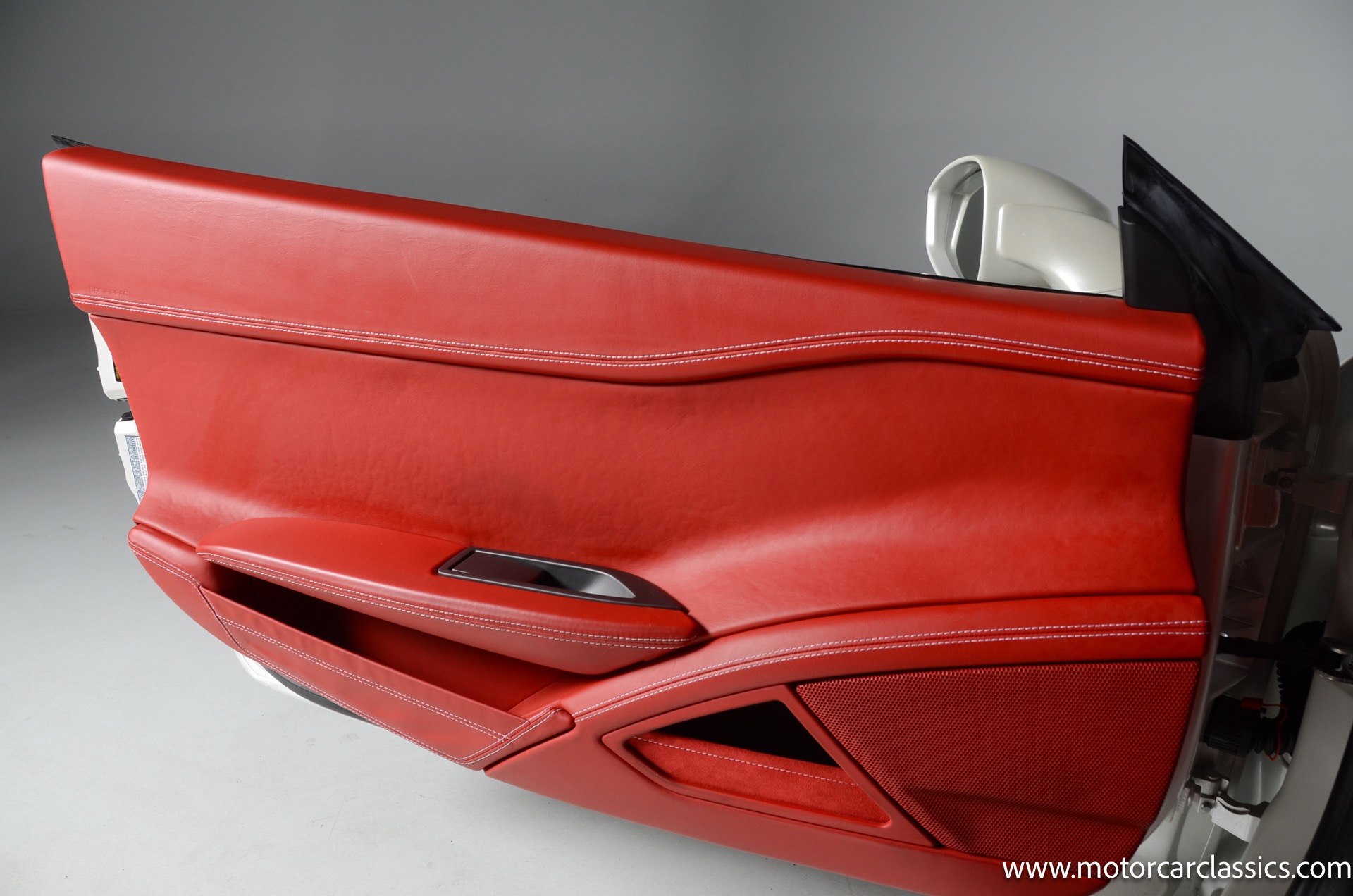 The 2013 Ferrari 458 Spider for sale! Motorcar Classics is pleased to offer this 458 Spider, a stunning example of Ferrari's engineering and design prowess. This particular model is finished in a rare and expensive Bianco Fuji (Pearl White) exterior, complemented by a luxurious Rosso (Red) interior. The car is powered by a 4.5-liter V8 engine that produces an impressive 570 horsepower at 9,000 rpm, allowing it to accelerate from 0 to 62 mph in just 3.4 seconds and reach a top speed of 202 mph