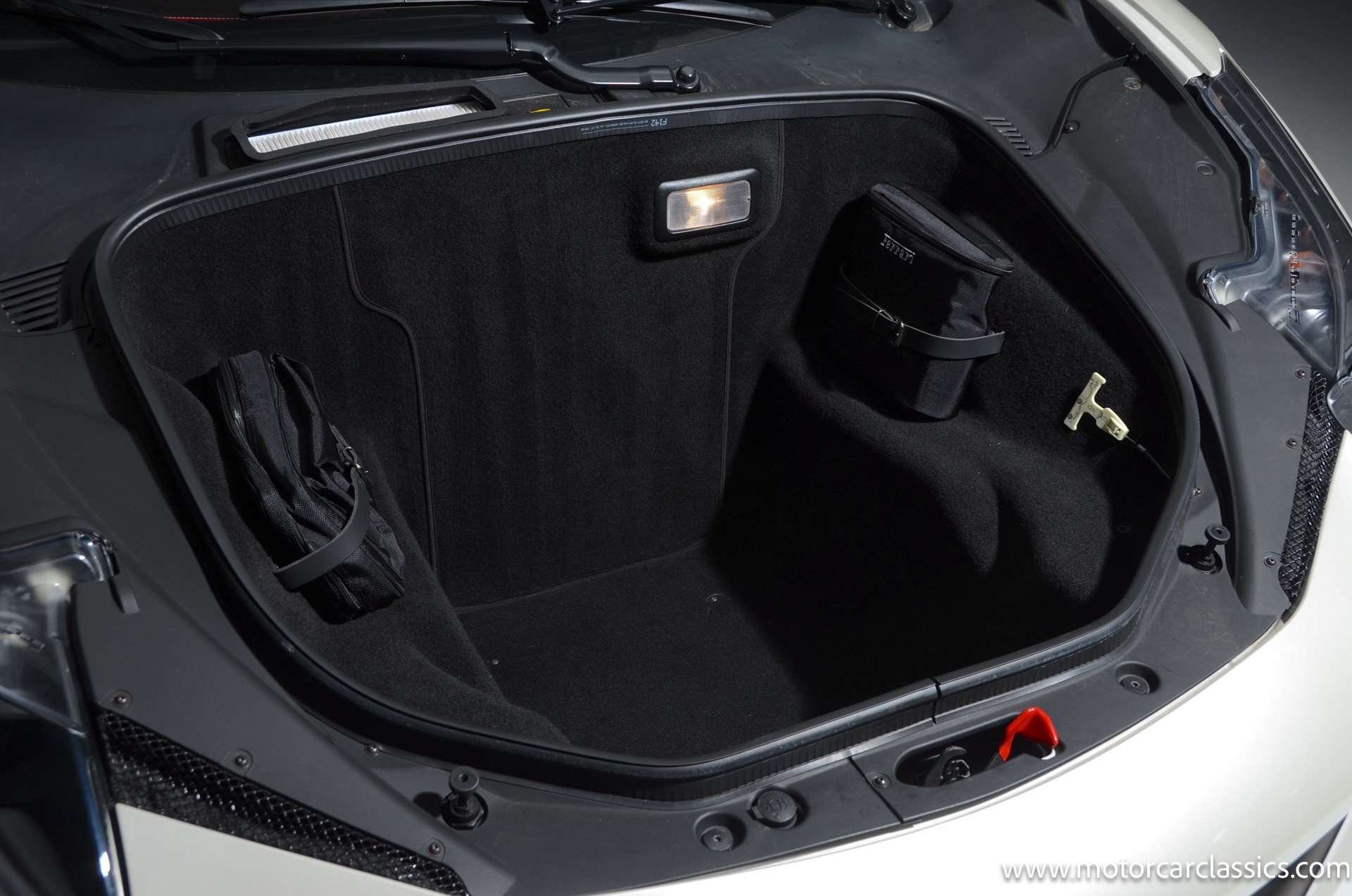 This 458 Spider is equipped with a range of high-end options and features that enhance both its performance and comfort. Notable options include the AFS (Adaptive Front Lighting System), Rosso Scuderia brake calipers, leather lower and central tunnels, a colored upper dashboard, and front dashboard trim. The car also features a suspension lifter, the iconic 'Scuderia Ferrari' shields, 20" forged diamond rims, full electric seats, and a leather headliner. Additional special features include colored standard stitching, a colored steering wheel, and tire pressure measurement.