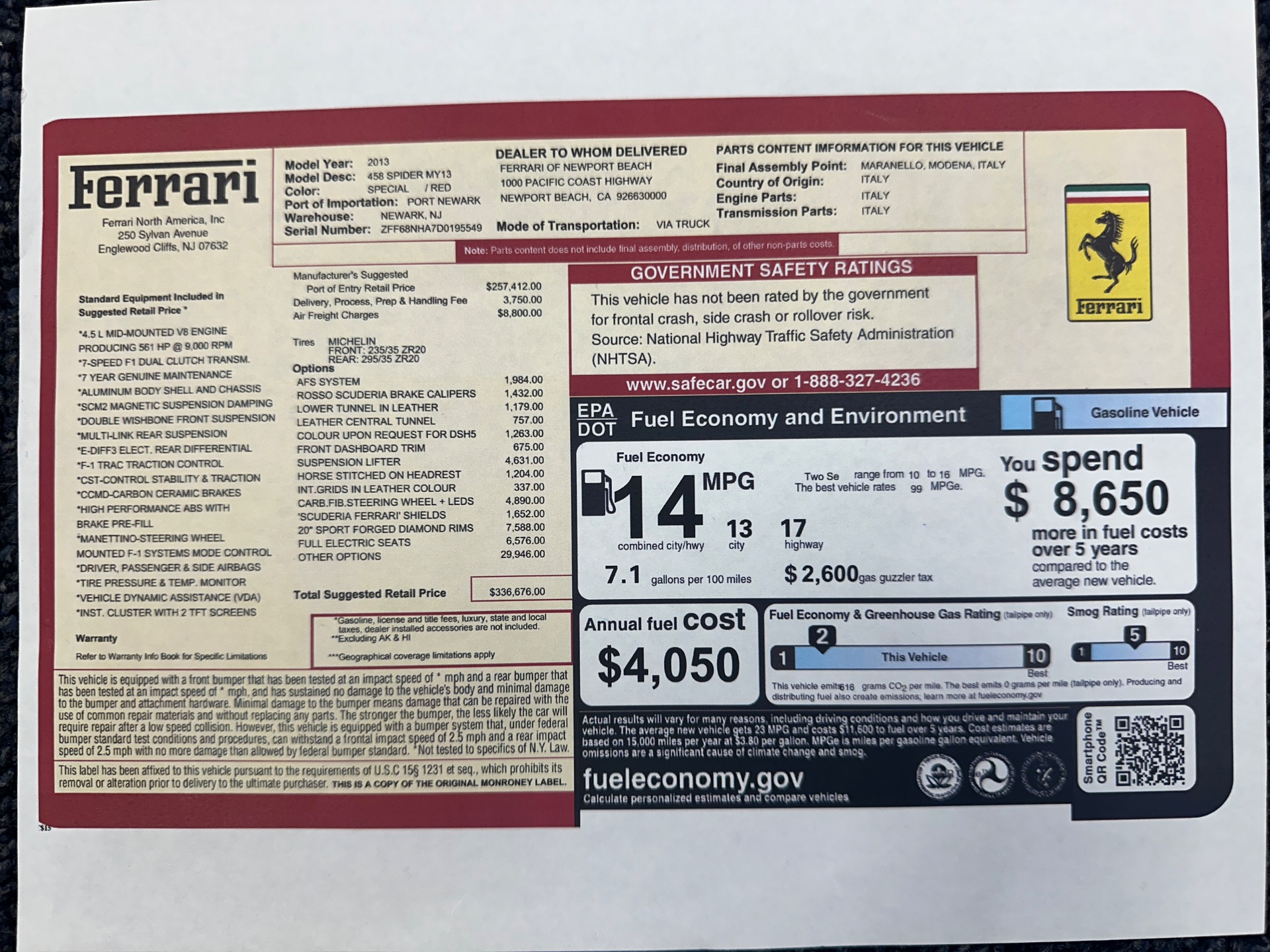 With only 5,500 miles on the odometer, this 2013 Ferrari 458 Spider is in pristine condition, showing like brand new with all original paint and full PPF protection . It comes with a car cover, two keys with remotes, owner's manuals, and tools. This vehicle is a perfect blend of performance, luxury, and exclusivity, making it a highly desirable option for any car enthusiast or collector. Yor inspections is invited!