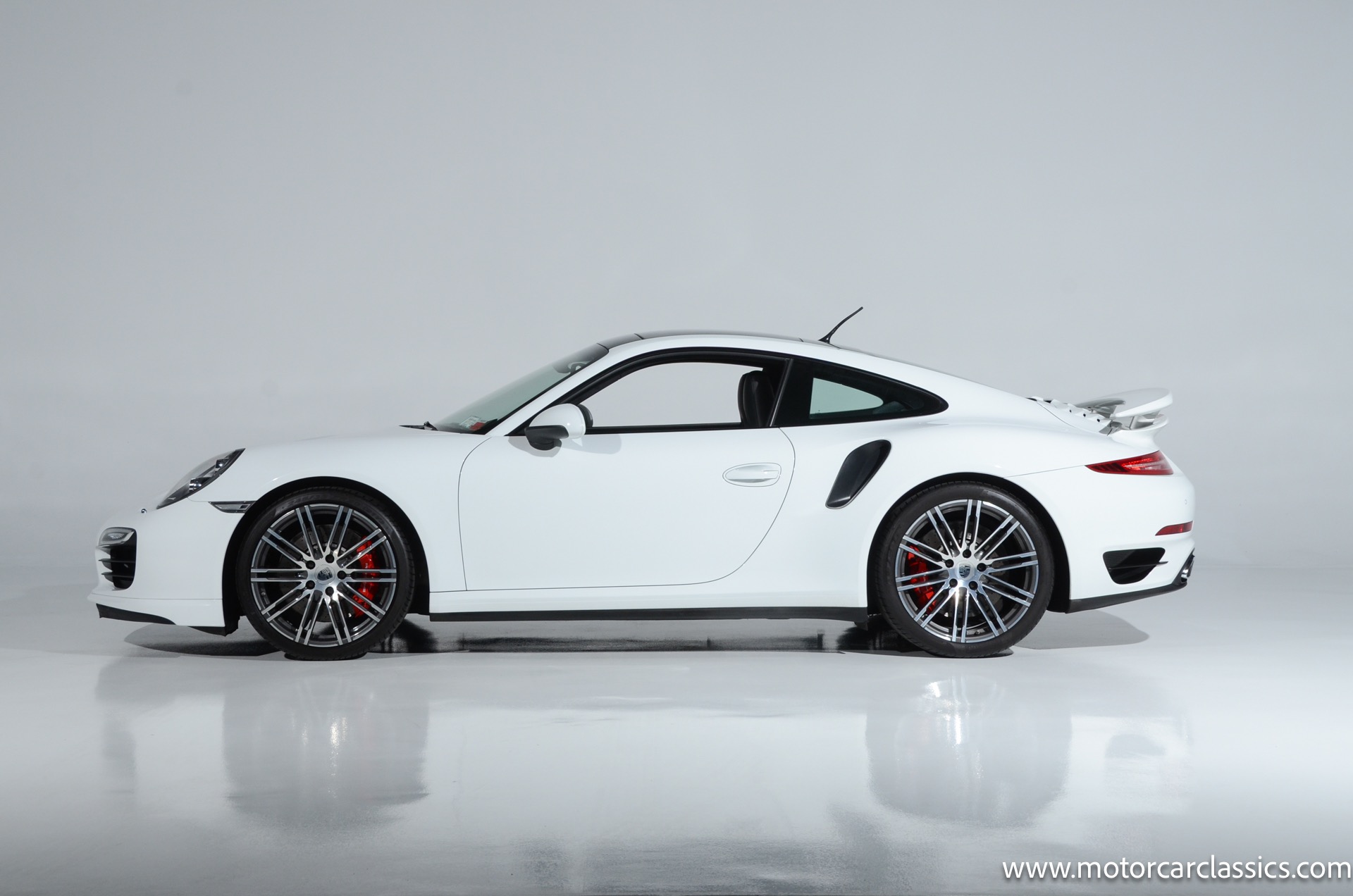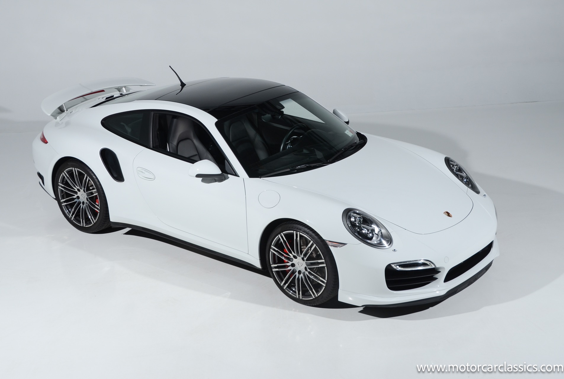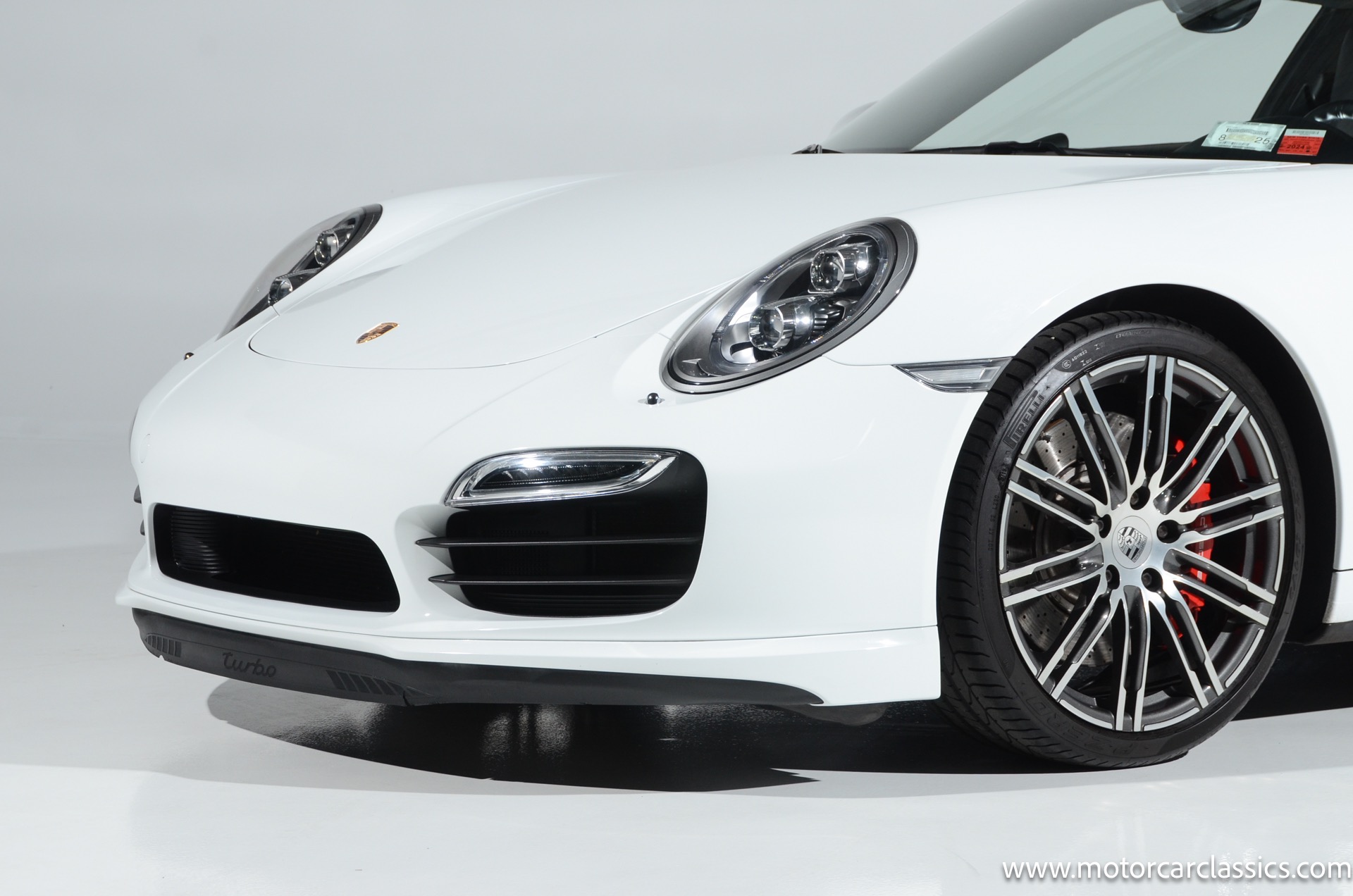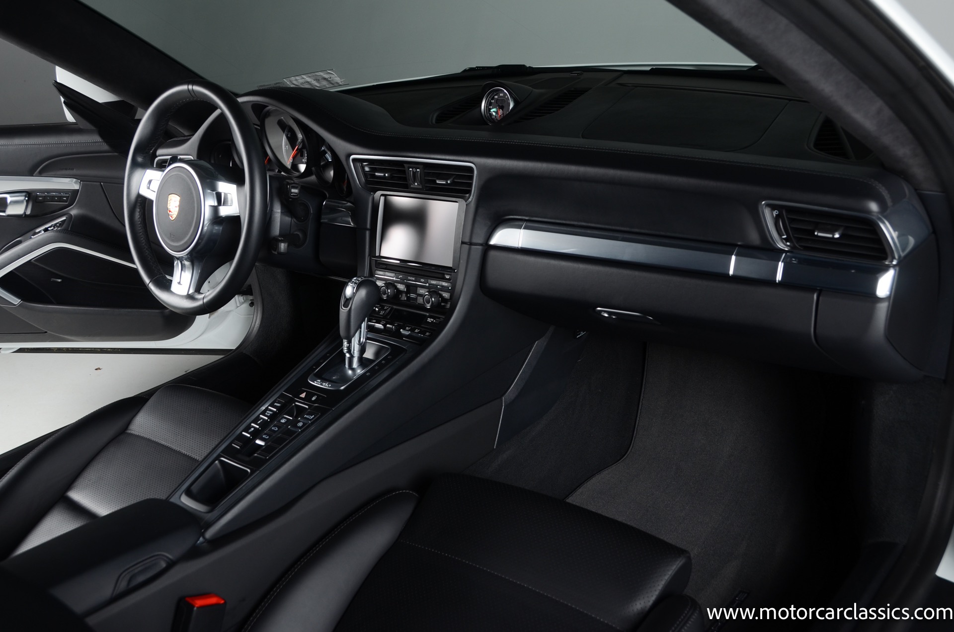 2014 Porsche 911 Turbo for sale! Motorcar Classics is proud to present this stunning 2014 Porsche 911 Turbo. It is a two-owner car that has been meticulously dealer-serviced and has covered just about 38K miles. With an MSRP of $157,715.00, this 2014 Turbo features a striking White exterior paired with a sophisticated Black leather interior. The car is equipped with Full LED headlights, including the Porsche Dynamic Light System Plus (PDLS +), which ensures superior illumination and adaptive lighting functionality. Inside, the cabin is adorned with premium Black leather and features the Ornamental Porsche Crest on the headrests, adding a touch of exclusivity. The Electric Slide/Tilt Sunroof in Glass allows natural light to enhance the driving experience. Performance-wise, the 911 Turbo is powered by a twin-turbo 3.8-liter flat-six engine that produces 520 horsepower and 487 lb-ft of torque, enabling it to accelerate from 0 to 60 mph in just 3.2 seconds. The inclusion of the Sport Chrono Package further enhances the car's dynamic capabilities, making it even more exhilarating to drive. This 2014 Porsche 911 Turbo offers an unmatched combination of performance, luxury, and advanced technology, making it a true masterpiece for the discerning automotive enthusiast.