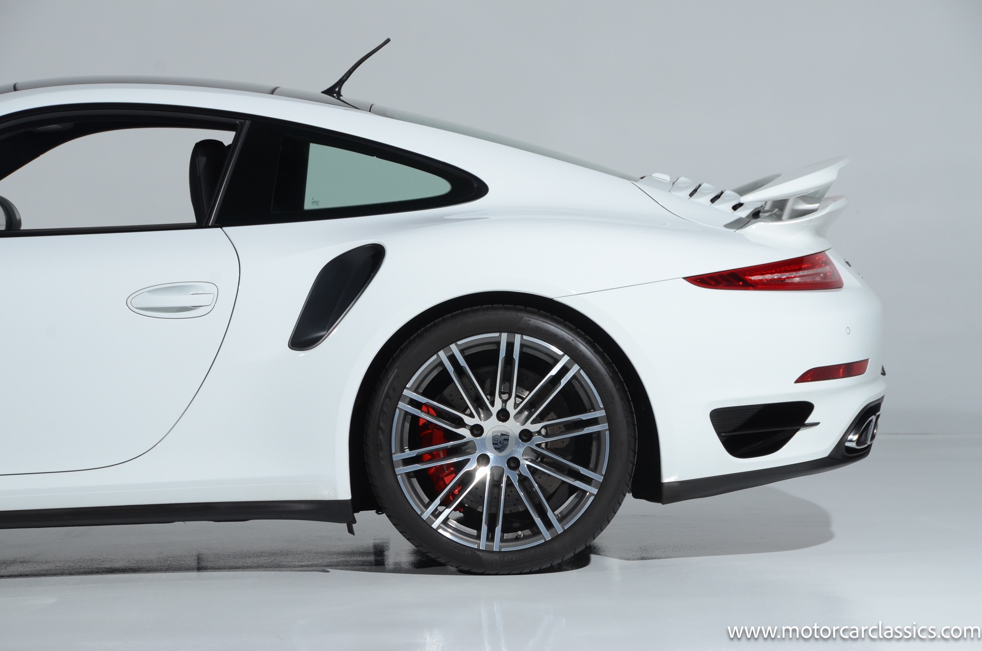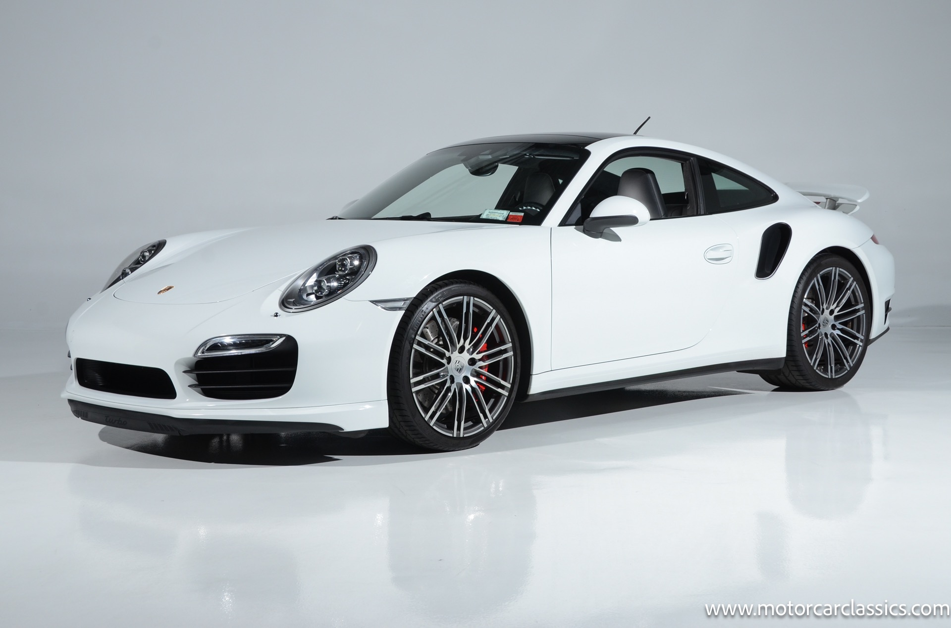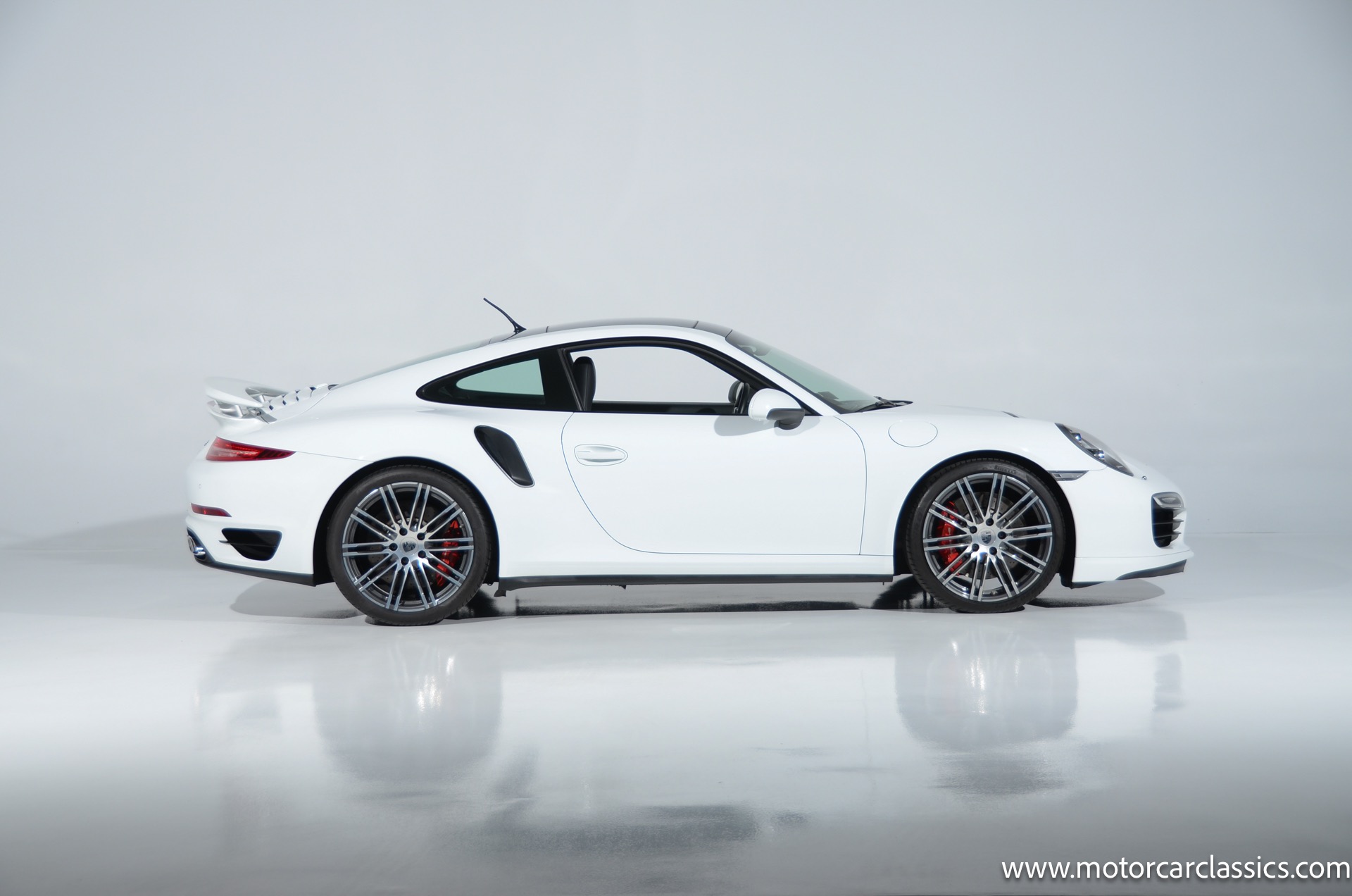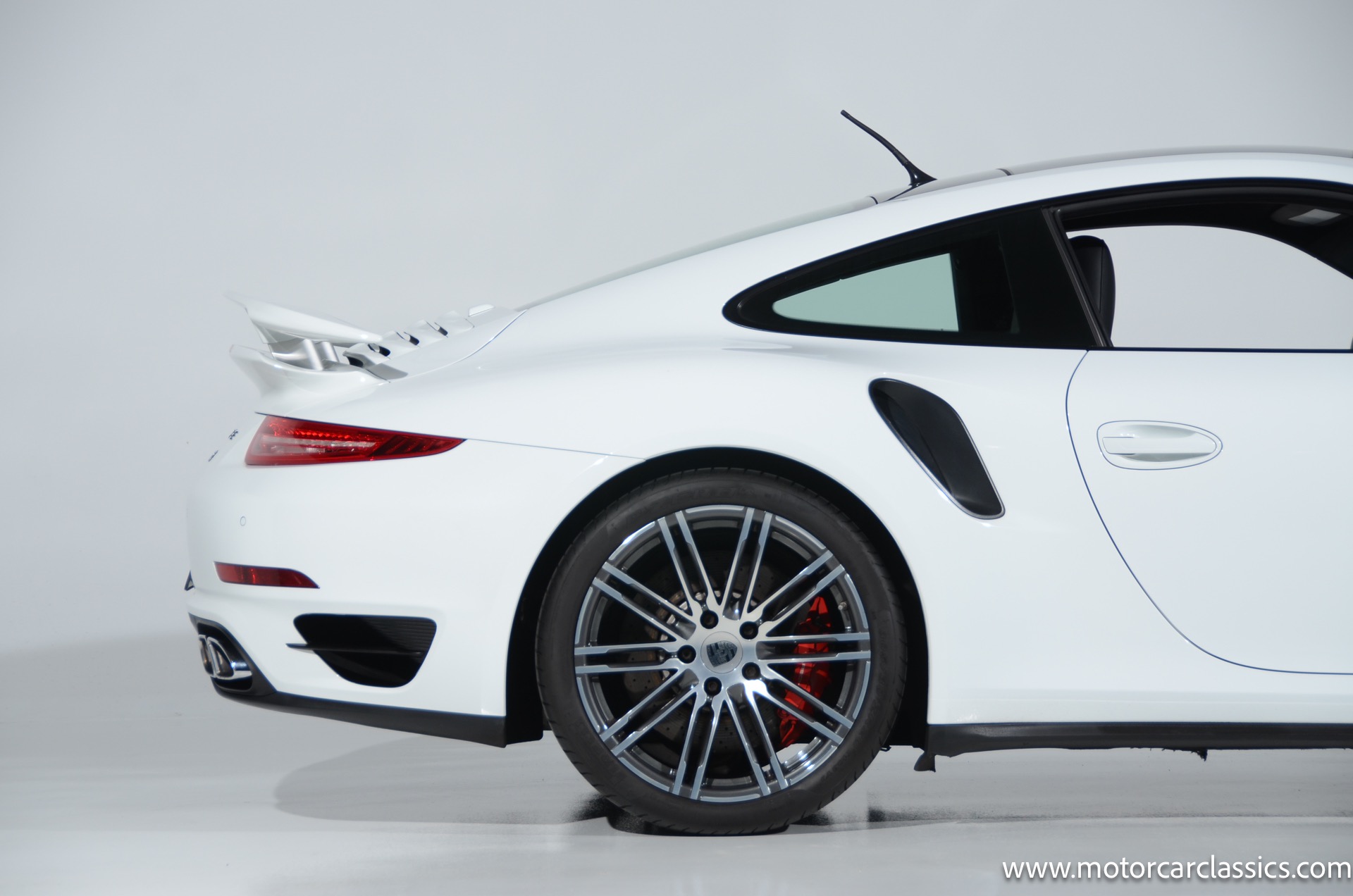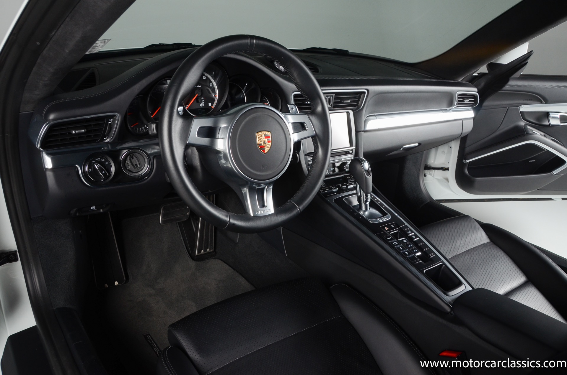 2014 Porsche 911 Turbo for sale! Motorcar Classics is proud to present this stunning 2014 Porsche 911 Turbo. It is a two-owner car that has been meticulously dealer-serviced and has covered just about 38K miles. With an MSRP of $157,715.00, this 2014 Turbo features a striking White exterior paired with a sophisticated Black leather interior. The car is equipped with Full LED headlights, including the Porsche Dynamic Light System Plus (PDLS +), which ensures superior illumination and adaptive lighting functionality. Inside, the cabin is adorned with premium Black leather and features the Ornamental Porsche Crest on the headrests, adding a touch of exclusivity. The Electric Slide/Tilt Sunroof in Glass allows natural light to enhance the driving experience. Performance-wise, the 911 Turbo is powered by a twin-turbo 3.8-liter flat-six engine that produces 520 horsepower and 487 lb-ft of torque, enabling it to accelerate from 0 to 60 mph in just 3.2 seconds. The inclusion of the Sport Chrono Package further enhances the car's dynamic capabilities, making it even more exhilarating to drive. This 2014 Porsche 911 Turbo offers an unmatched combination of performance, luxury, and advanced technology, making it a true masterpiece for the discerning automotive enthusiast.