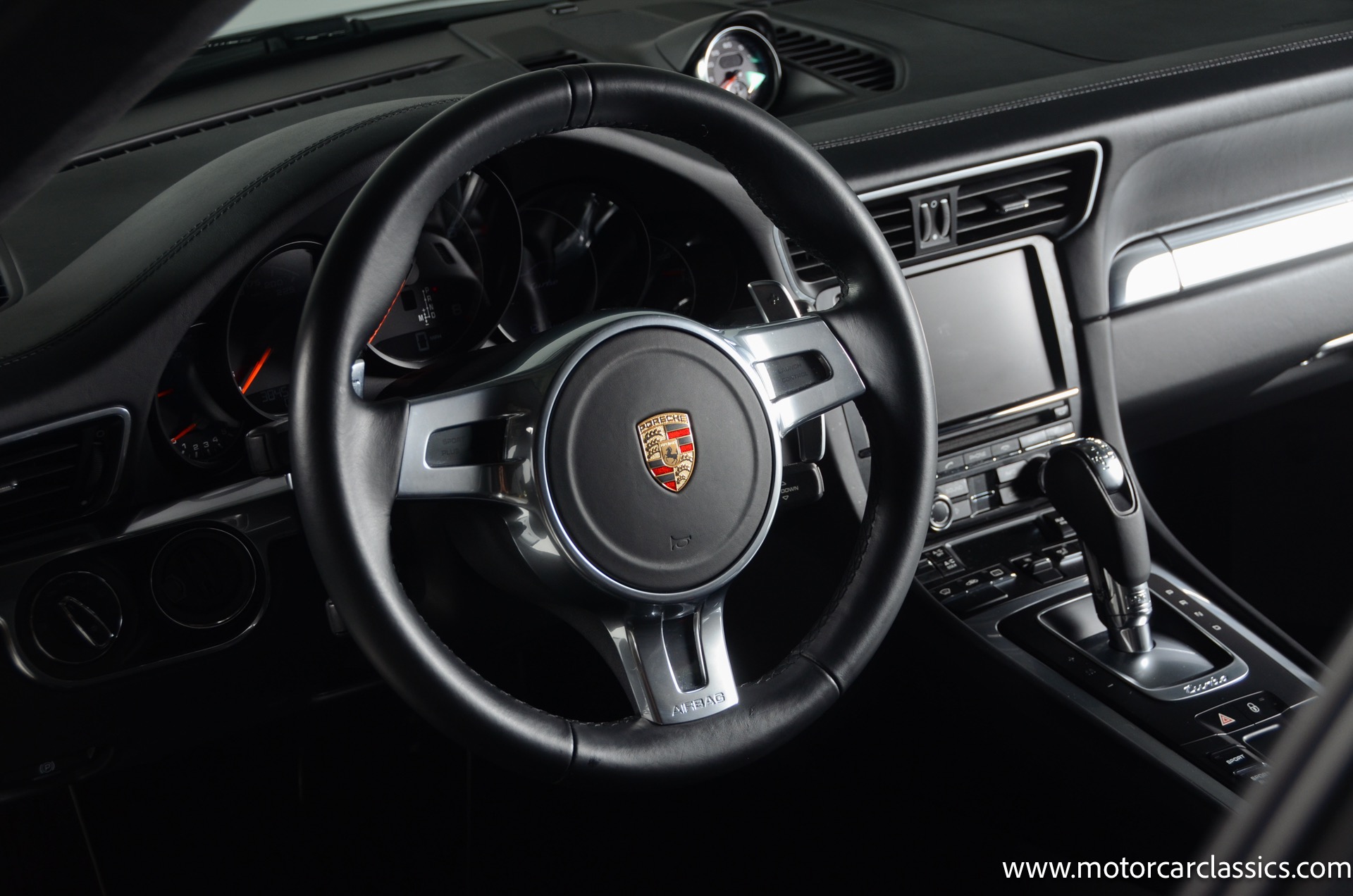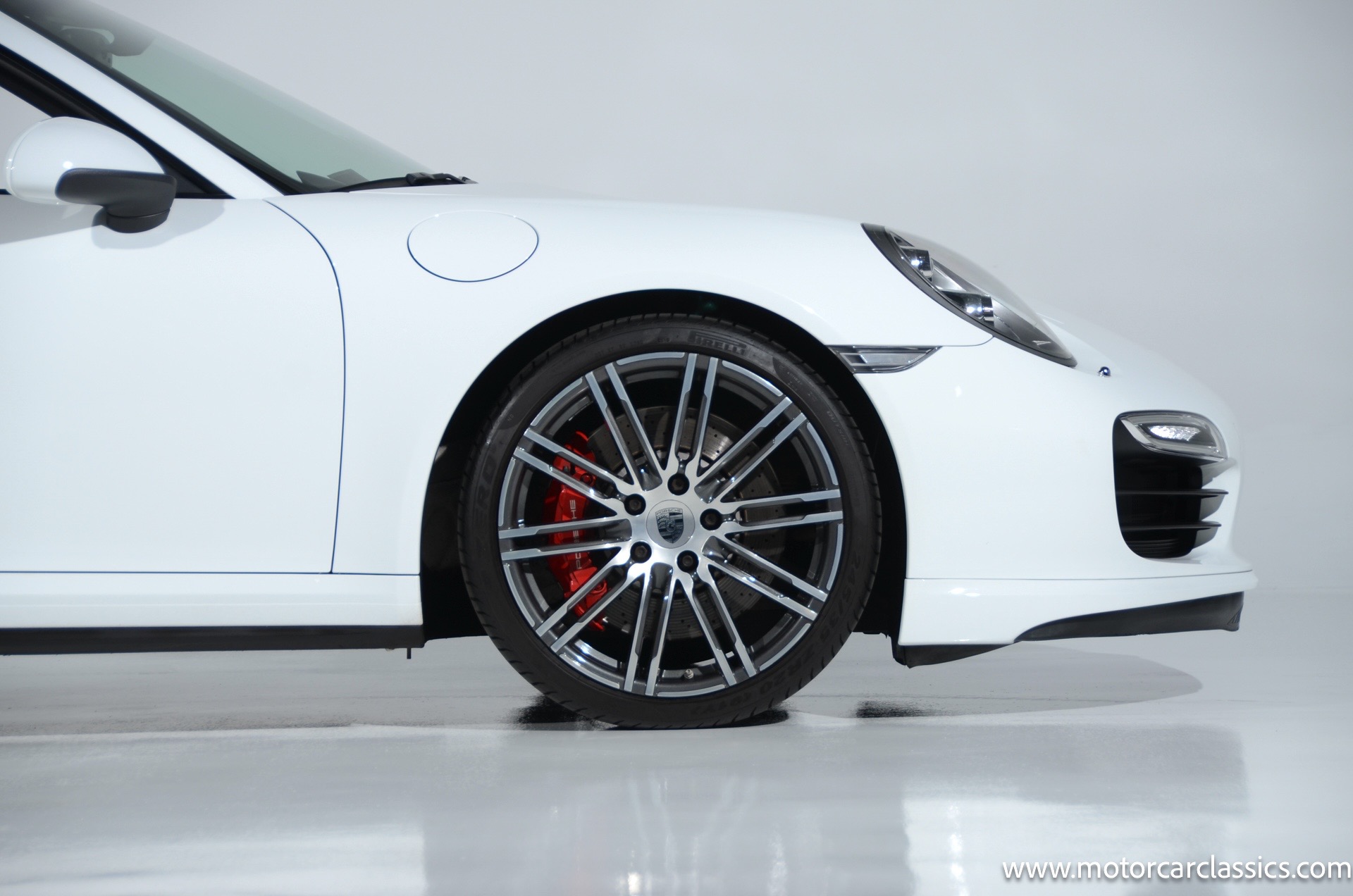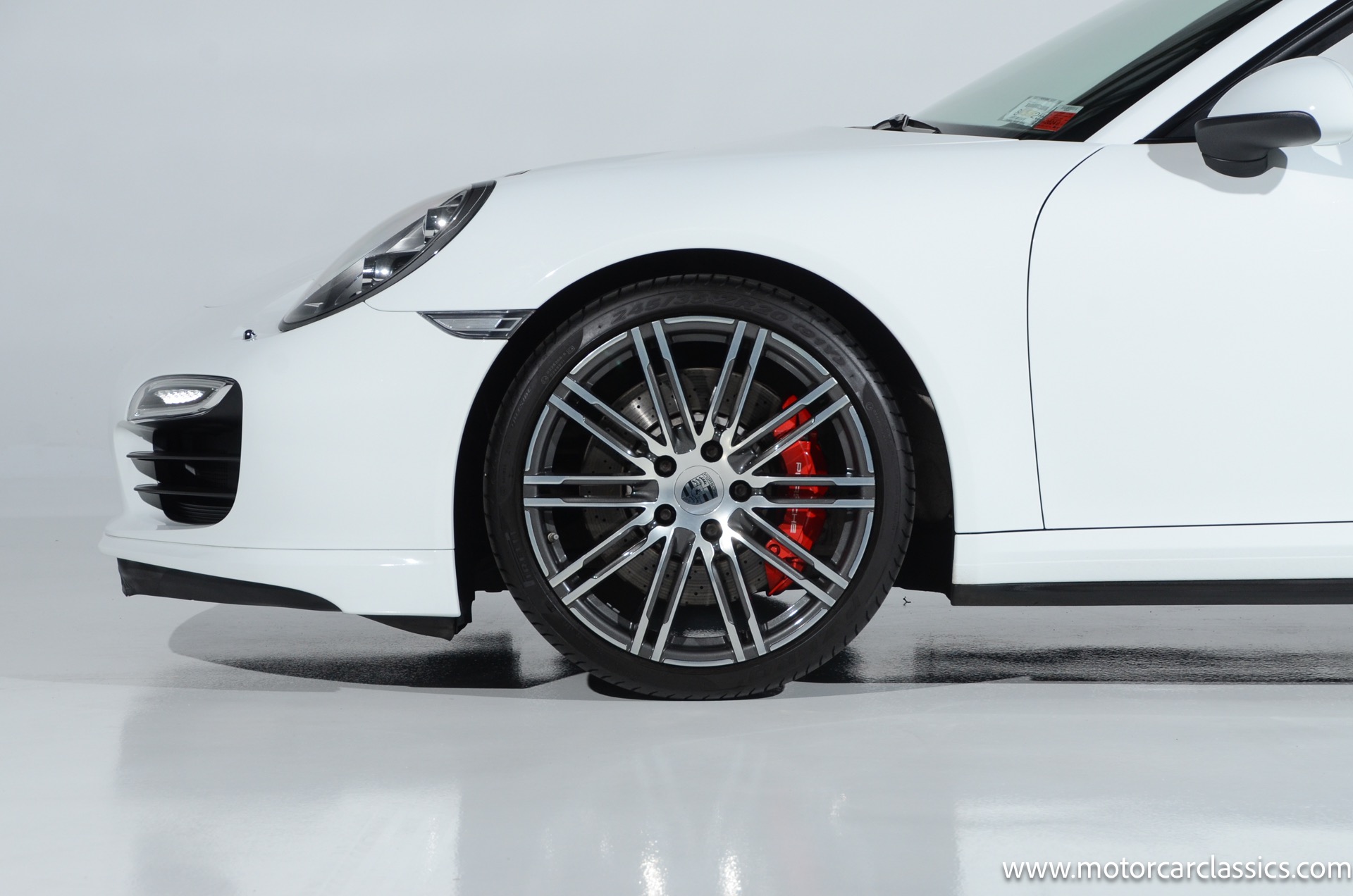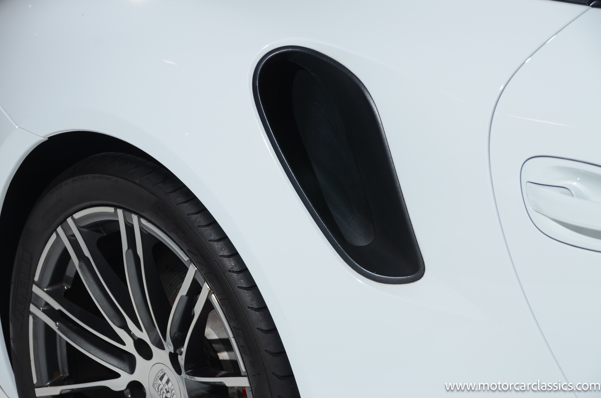 2014 Porsche 911 Turbo for sale! Motorcar Classics is proud to present this stunning 2014 Porsche 911 Turbo. It is a two-owner car that has been meticulously dealer-serviced and has covered just about 38K miles. With an MSRP of $157,715.00, this 2014 Turbo features a striking White exterior paired with a sophisticated Black leather interior. The car is equipped with Full LED headlights, including the Porsche Dynamic Light System Plus (PDLS +), which ensures superior illumination and adaptive lighting functionality. Inside, the cabin is adorned with premium Black leather and features the Ornamental Porsche Crest on the headrests, adding a touch of exclusivity. The Electric Slide/Tilt Sunroof in Glass allows natural light to enhance the driving experience. Performance-wise, the 911 Turbo is powered by a twin-turbo 3.8-liter flat-six engine that produces 520 horsepower and 487 lb-ft of torque, enabling it to accelerate from 0 to 60 mph in just 3.2 seconds. The inclusion of the Sport Chrono Package further enhances the car's dynamic capabilities, making it even more exhilarating to drive. This 2014 Porsche 911 Turbo offers an unmatched combination of performance, luxury, and advanced technology, making it a true masterpiece for the discerning automotive enthusiast.