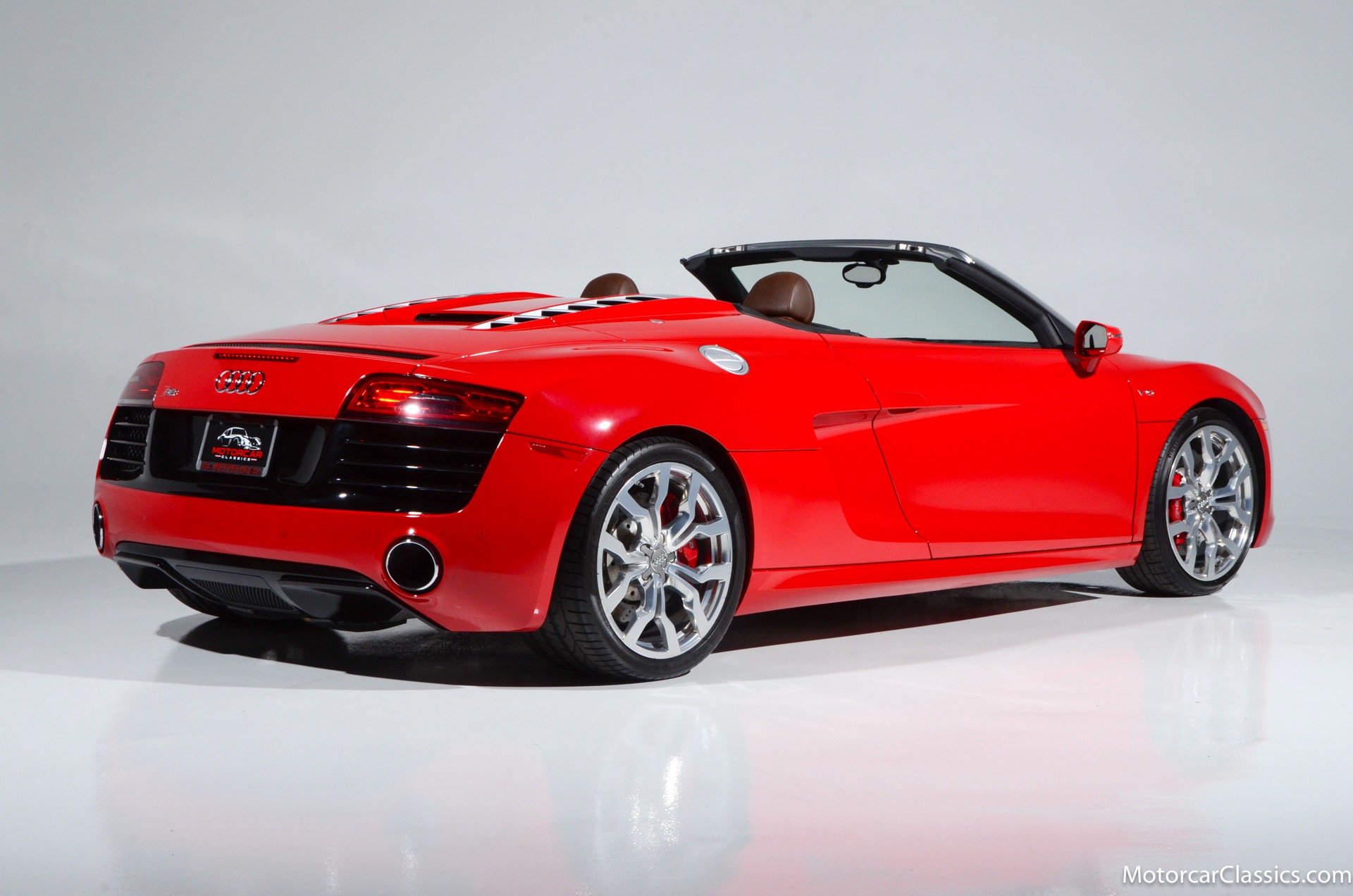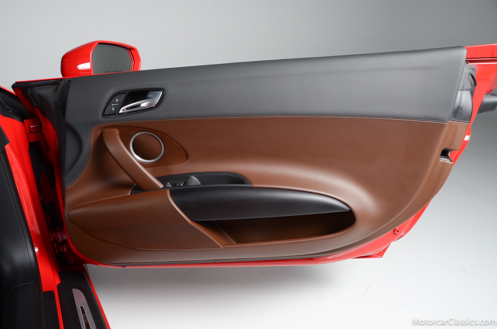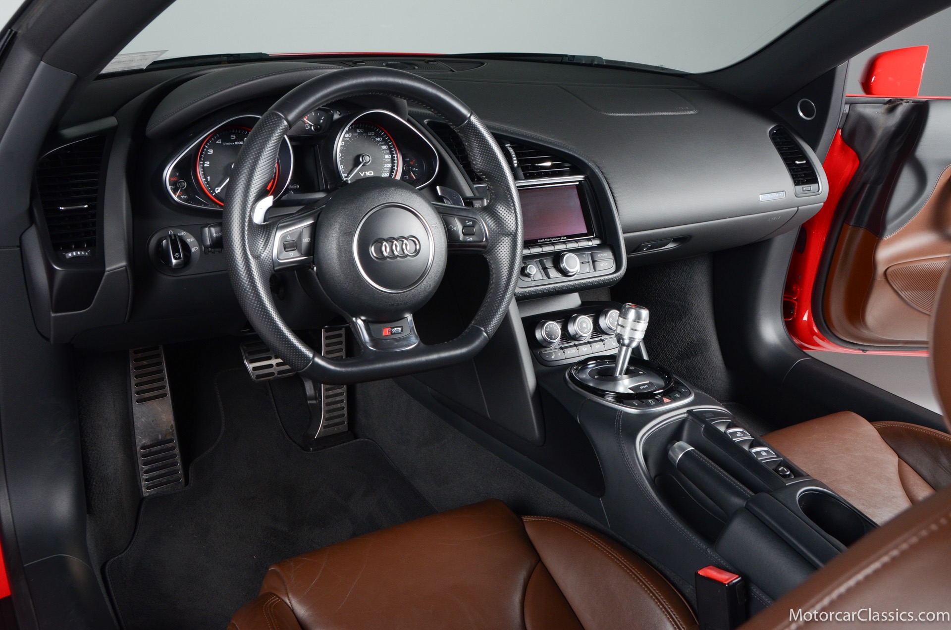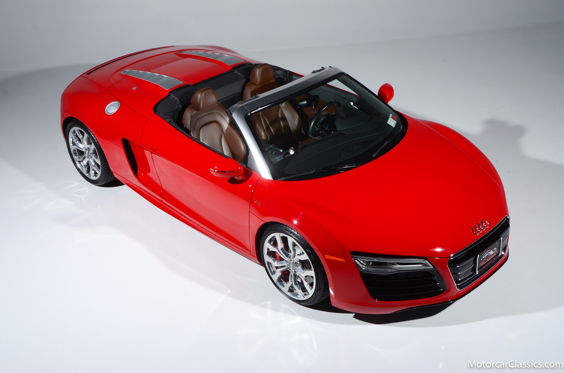 2015 Audi R8 for sale! Motorcar Classics is proud to present this stunning 2015 Audi R8 V10 Quattro Spyder featured in Brilliant Red with brown leather interior and back convertible top. The Audi R8 V10 boasts a 5.2-liter V10 that produces 525 hp and 391 lb-ft of torque. The V10 R8 has much genuine Italian ancestry, sharing the platform of the Lamborghini Gallardo. Featuring aluminum-intensive construction, with the engine located amidships and the all-wheel-drive system biased toward the rear, the R8 provides the kind of telepathic responsiveness one would expect from a smaller, more elemental sports car. Power flows from a V10 sourced from Lamborghini, mated to a dual-clutch automated manual known as S-tronic which provides lightning-quick, perfectly executed shifts on demand.