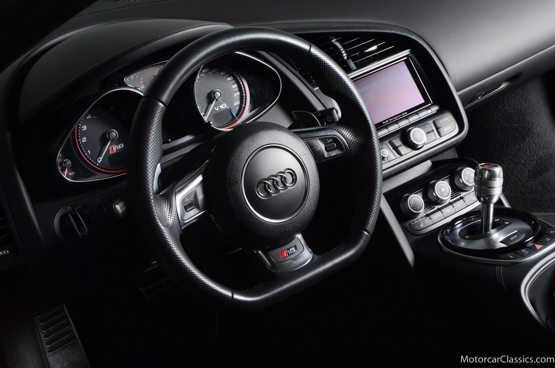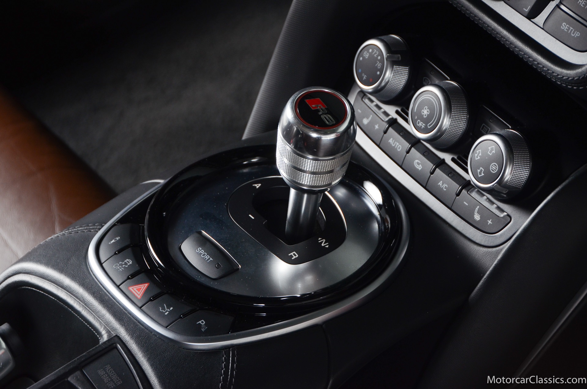 Features include an adaptive suspension, heated power-folding side mirrors, a speed-activated rear spoiler, cruise control, full LED exterior lighting (headlights, engine compartment and taillights), automatic climate control, a manual tilt-and-telescoping steering wheel, a trip computer with a lap timer, heated eight-way power seats (with four-way power lumbar support), leather and faux suede upholstery, an auto-dimming rearview mirror, Bluetooth phone connection and a seven-speaker sound system, an auxiliary audio jack and satellite radio, parking system with front and rear sensors and a rearview camera, red brake calipers, premium leather upholstery, navigation and Bang & Olufsen audio. The Audi R8 V10 boasts a 5.2-liter V10 that produces 525 hp and 391 lb-ft of torque.