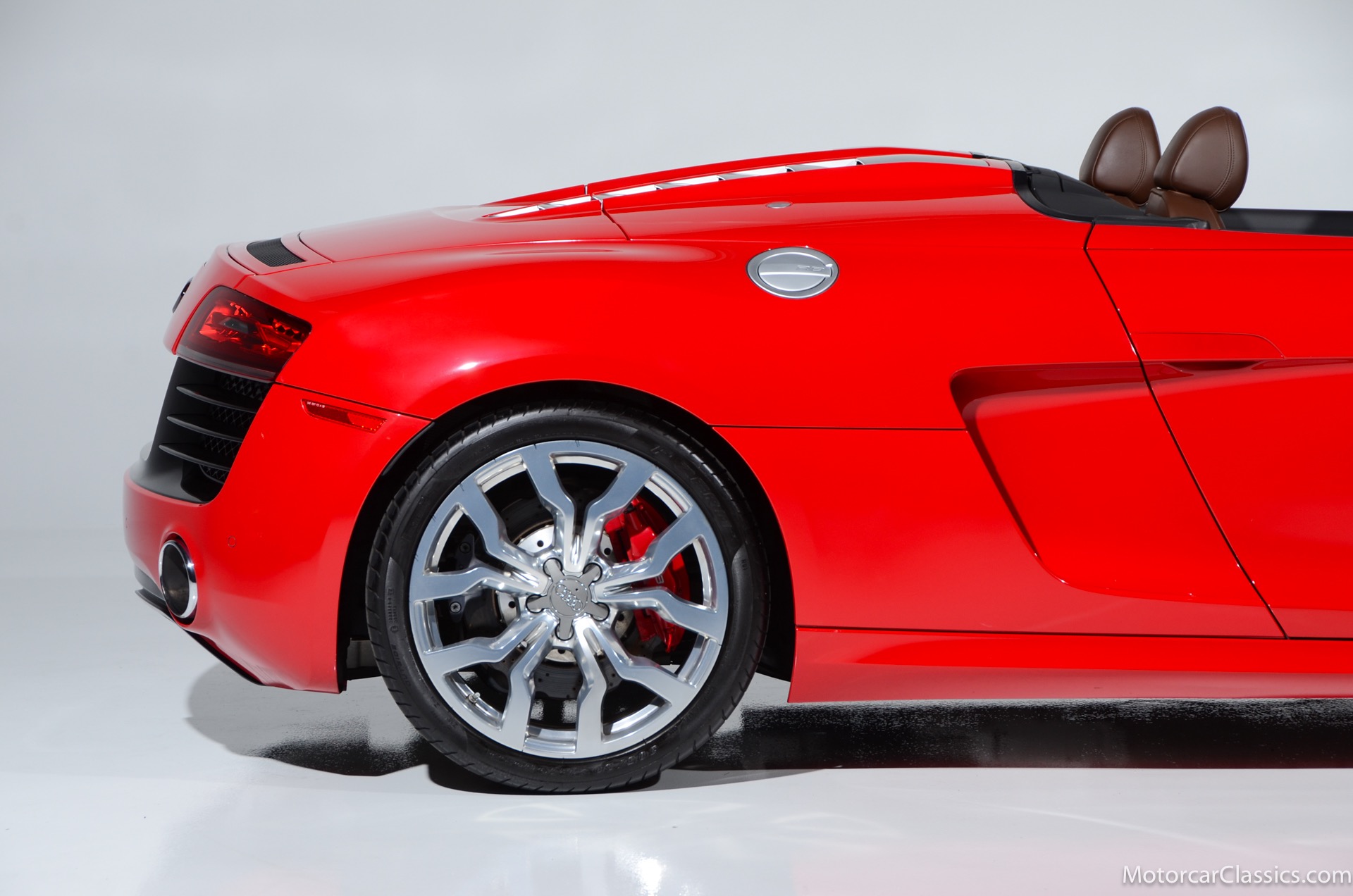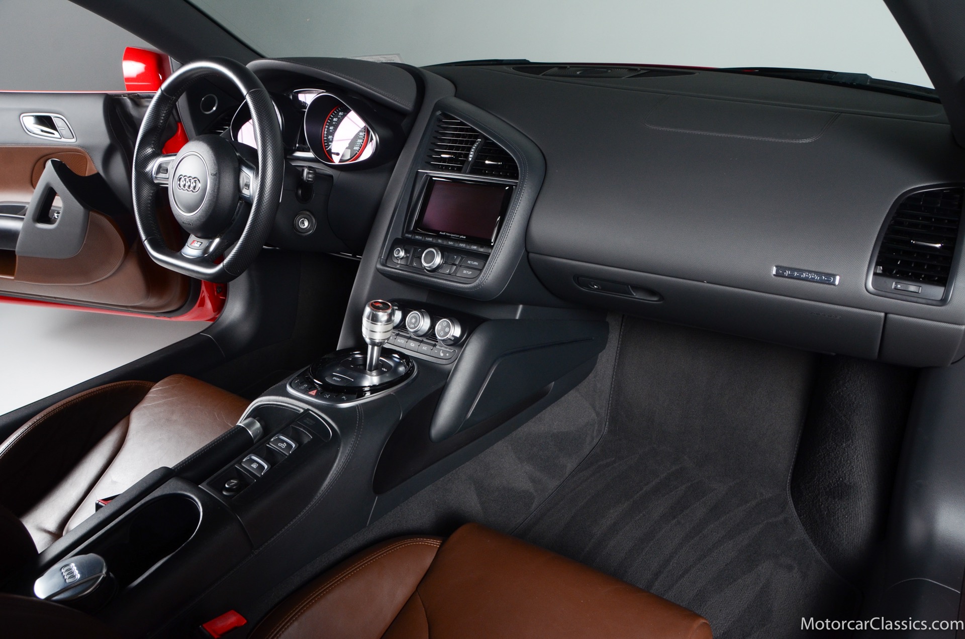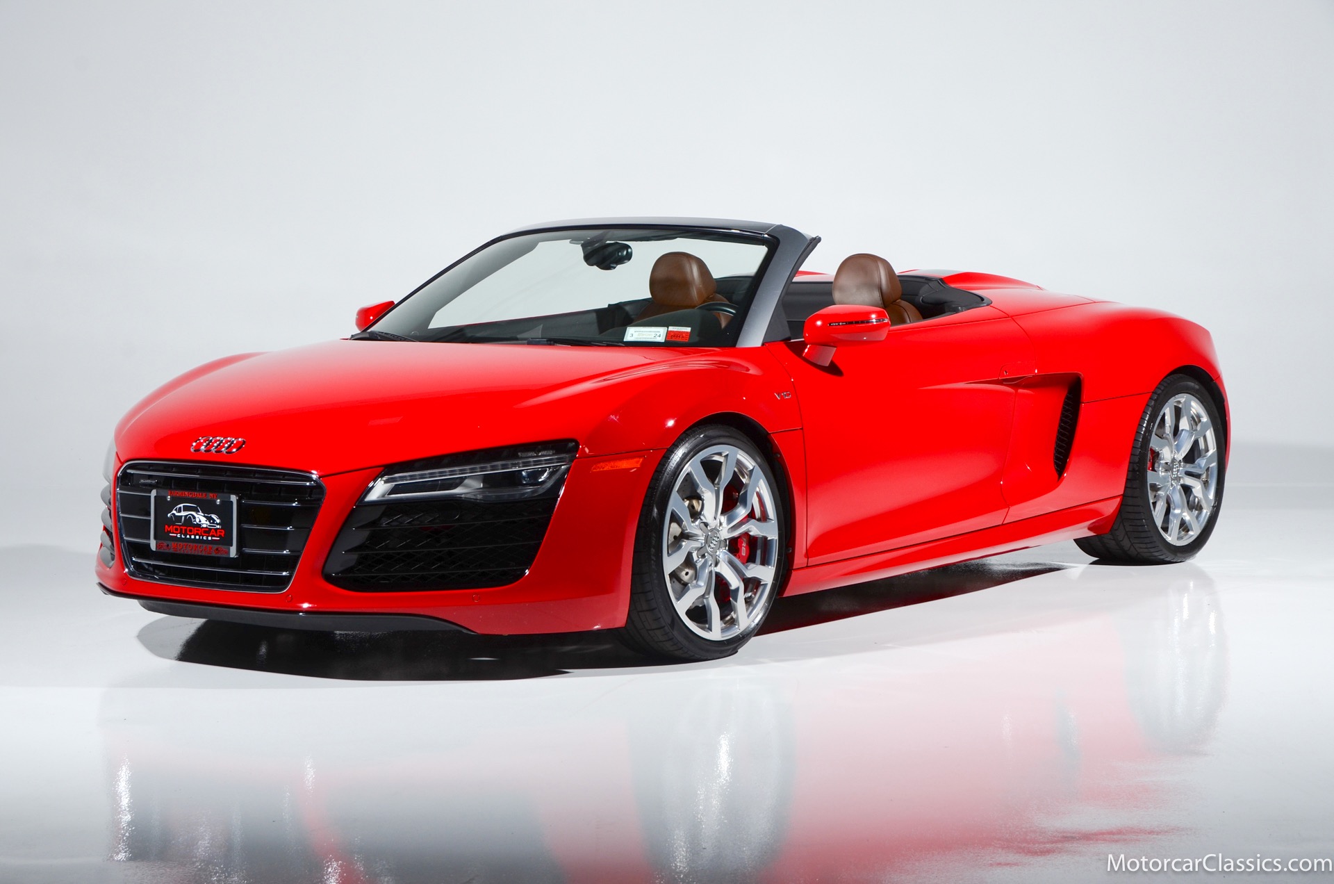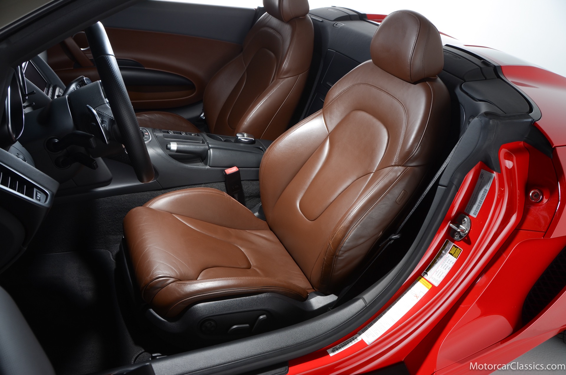 2015 Audi R8 for sale! Motorcar Classics is proud to present this stunning 2015 Audi R8 V10 Quattro Spyder featured in Brilliant Red with brown leather interior and back convertible top. The Audi R8 V10 boasts a 5.2-liter V10 that produces 525 hp and 391 lb-ft of torque. The V10 R8 has much genuine Italian ancestry, sharing the platform of the Lamborghini Gallardo. Featuring aluminum-intensive construction, with the engine located amidships and the all-wheel-drive system biased toward the rear, the R8 provides the kind of telepathic responsiveness one would expect from a smaller, more elemental sports car. Power flows from a V10 sourced from Lamborghini, mated to a dual-clutch automated manual known as S-tronic which provides lightning-quick, perfectly executed shifts on demand.