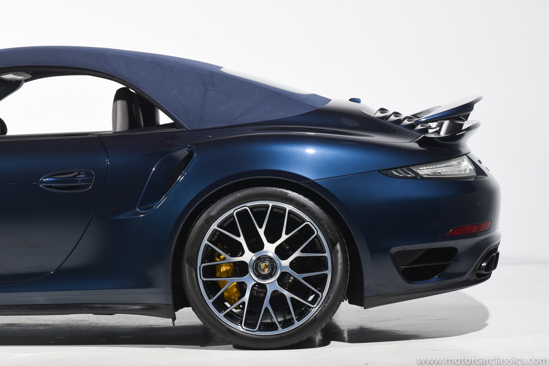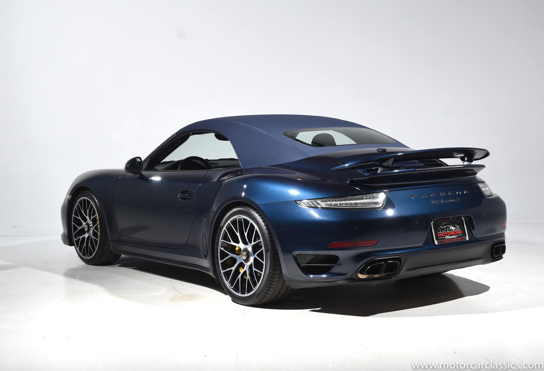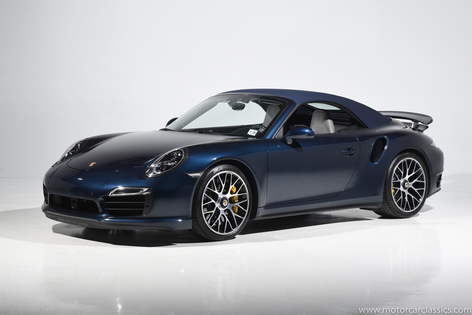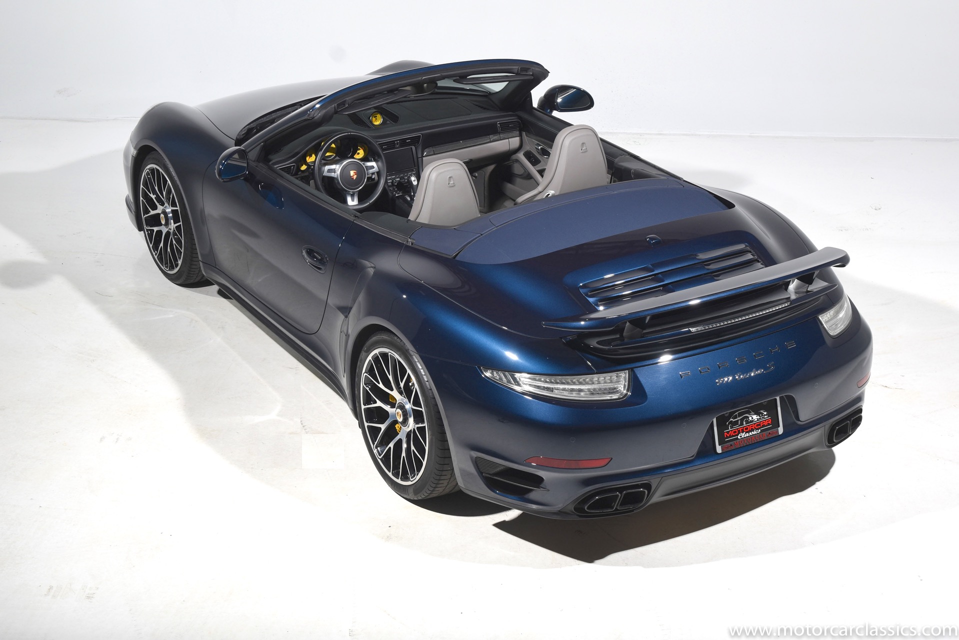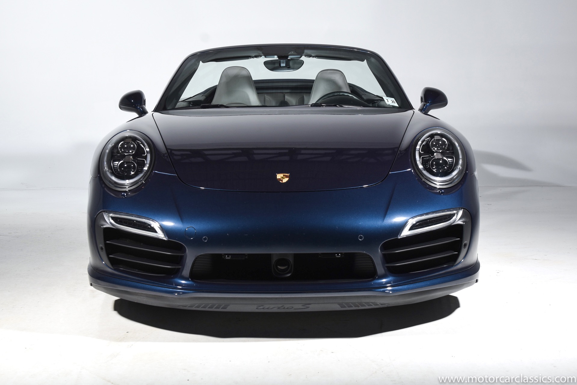 2016 Porsche 911 Turbo S Cabriolet for sale! Motorcar Classics is pleased to offer this impressive 911 Turbo S Cabriolet presented in Dark Blue Metallic with black and Platinum grey leather interior and blue soft top. 1-Owner car from new! Only 9246 miles. Clean title/Carfax. Meticulously owned and maintained. 560HP 3.8L twin-turbo 6 cylinder engine. 7-speed PDK automatic transmission. $20,000 in factory options! Options include: Ceramic brakes, Turbo S center locking alloy wheels, Sport chronology Package, Water-cooled engine with aluminum block and cylinder heads, Direct fuel injection, Integrated dry-sump lubrication, Stainless steel exhaust, AWD, MacPherson strut front suspension with anti-rollbar, Rear-axle steering, PASM, ABS, Porsche torque vectoring plus, SiriusXM, Bluetooth, LED headlights, PCM nav, A,/FM, SportDesign wing mirror on door panel, Door-sill guards with model logo, Interior trim in Carbon fiber, heated front seats, Fire extinguisher, Luggage net in passenger footwell, Smoking package, Light design package, Power steering plus, Voice control, Power folding mirrors, Two-tone leather interior, Sport chronology dial in racing yellow, Side mirror painted, Extended interior package dash in leather, Aluminum pedals, Burmester high-end info package, Rear side air intakes painted, LED headlights in black, Gear selector in Carbon fiber, Porsche crest on headrests, Headlight cleaning systems covers in exterior color, Storage compartment lid with model logo, Door-sill guards in carbon fiber and illuminated, Clear glass taillights and more! Aftermarket radar and laser detector installed. 214,180 MSRP!