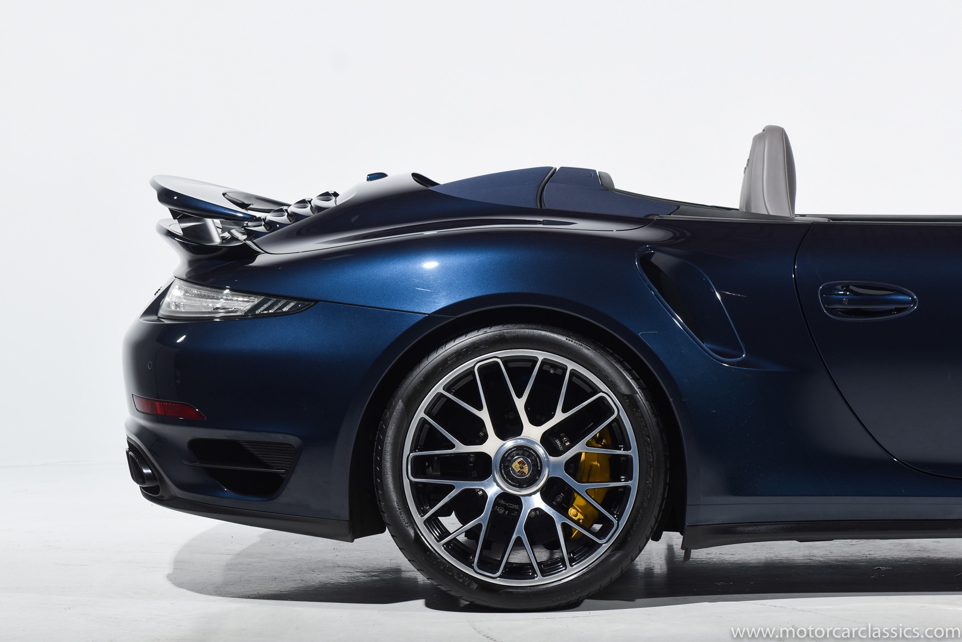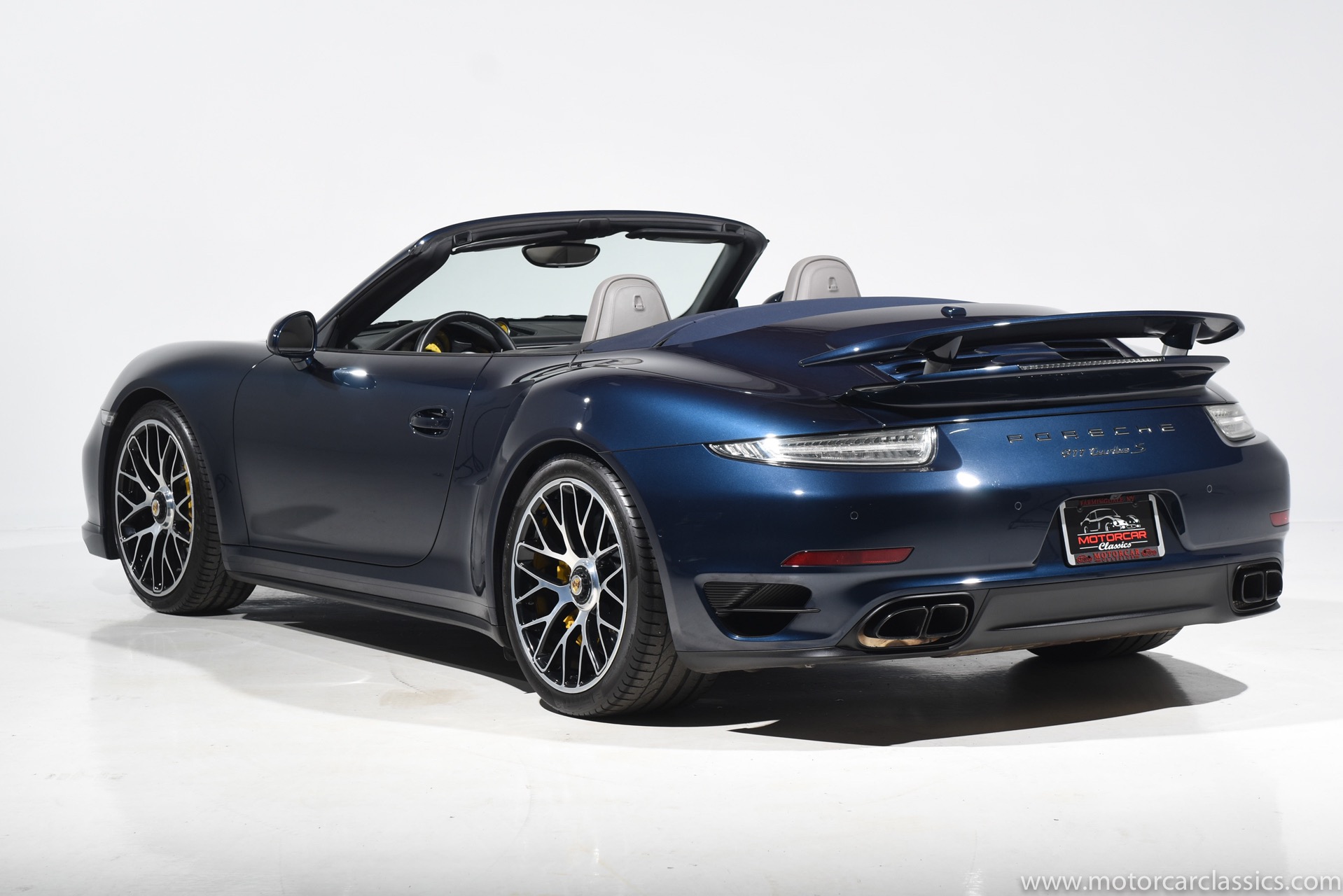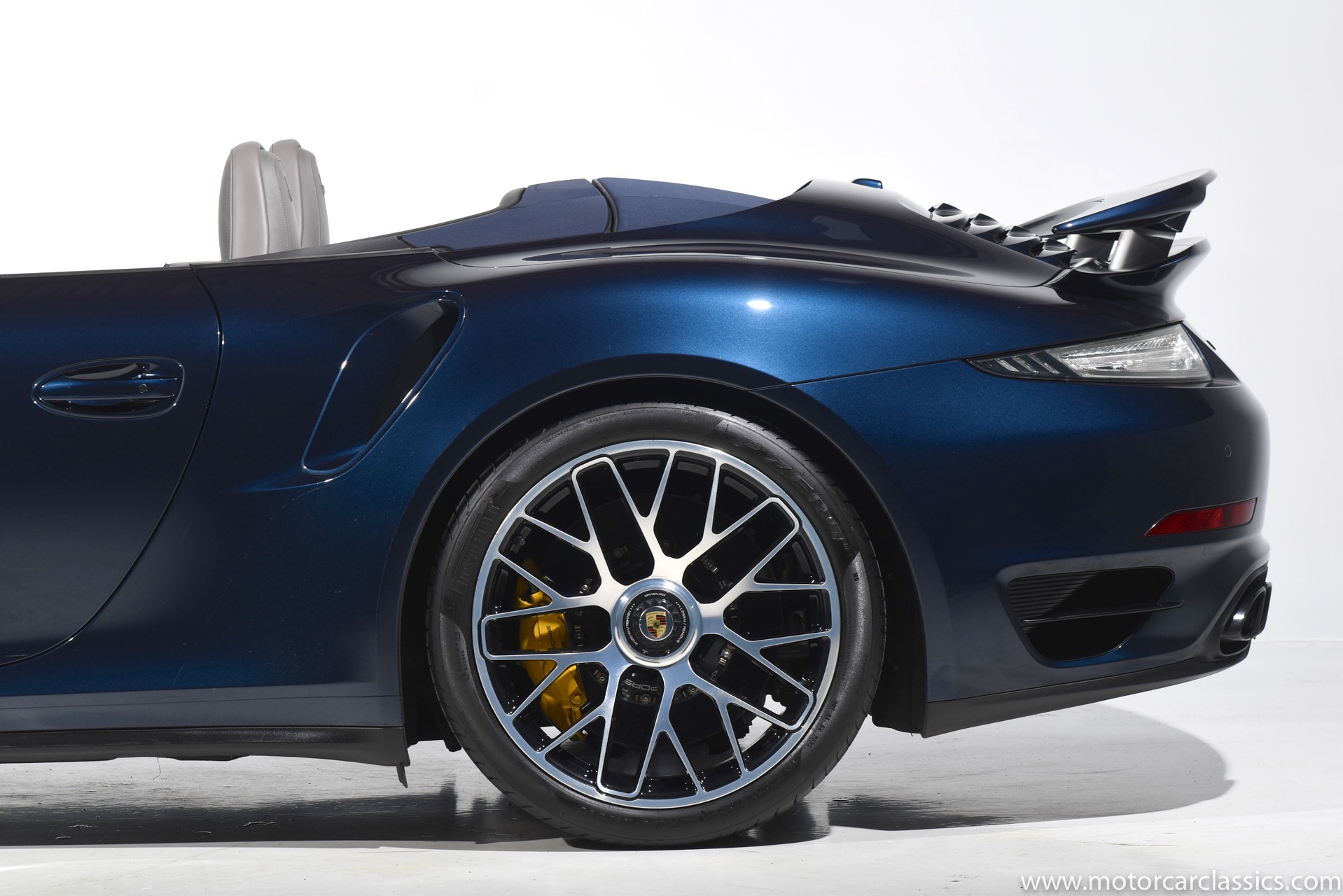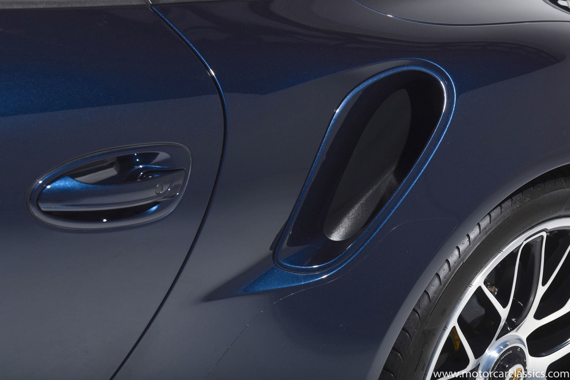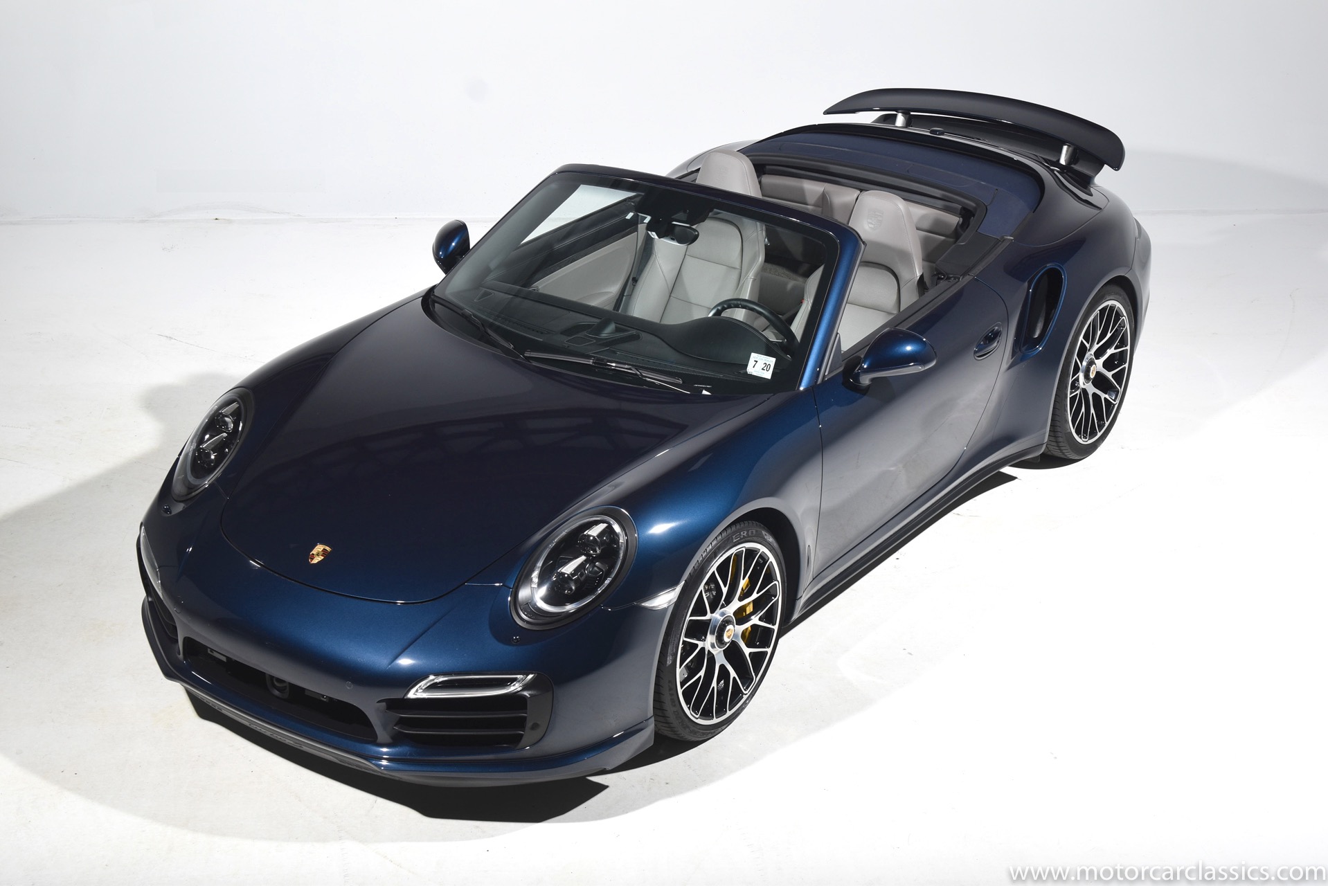2016 Porsche 911 Turbo S Cabriolet for sale! Motorcar Classics is pleased to offer this impressive 911 Turbo S Cabriolet presented in Dark Blue Metallic with black and Platinum grey leather interior and blue soft top. 1-Owner car from new! Only 9246 miles. Clean title/Carfax. Meticulously owned and maintained. 560HP 3.8L twin-turbo 6 cylinder engine. 7-speed PDK automatic transmission. $20,000 in factory options! Options include: Ceramic brakes, Turbo S center locking alloy wheels, Sport chronology Package, Water-cooled engine with aluminum block and cylinder heads, Direct fuel injection, Integrated dry-sump lubrication, Stainless steel exhaust, AWD, MacPherson strut front suspension with anti-rollbar, Rear-axle steering, PASM, ABS, Porsche torque vectoring plus, SiriusXM, Bluetooth, LED headlights, PCM nav, A,/FM, SportDesign wing mirror on door panel, Door-sill guards with model logo, Interior trim in Carbon fiber, heated front seats, Fire extinguisher, Luggage net in passenger footwell, Smoking package, Light design package, Power steering plus, Voice control, Power folding mirrors, Two-tone leather interior, Sport chronology dial in racing yellow, Side mirror painted, Extended interior package dash in leather, Aluminum pedals, Burmester high-end info package, Rear side air intakes painted, LED headlights in black, Gear selector in Carbon fiber, Porsche crest on headrests, Headlight cleaning systems covers in exterior color, Storage compartment lid with model logo, Door-sill guards in carbon fiber and illuminated, Clear glass taillights and more! Aftermarket radar and laser detector installed. 214,180 MSRP!