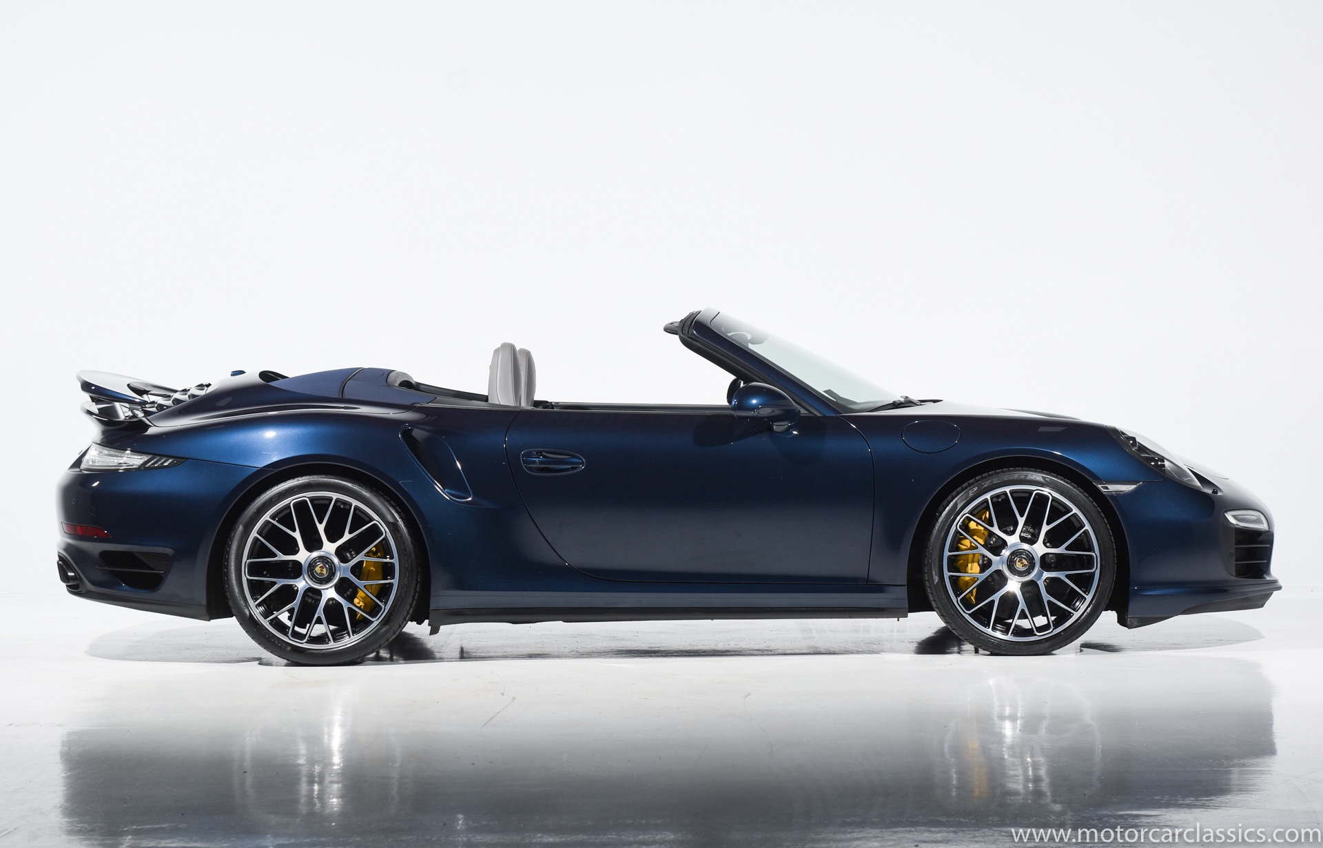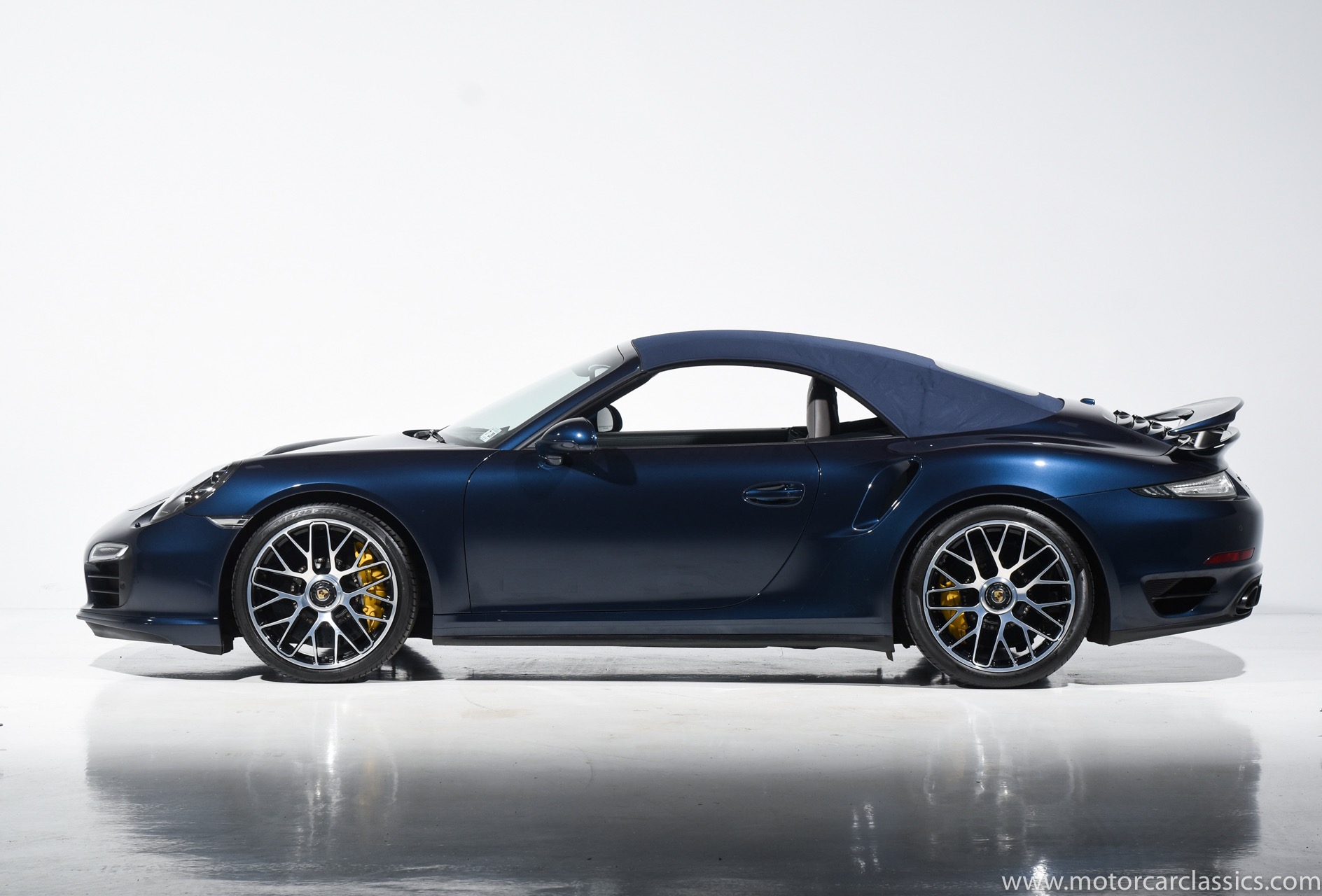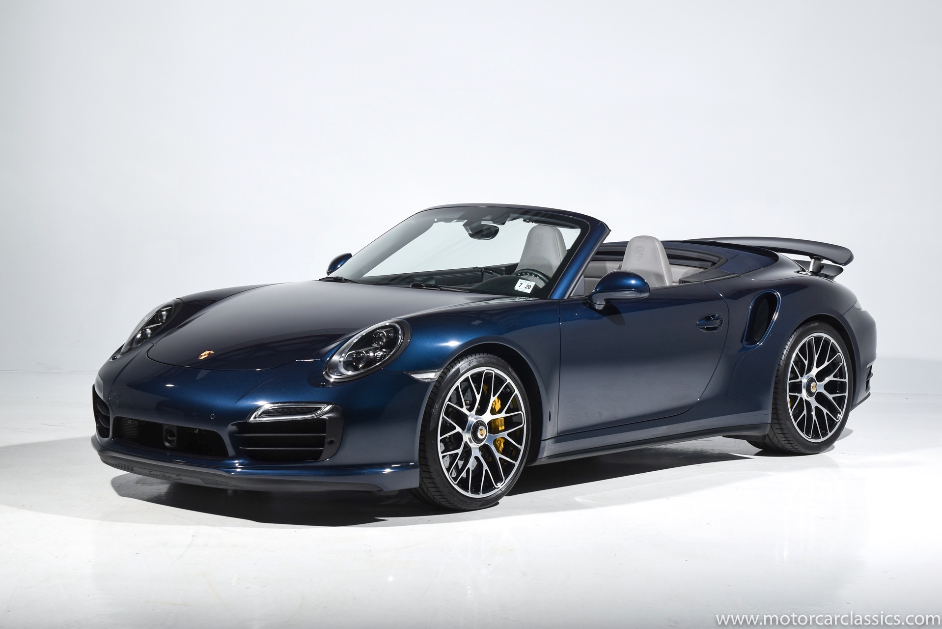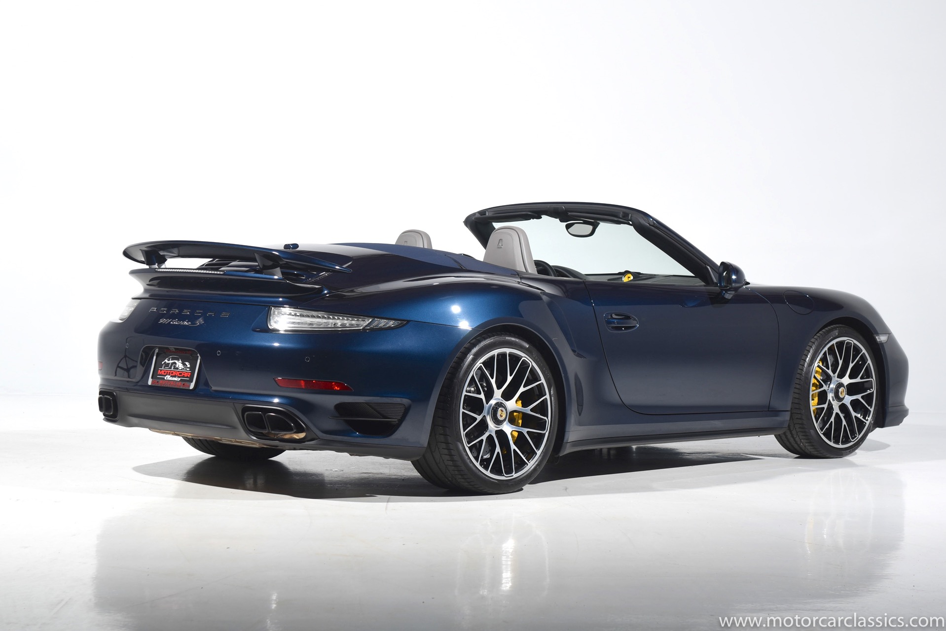 2016 Porsche 911 Turbo S Cabriolet for sale! Motorcar Classics is pleased to offer this impressive 911 Turbo S Cabriolet presented in Dark Blue Metallic with black and Platinum grey leather interior and blue soft top. 1-Owner car from new! Only 9246 miles. Clean title/Carfax. Meticulously owned and maintained. 560HP 3.8L twin-turbo 6 cylinder engine. 7-speed PDK automatic transmission. $20,000 in factory options! Options include: Ceramic brakes, Turbo S center locking alloy wheels, Sport chronology Package, Water-cooled engine with aluminum block and cylinder heads, Direct fuel injection, Integrated dry-sump lubrication, Stainless steel exhaust, AWD, MacPherson strut front suspension with anti-rollbar, Rear-axle steering, PASM, ABS, Porsche torque vectoring plus, SiriusXM, Bluetooth, LED headlights, PCM nav, A,/FM, SportDesign wing mirror on door panel, Door-sill guards with model logo, Interior trim in Carbon fiber, heated front seats, Fire extinguisher, Luggage net in passenger footwell, Smoking package, Light design package, Power steering plus, Voice control, Power folding mirrors, Two-tone leather interior, Sport chronology dial in racing yellow, Side mirror painted, Extended interior package dash in leather, Aluminum pedals, Burmester high-end info package, Rear side air intakes painted, LED headlights in black, Gear selector in Carbon fiber, Porsche crest on headrests, Headlight cleaning systems covers in exterior color, Storage compartment lid with model logo, Door-sill guards in carbon fiber and illuminated, Clear glass taillights and more! Aftermarket radar and laser detector installed. 214,180 MSRP!