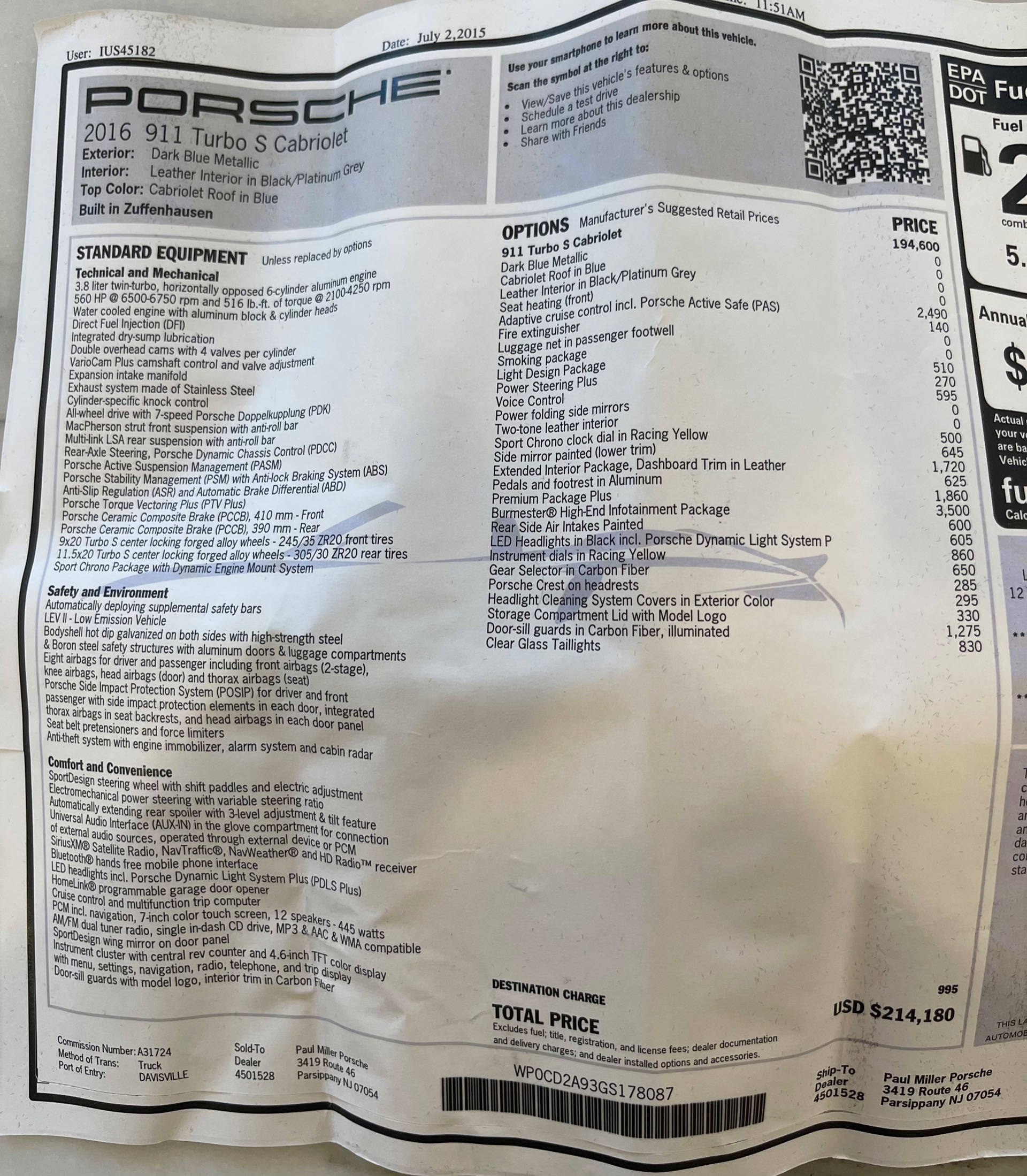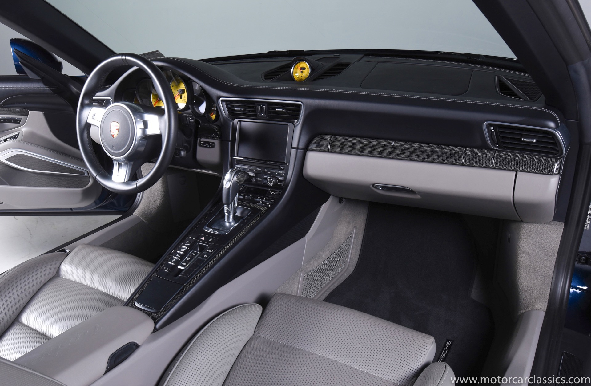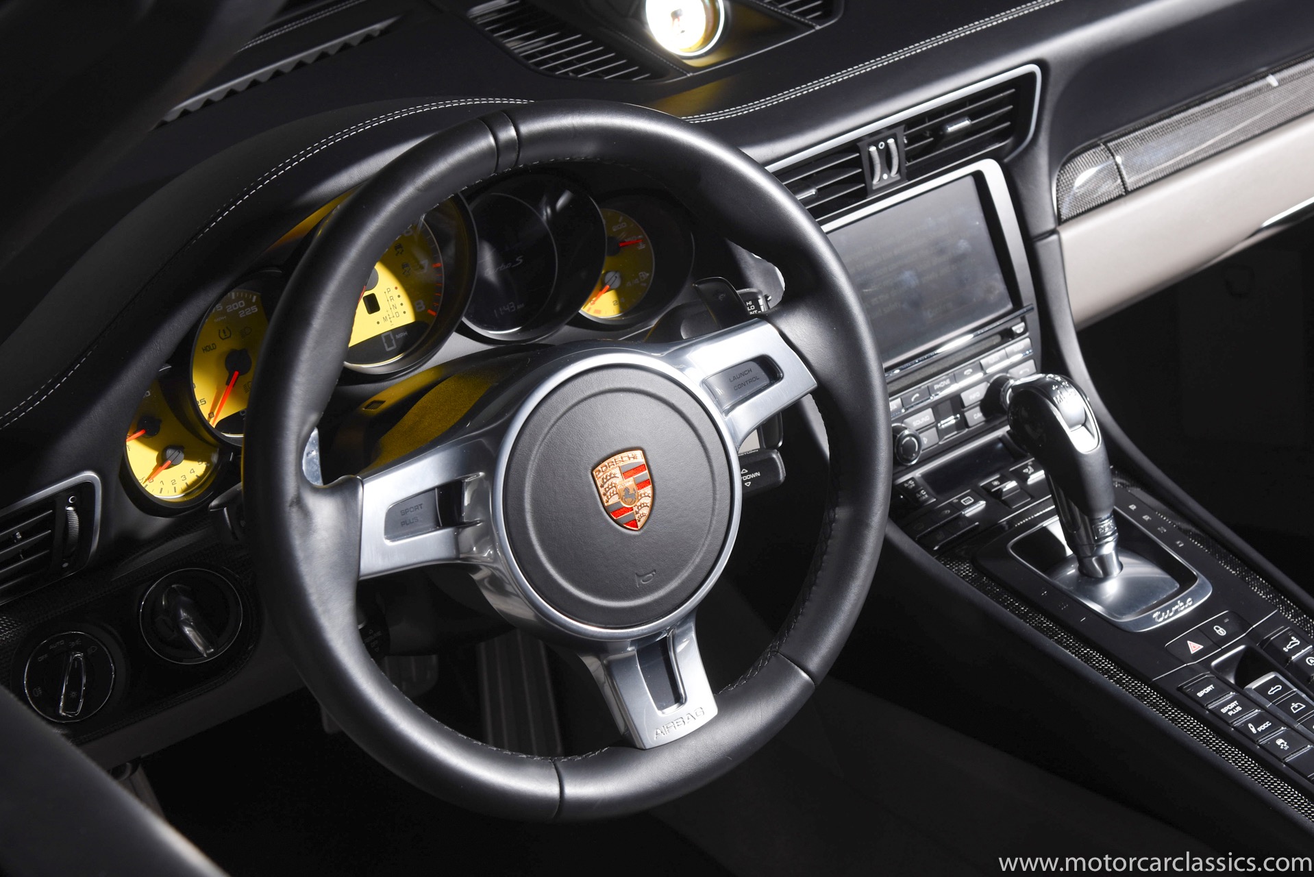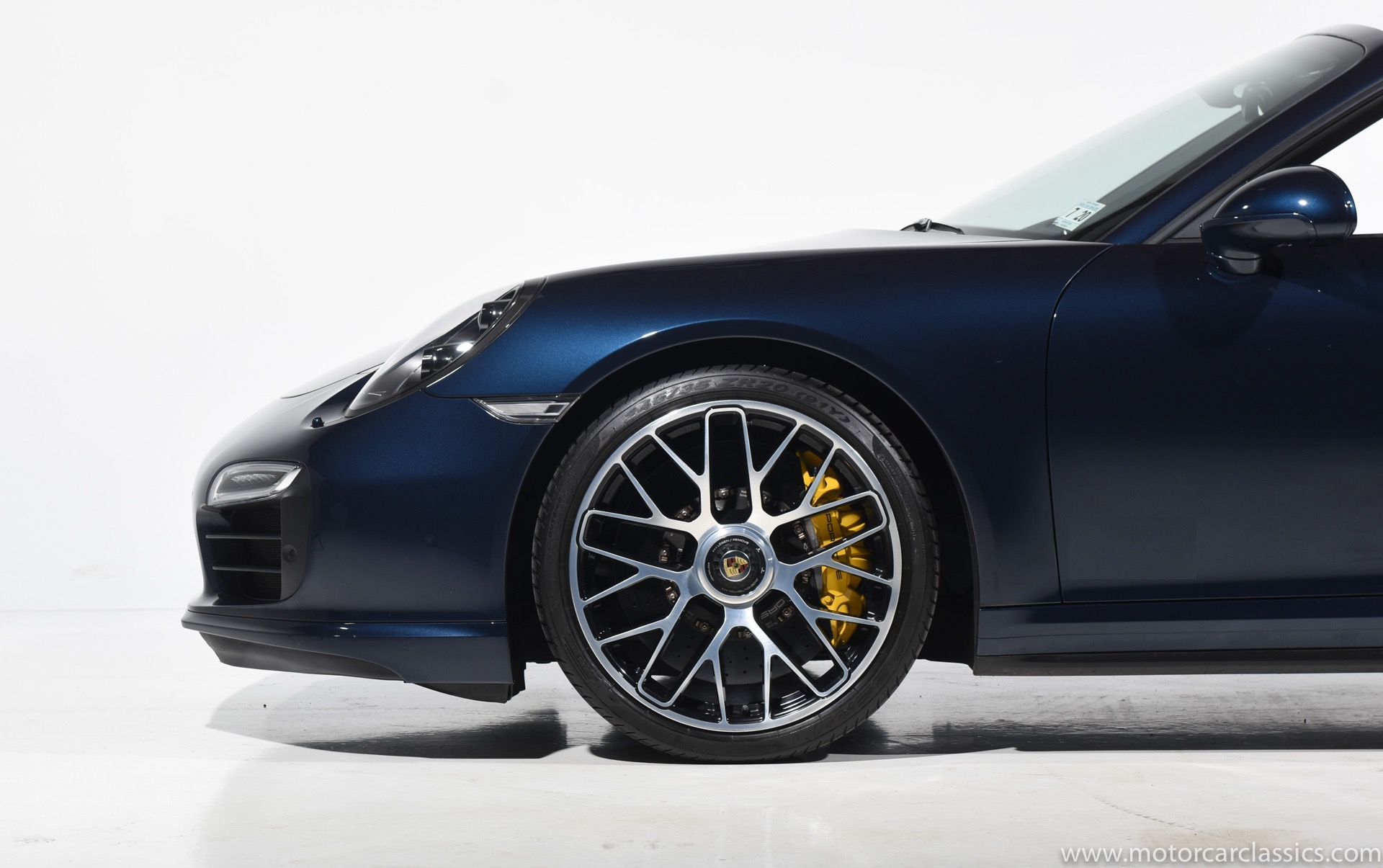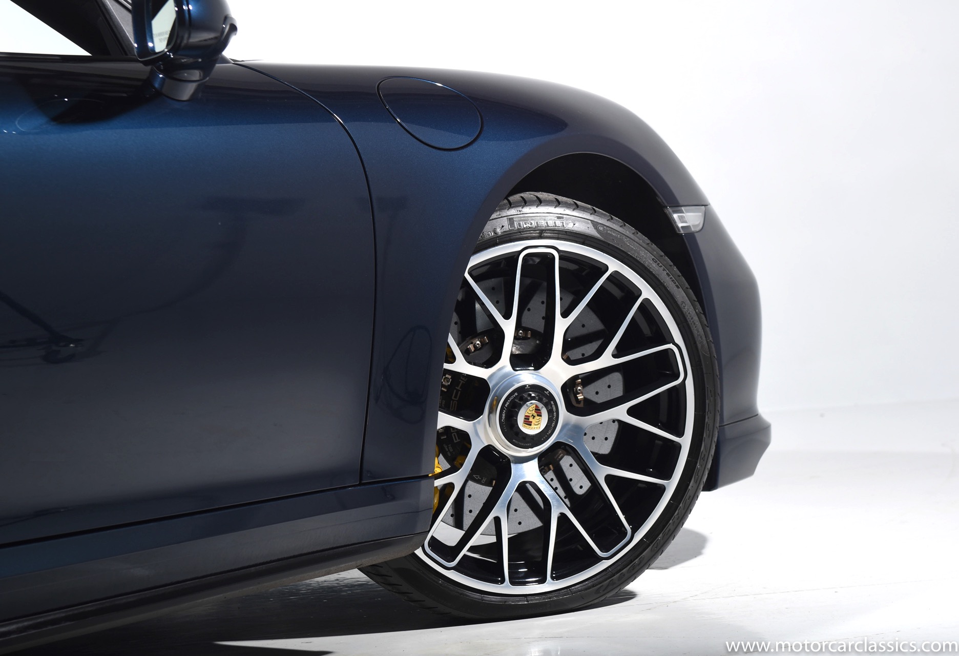 2016 Porsche 911 Turbo S Cabriolet for sale! Motorcar Classics is pleased to offer this impressive 911 Turbo S Cabriolet presented in Dark Blue Metallic with black and Platinum grey leather interior and blue soft top. 1-Owner car from new! Only 9246 miles. Clean title/Carfax. Meticulously owned and maintained. 560HP 3.8L twin-turbo 6 cylinder engine. 7-speed PDK automatic transmission. $20,000 in factory options! Options include: Ceramic brakes, Turbo S center locking alloy wheels, Sport chronology Package, Water-cooled engine with aluminum block and cylinder heads, Direct fuel injection, Integrated dry-sump lubrication, Stainless steel exhaust, AWD, MacPherson strut front suspension with anti-rollbar, Rear-axle steering, PASM, ABS, Porsche torque vectoring plus, SiriusXM, Bluetooth, LED headlights, PCM nav, A,/FM, SportDesign wing mirror on door panel, Door-sill guards with model logo, Interior trim in Carbon fiber, heated front seats, Fire extinguisher, Luggage net in passenger footwell, Smoking package, Light design package, Power steering plus, Voice control, Power folding mirrors, Two-tone leather interior, Sport chronology dial in racing yellow, Side mirror painted, Extended interior package dash in leather, Aluminum pedals, Burmester high-end info package, Rear side air intakes painted, LED headlights in black, Gear selector in Carbon fiber, Porsche crest on headrests, Headlight cleaning systems covers in exterior color, Storage compartment lid with model logo, Door-sill guards in carbon fiber and illuminated, Clear glass taillights and more! Aftermarket radar and laser detector installed. 214,180 MSRP!