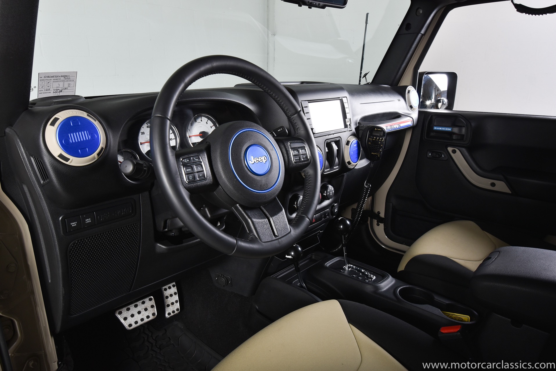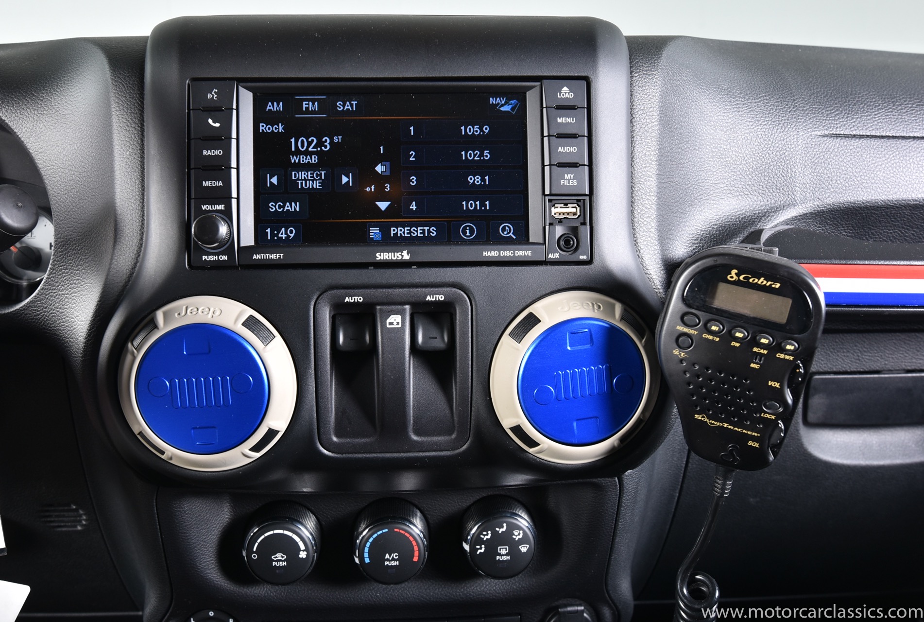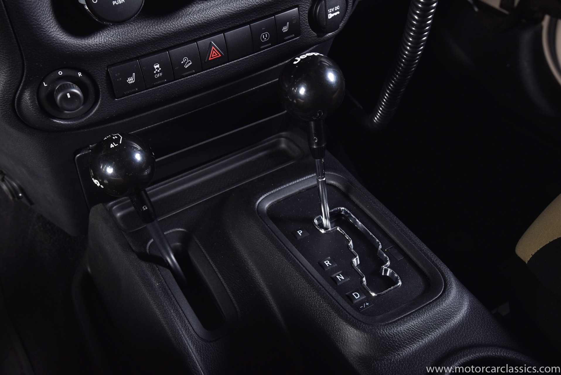 Standard equipment includes Monotone Paint, 160 Amp Alternator, 600 Amp Maintenance Free Battery, Electronic Stability Control, Hill Start Assist, Trailer Sway Damping, 4-Wheel Disc Brakes, Low Back Bucket Seats, Easy Access Passenger Seat, Reclining Front Seats, Rear Folding Seat, Front Seat Area Carpet, Cargo Tie Down Loops Sport Bar w/Full Padding Full Length Floor Console Rear Compartment Covered Storage Storage Tray 4:1 Rock-Trac HD Part Time 4WD Sys Next Gen. Dana 44 HD Front Axle Next Gen. Dana 44 HD Rear Axle Tru-Lok Front & Rear Axles, Tinted Windshield Glass, Front Door Tinted Glass, Full Metal Doors w/Roll-up Windows, Sliding Sun Visors w/Mirrors, Premium Instrument Cluster w/Tach 100 MPH Primary Speedometer, Temperature & Compass Gauge, Var Intermittent Windshield Wipers, Dual Note Electric Horns, 12V Auxiliary Power Outlet, Glove Box 115V Auxiliary Power Outlet, Automatic Headlamps, Front LED Fog Lamps, Black Front Bumper, Black Rear Bumper, Rock Rails Black, Front Frame Overlay Body Color Grille, Accent Color Fender Flares, Speed Control Gobi Clear Coat, Steering Wheel Mounted Audio Ctrls, SIRIUS Satellite Radio, Power Steering, Leather Wrapped Steering Wheel, Performance Suspension, Rear Stabilizer Bar, Electronic Front Sway Bar Disconnect, Tilt Steering Column, Full Size Spare Tire, Outside Tire Carrier, LT255/75R17C BSW Off Road Tires, 17X7.5 Polished Mineral Gray Whl, Coat Hooks, Fuel Tank Skid Plate Shield, Transfer Case Skid Plate Shield, 2 Front & 1 Rear Tow Hooks, Torx Tool Kit, Factory optional equipment includes Power Convenience Group, Hill Descent Control, Traction Control, Electronic Roll Mitigation, Hydraulic Assist Brake Booster, Driver Height Adjuster Seat, Freedom Top Hard, Top Headliner, Rear Seat/Wheelhouse/Cargo Carpet, Front Seat Back Map Pockets, Freedom Panel Storage Bag, Chrome/Leather Wrapped Shift Knob, Cloth Seats, 5-Speed Auto W5A580 Transmission, 3.73 Rear Axle Ratio, 3.6L V6 24V VVT Engine, Deep Tint Sunscreen Windows, Rear Window Defroster, Auto Dim Mirror w/Reading Lamp, Power Heated Mirrors, Remote Keyless Entry, Rear Window Wiper/Washer, GPS Navigation, Power Locks, Heated Front Seats, Pwr Windows, Front 1-Touch Down Vehicle Information Center Security Alarm, Black 3-Piece Hard Top, Engine Oil Cooler, Gobi Clear Coat, Alpine 9-Spkr w/All WeatherSubwoofer, 6.5" Touchscreen Display Radio, 430 NAV SiriusXM Travel Link Uconnect, Voice Command w/Bluetooth Audio, Jack Input for Mobile Devices, Remote USB Port, All Aluminum Wheels, Remote Start System, Tire Pressure Monitoring Display, 40GB Hard Drive